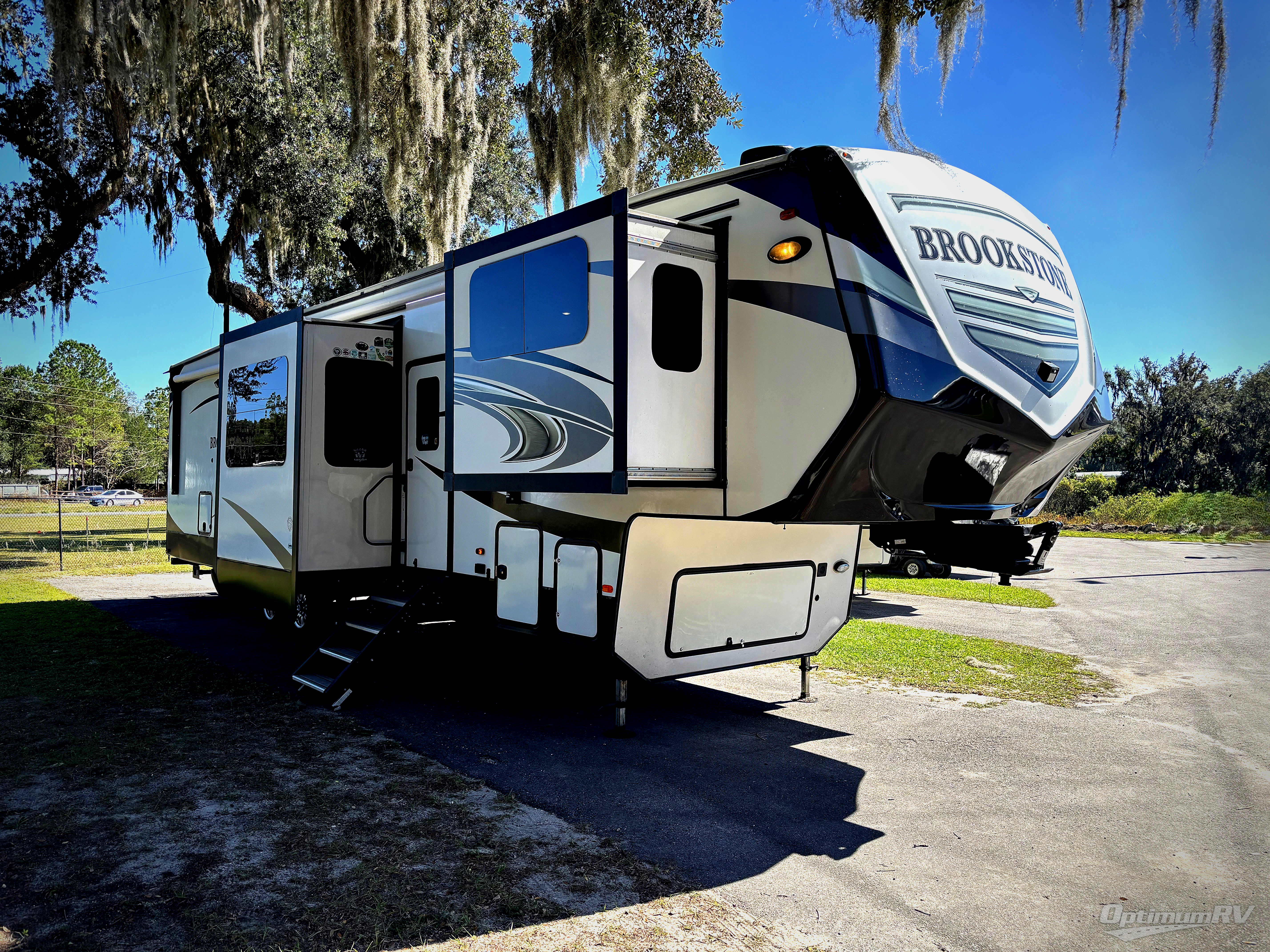 Set your sights on this Brookstone fifth wheel that will make you feel like you haven't even left home. You'll find dual opposing slides in the front entertainment area, plus dual opposing slides in the kitchen, and a slide out in the bedroom for optimal interior space your crew will appreciate. There is plenty of seating between the two tri-fold sofas and the theater seating which allows your family to relax in the evenings to watch your favorite shows on the 55" LED TV. The chef of the family has everything they need to prepare dinner with a 21" stainless steel oven, a stainless steel 30" residential microwave, and an extra deep stainless sink with the kitchen island for extra prep space. After you've spent your day outdoors, retreat to the private master suite that includes a queen bed, a dresser and a wardrobe. It even has an entrance into the large rear bath with a dual sink vanity and a wardrobe with a stackable washer and dryer!