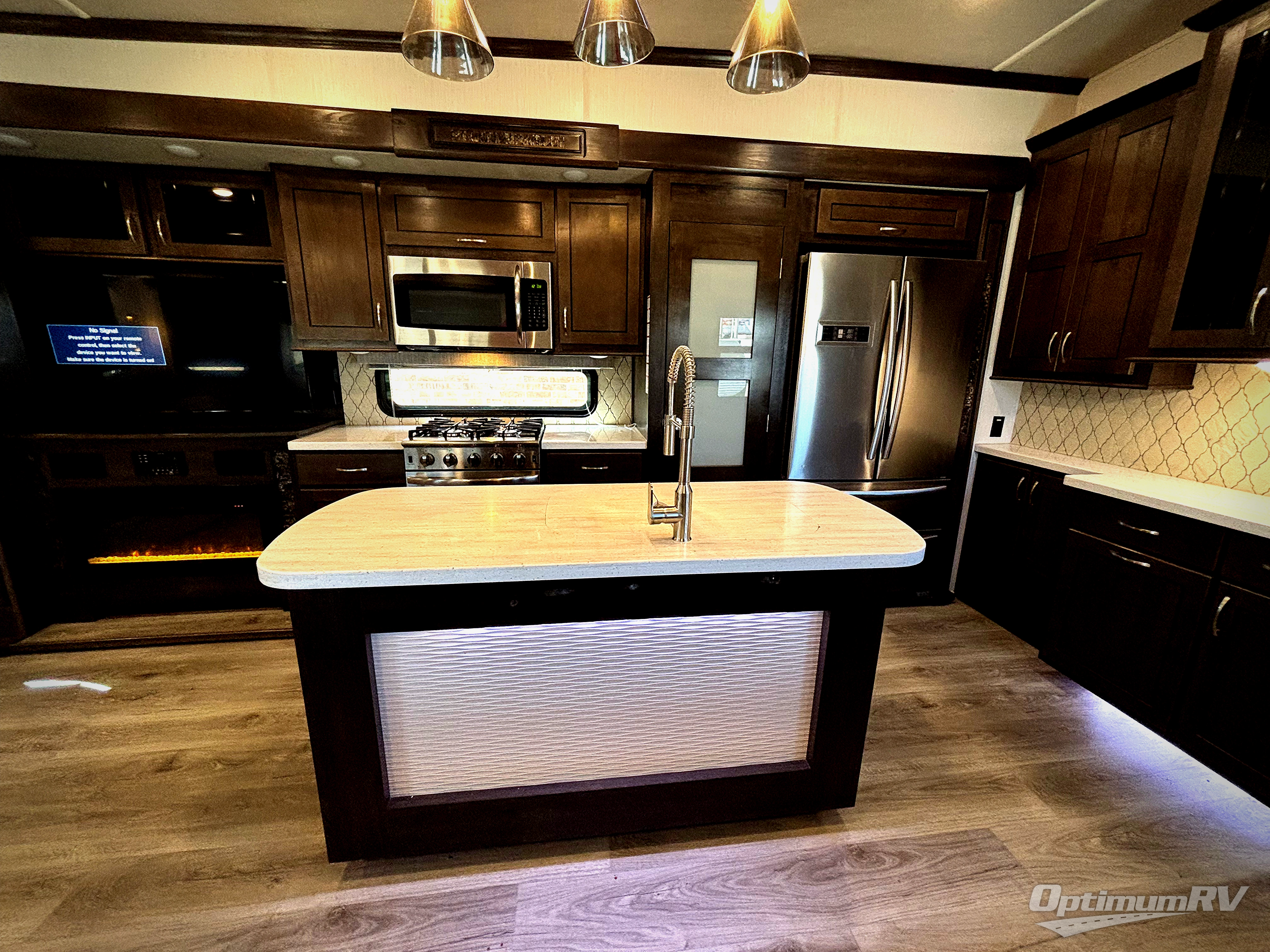 The kitchen is centrally located so you can make snacks and meals while visiting with everyone in the rear living area.  Your family and guests can choose to relax on the hide-a-bed sofa, the power theater seats, or the four chairs around the free standing dinette.  They can also enjoy the fireplace, the entertainment center and the 50" TV on a swing arm.  You can cook in the full kitchen with lots of counter space, and you might decide to add a dishwasher option to the island.  When you are ready to call it a night, you can head to the master bedroom with a residential style headboard and luxurious bedding decor, USB plug-ins on each side of the king bed, and plenty of storage.  You might like to add an option or two such as an exterior pull-out kitchen with TV, and/or a washer and dryer.