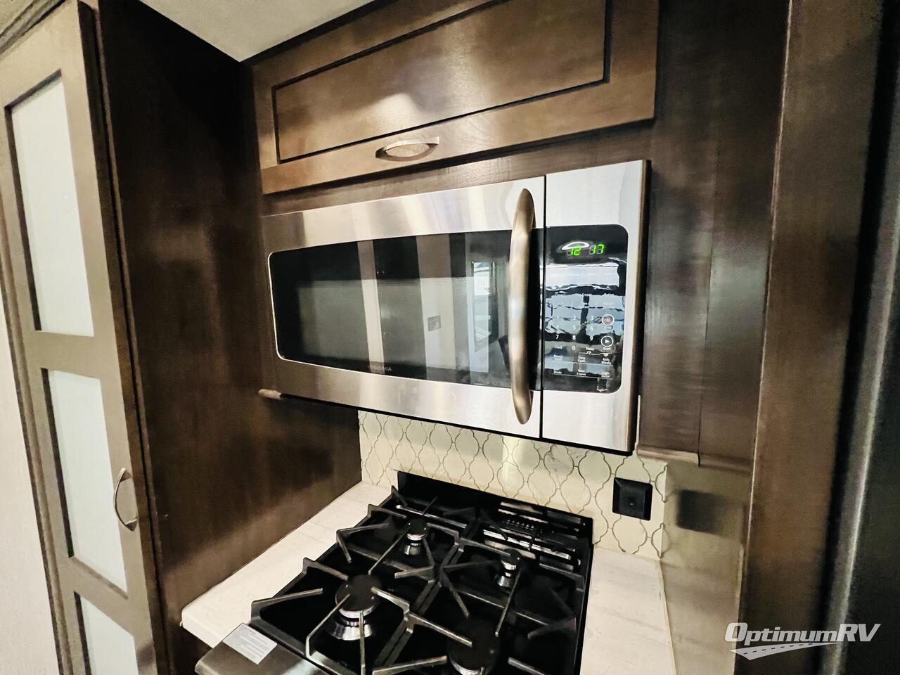 Whether you decided to go full-time RVing, or camping at your local state park, this fifth wheel is packed with at-home features you're sure to love. The front entertainment/living area allows you to relax like you do at home and with dual opposing slides, you'll have more space to stretch out. The power theater seats sit directly across from the 50" TV on swing arm for easy viewing and you'll find two tri-fold sofas for the grandkids to sleep on at night. The chef of the family will have everything they need to prepare meals each day; a 24" free-standing gas range, an over-the-range microwave, a hutch and pantry for extra storage space, and a kitchen island. You'll also find dual opposing slides in the kitchen as well to create an open space and the half bath is located right off of the kitchen for convenience. This fifth wheel features a private suite with a king bed slide out and a large full rear bath, complete with a shower with a seat and drop-down storage for toiletries.