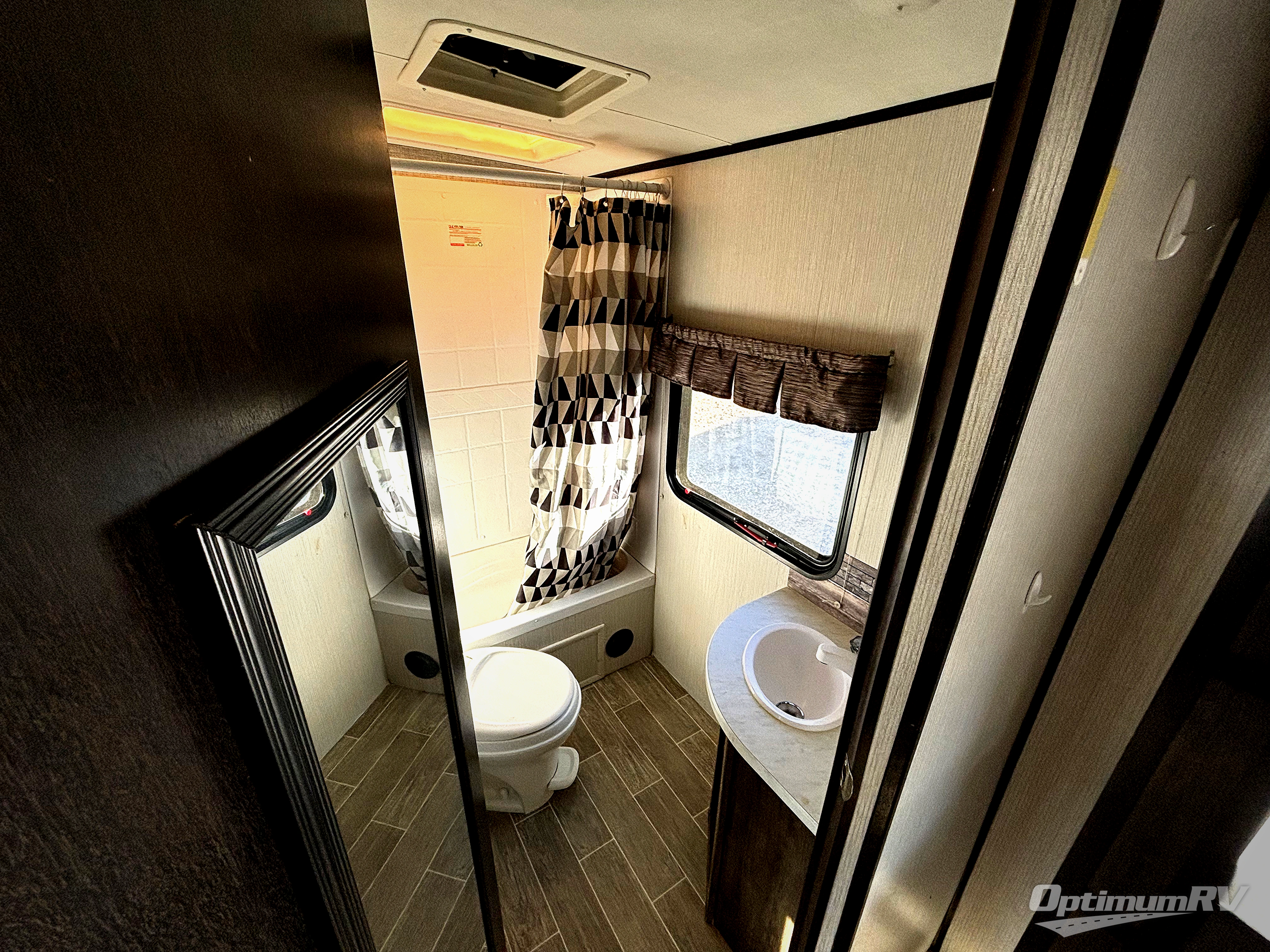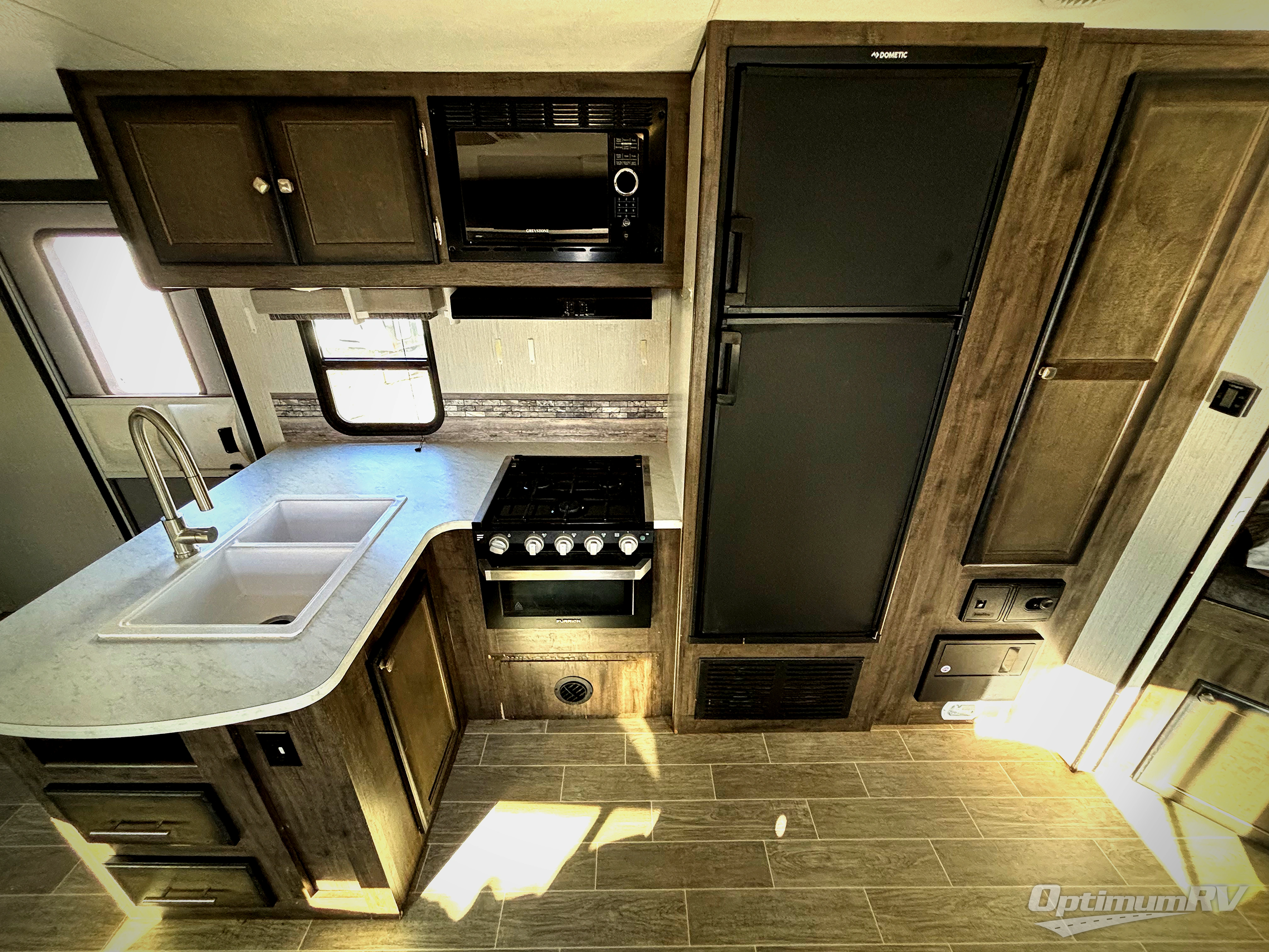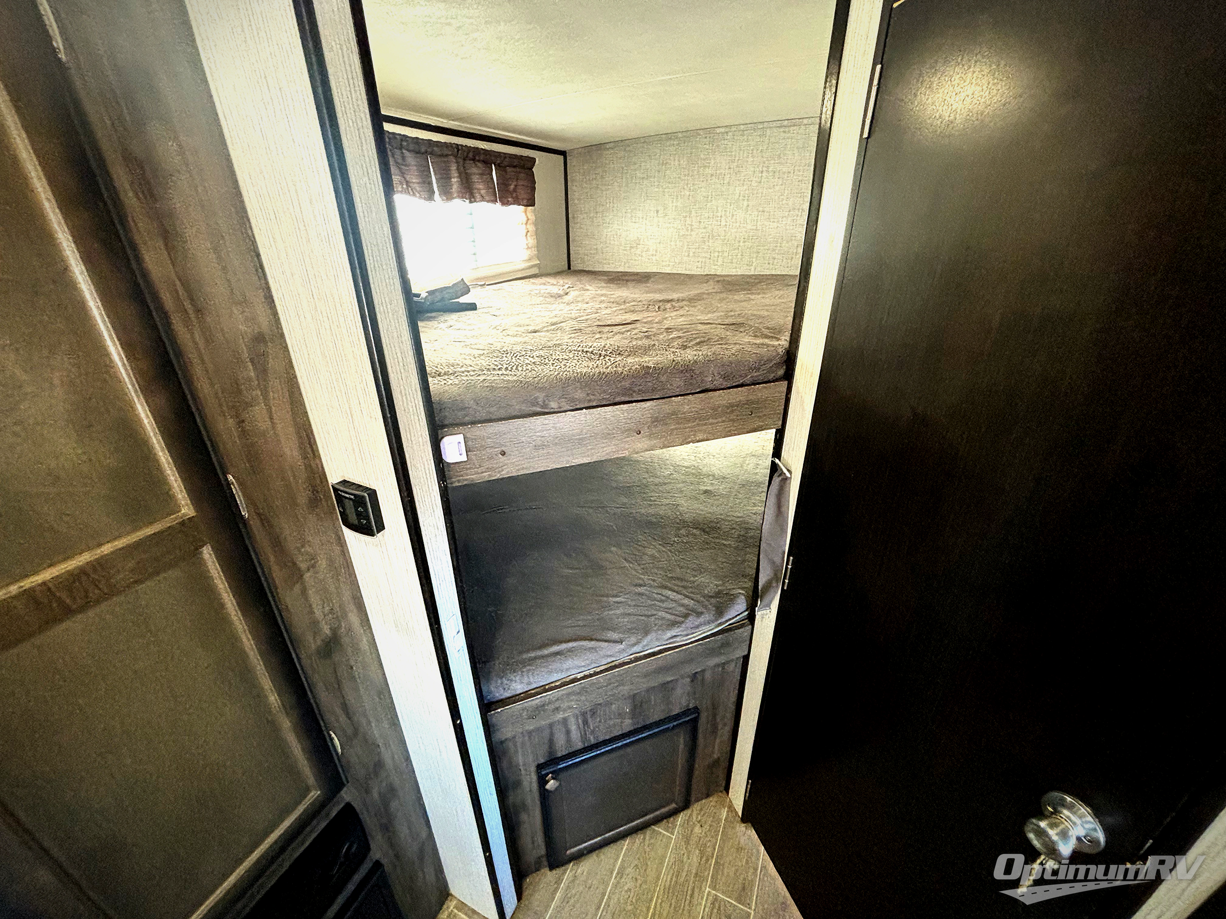 You will enjoy every camping vacation in this trailer with features such as the exterior slide cook top, and the set of double size bunk beds next to the corner full bathroom which will come in handy for any late night trips. The booth dinette is the perfect place for you to enjoy your meals at, play a game or even transform into an extra sleeping space for guests, and right next to it is the sofa. And the single slide gives everyone more floor space to move about when inside, and the power awning allows everyone to relax outdoors with some protection from the elements.