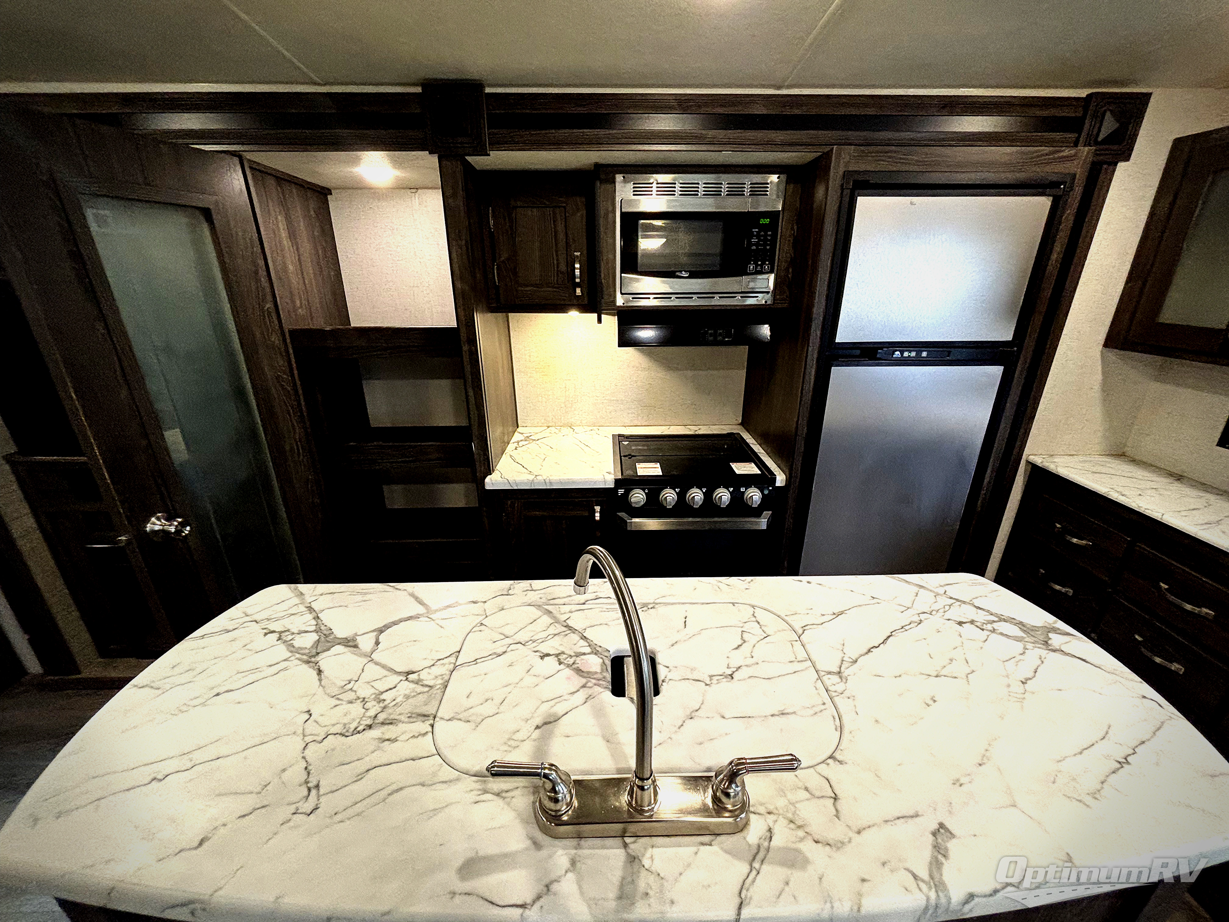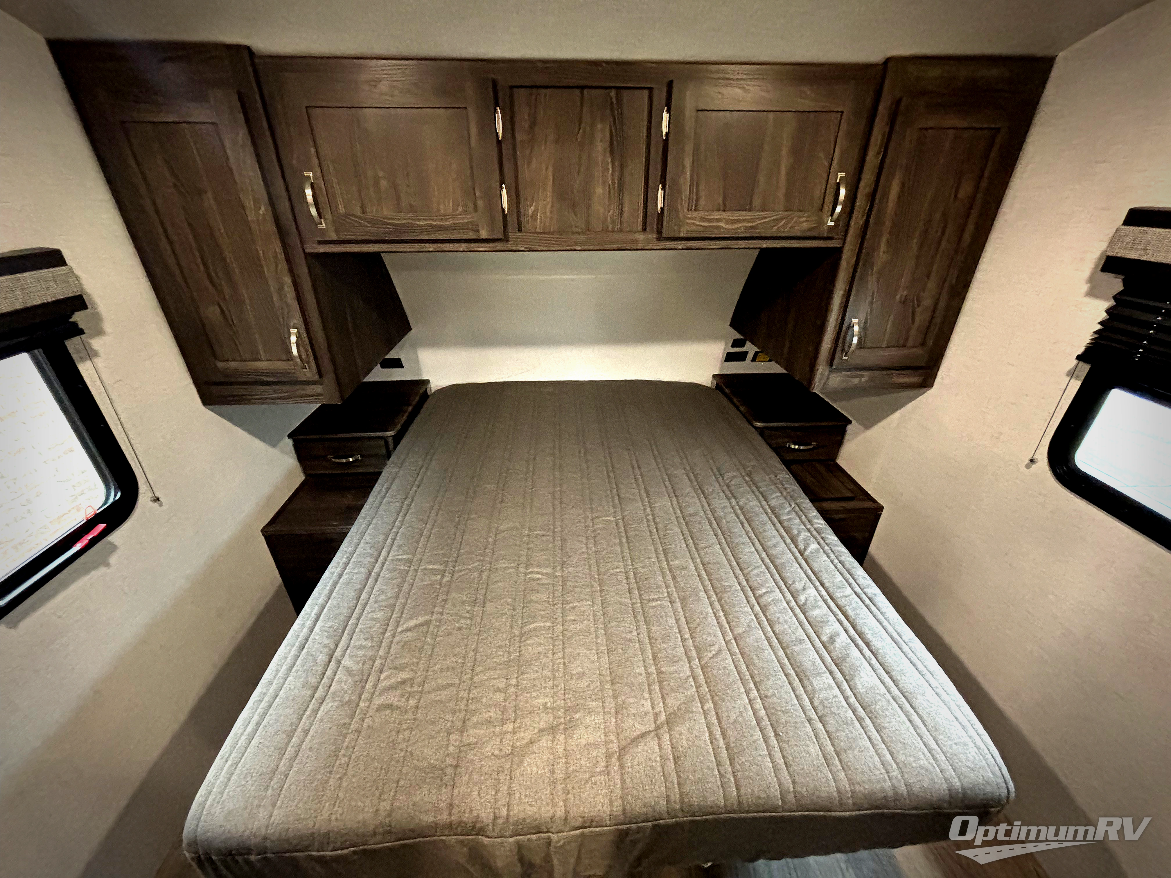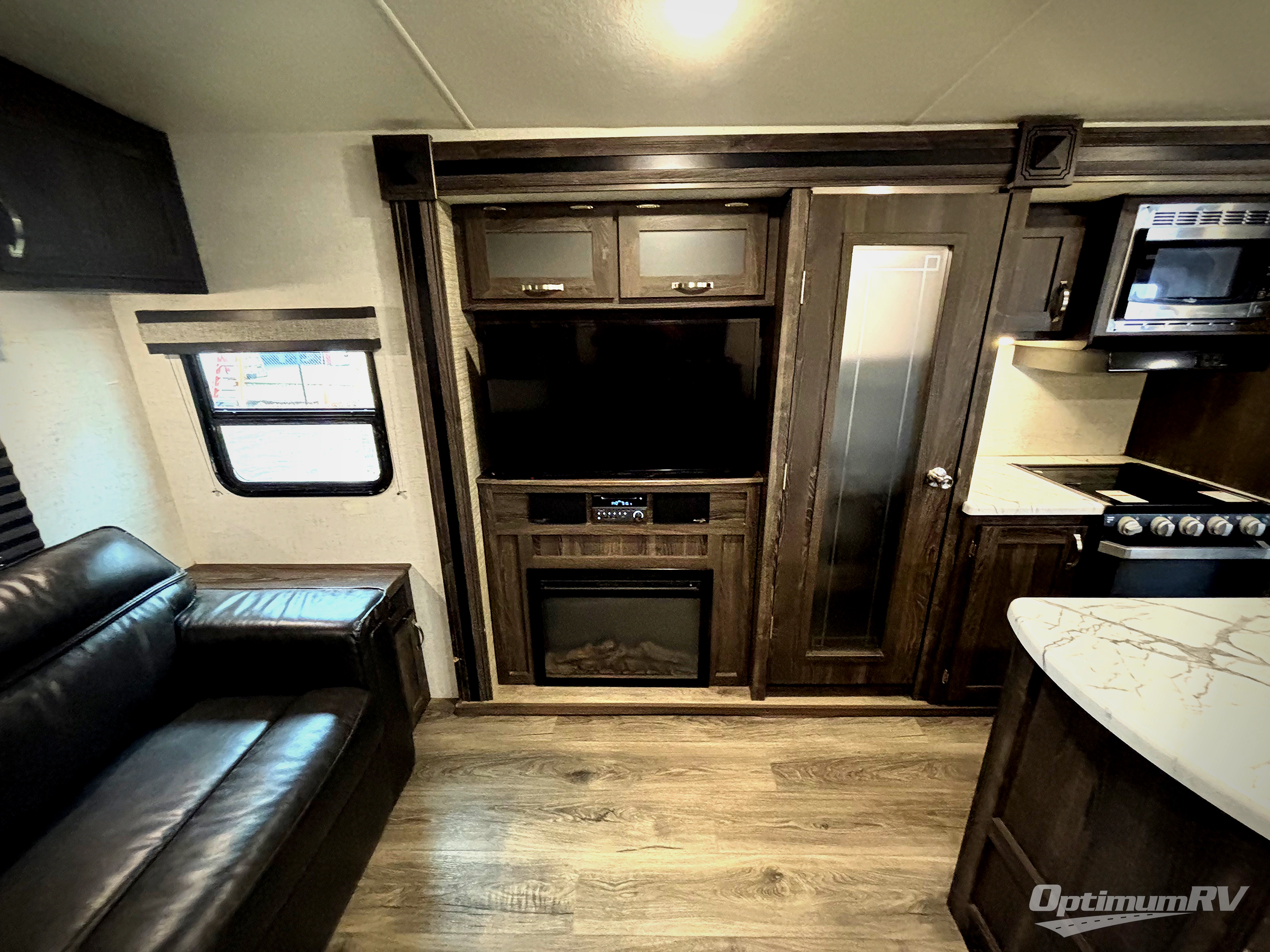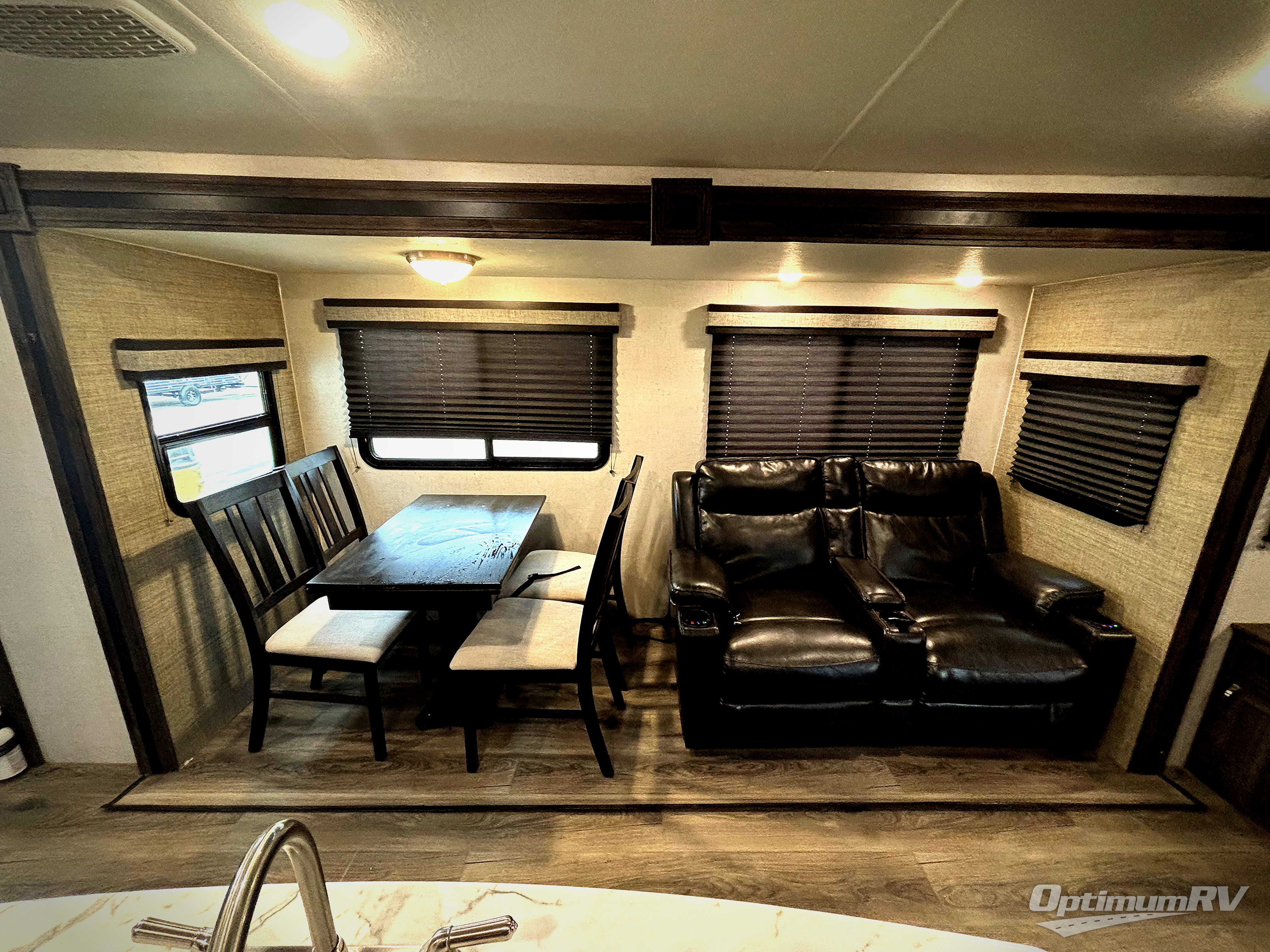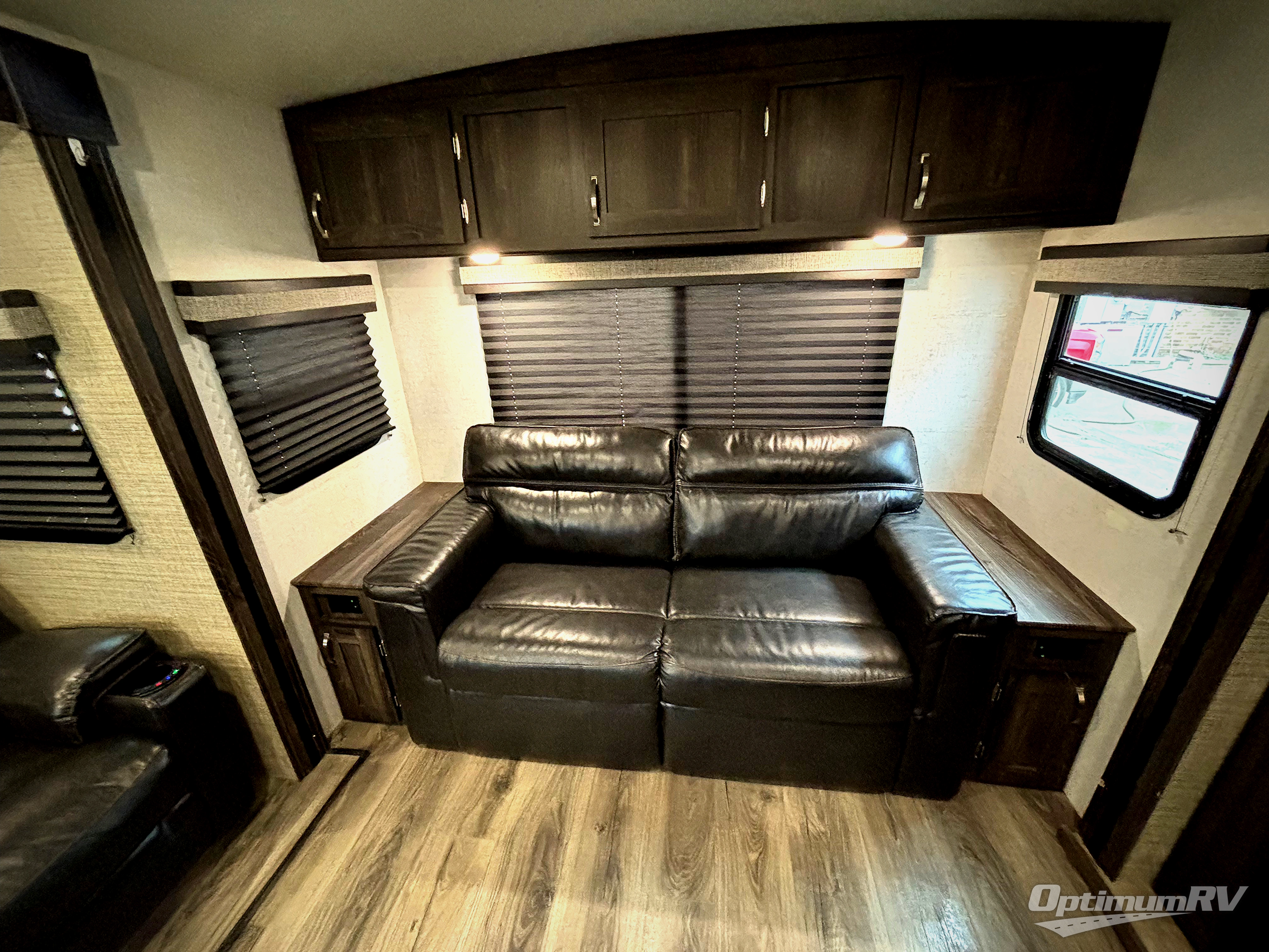 Have you been thinking about purchasing an RV for you and your favorite person with extra sleeping accommodations for family and friends? Well you might have found it! You will have your own walk-around queen bed with pet kennel underneath and dual shirt closets as well as easy access to the double entry bathroom. You can offer the family the tri-fold sofa and booth dinette as well as someone might sleep in a theater seat after everyone is finished hanging out in the main living area and kitchen. The next morning the cook can make breakfast using the stainless steel appliances and kitchen island as well as the hutch. And some campers might decide to grab a camp chair from the pass-through storage with motion light to sit under one of the two power awnings outside.