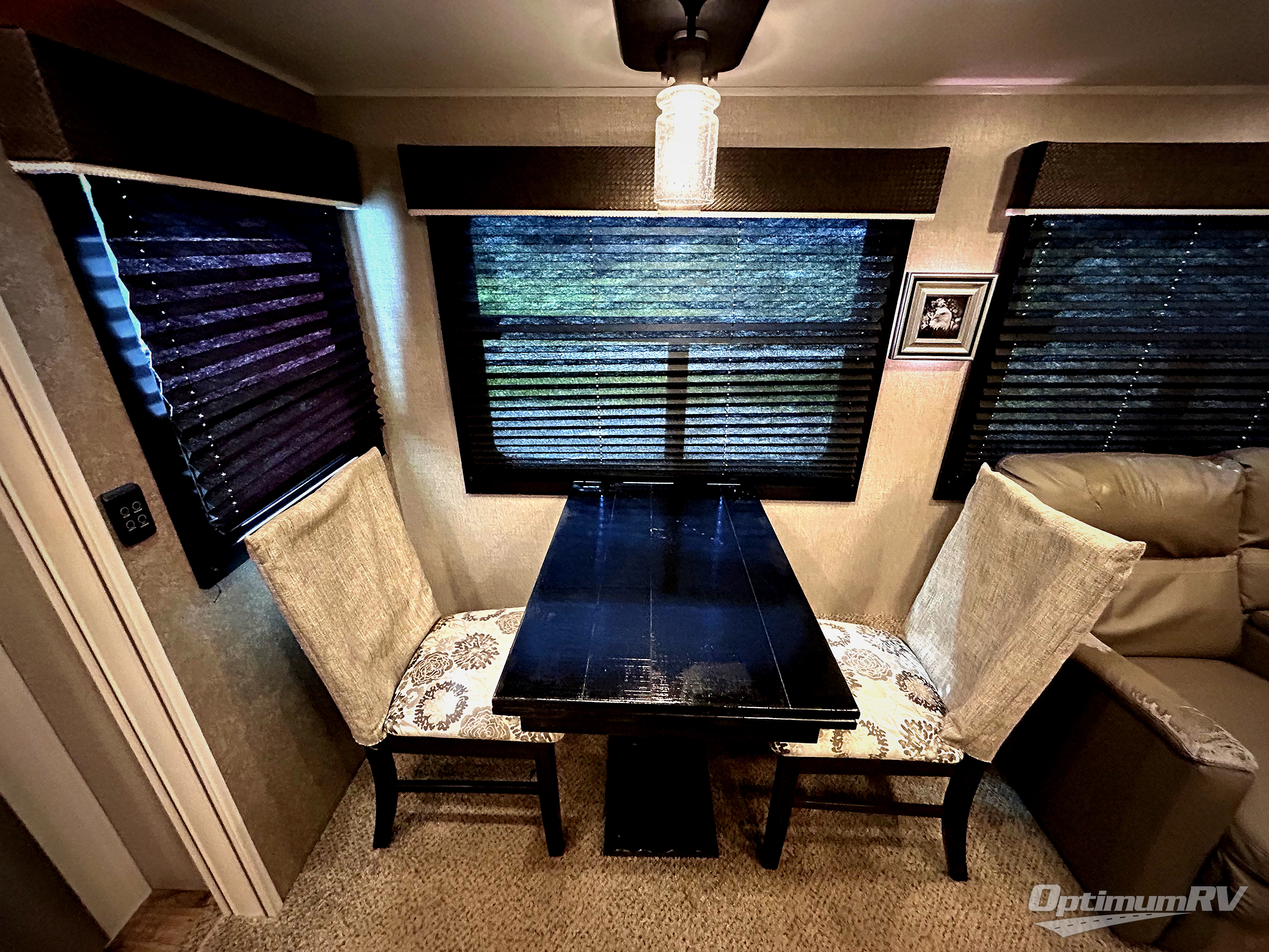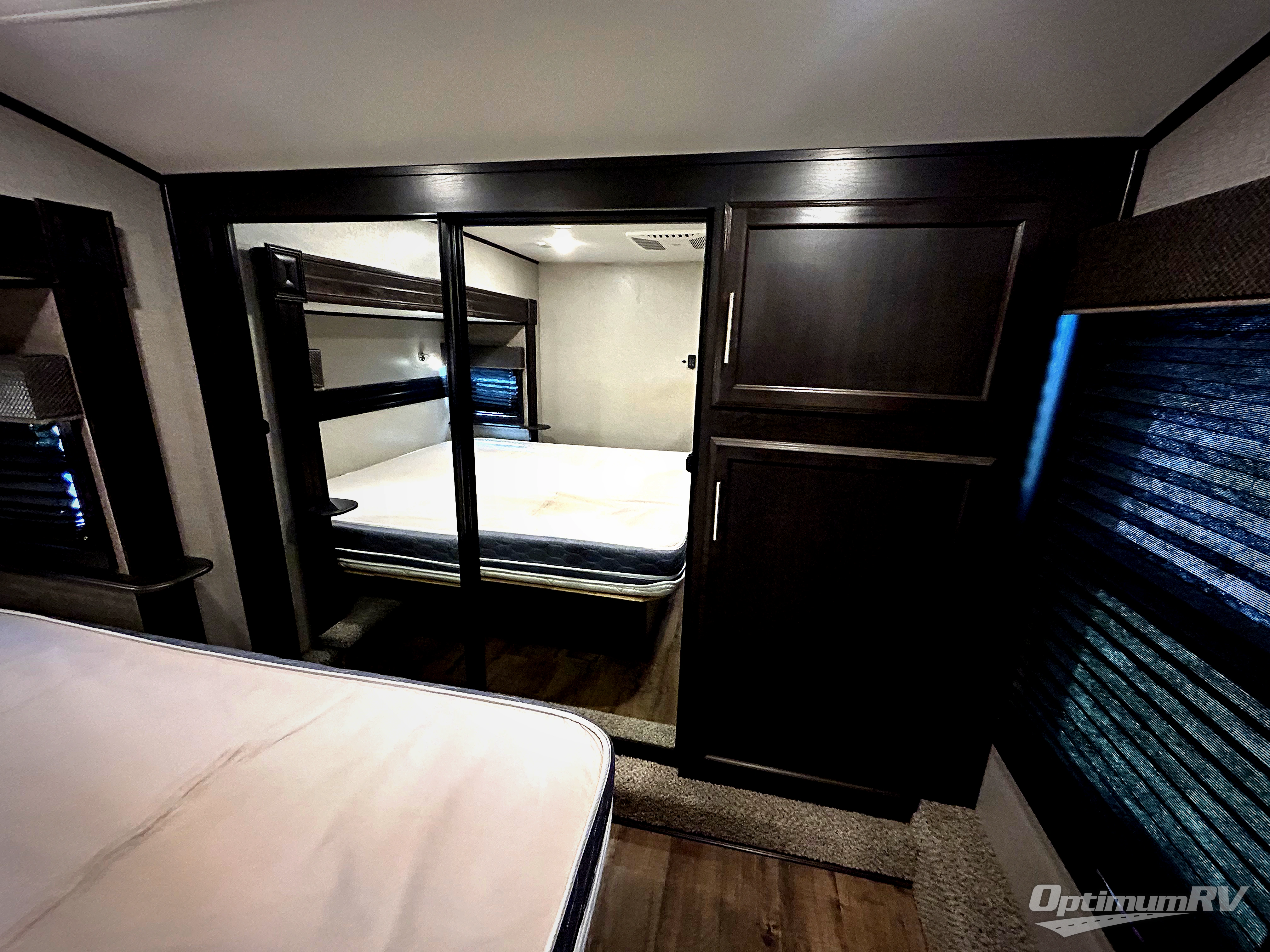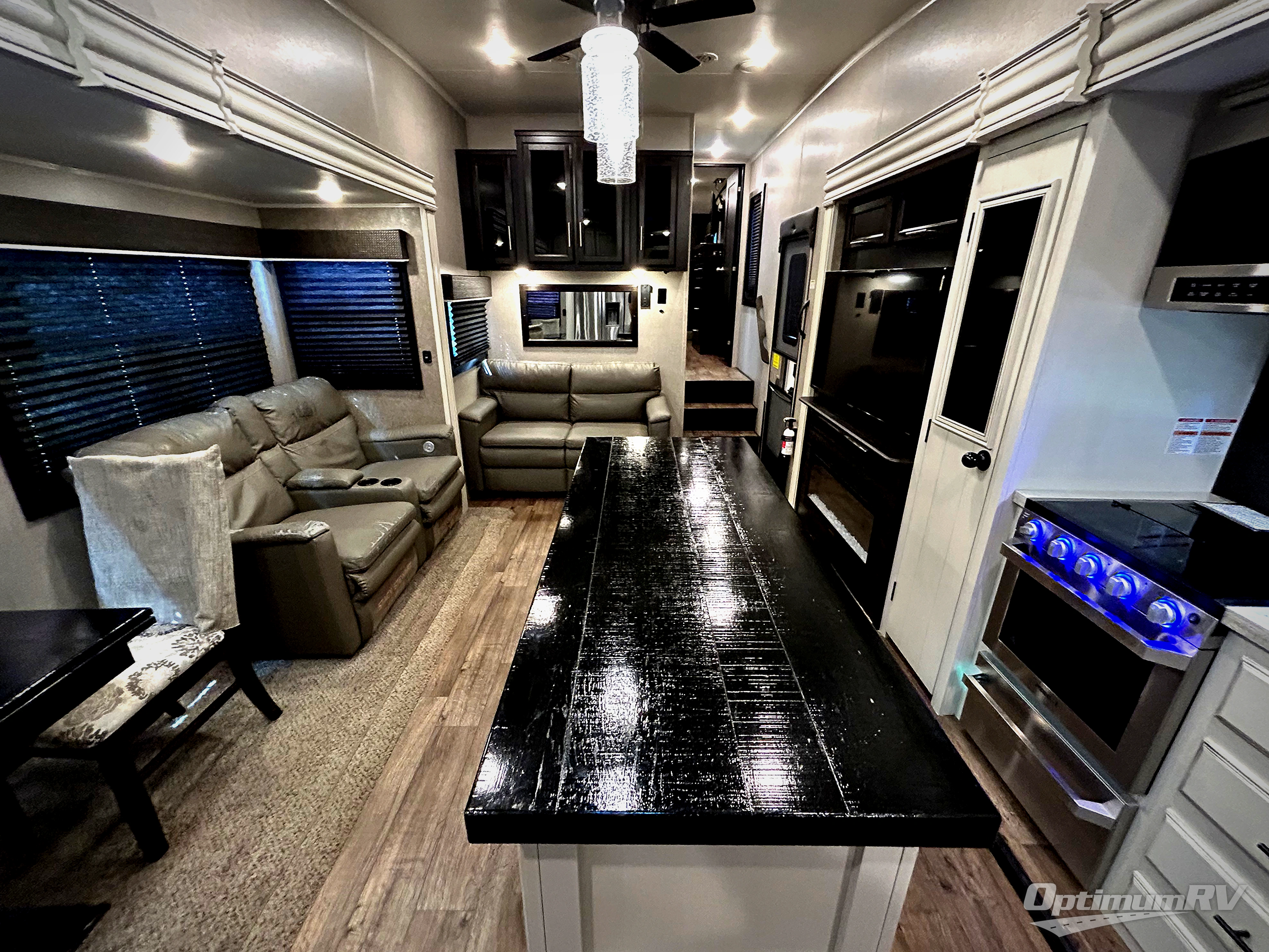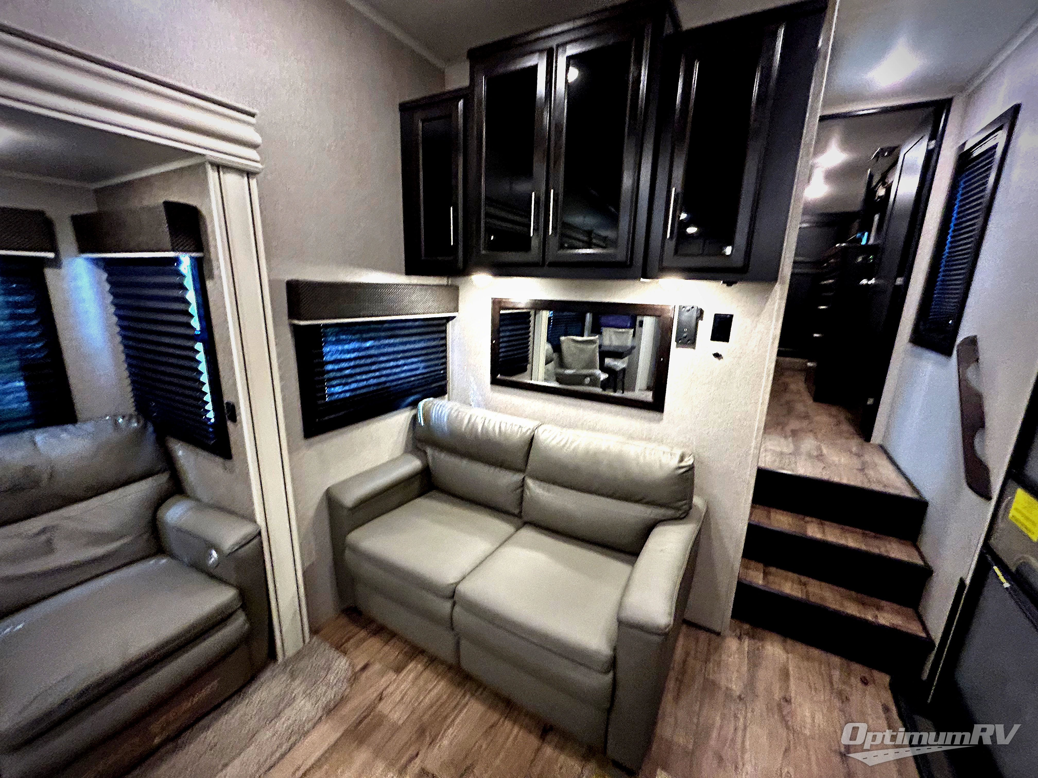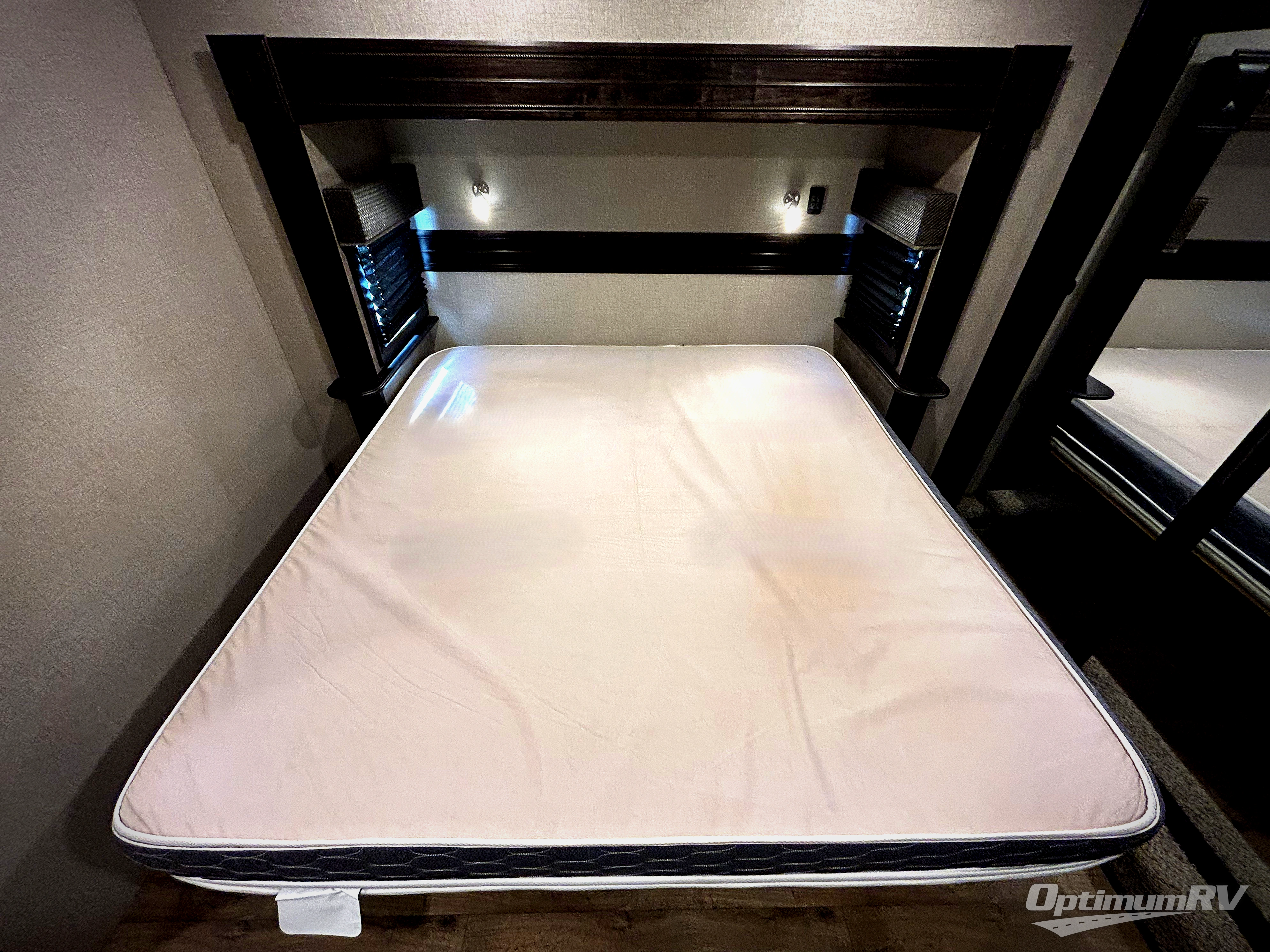 The huge island with bar stools creates a stylish focal point for this Eagle fifth wheel! Not only can you gather around the island in the bar stools, but you can also sit back in one of the two recliners, at the free-standing table with chairs, or on the hide-a-bed sofa while you chat with the cook. And the cook will appreciate having extra space from the opposing slides to move around and grab ingredients from the 13.5 cubic foot refrigerator. Plus, you'll also find a private bedroom up front so that you can retire in comfort once the day has ended.