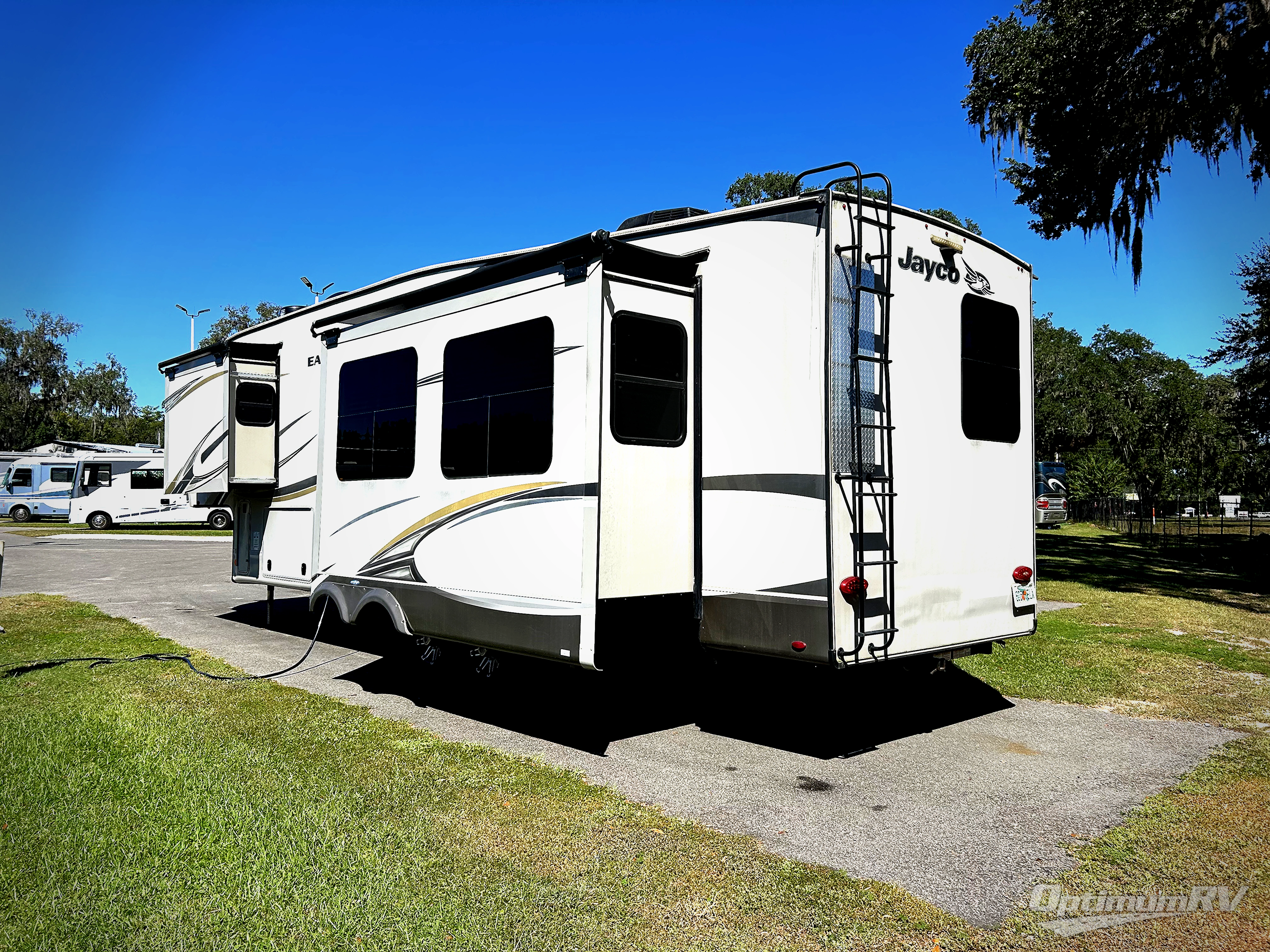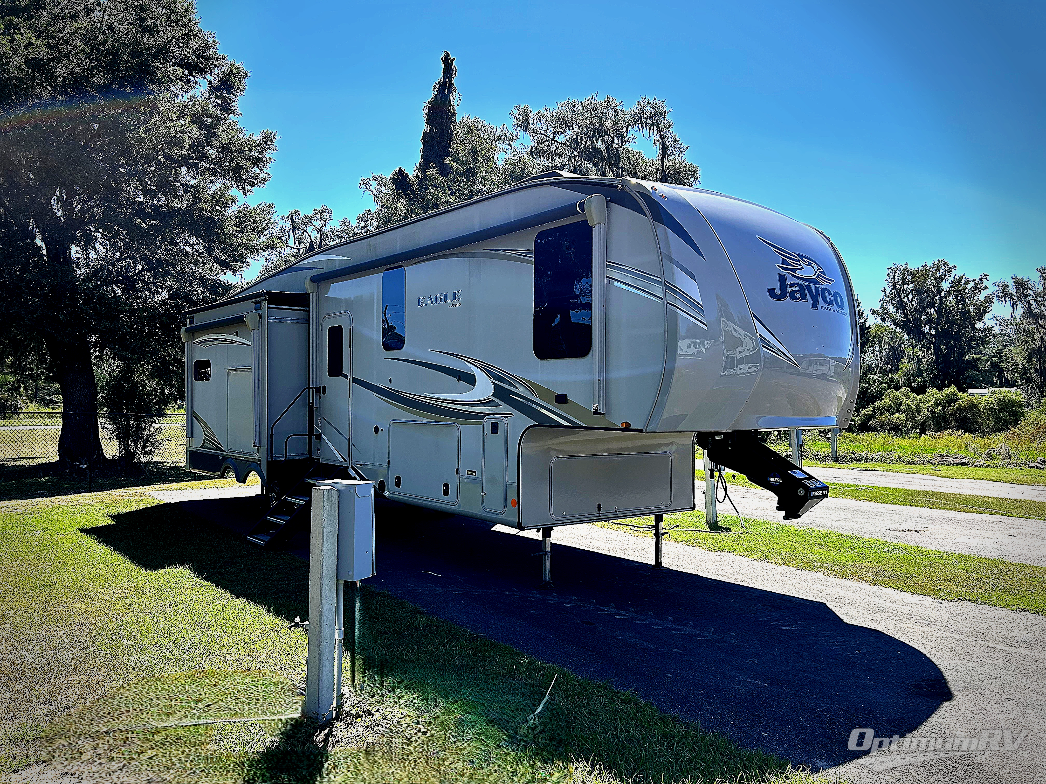 These famous Jayco Eagle fifth wheels and travel trailers come with a long and rich history of quality construction, modern styling, and innovative design! The 4-Star Handling Package comes standard on every model, and it includes reliable features, like 16" Goodyear Endurance tires, Dexter axles with Nev-R-Adjust brakes, E-Z Lube hubs, and MORryde CRE-3000 rubberized suspension. The MORryde StepAbove entrance steps with blue LED lights will provide a solid entry system so that you don't worry about falling over as you bring your luggage inside, and you will also rest assured knowing that the entire unit has been crafted with a StrongholdVBL aluminum-framed, vacuum-bonded gel-coated fiberglass, a Magnum Truss roof system, and a Climate Shield zero-degree tested weather protection.