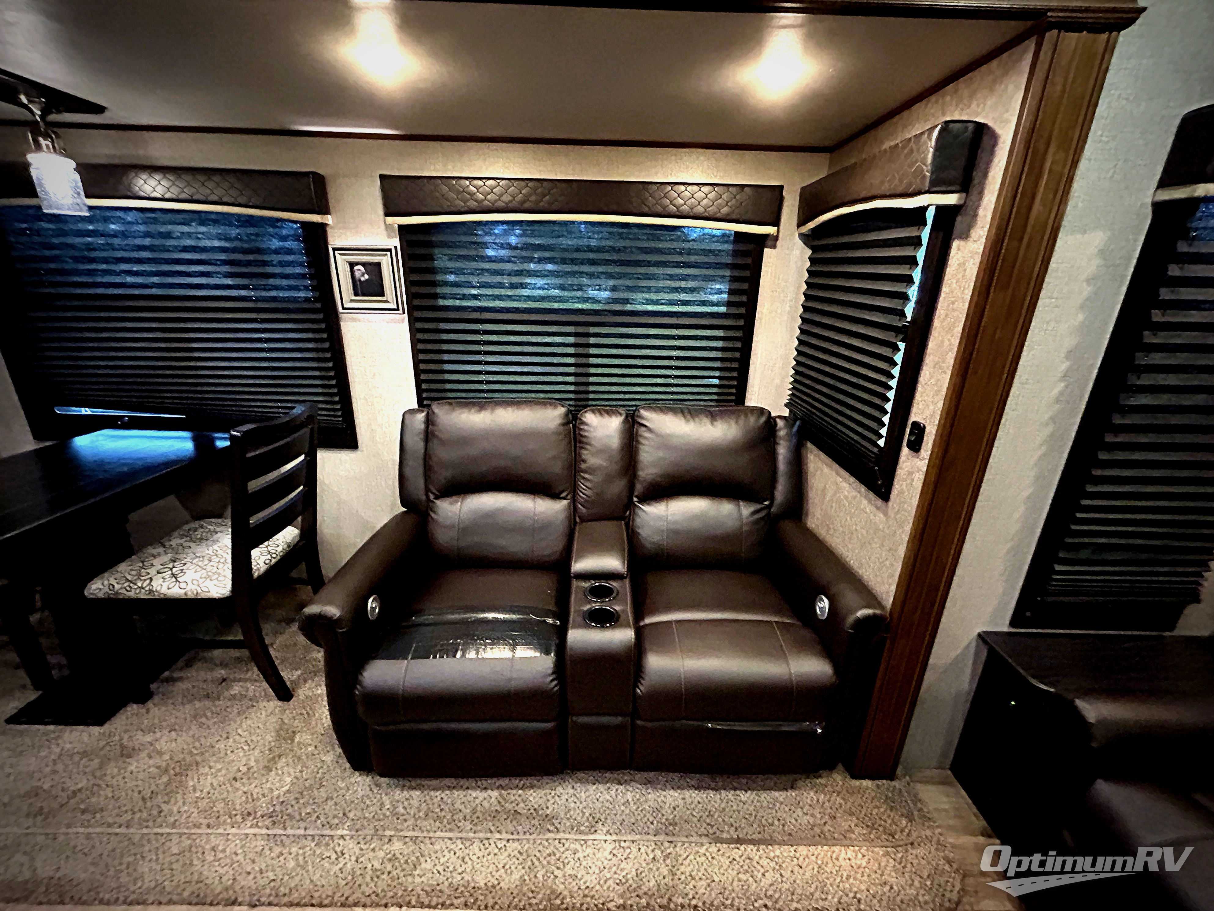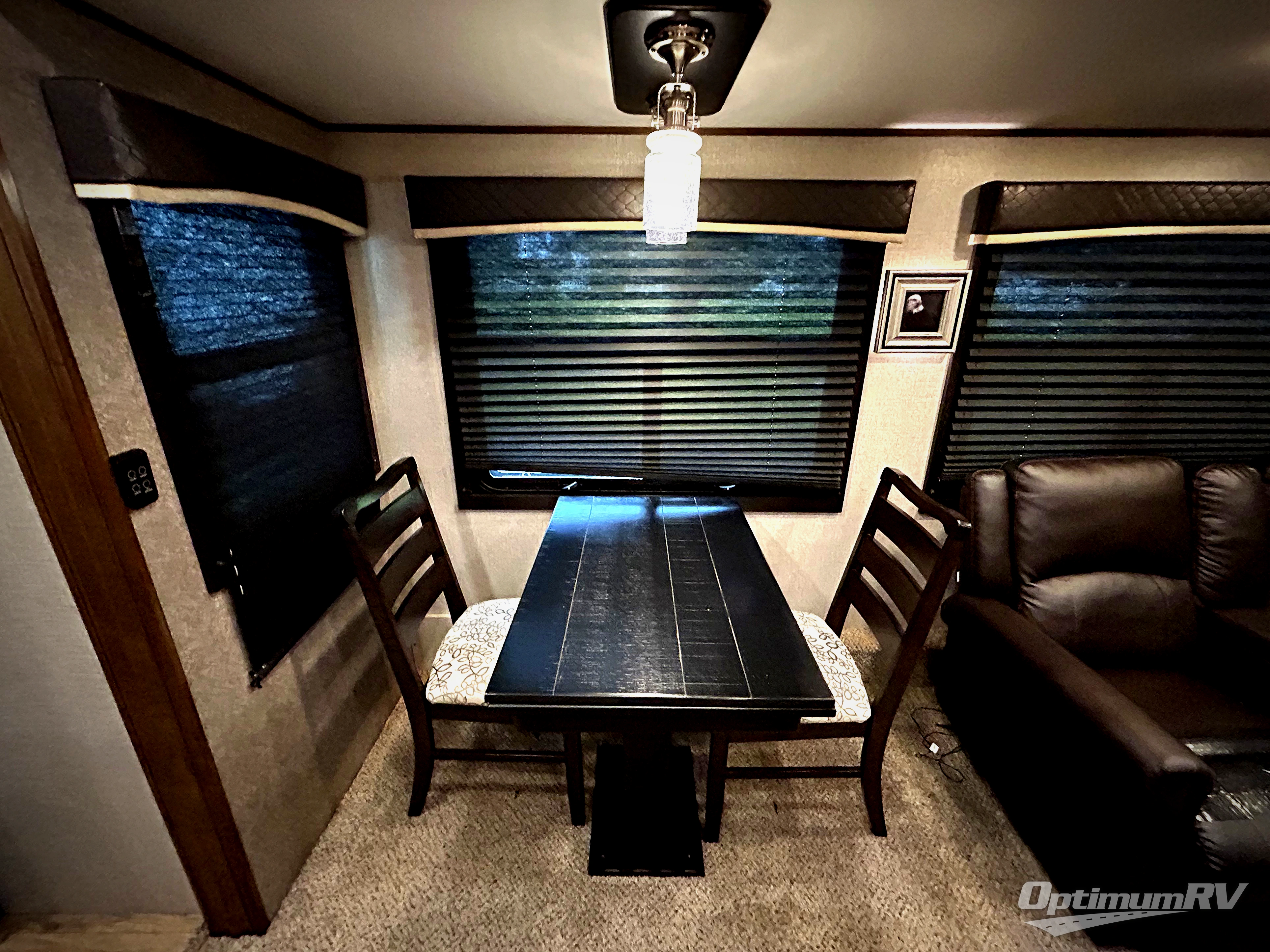 Spend a weekend in luxurious comfort with this Eagle travel trailer! As you sit back on the tri-fold sofa or dual recliners, you can also watch the big game on the 50" LED HDTV with integrated sound bar, and as soon as dinner is ready, you can head over to the free-standing table to sit down with a hot plate of spaghetti. Grab an ice-cold drink from the 13.5 cubic foot refrigerator to wash down your meal before heading up to the private bedroom to grab some pajamas from the full-size wardrobe.