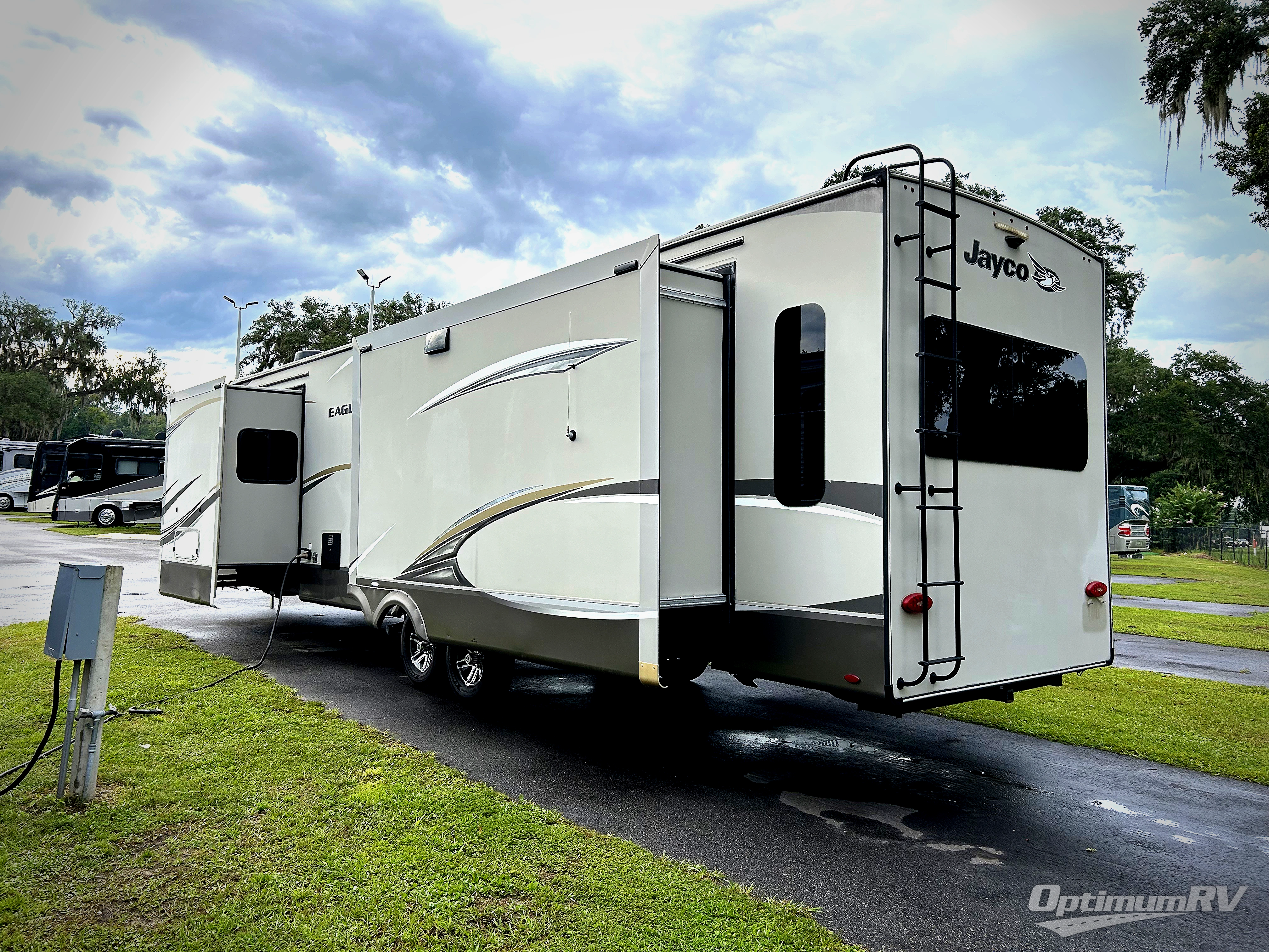 These famous Jayco Eagle fifth wheels and travel trailers come with a long and rich history of quality construction, modern styling, and innovative design! The 4-Star Handling Package comes standard on every model, and it includes reliable features, like 16" Goodyear Endurance tires, Dexter axles with Nev-R-Adjust brakes, E-Z Lube hubs, and MORryde CRE-3000 rubberized suspension. The MORryde StepAbove entrance steps with blue LED lights will provide a solid entry system so that you don't worry about falling over as you bring your luggage inside, and you will also rest assured knowing that the entire unit has been crafted with a StrongholdVBL aluminum-framed, vacuum-bonded gel-coated fiberglass, a Magnum Truss roof system, and a Climate Shield zero-degree tested weather protection.