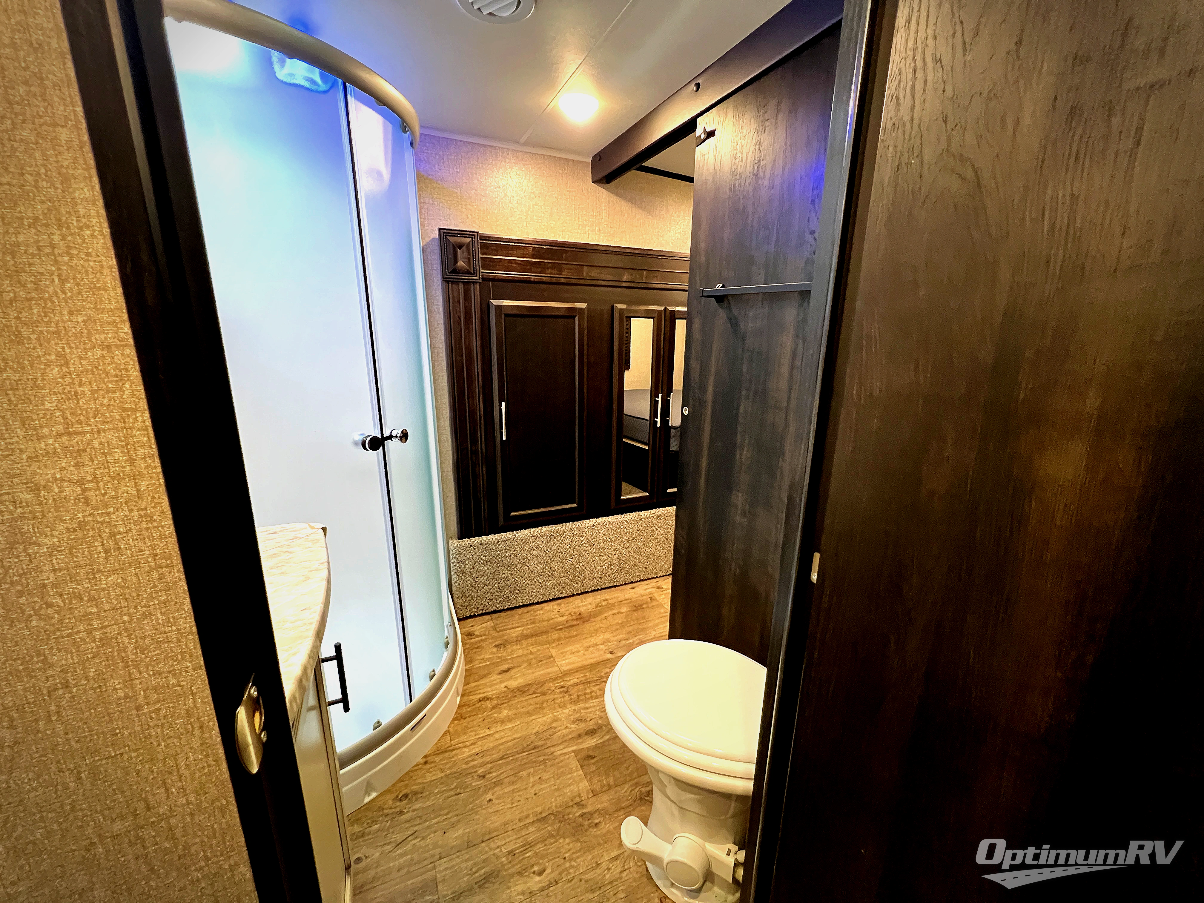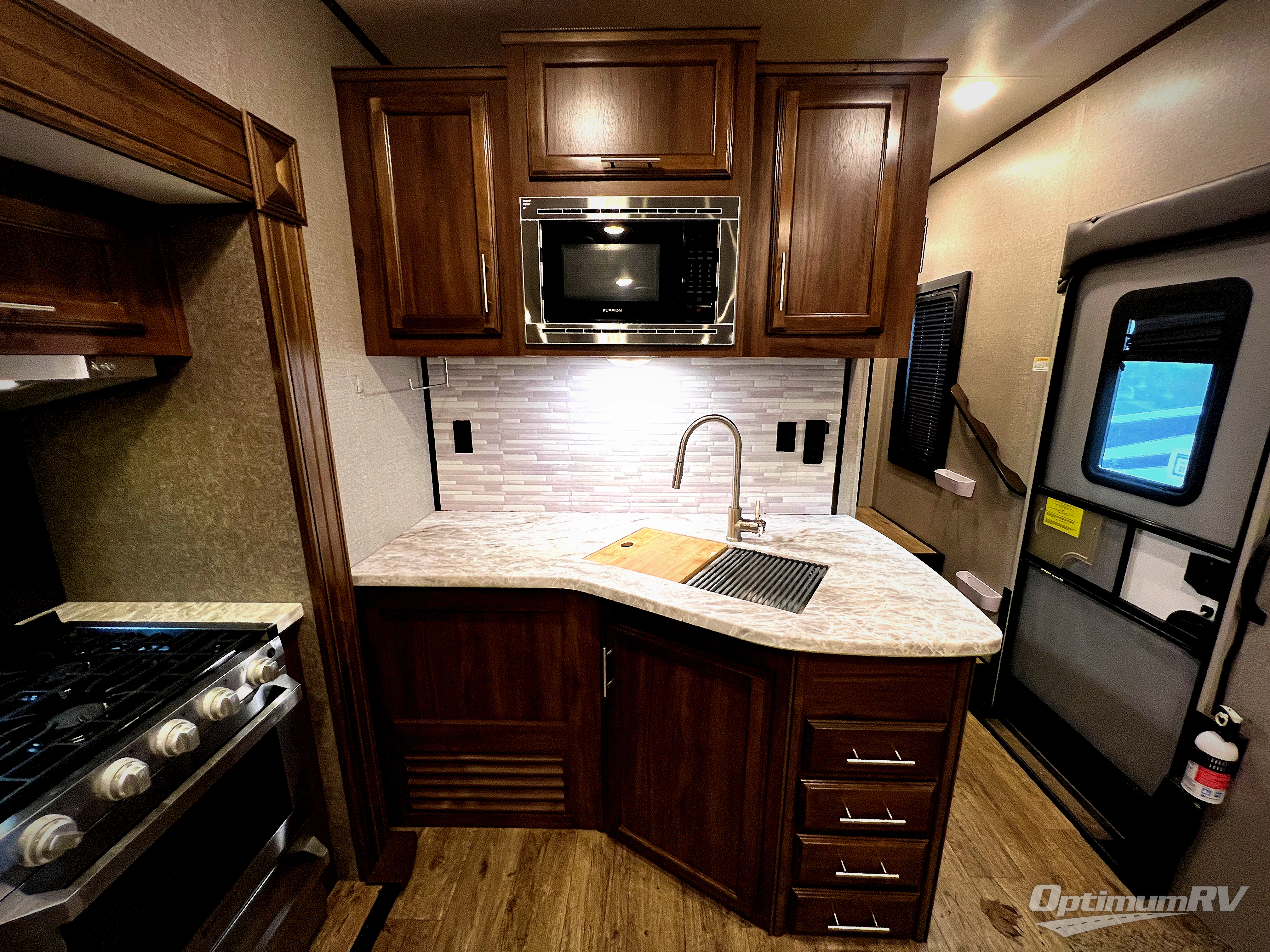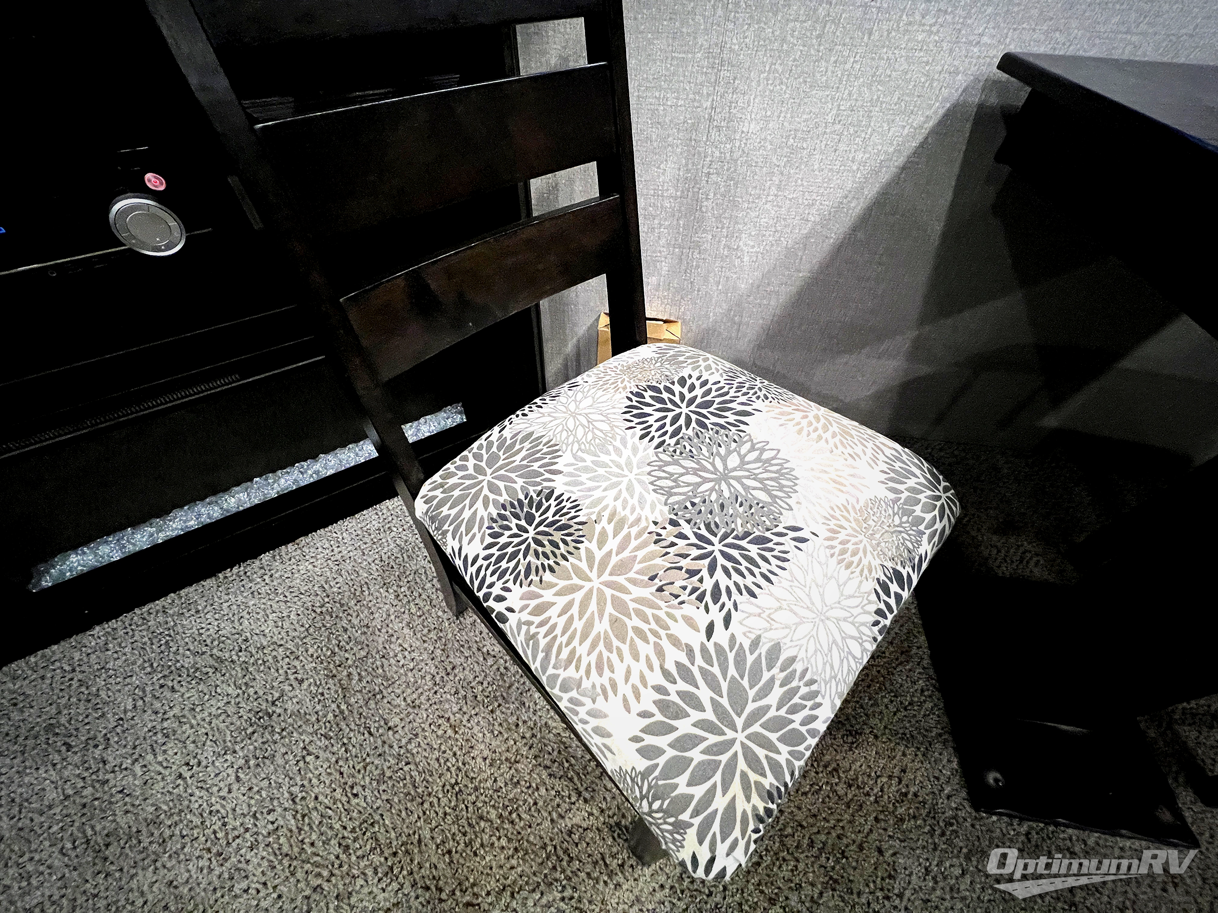 Dual opposing slides offer an open feel when you make meals in the kitchen with the stainless steel appliances, watch the LED HDTV, or relax on the tri-fold sofa in this Eagle HT fifth wheel. You can get cleaned up in the full bathroom with a radius shower, and the bedroom wardrobe slide includes a window for cross-ventilation and natural light. All of these features plus more make this a popular unit. You might even like to add a few options such as 16" Goodyear tires, an LED fireplace, and/or theater seating in place of the sofa.