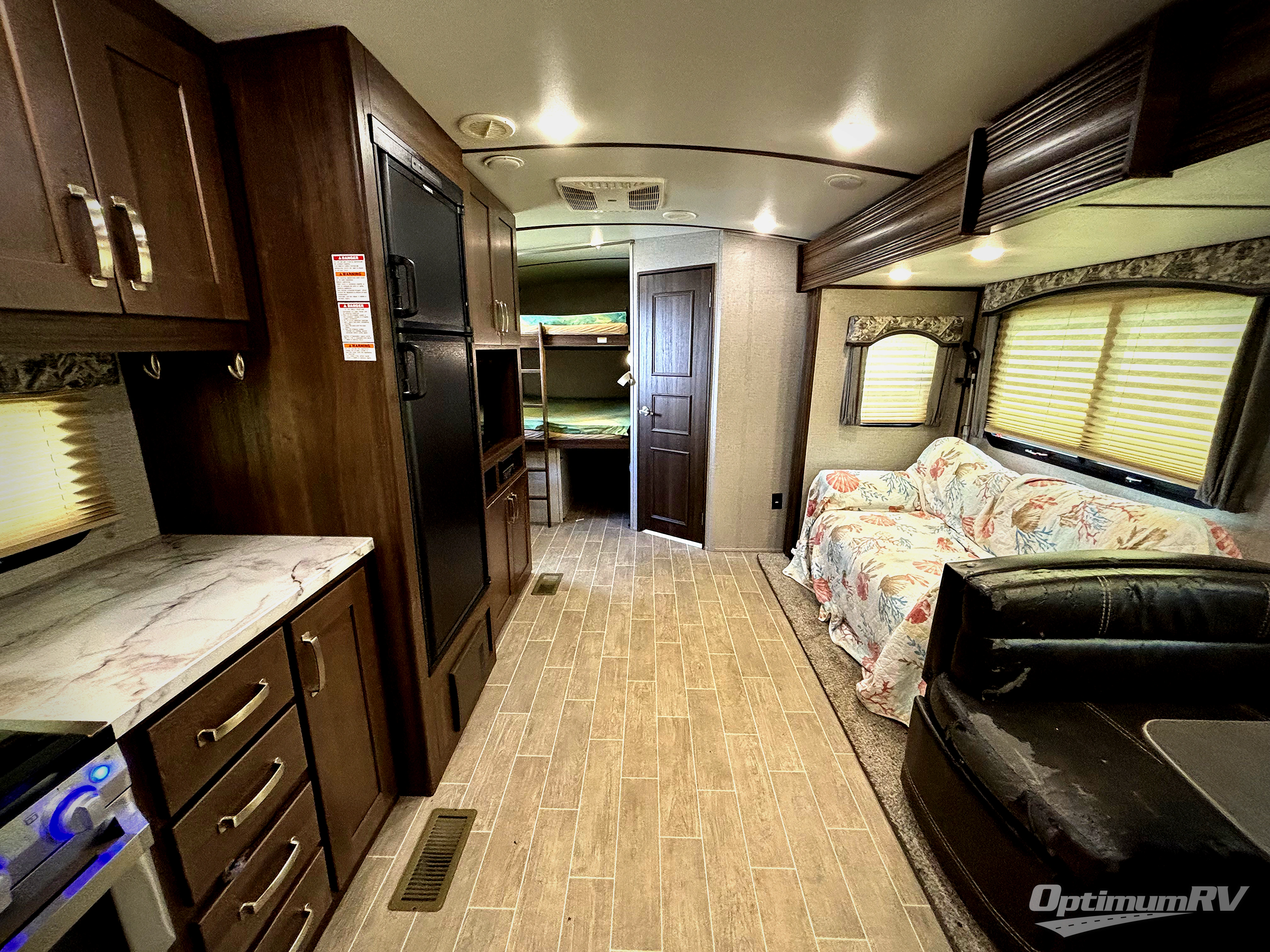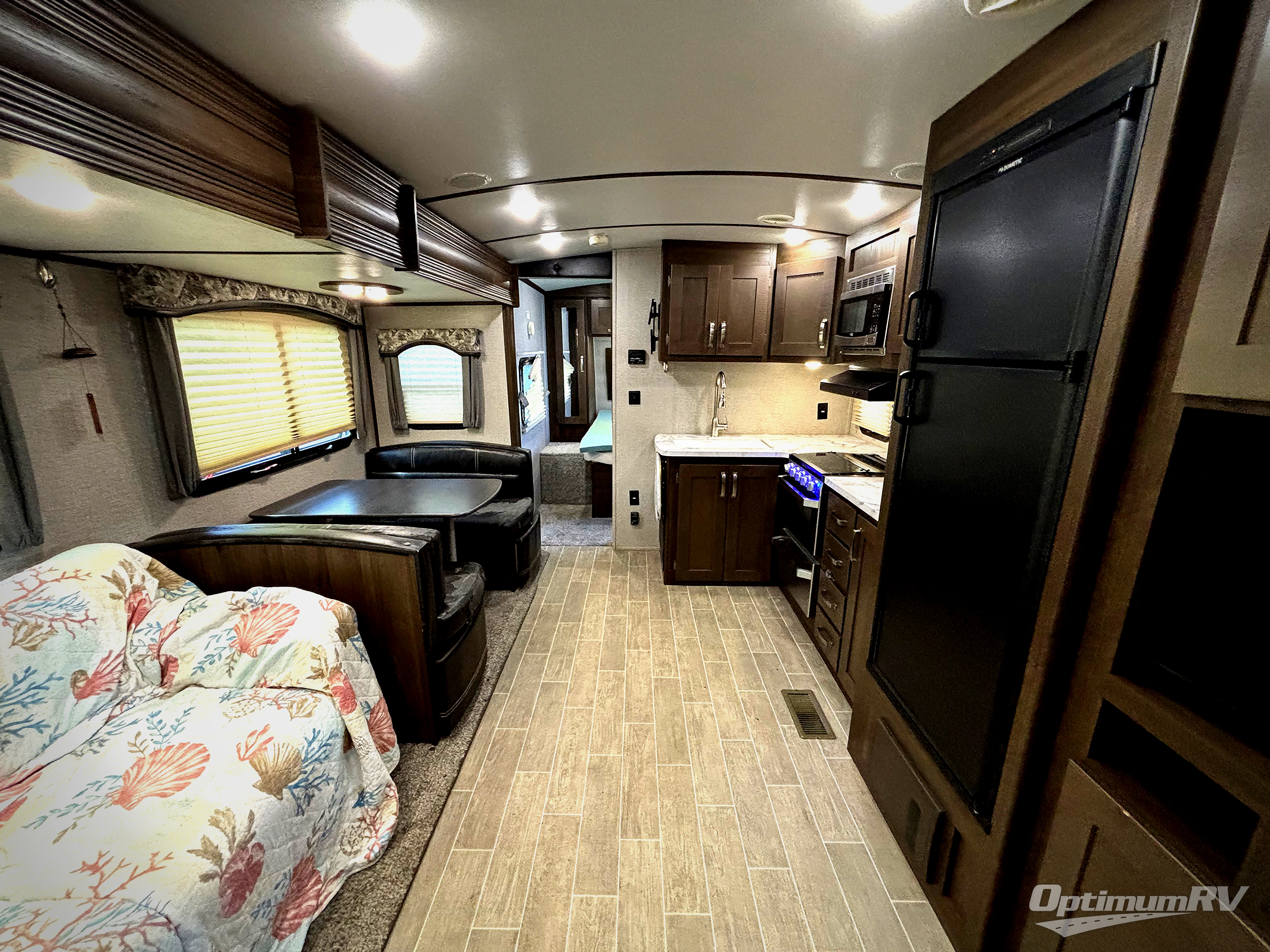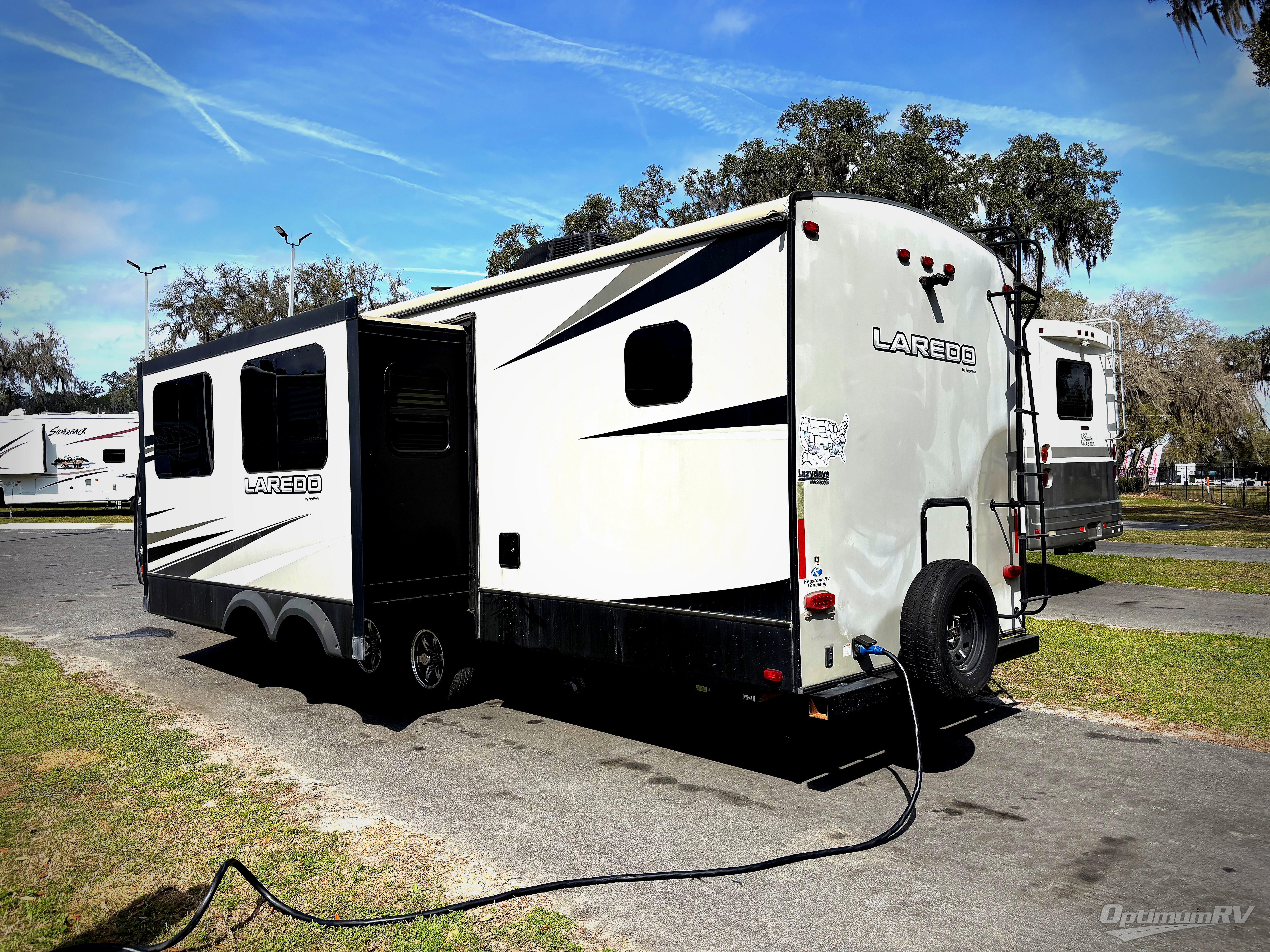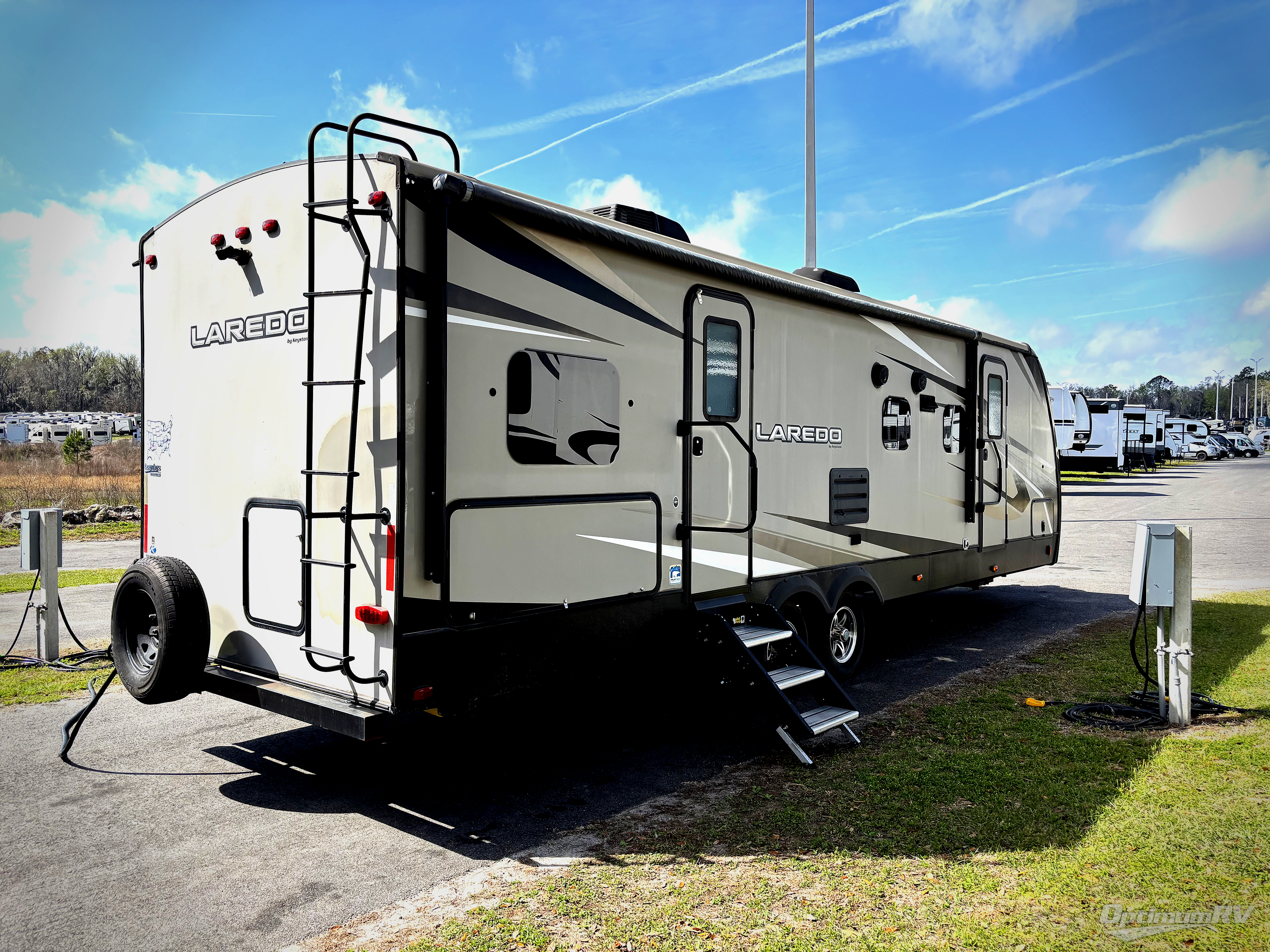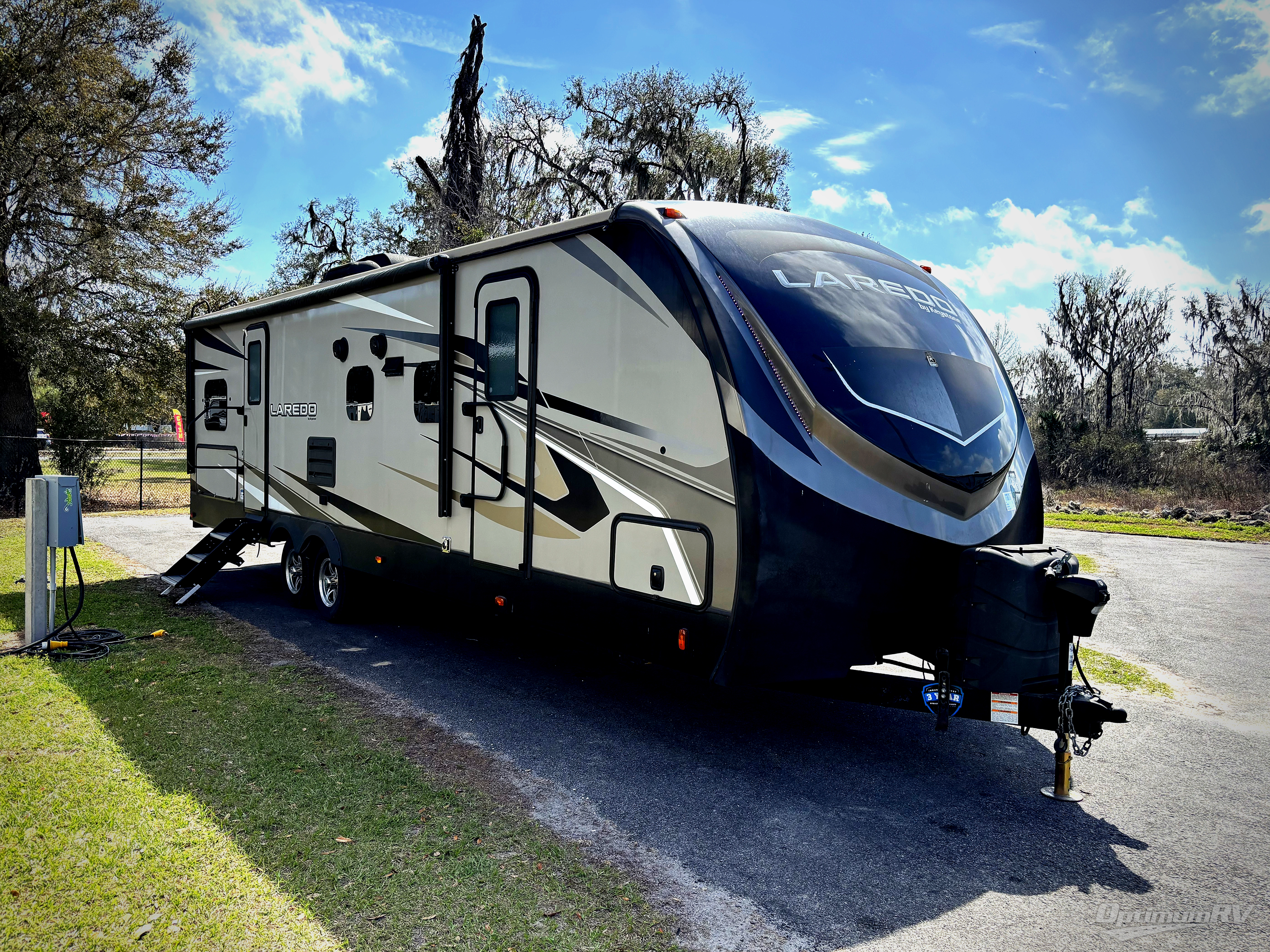 The Keystone Laredo fifth wheels and travel trailers are the very best at delivering upscale amenities, contemporary styling, and a variety of models! These units will allow you to travel with confidence because they come with Max Turn Technology which helps you maneuver easily into any campsite, and the Solid Step entry door remains level to the ground so that you can always enter safely. With a fully enclosed and heated underbelly and tanks, you will be able to adventure during any season without worry, and the oversized lighted and heated pass-through storage compartment will provide a safe place for all of your gear.