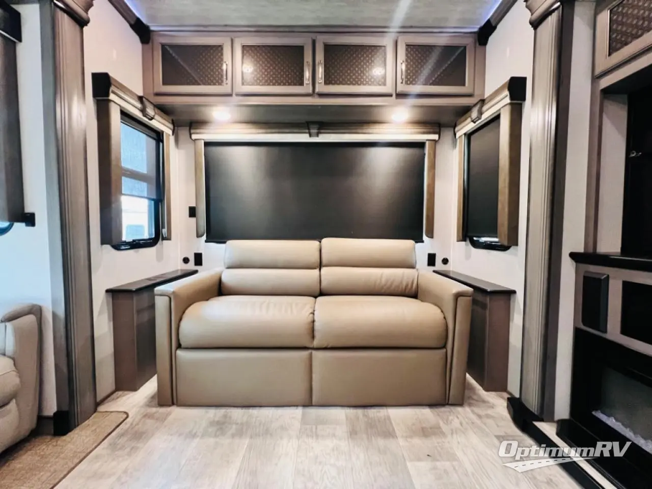 Watch your favorite show from the power theatre seating or the hide-a-bed sofa while the chef prepares a meal in the full kitchen including an island, a pantry, and a coffee station. The convection microwave will probably be a favorite appliance for many. You will also love your master bedroom with a slide out queen bed or choose an optional king, plus you will have plenty of storage for everything under the bed, within a dresser, and inside the closet up front. There is a space to add a washer/dryer option and the barn door into this room offers style and saves space. You may like to relax outside with protection from two awnings, and the 2" towing hitch might come in handy as well.