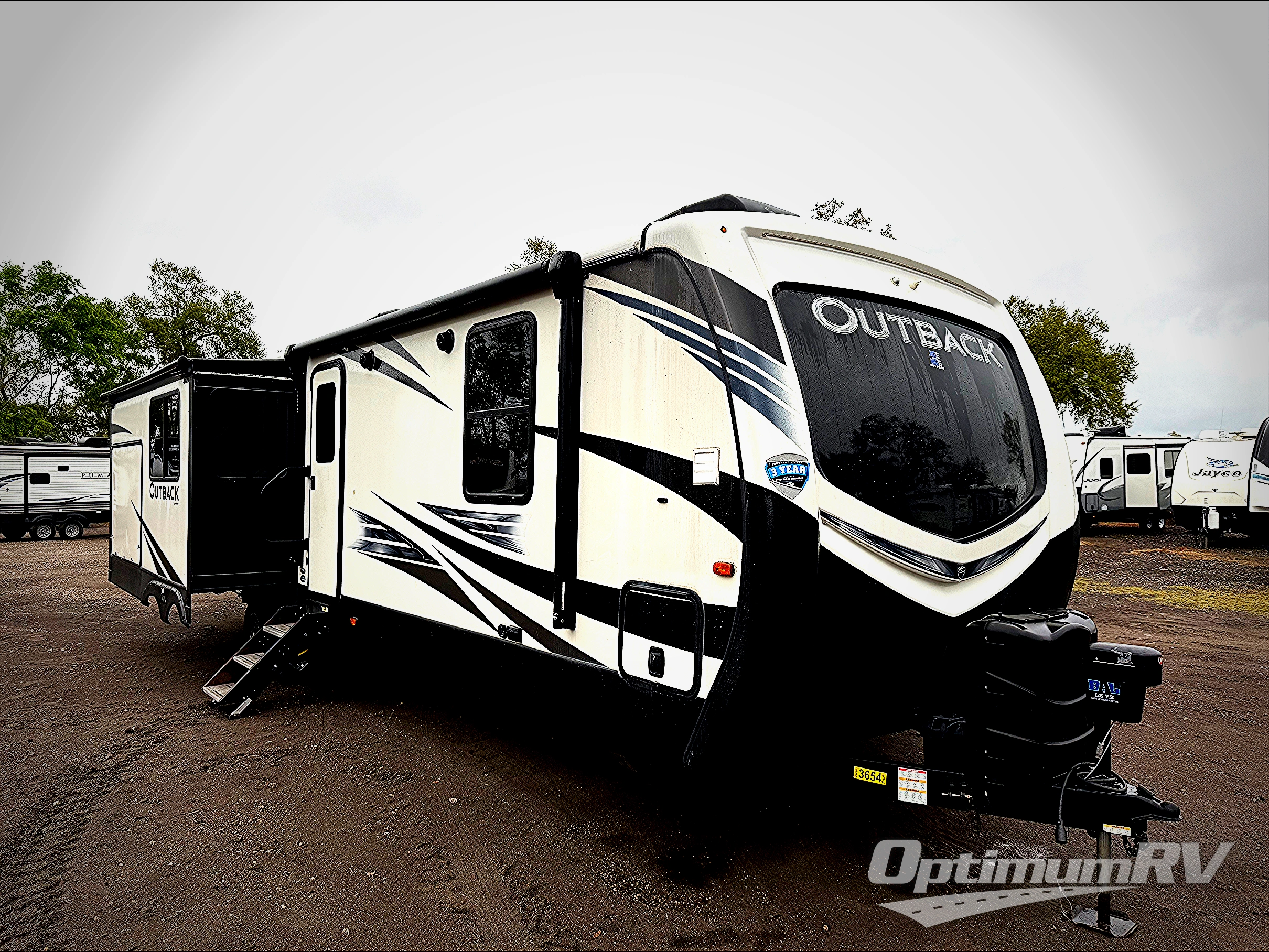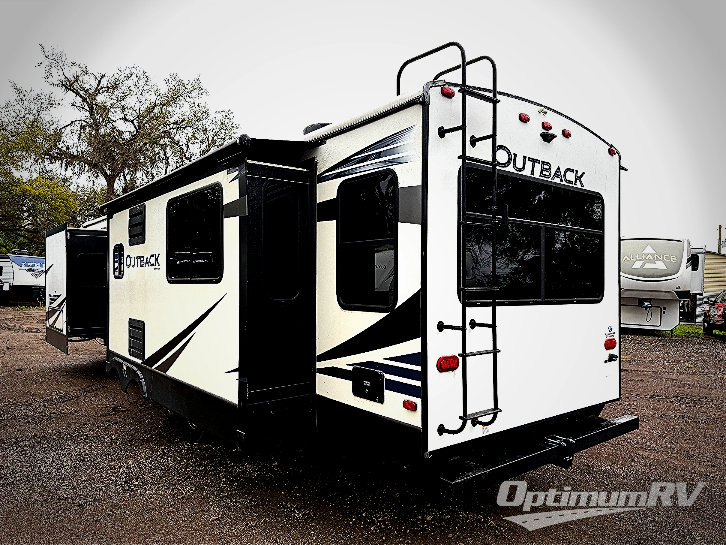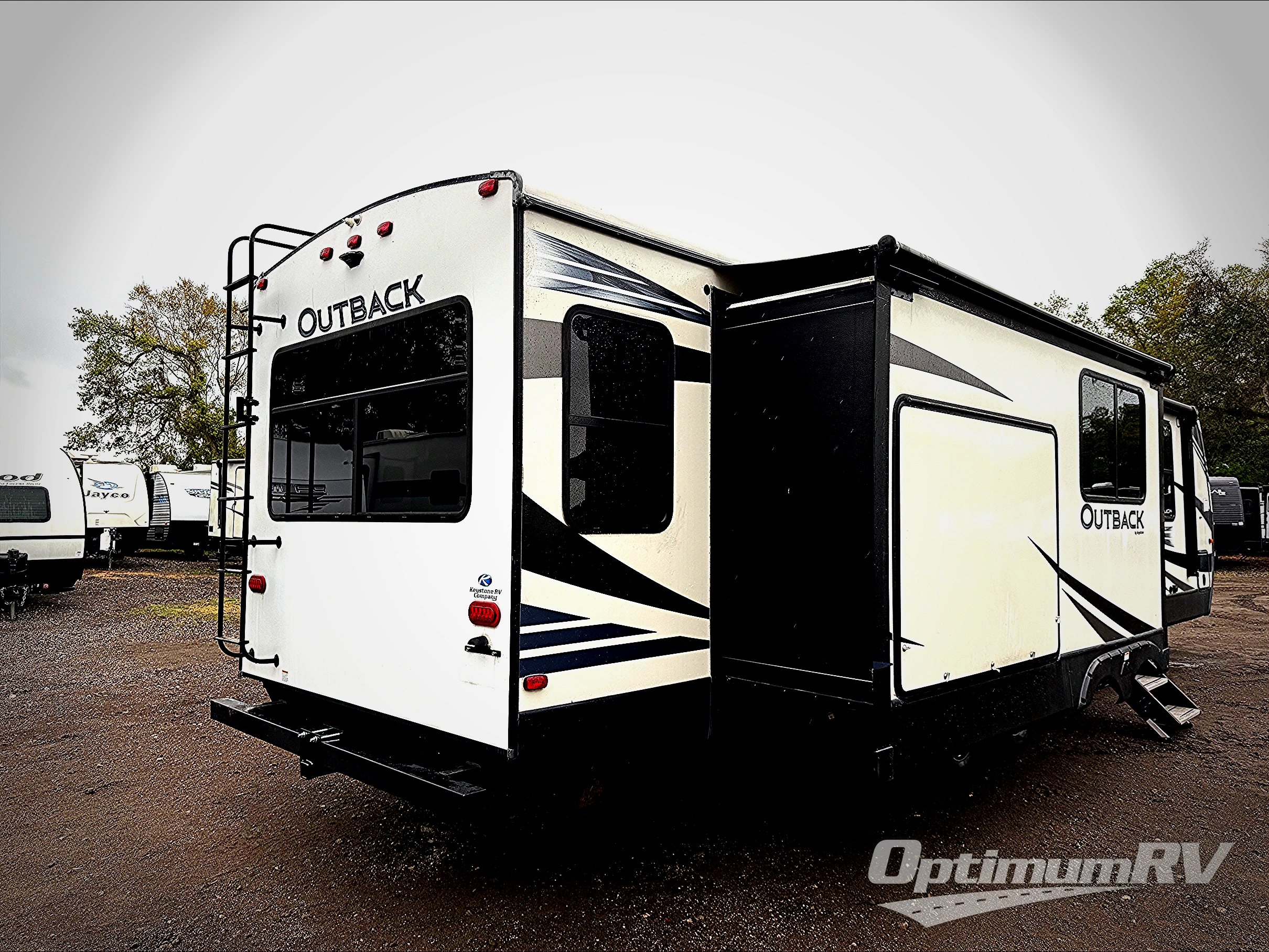 Take your camping expeditions to the next level with this Outback travel trailer! Your family's master chef will appreciate all of the appliances that have been included in both the indoor and outdoor kitchen, like the pantry, the three-burner range top, the kitchen island, and the 8 cubic foot double-door refrigerator. The large skylight located above the island will brighten up the interior with the sun's rays during the day and will allow the glow from the moon to illuminate the space at night. For a comfortable place to spend your evenings, you will love heading to the king-size bed in the private master suite where you can sleep peacefully and restore your energy for tomorrow's adventures.