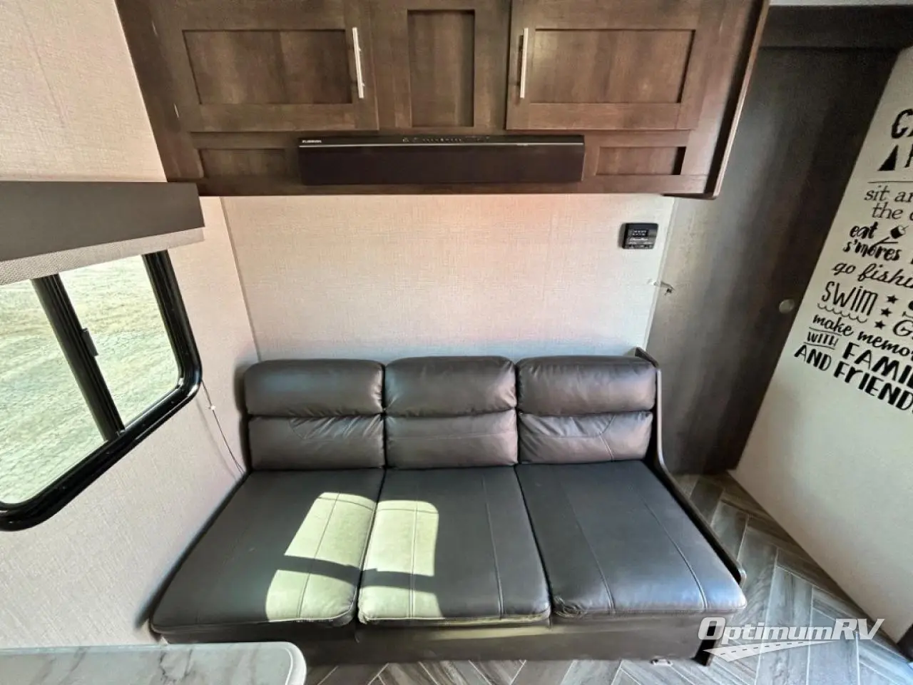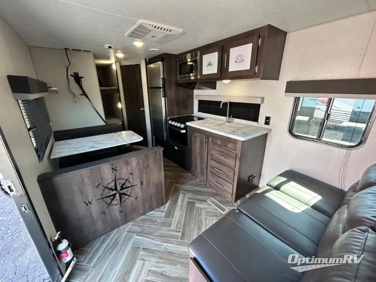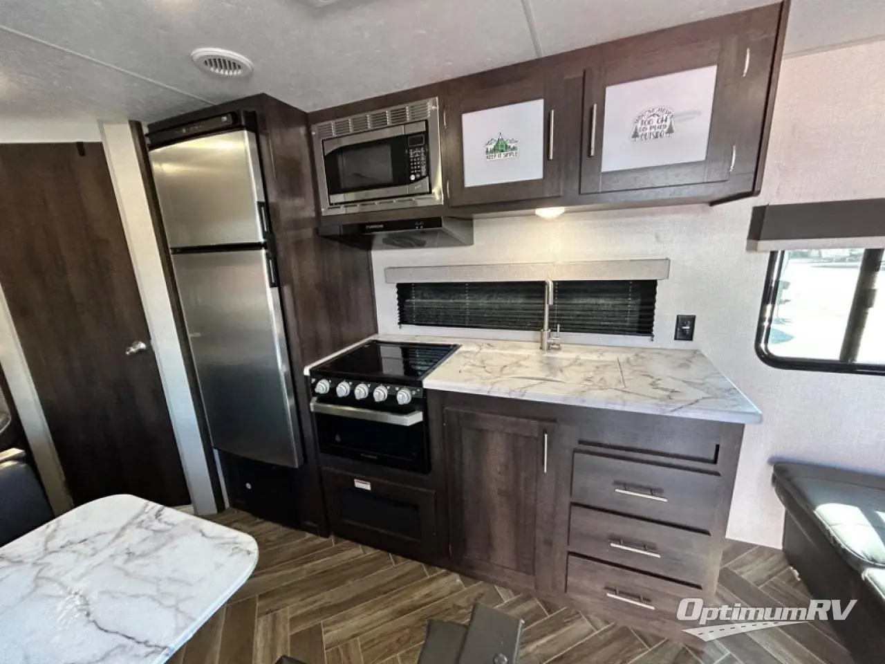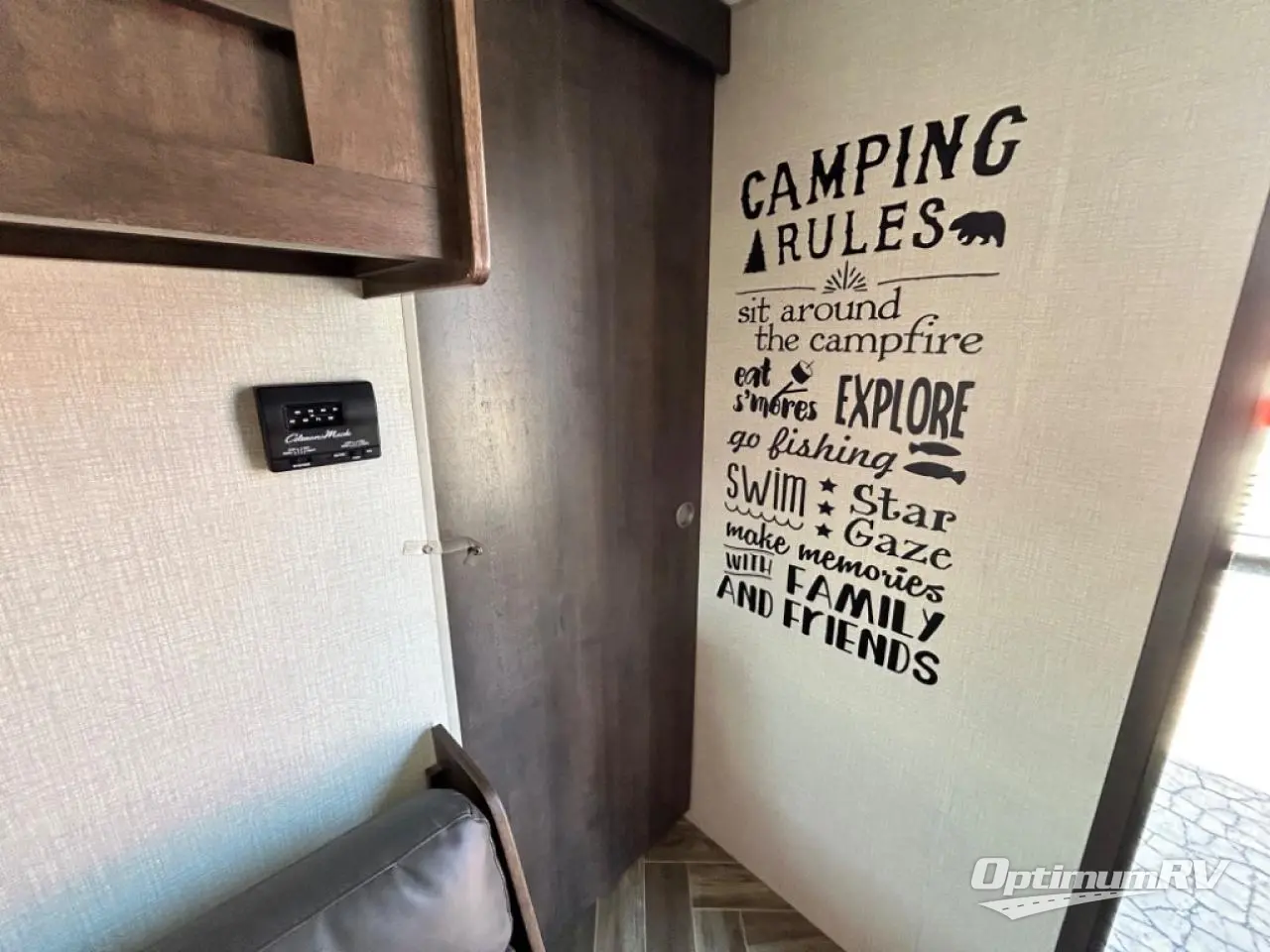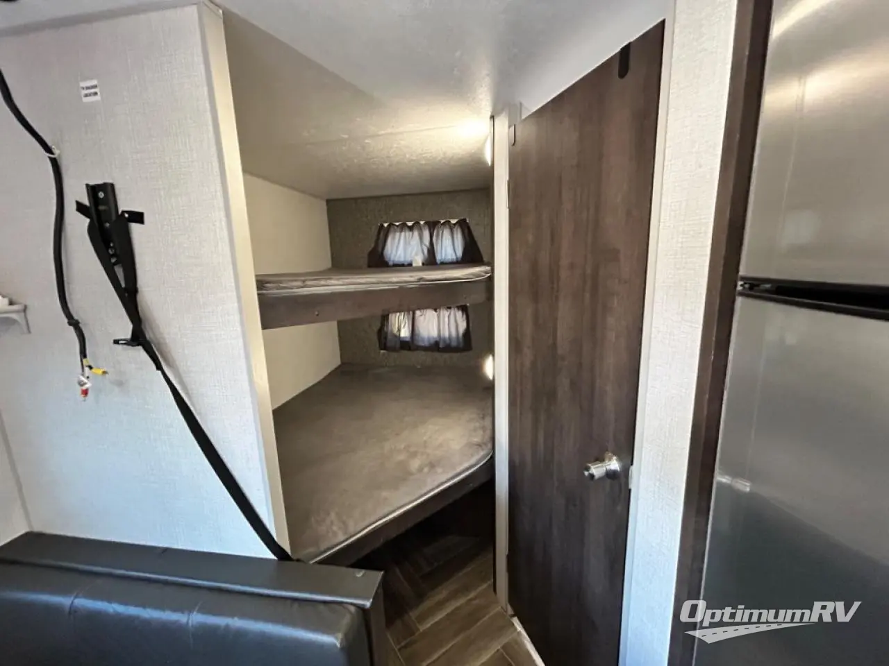 You will find lots of storage throughout the inside, and outside in the pass-through compartment for the larger camp gear and the storage door under the bunks in the rear. So load up and head out for a weekend of outdoor adventure. Once you have arrived you can quickly set up the 14' power awning and hit the trails, the lake, or relax. Inside someone can make lunch or dinner using the drop-in cooktop with glass cover and oven or the microwave, and store leftovers in the 10 cu. ft. refrigerator. When it's time to go to sleep, the kids will love their double-size bunks, you will love your queen bed and your friends can sleep on the furniture.