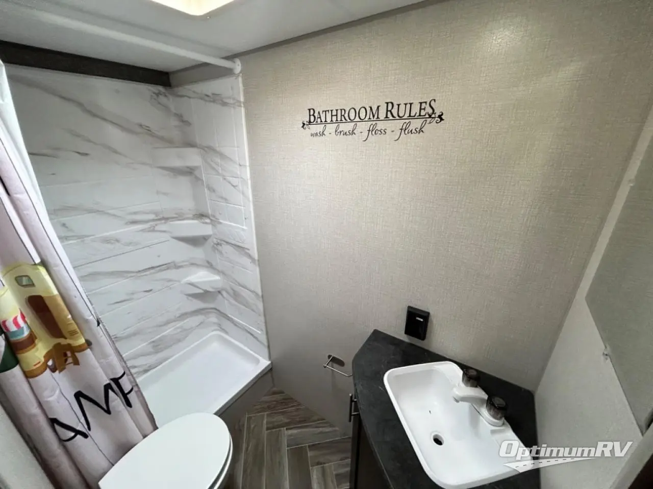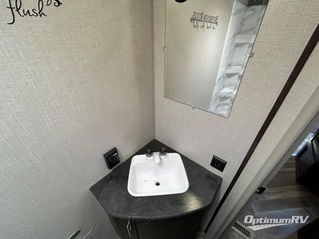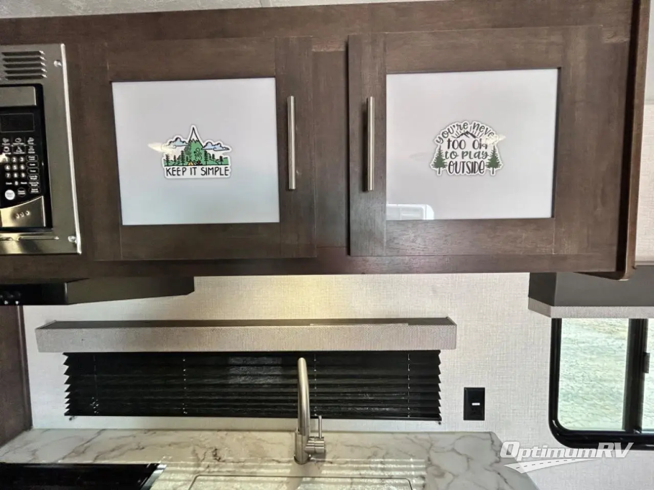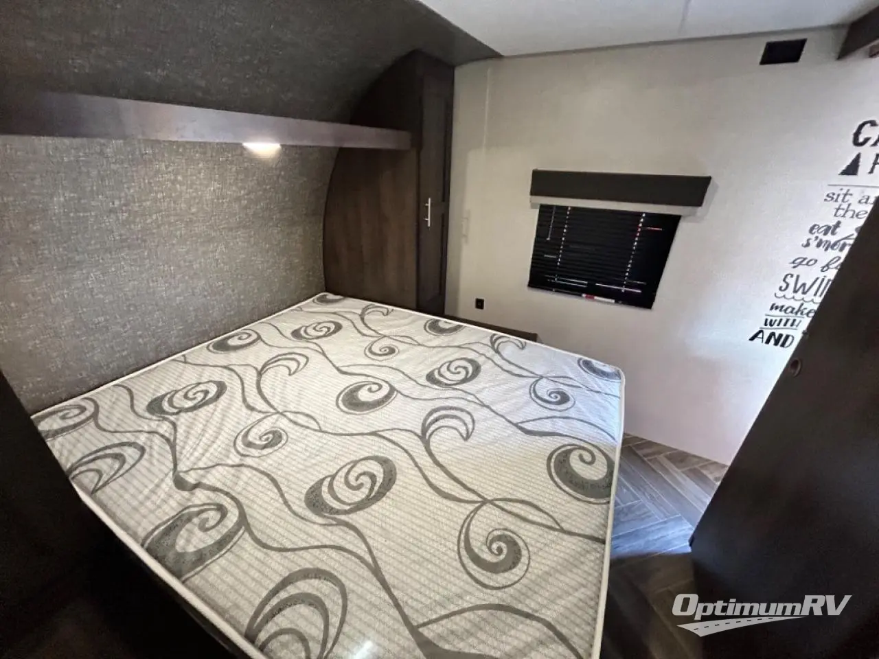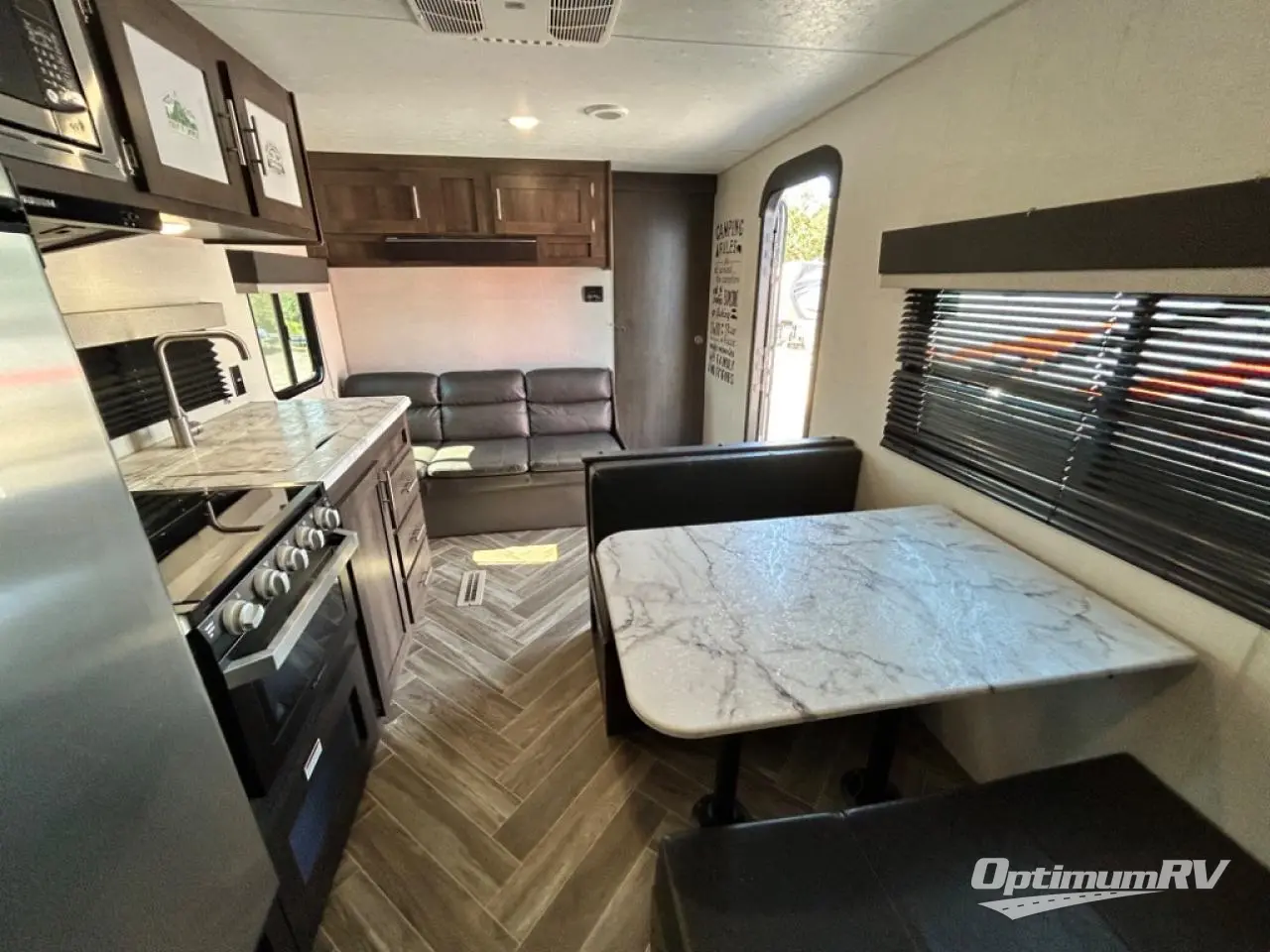 You will find lots of storage throughout the inside, and outside in the pass-through compartment for the larger camp gear and the storage door under the bunks in the rear. So load up and head out for a weekend of outdoor adventure. Once you have arrived you can quickly set up the 14' power awning and hit the trails, the lake, or relax. Inside someone can make lunch or dinner using the drop-in cooktop with glass cover and oven or the microwave, and store leftovers in the 10 cu. ft. refrigerator. When it's time to go to sleep, the kids will love their double-size bunks, you will love your queen bed and your friends can sleep on the furniture.