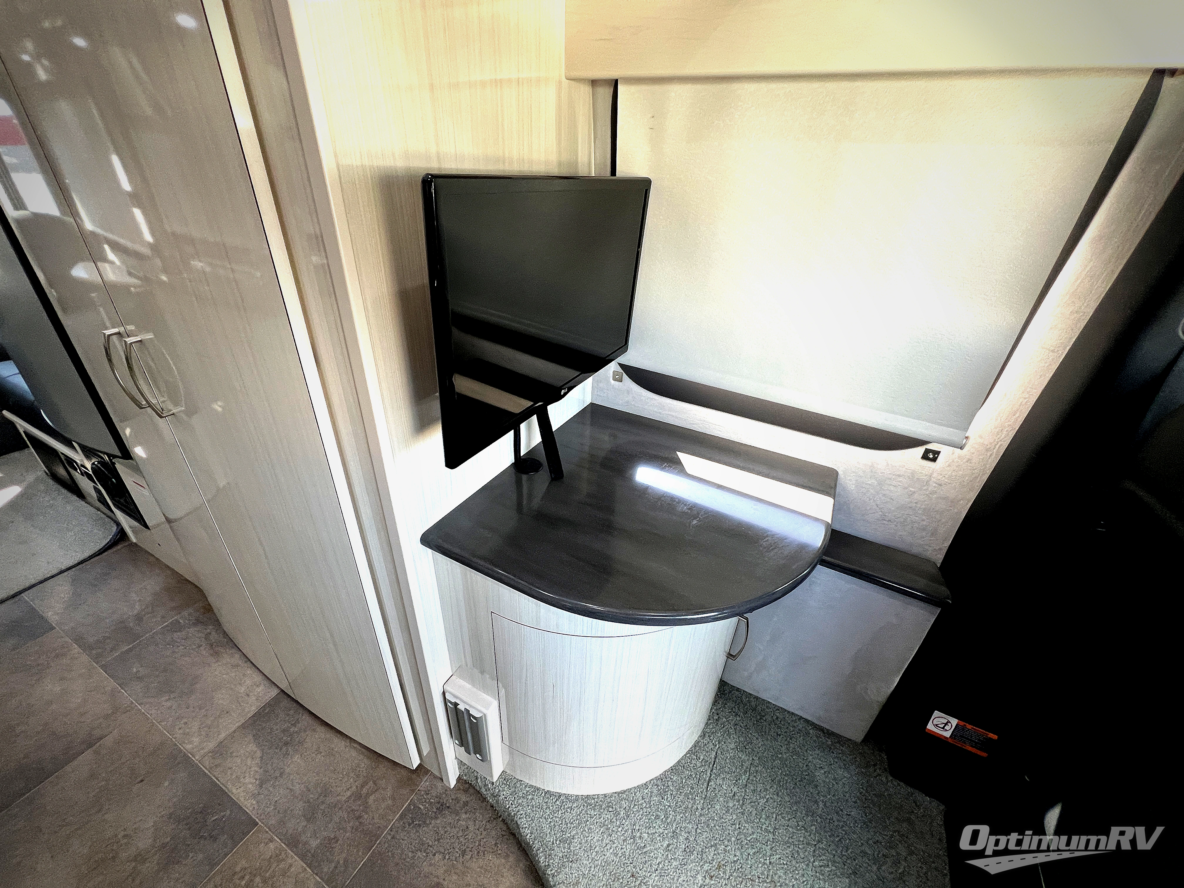 This motorhome features two dining locations for you to enjoy your delicious meals at thanks to the innovative Lagun table. There is also an array of storage options between the two-pantry style cabinets and the soft-close drawers. If you have to get a little bit of work done while on the road then you will love the front lounge workstation with the 120V power outlet, the USB charging ports, and the extended Corian countertop with a privacy shade and storage cabinets too. The convection microwave makes it easy for you to pop a bag of popcorn in and enjoy eating it while you relax on the power sofa with memory foam sofa cushions!