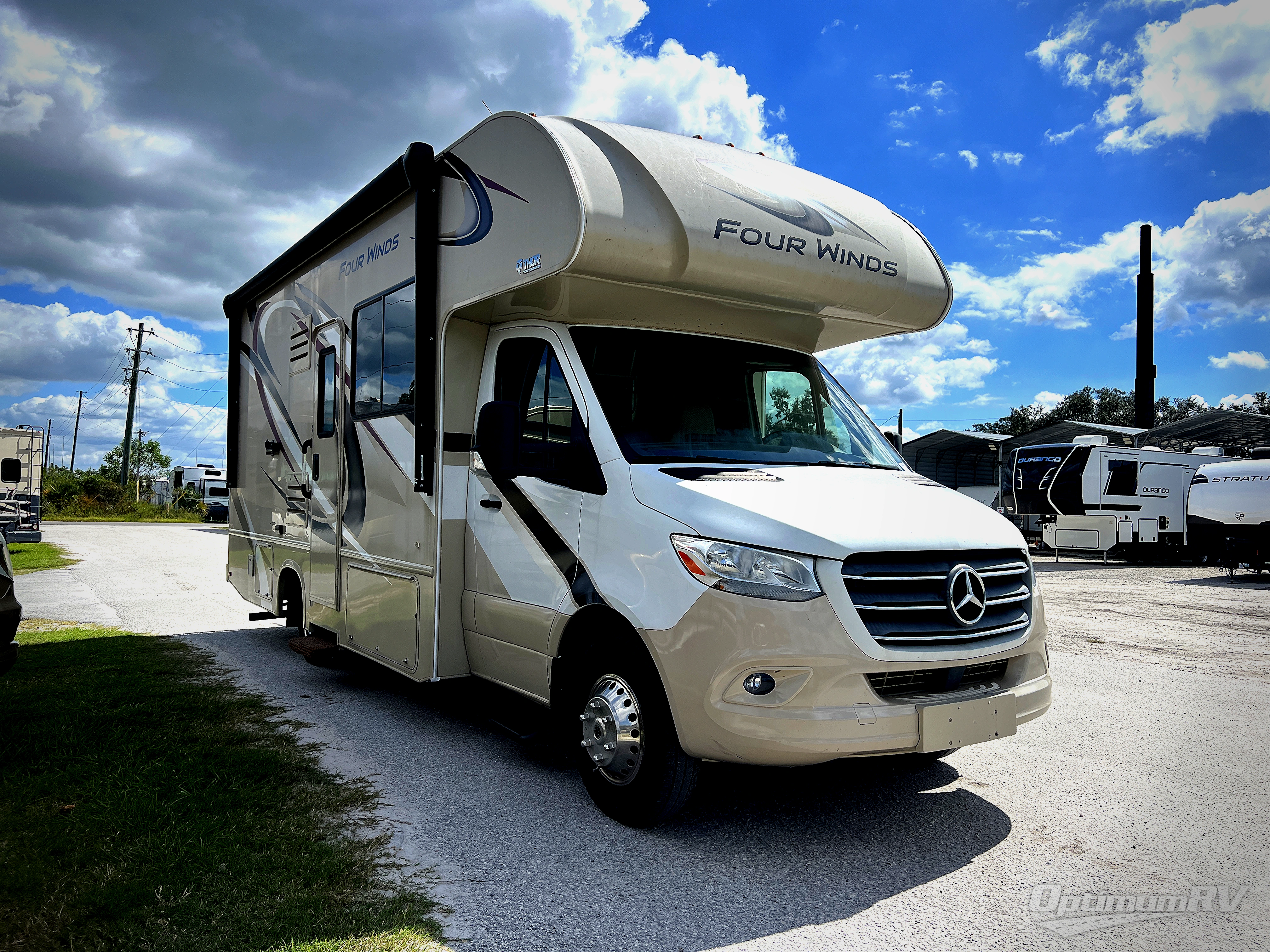The Four Winds Sprinter from Thor Motor Coach provides the freedom that you deserve while setting yourself apart from everyone else! Bringing along all of your necessary camping items is easier than ever since there are plenty of exterior storage compartments. In the evening you will enjoy visiting with your family while sitting underneath the electric awning with integrated LED lights. Inside you will enjoy conveniences such as the residential vinyl flooring, laminate countertops, high-sheen cabinets with raised panel cabinet doors, and the Onan RV QG 3600 LP generator. The shower skylight adds plenty of natural lighting, and in the bedroom there is a USB power charging center for your electronics!