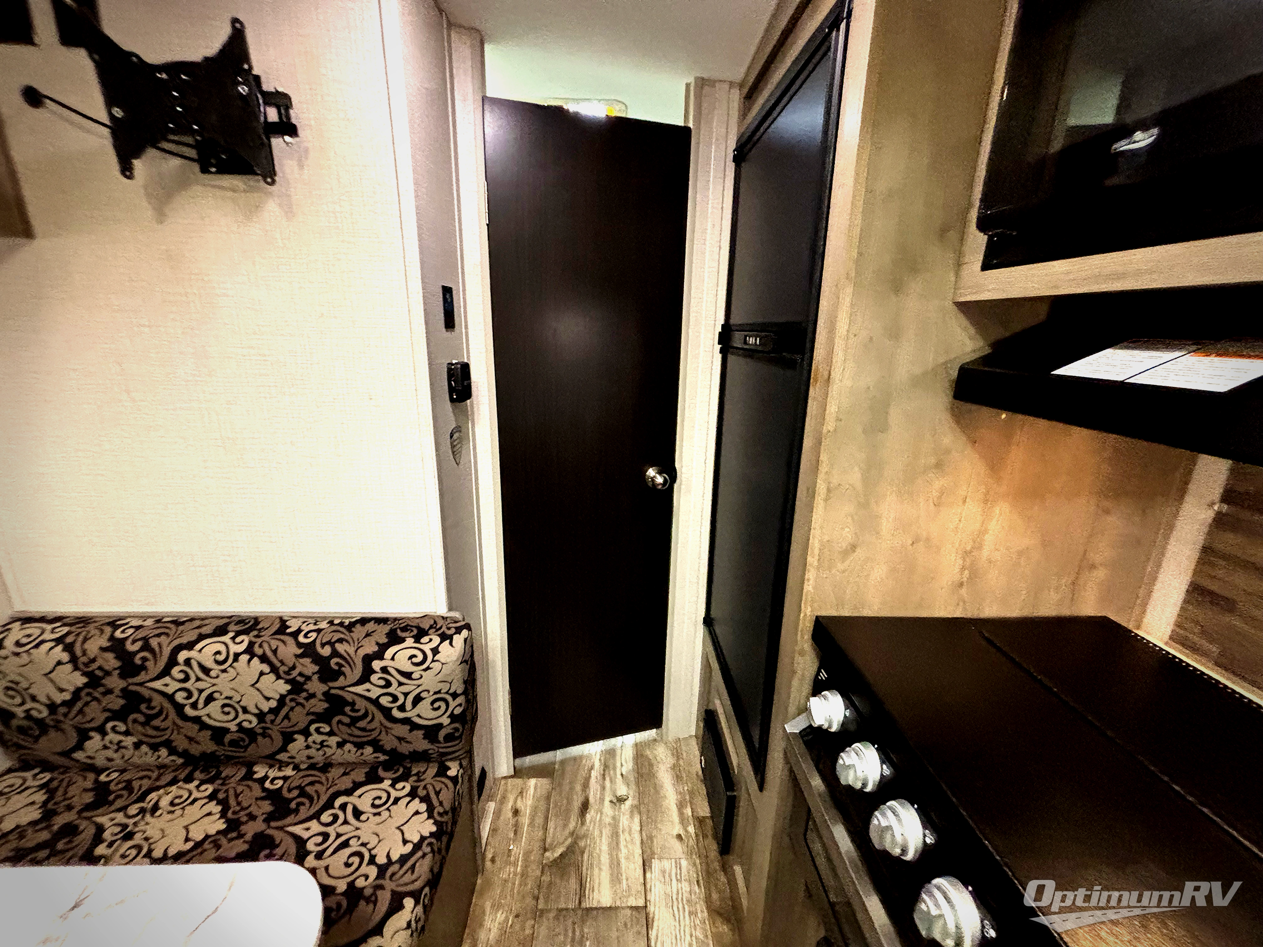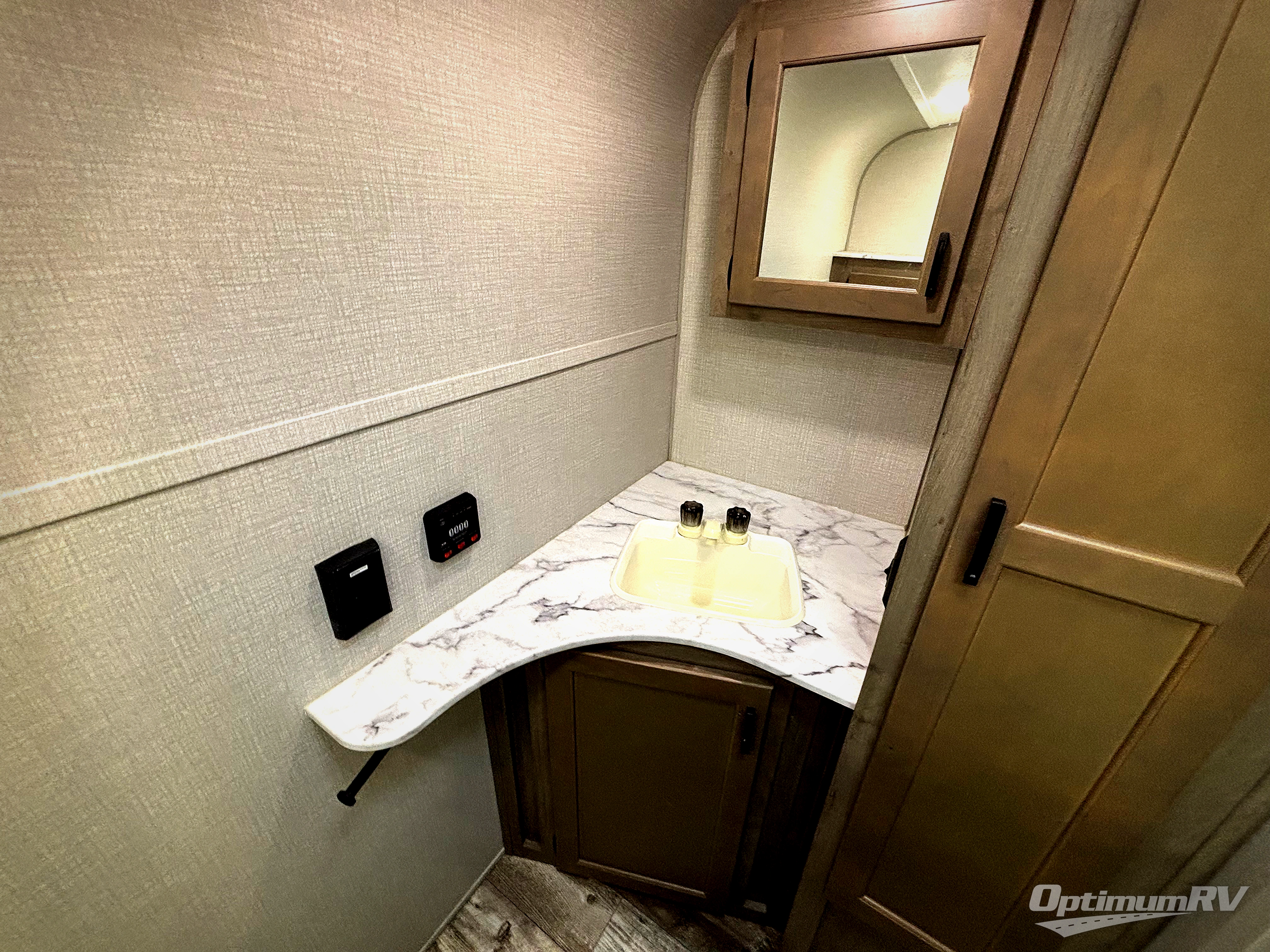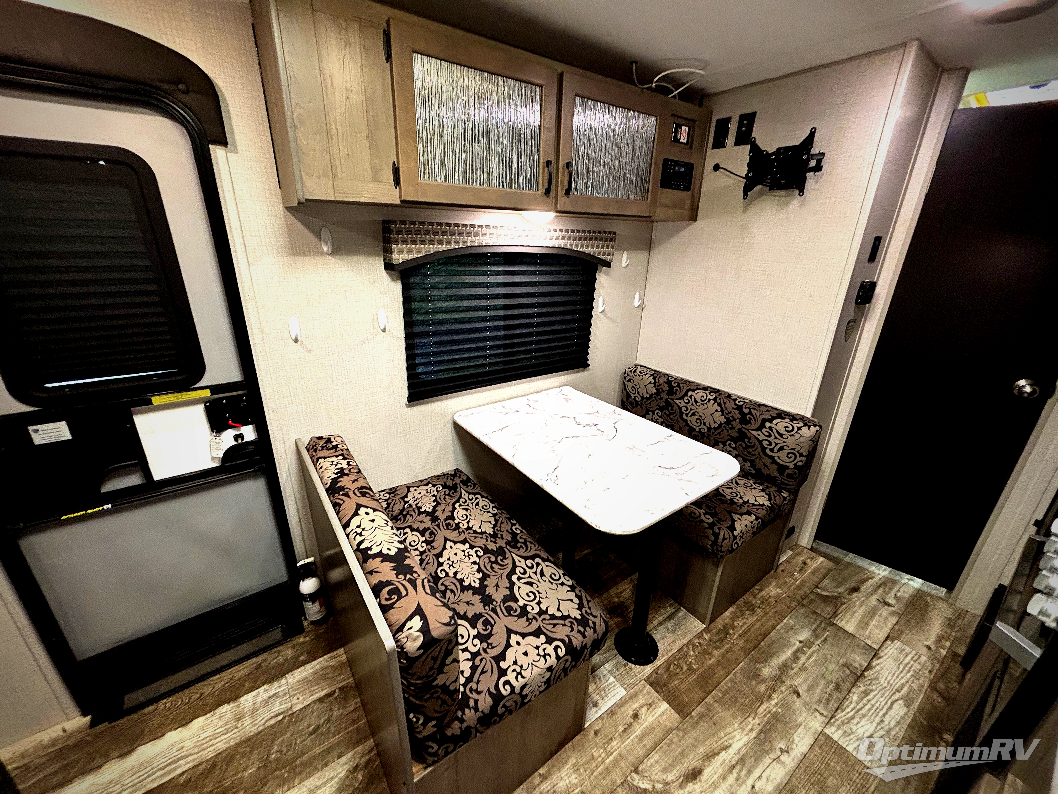 Just imagine you and your spouse exploring campgrounds with this lightweight travel trailer in tow. After a long day of traveling you can get a good night's rest on the RV queen bed or choose the Murphy bed option instead. You can then turn on the Furrion Bluetooth stereo and prepare a meal in the kitchen using the two burner cooktop. You then have the choice to eat at the dinette or outside under the 13' awning. And the full rear bath allows you to skip the public facilities and get cleaned up after each activity.
