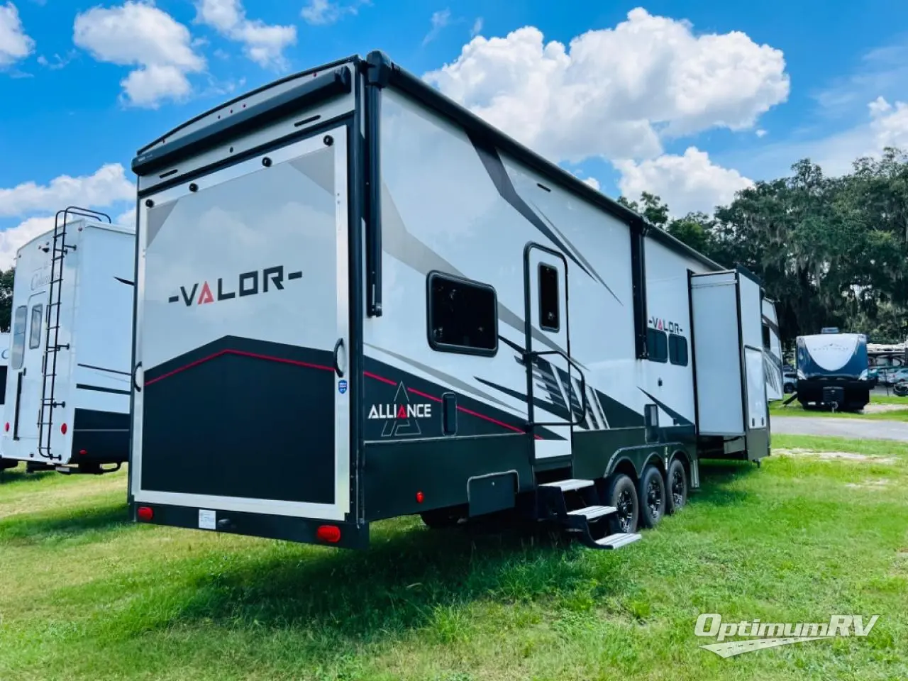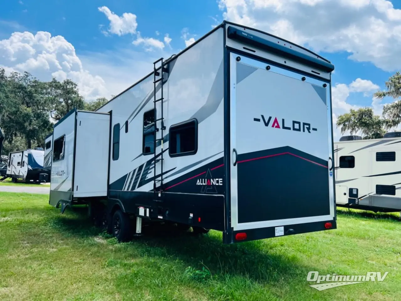 The Alliance RV Valor fifth wheel toy hauler is courageously bold and determined! The Valor has some of the best features, and you have to see them for yourself. The fully weather-resistant ramp door is an industry-first, and another industry-first is the standard solar package that has a monitor system enabling you to see the battery life in real time. The fully insulated garage has a dedicated A/C and electronic heat source so that your gear can remain fully protected, and the Epoxy-poured countertops are extremely lightweight. The Valor has the most efficient and effective A/C system that produces great cooling power with the least amount of ductwork, and the flush-floor slides are completely free of carpet for your benefit. Plus, as another industry-exclusive, the Valor has its very own air compressor on board so that you can have your own air supply for your toys or other gear.