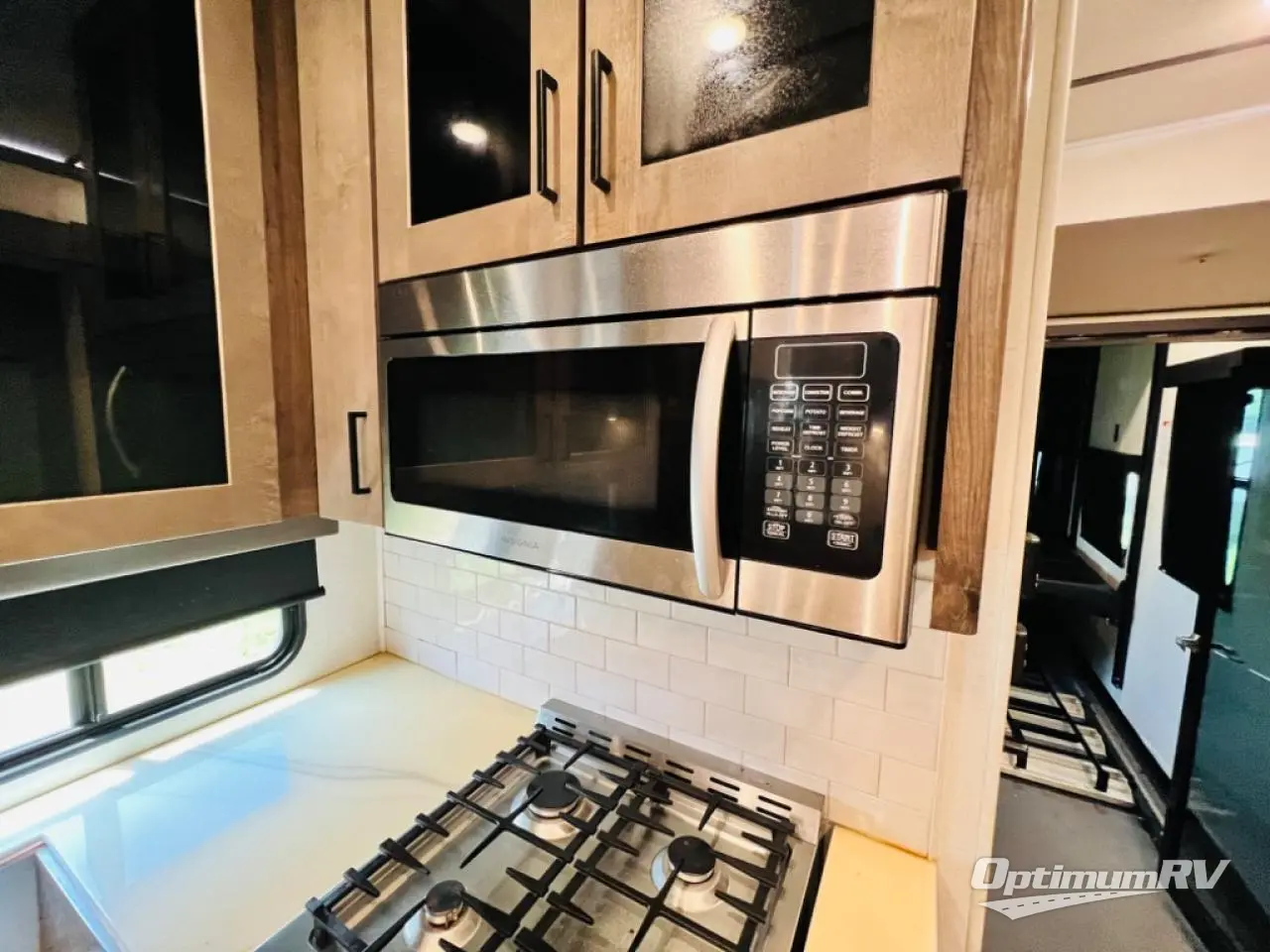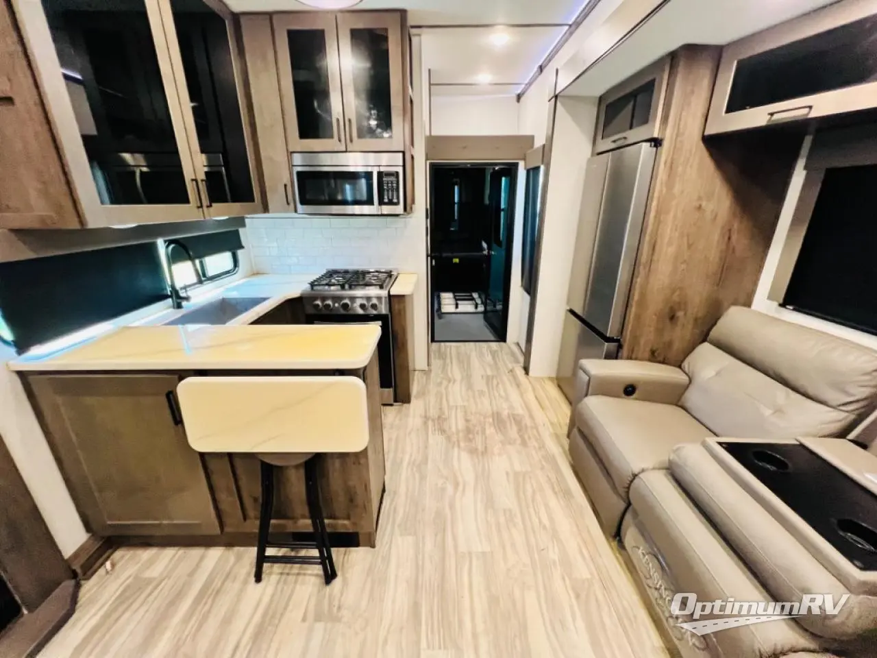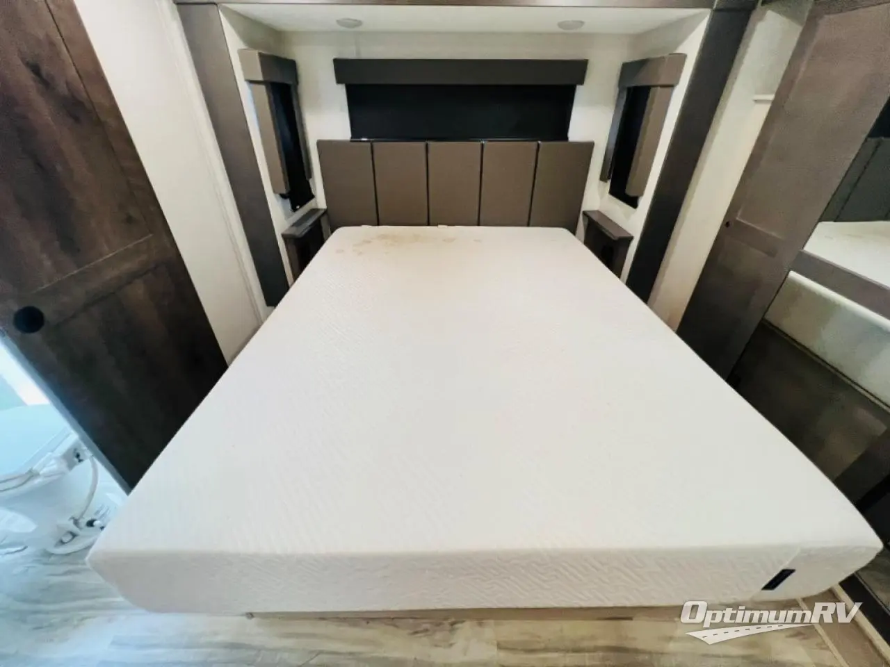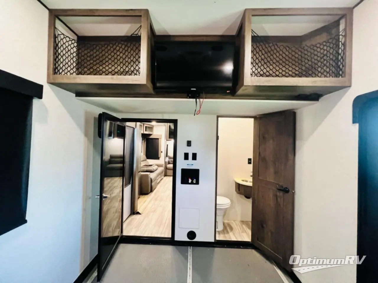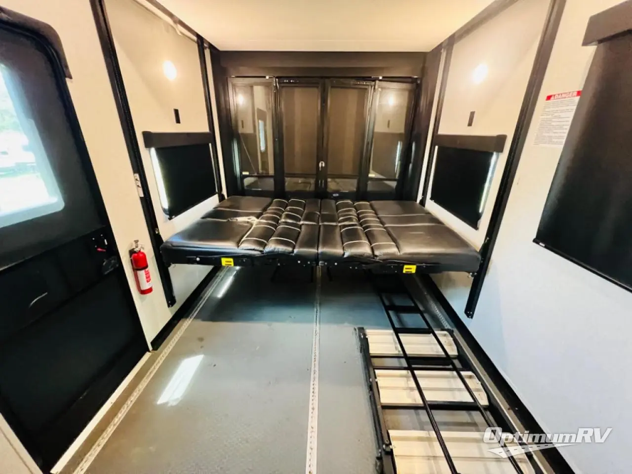 With this Valor fifth wheel toy hauler, there is practically nothing stopping you from having the best adventures! You will have endless nights of fun in the living area that has two sofas, a fireplace, and a Smart TV, and since the kitchen is also included in this space, you can get up to make a little snack while still being involved in the party. Get away for a little relaxation in the front master suite. The bedroom has a king-size bed slide for some extra space and comfort, and the full-width wardrobe will easily be able to store your clothing. The other area that is decked out to perfection is the 13' separate garage. The garage has two roll-over sofas, a queen-size bunk, a half bathroom, and the second exterior entry door, and just outside of that entry door is where you will find an air compressor on the exterior.