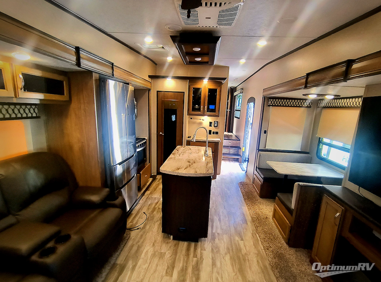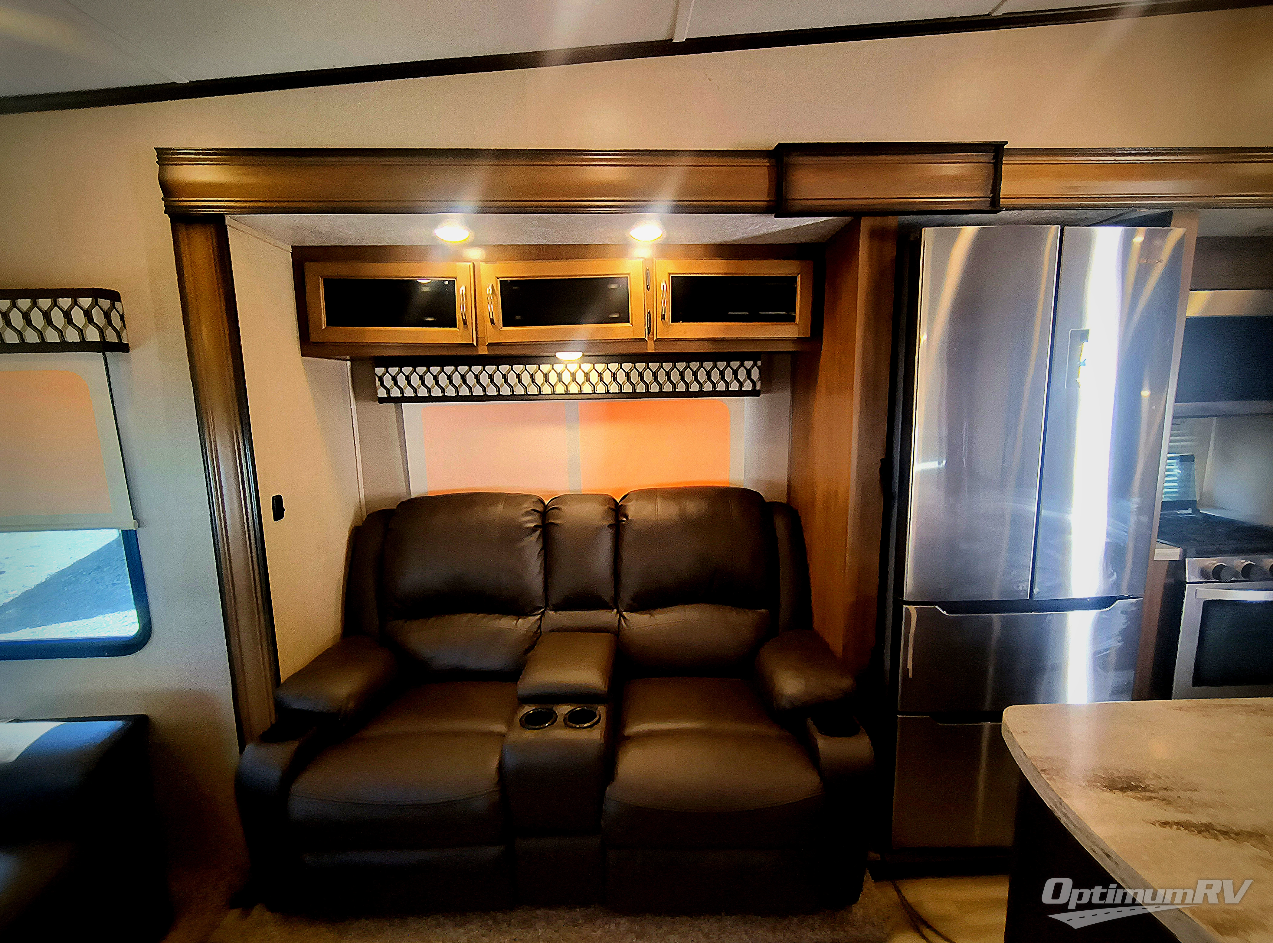 Whether you have to work while camping or your kiddos need their own space, this fifth wheel offers a middle room with a tri-fold sofa, a removable table, a wardrobe and even a loft above to be utilized as needed.  You will have your own private master bedroom in the front with a queen bed slide or choose the king option, plus a full-wall wardrobe that has been prepped for a washer/dryer option.  Everyone will stay clean with a full bathroom including a seated shower, and fed with a full kitchen including an island to prepare and serve meals, a large pantry, and a residential microwave. An dining can be done in several locations such as using the free standing table with four chairs or maybe the tri-fold sofa and theatre seats or maybe even outside under the electric awning.