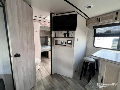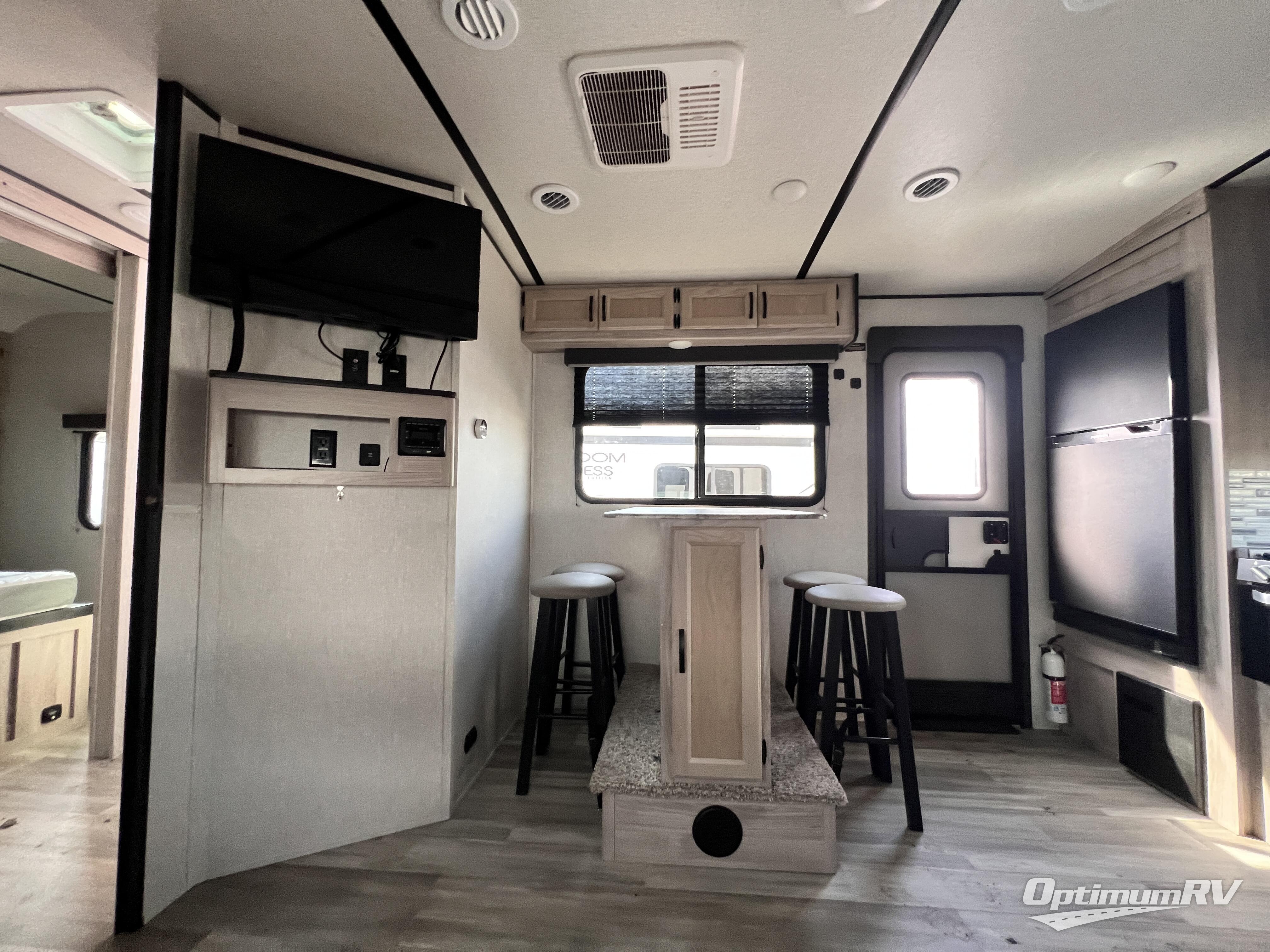 The kids will love playing games and eating at the unique bar with four stools when they aren't outside running around the campgrounds. And you will appreciate the storage in the bar. The cook can whip up meals in the rear kitchen and there is extra countertop space by the pantry and sofa. The entertainment center will keep you busy while you wait for everyone to use the walk-through bath which includes a shower skylight for natural lighting and extra standing space you are sure to appreciate. This model also features plenty of storage in the exterior pass-through compartment, plus in the interior within the wardrobes and overhead cabinets.