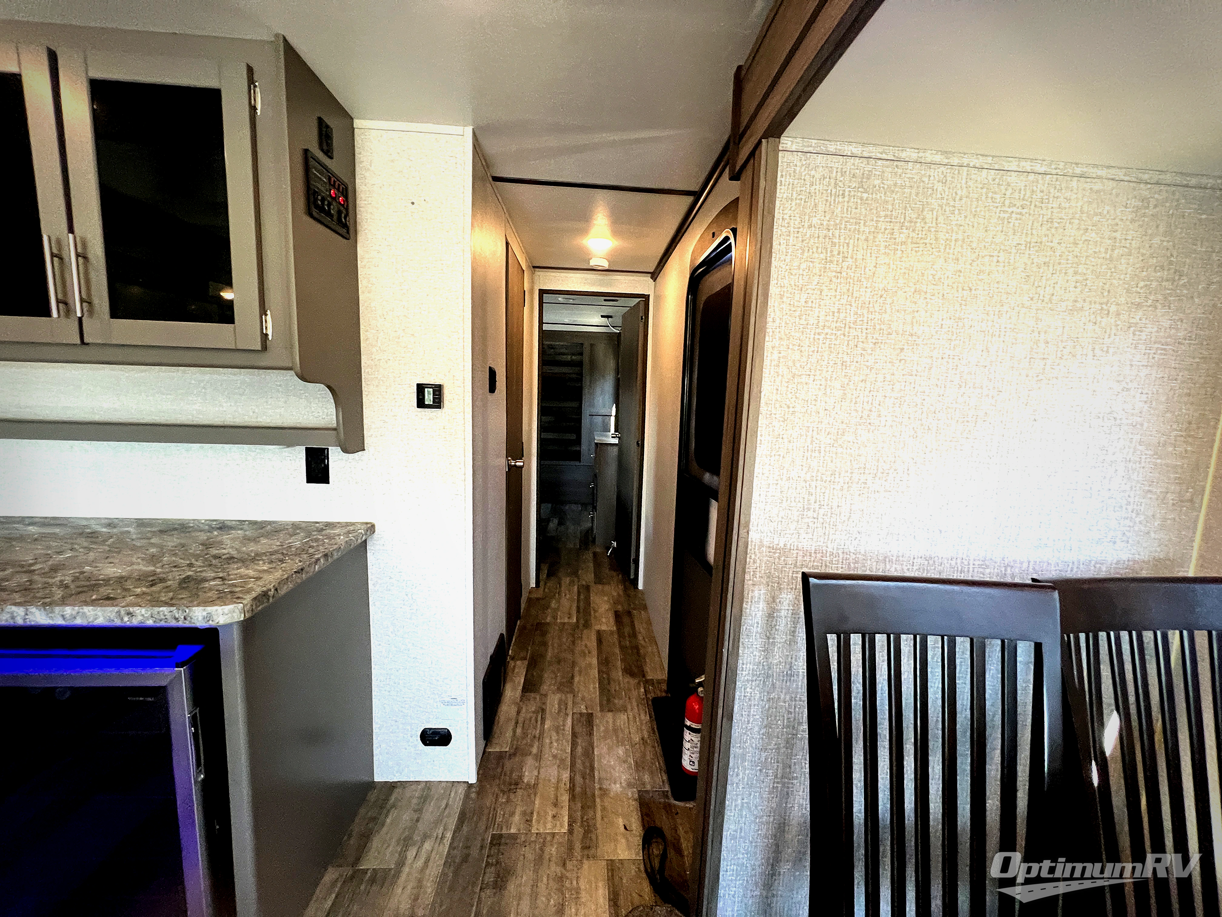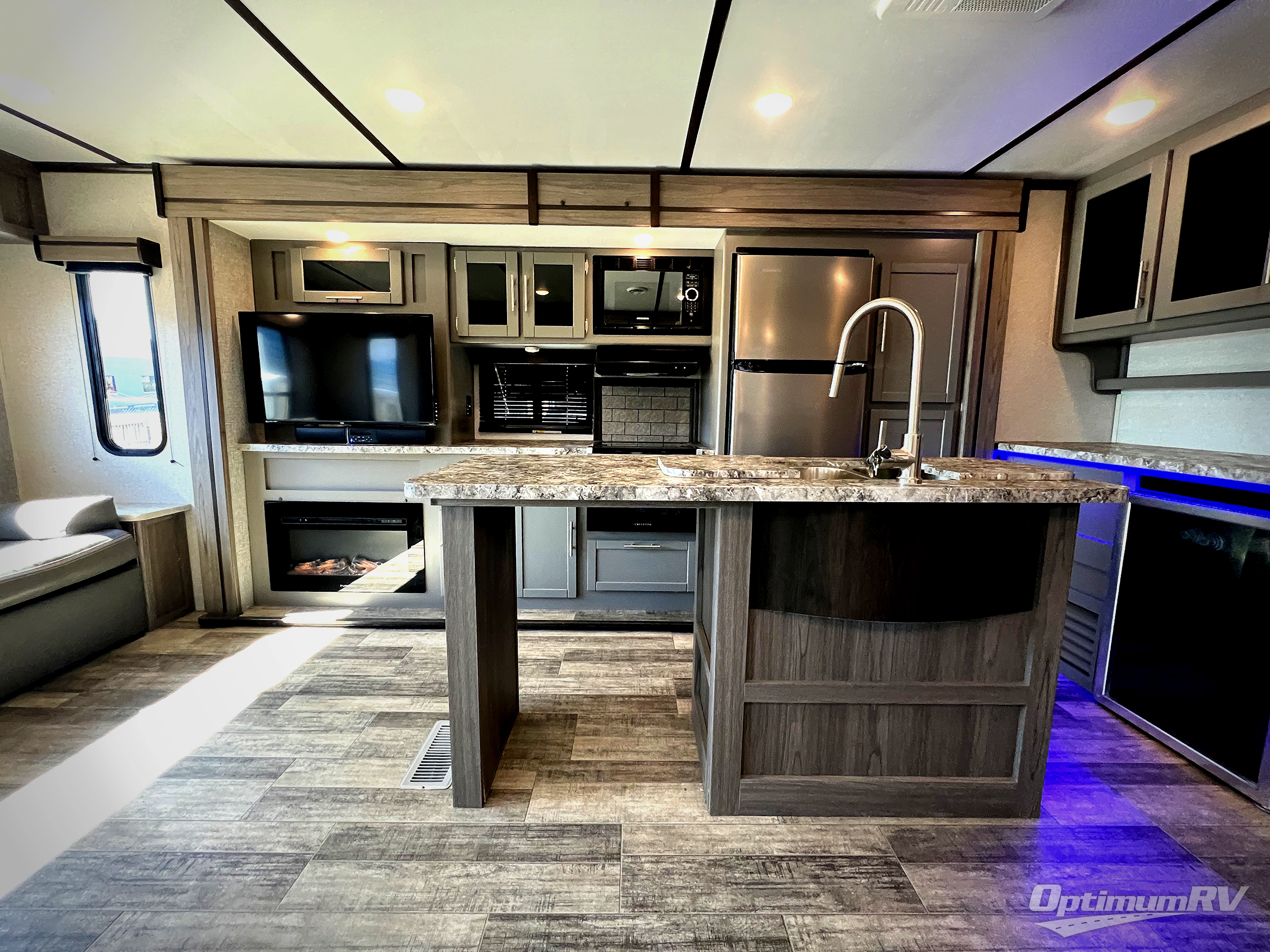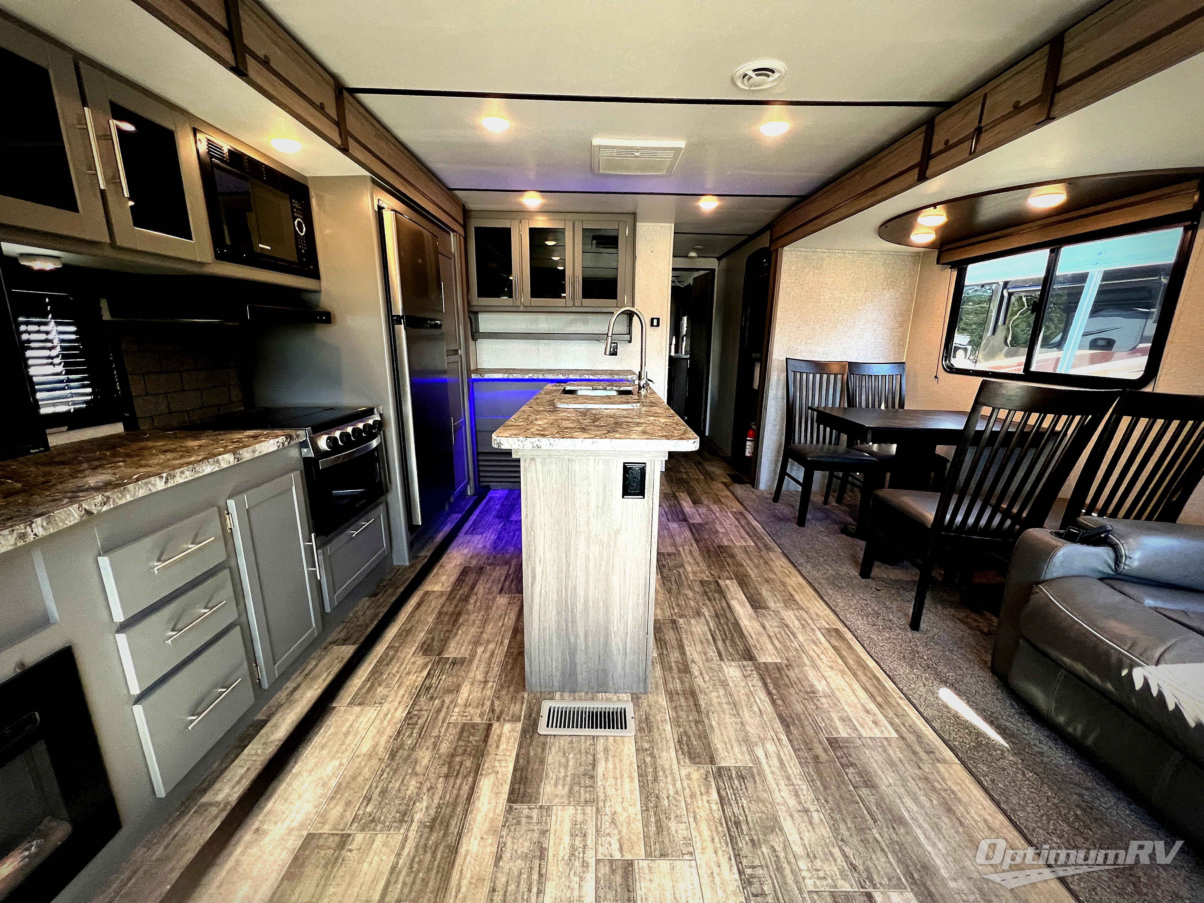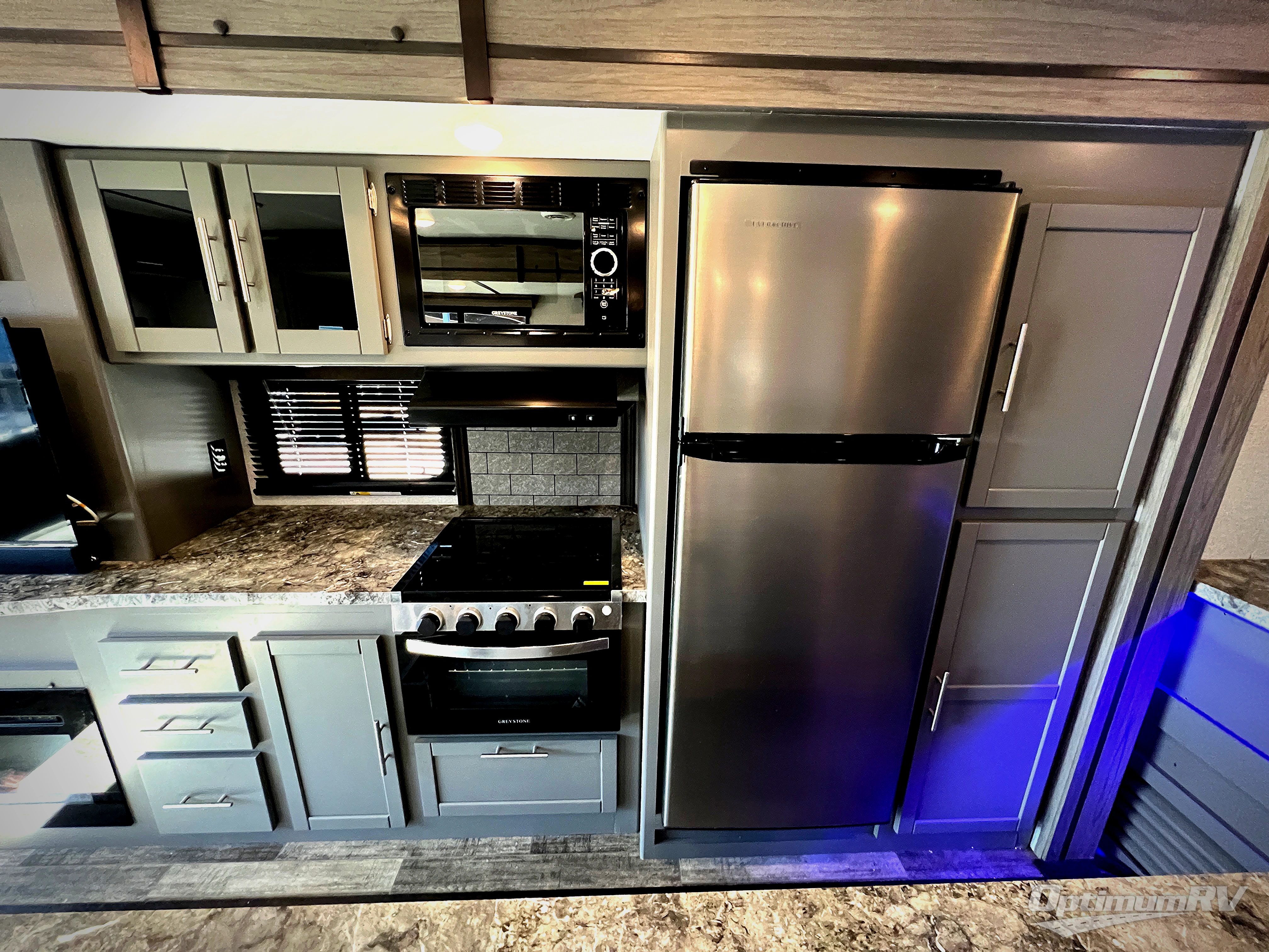 Whether you're relaxing on the theater seats, preparing a meal at the kitchen island, or taking a rest on the slide out king bed, you will enjoy every minute spent in this travel trailer. Your guests will love to sit at the stools around the kitchen island, or they can play a game around the U-shaped dinette. This model includes a hutch with a wine cooler to serve your guests, and the pantry can store snacks for everyone. When it's time to call it a night, the front private bedroom will feel just like home with its king bed and a large front wardrobe. There is even a space that has been prepped to add an optional washer and dryer if you choose!
