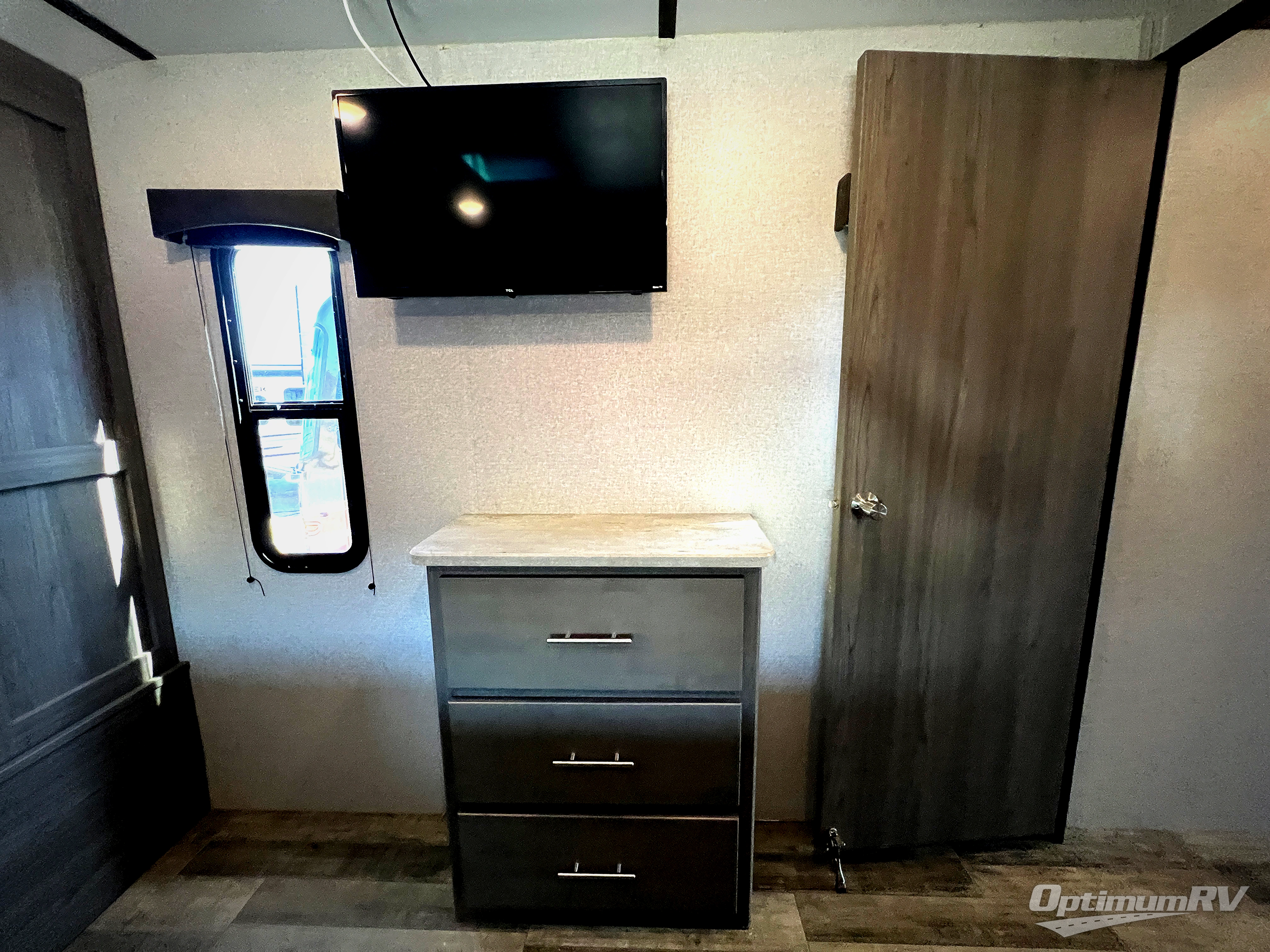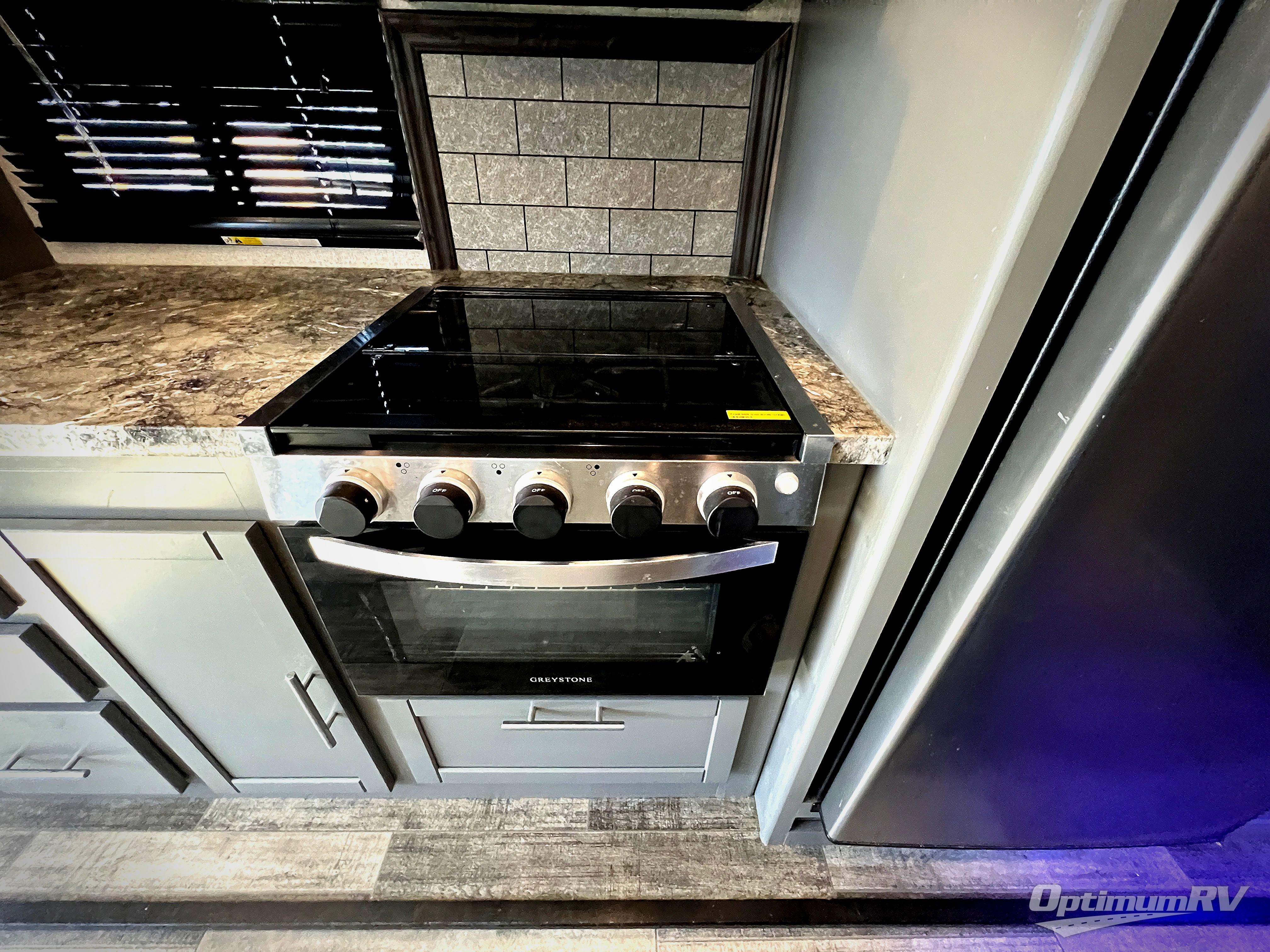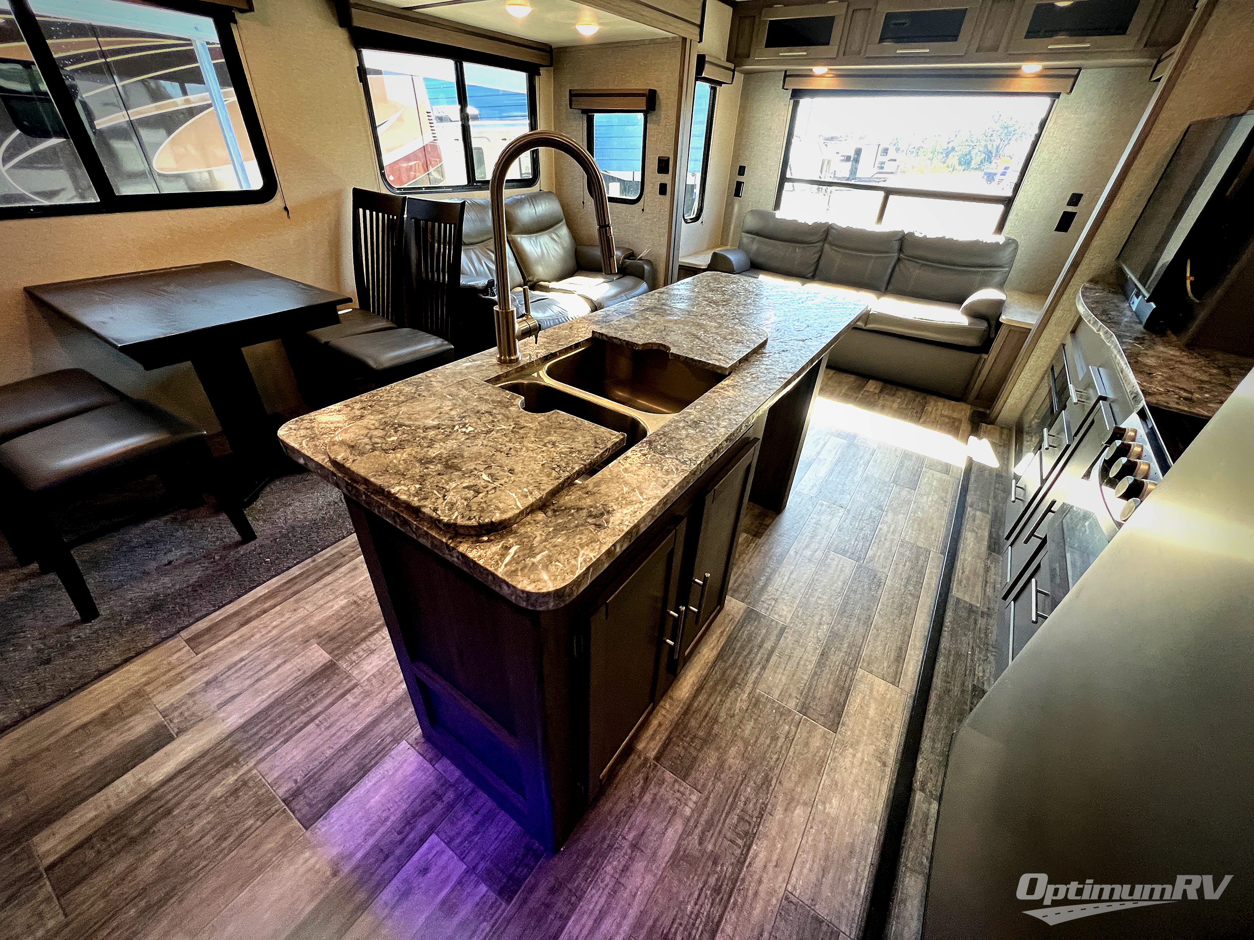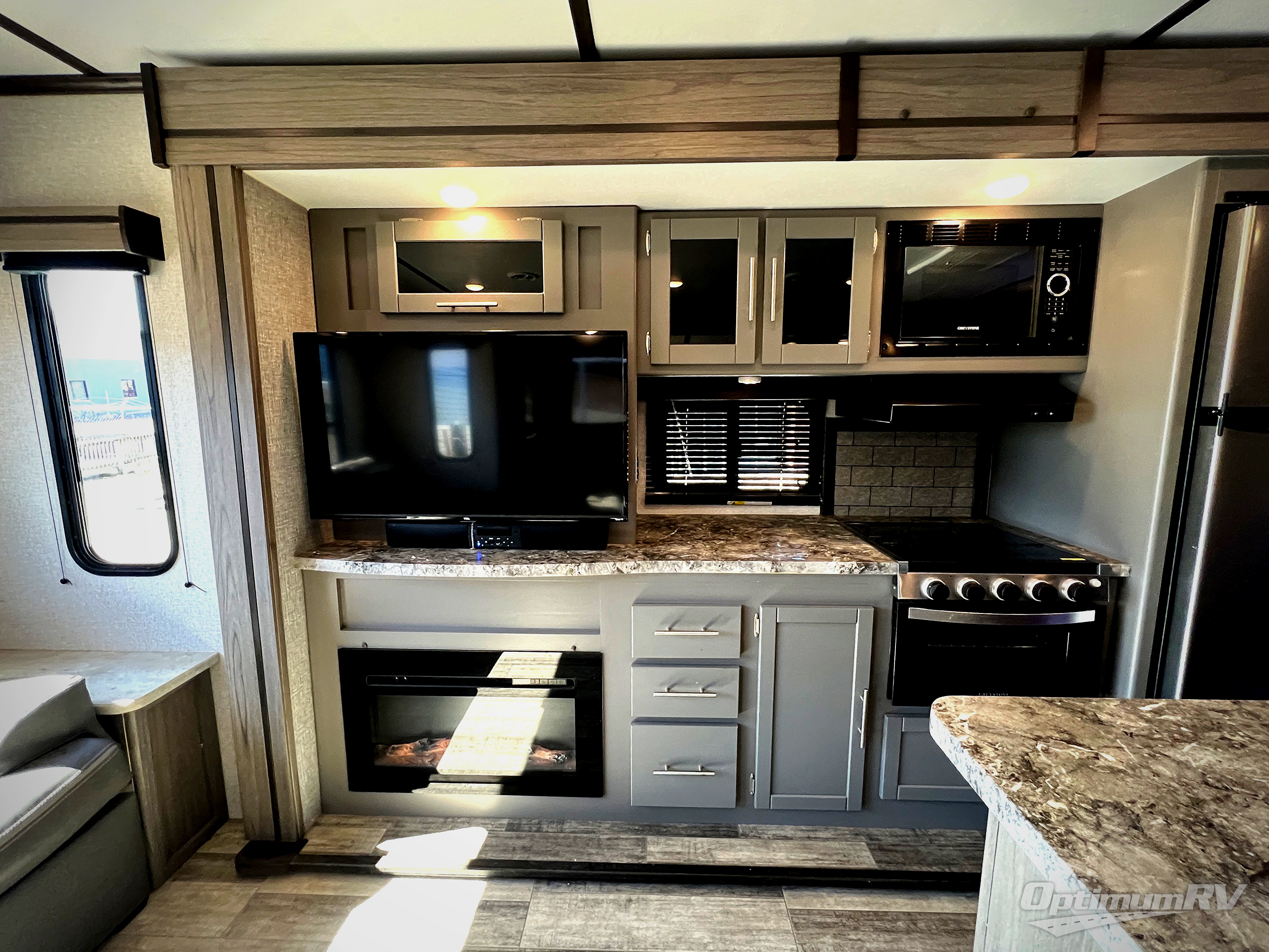 Whether you're relaxing on the theater seats, preparing a meal at the kitchen island, or taking a rest on the slide out king bed, you will enjoy every minute spent in this travel trailer. Your guests will love to sit at the stools around the kitchen island, or they can play a game around the U-shaped dinette. This model includes a hutch with a wine cooler to serve your guests, and the pantry can store snacks for everyone. When it's time to call it a night, the front private bedroom will feel just like home with its king bed and a large front wardrobe. There is even a space that has been prepped to add an optional washer and dryer if you choose!