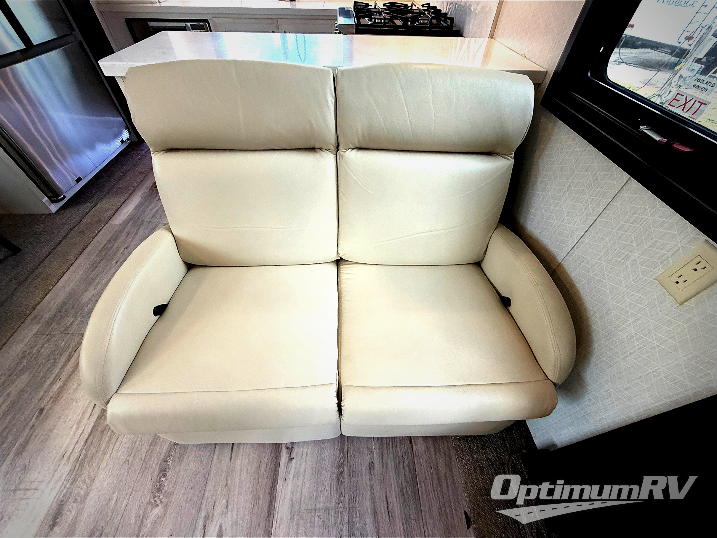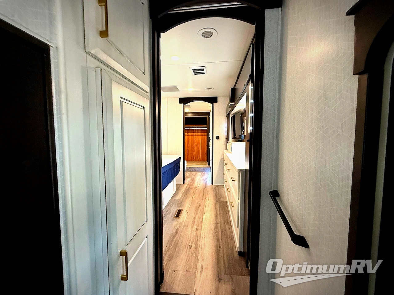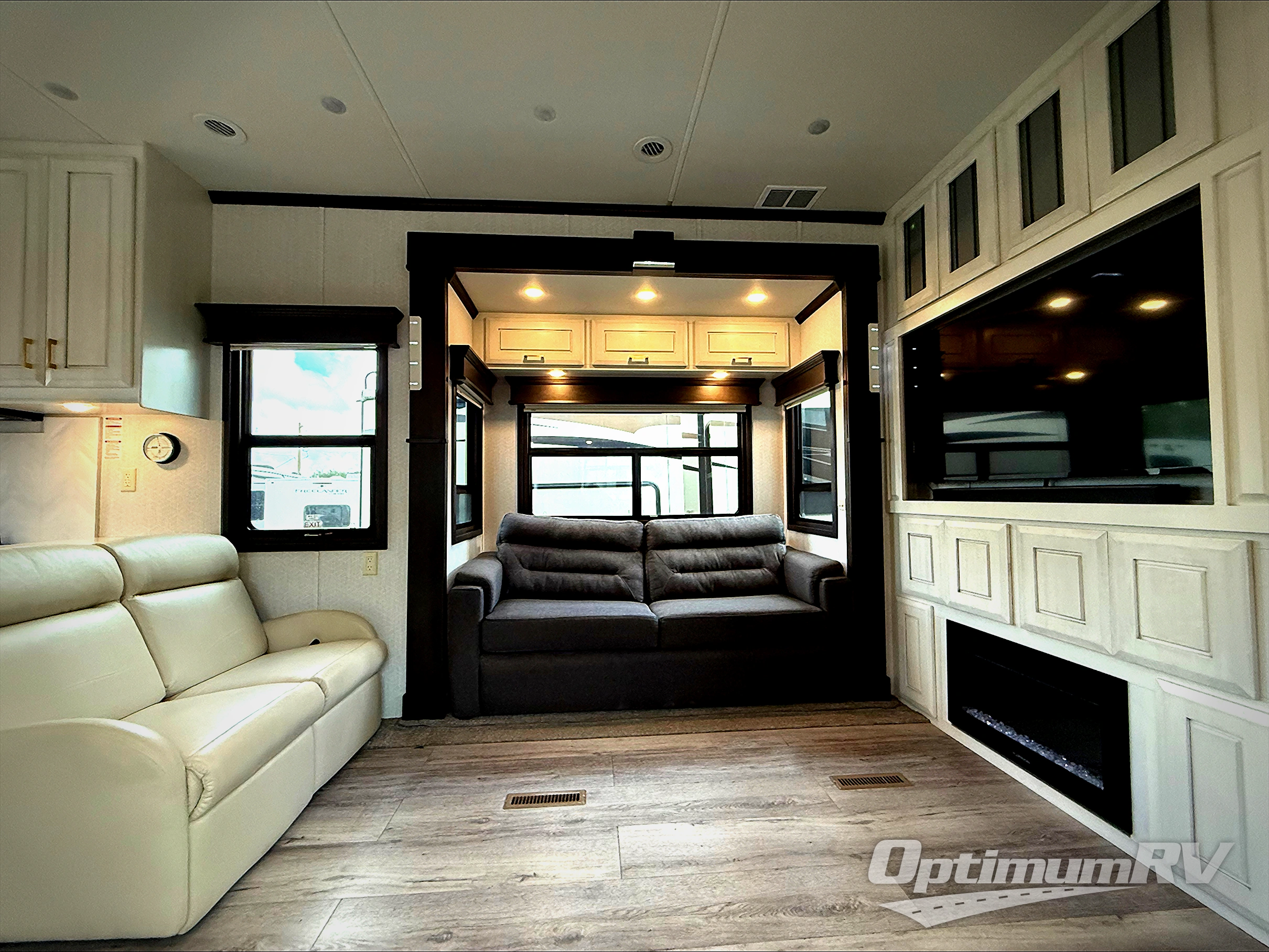 Imagine your own rear gourmet kitchen with high polished solid surface countertops, a stainless steel residential dishwasher, a convection/microwave, and a residential stainless steel French door refrigerator to enjoy making meals for your spouse and your family when they visit. The lighted pantry and kitchen/bathroom toe kicks are an added luxury you will surely appreciate especially at night. The separate living area offers dual residential recliners to relax and unwind, a fireplace, and two sofas. There is a handy half bathroom for your guests only steps away, and you can enjoy your own full front bath after walking through your master bedroom with a king bed. The spacious bathroom offers a dual sink vanity, a walk-in closet, and a space to add a washer/dryer option.