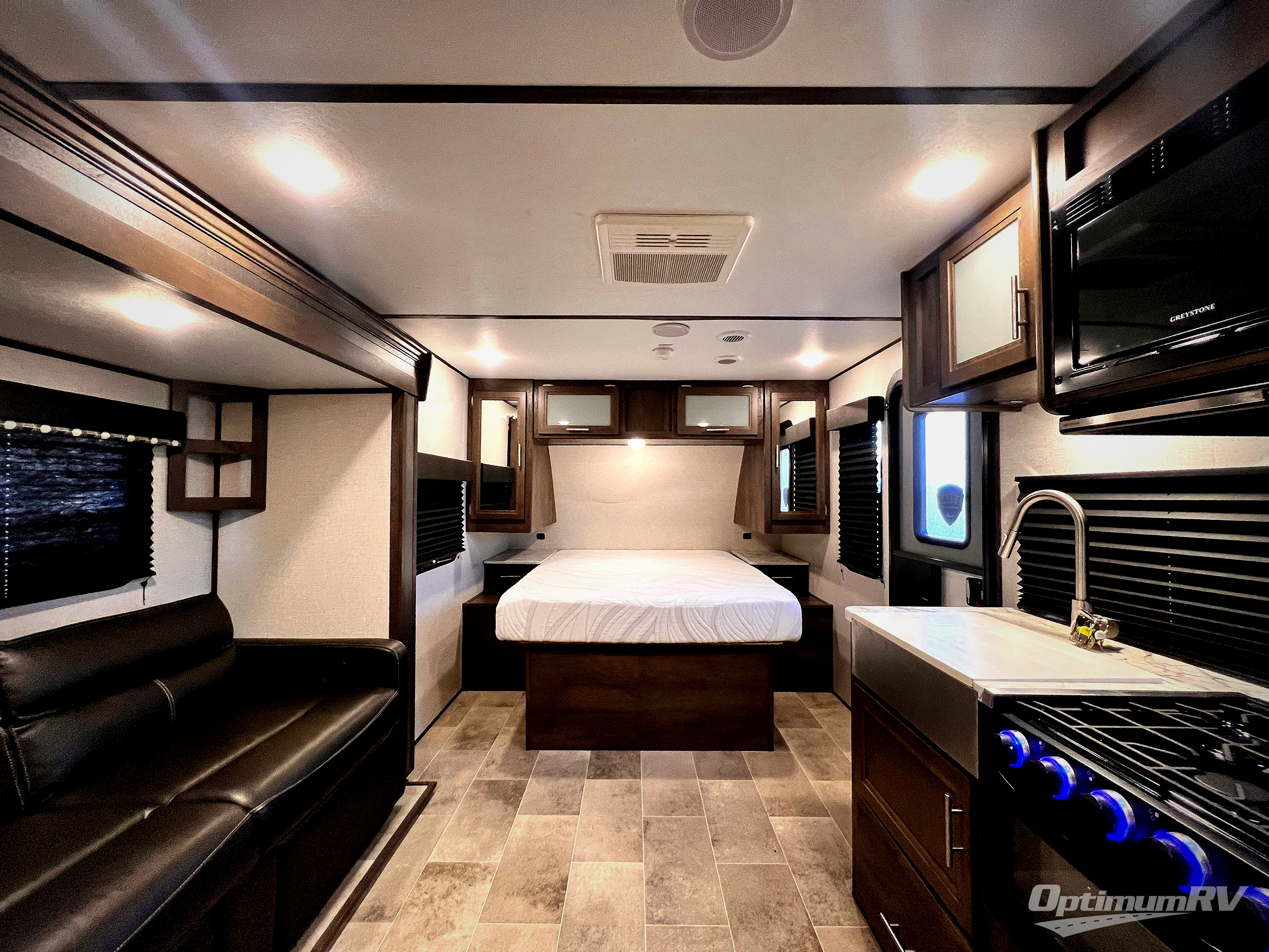 Take one look inside this Coleman Light travel trailer and you will throw away your tent! The handy indoor/outdoor table can be placed in several locations, including in front of the fold-down sofa on the single slide out. The queen bed at the front of this trailer is perfect for a good night's rest, and with nightstands on both sides of the bed, you'll have a place for your things. The rear bathroom is conveniently out of the way, and the kitchen is a great place to spend time cooking dinner or heating up leftovers in the microwave.