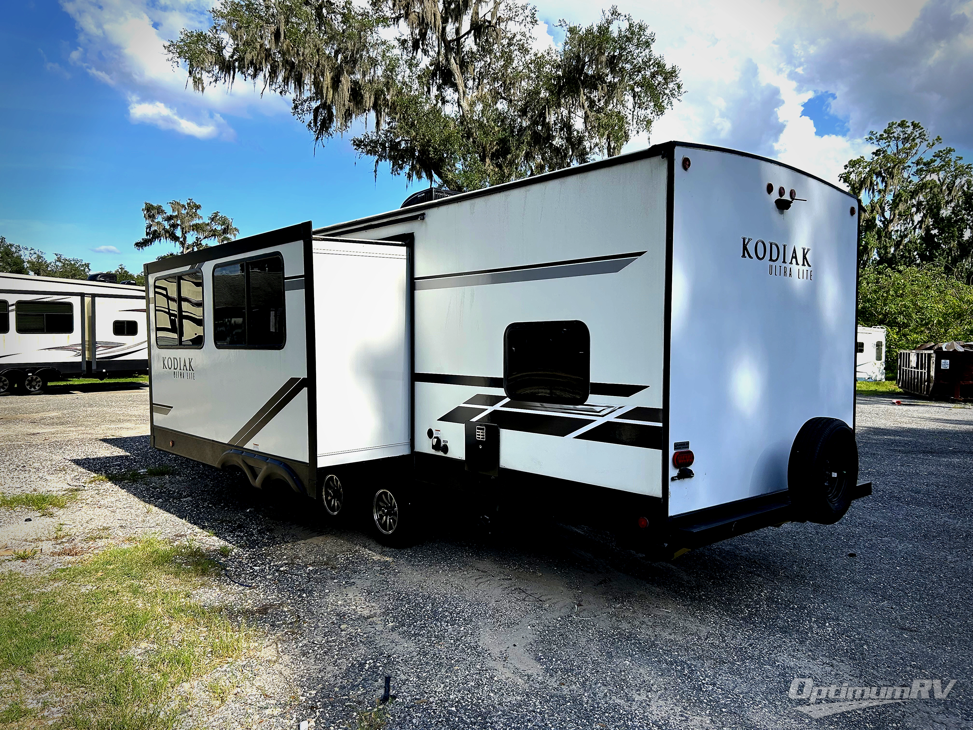 With its all-inclusive amenities and large sleeping capacity, this Kodiak Ultra-Lite travel trailer redefines lightweight luxury. Because this unit comes with a rear private bunkhouse with triple bunks, it can be used as a guest room for friends or as a play room for your kids when the rain won't seem to stop. The living area is a wonderful place for everyone to gather together because of the extra floor space that the large slide adds to this trailer. You will love having the ability to prepare your meals at the outdoor kitchen when the weather is nice, and when it is time to clean up, you can store leftovers securely in the 10-cubic foot refrigerator in the full interior kitchen. Take a look; you will be happy you did!