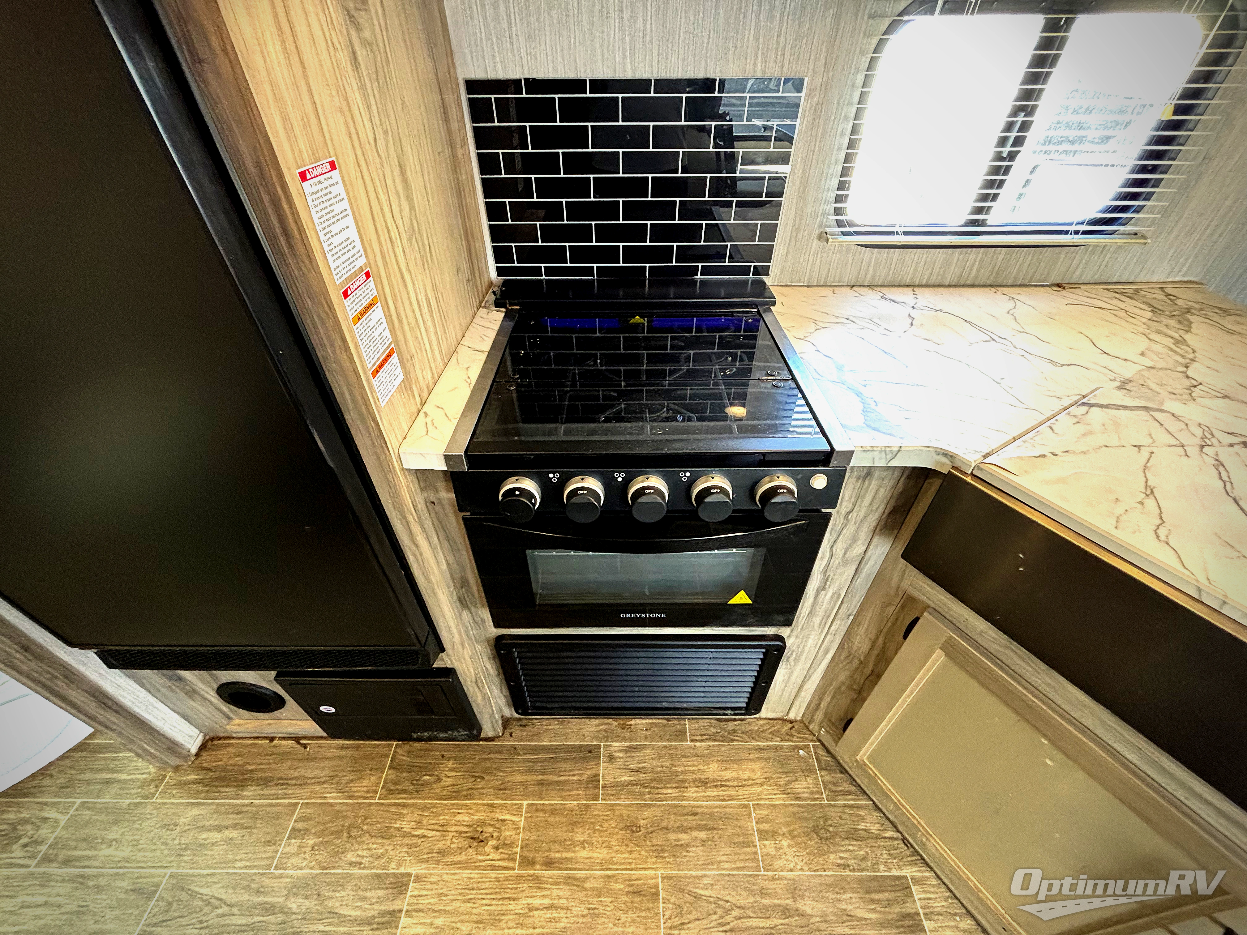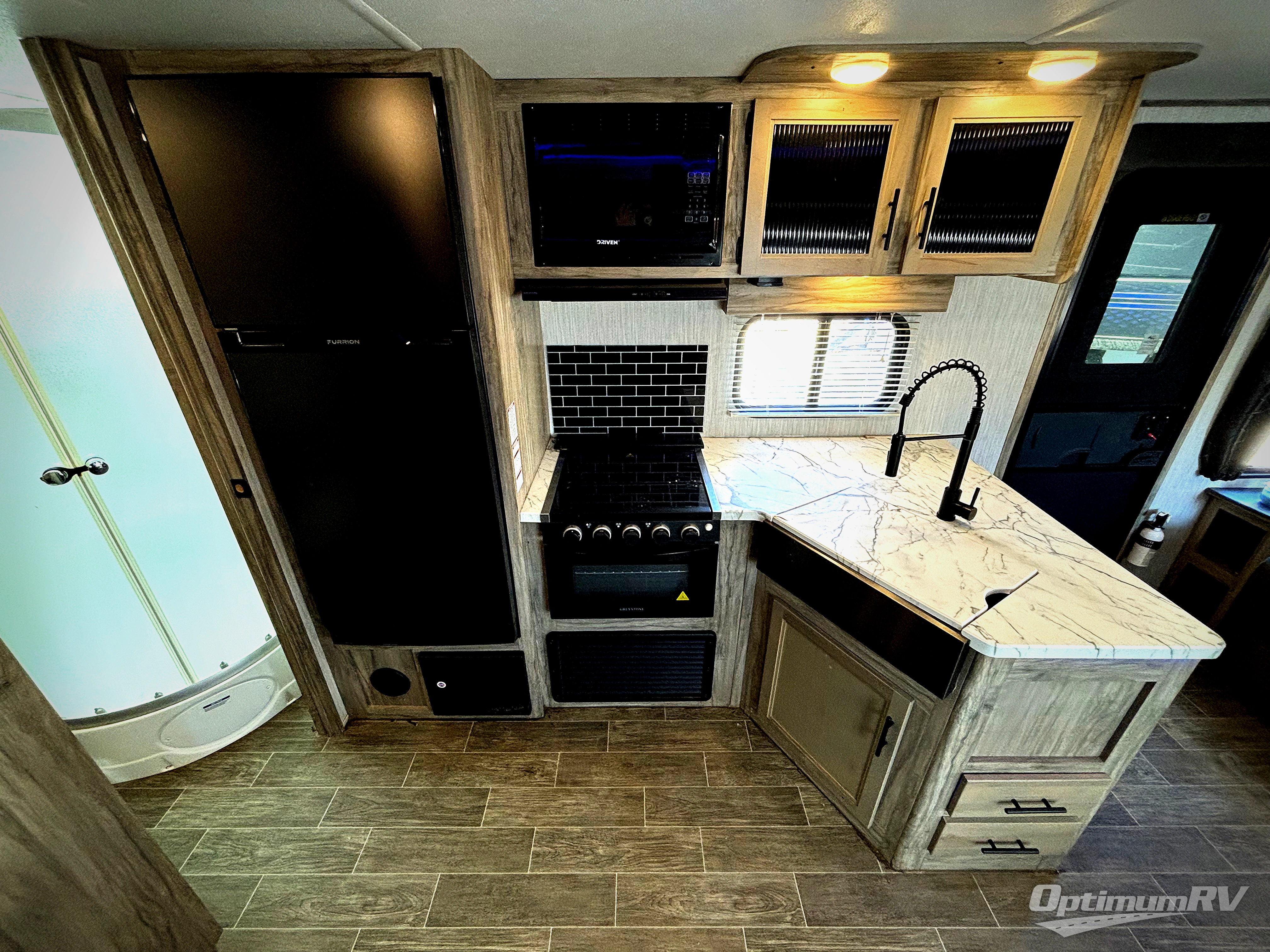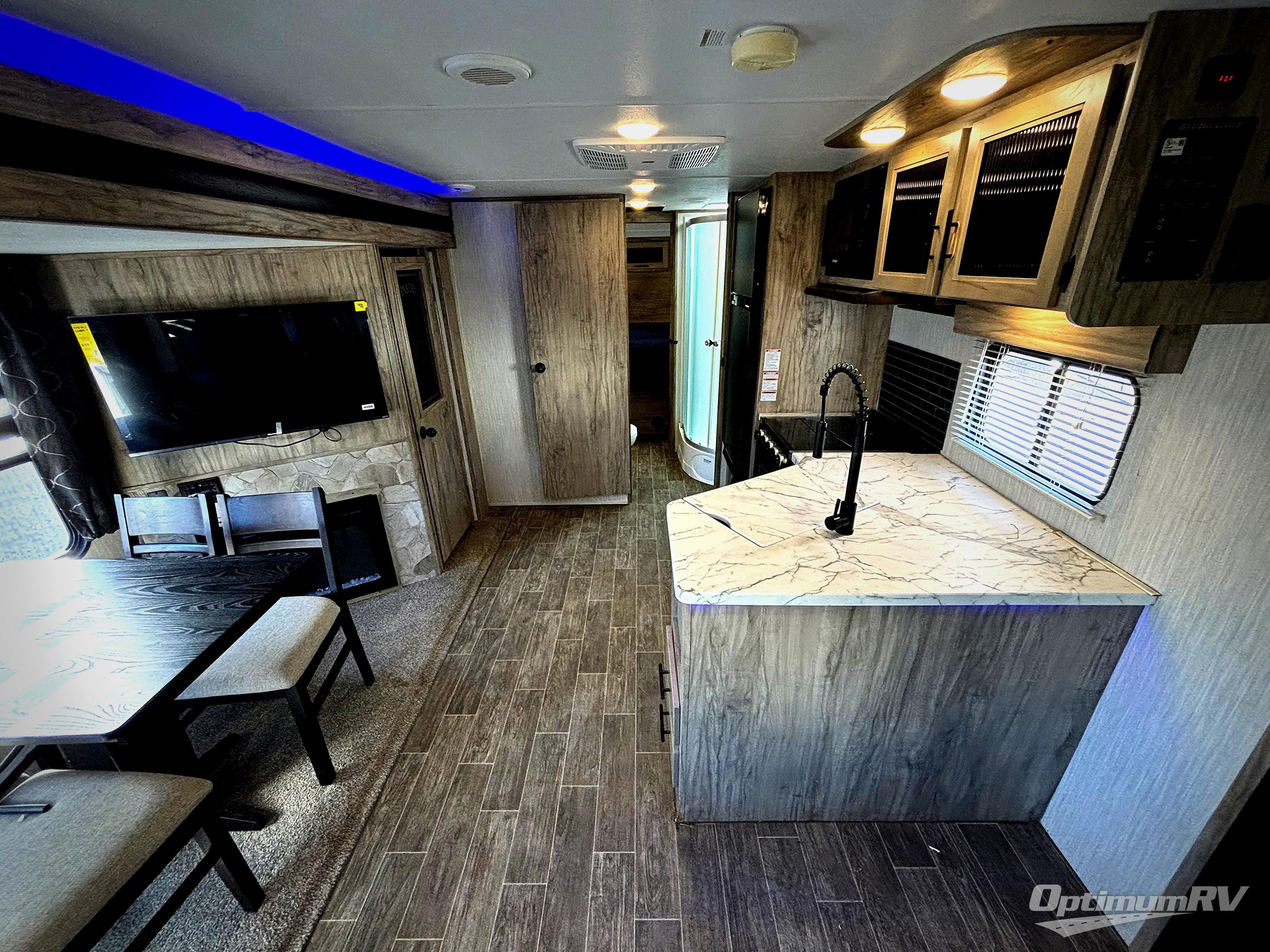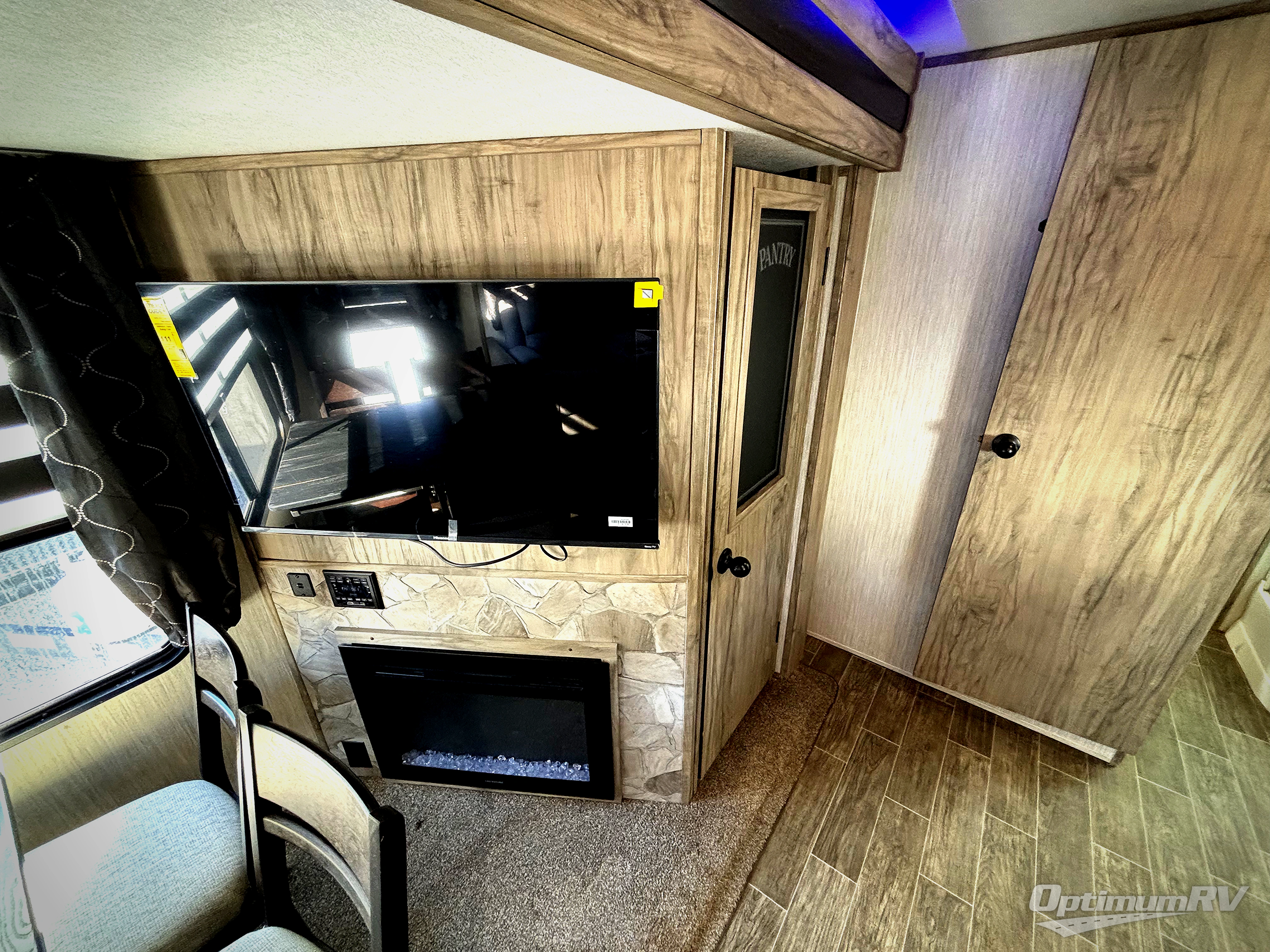 If you're looking for a dynamic, weight conscious travel trailer for you and your spouse to take to your favorite campsite then you need this one! The cross conversational area includes a deluxe tri-fold hide-a-bed sofa with a panoramic rear window to look out at the lake, a free standing table with four seats, and a fireplace to enjoy on those cool nights, just grab a snack from the walk-in pantry and you're all set for the perfect evening. The walk-through bathroom has a radius shower with opaque glass doors, a skylight, and a linen closet, plus you can enter right into the front private bedroom. The bedroom has a comfortable queen bed with nightstands and shirt closets on either side to keep your clothes looking their best, and you can even choose to add an optional TV for your entertainment. The exterior features an oversized 20' awning, a deluxe outside kitchen, and a full pass-through storage area to keep all of your camping gear!