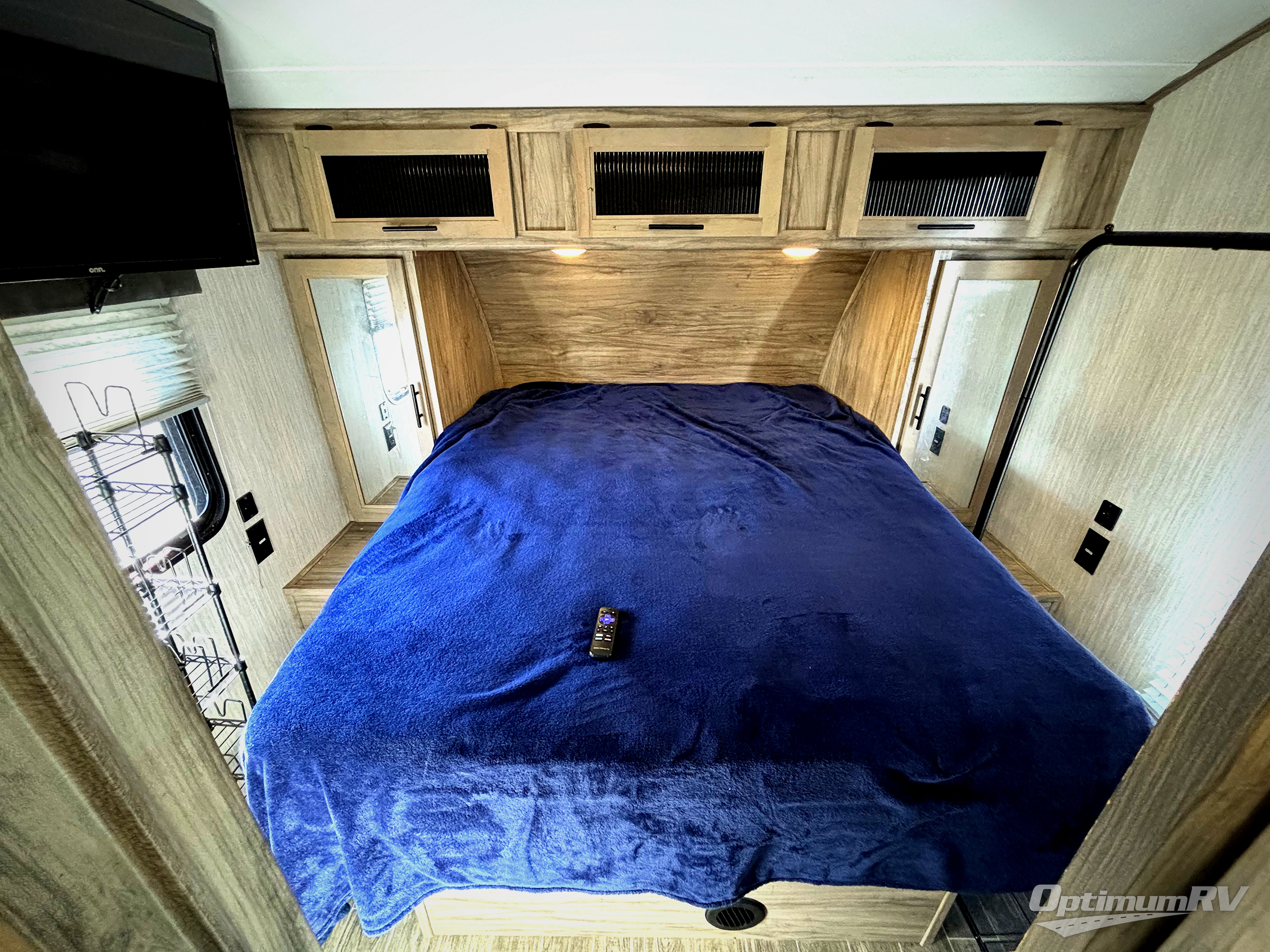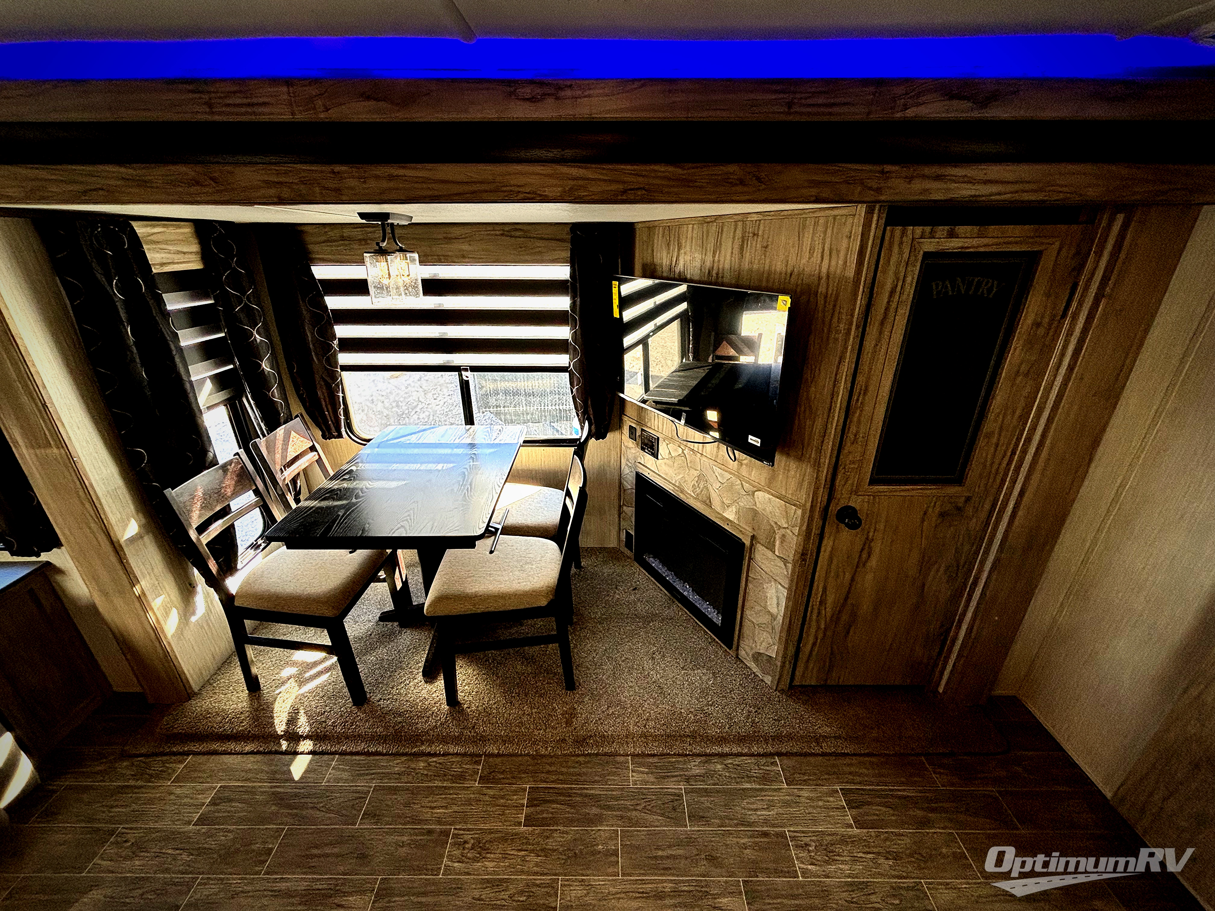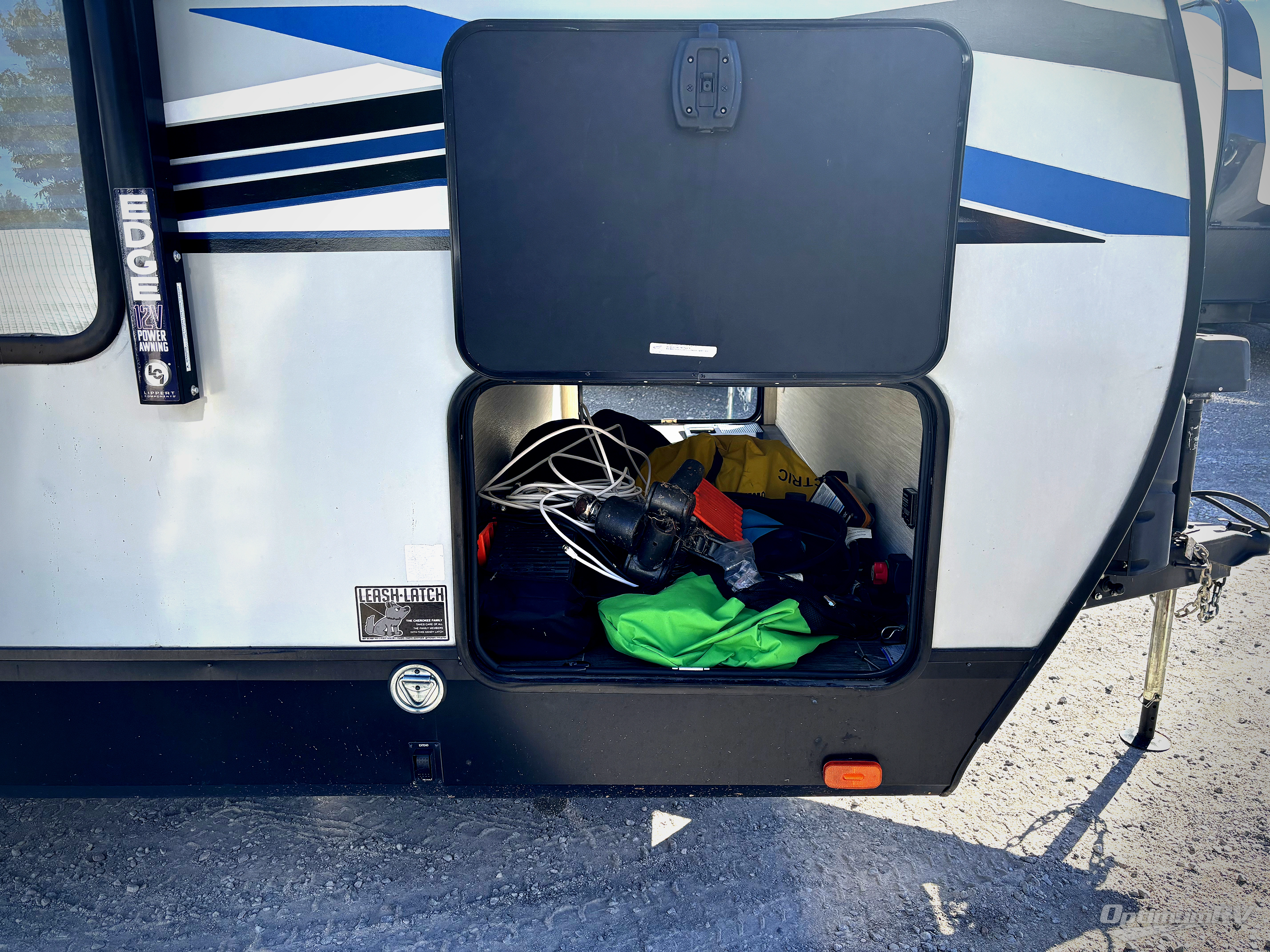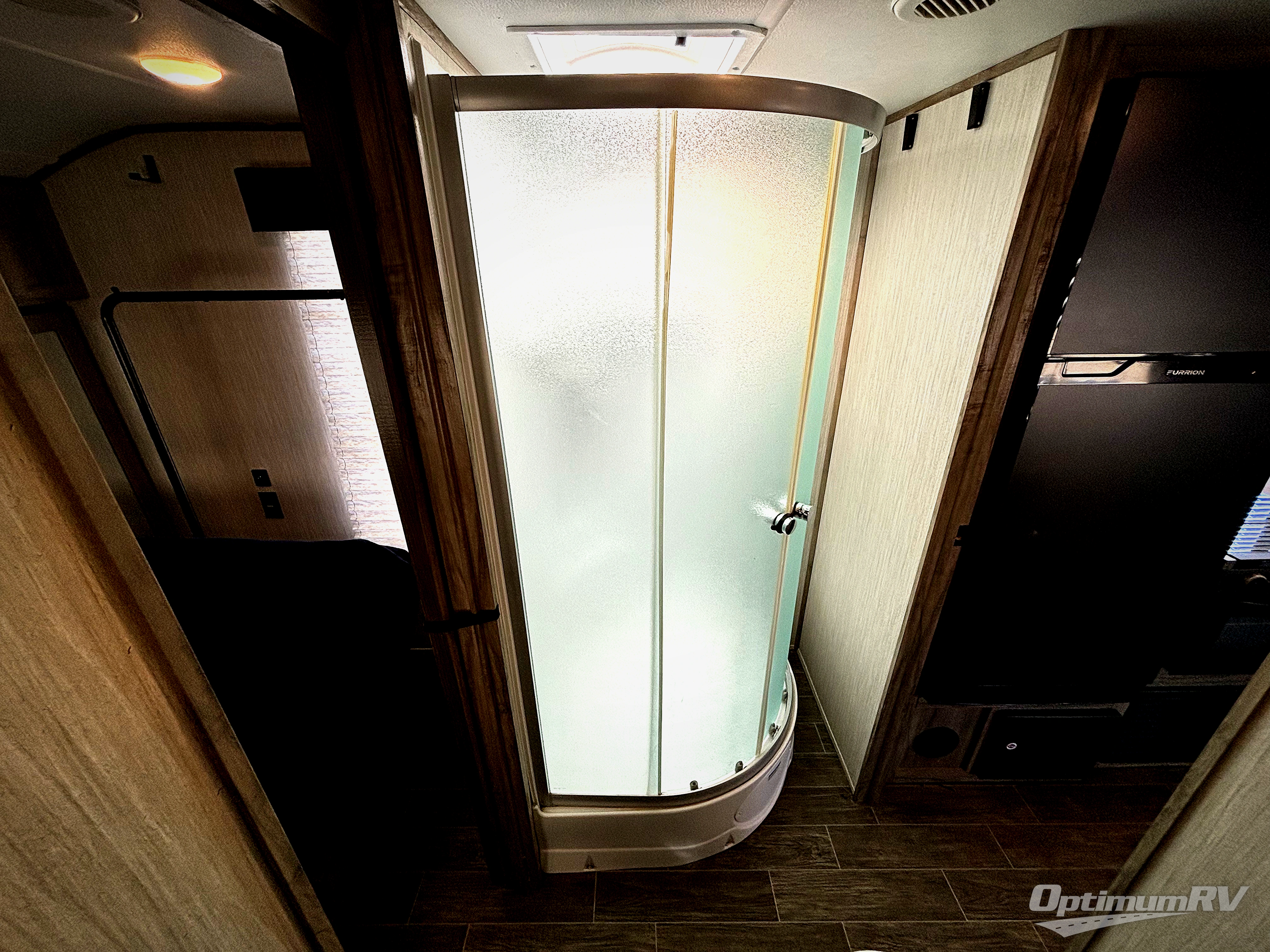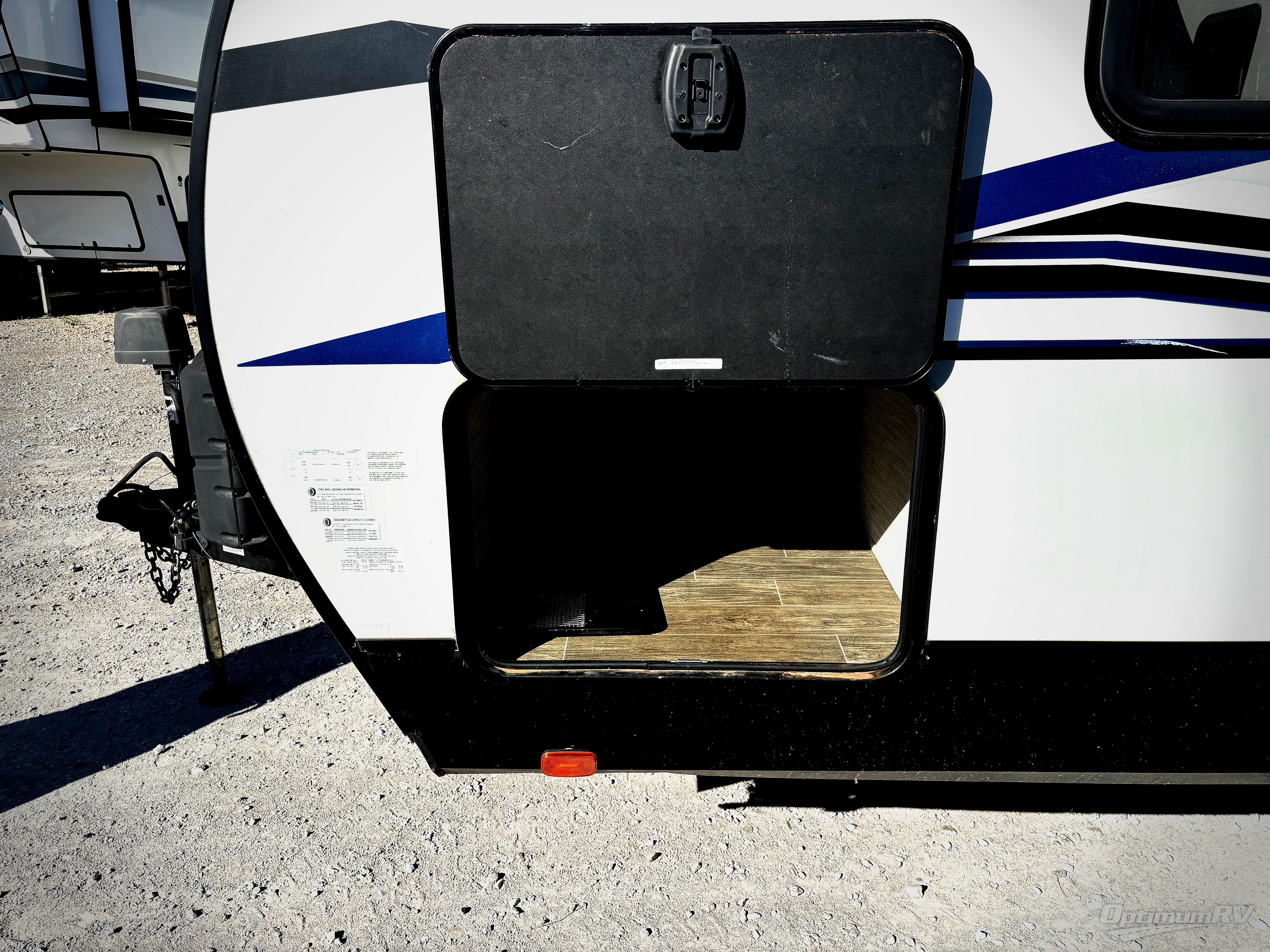 If you're looking for a dynamic, weight conscious travel trailer for you and your spouse to take to your favorite campsite then you need this one! The cross conversational area includes a deluxe tri-fold hide-a-bed sofa with a panoramic rear window to look out at the lake, a free standing table with four seats, and a fireplace to enjoy on those cool nights, just grab a snack from the walk-in pantry and you're all set for the perfect evening. The walk-through bathroom has a radius shower with opaque glass doors, a skylight, and a linen closet, plus you can enter right into the front private bedroom. The bedroom has a comfortable queen bed with nightstands and shirt closets on either side to keep your clothes looking their best, and you can even choose to add an optional TV for your entertainment. The exterior features an oversized 20' awning, a deluxe outside kitchen, and a full pass-through storage area to keep all of your camping gear!