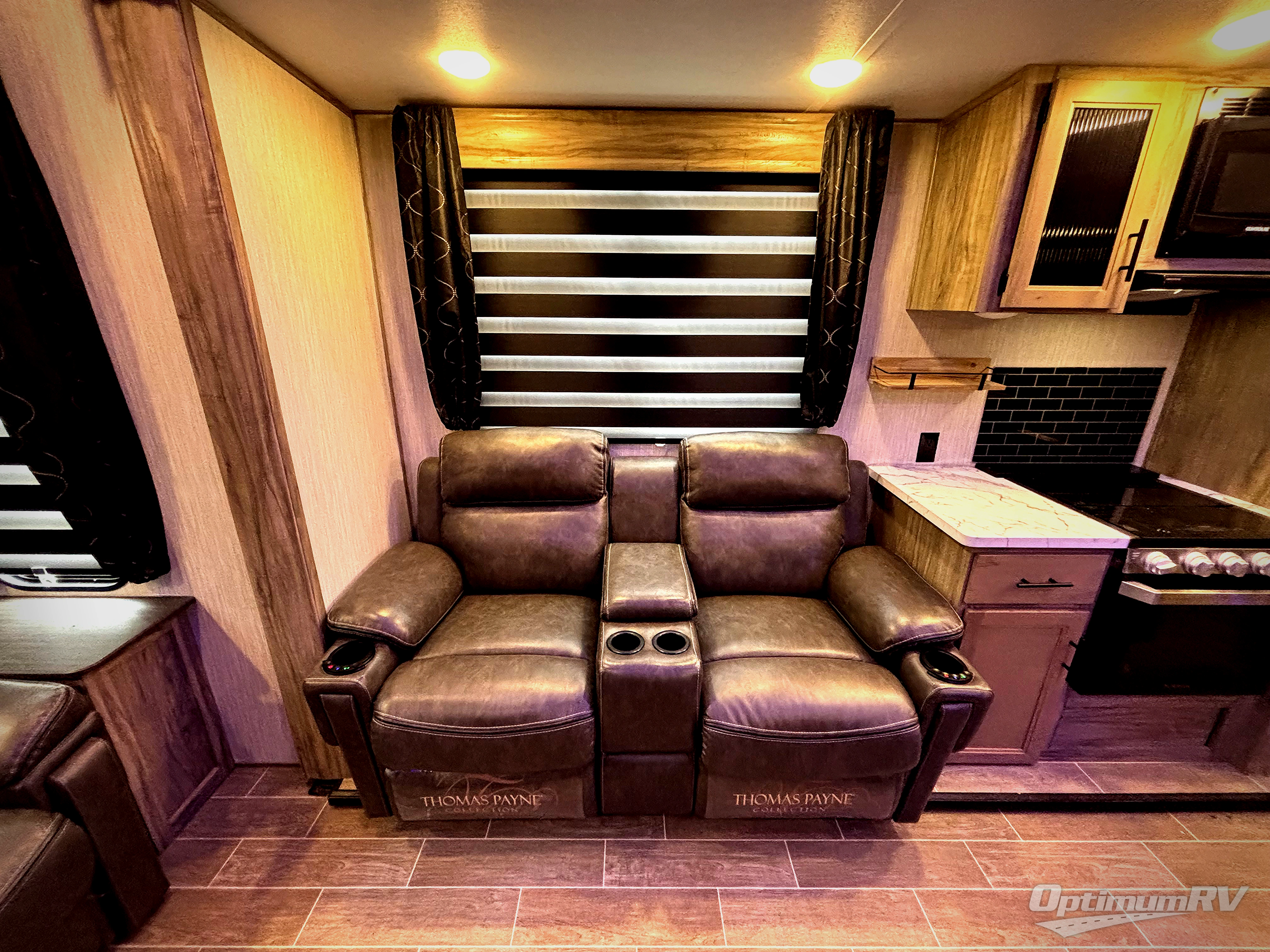 Step inside the most popular couples coach with this fifth wheel! You won't even feel like you're at the campground when you're relaxing at the home theatre seating while enjoying a heated massage in front of the fireplace. The stylish free-standing table has four seats with a panoramic rear window to view the lake while you play a few card games, just brew your favorite cup of coffee at the coffee bar and you're all set to have a good time. You can also have a fun time underneath the 15' awning with a cold beverage from the residential refrigerator at the outside kitchen. Enjoy a good night's rest each night on the king bed inside the front private bedroom, and keep your clothes looking their best with the front wall wardrobe with shelves, and if you choose to add the optional washer and dryer you can extend your trips with clean clothes!