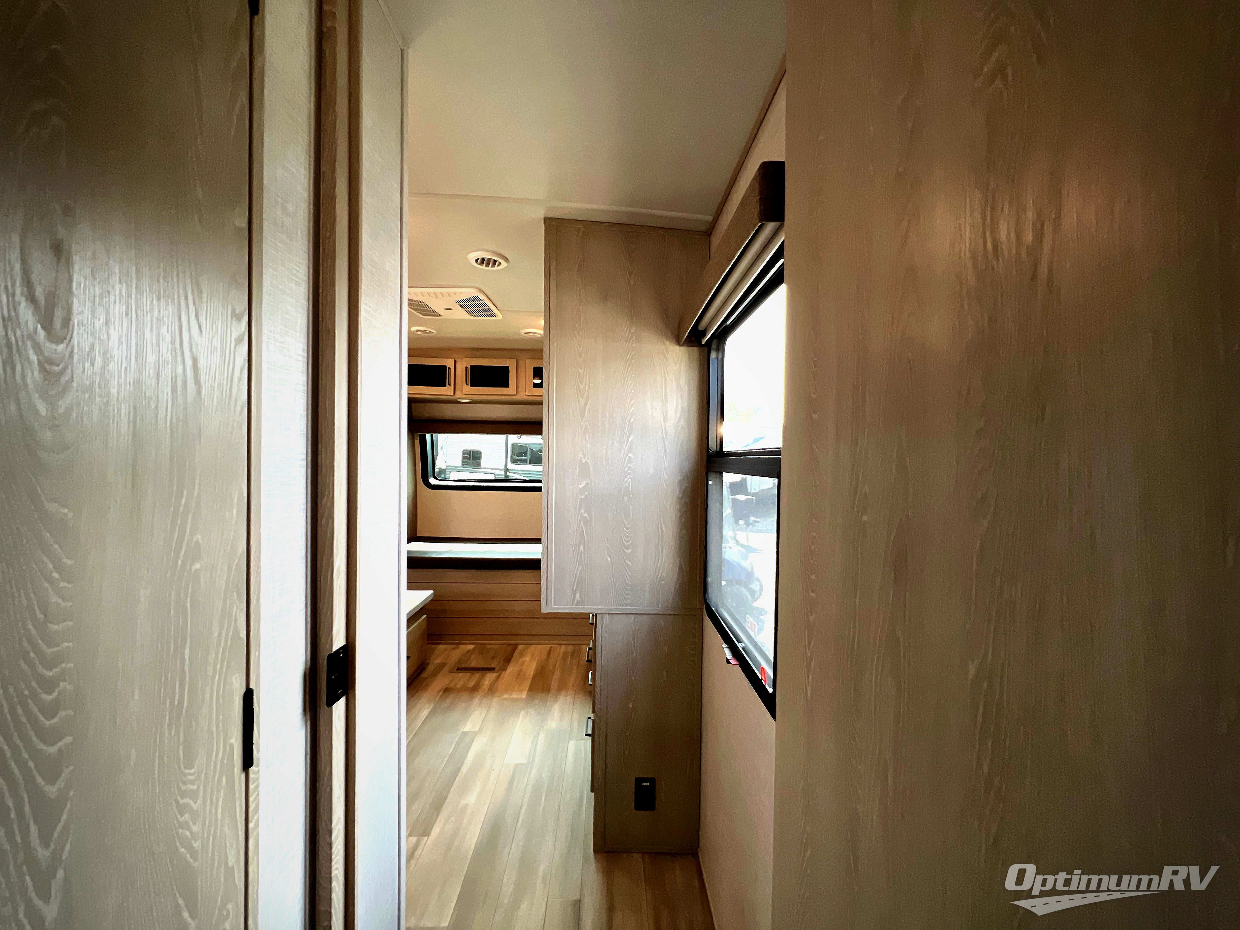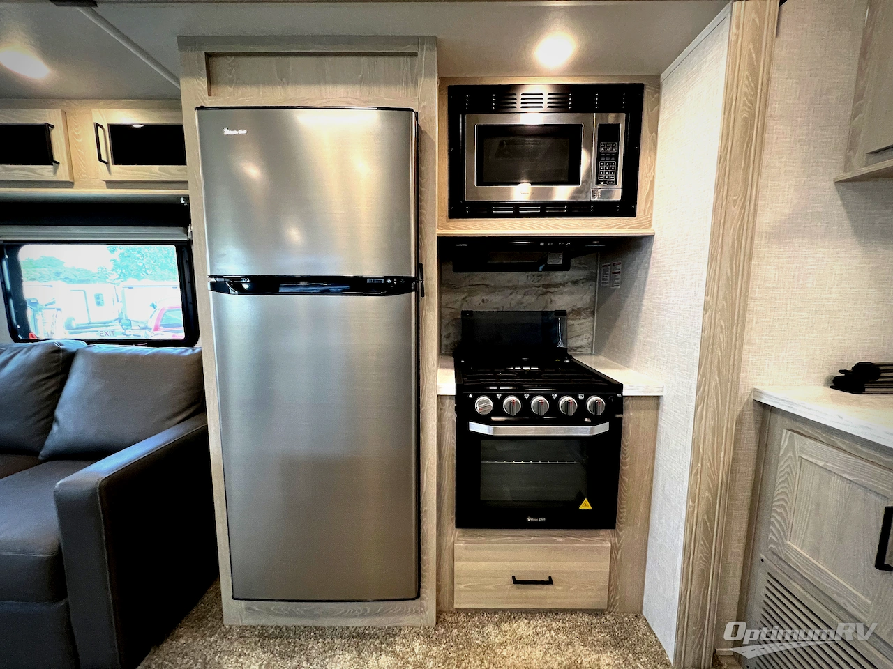 Spend your days exploring nature and enjoy creature comforts each evening in this feature-packed travel trailer. You will find plenty of seating space on the hide-a-bed sofa, the table and chairs, and the dual lounge chairs, plus there is an island with stools for the kids. This model includes an entertainment center with an LED TV and a fireplace which will make it feel more like home. If you enjoy spending more time outdoors, the two power awnings are sure to be a big hit, and the pass-through storage along with the additional exterior storage can store all your gear. In the evening you and your spouse can retreat to the front private bedroom for a great night's rest on the slide out king bed!