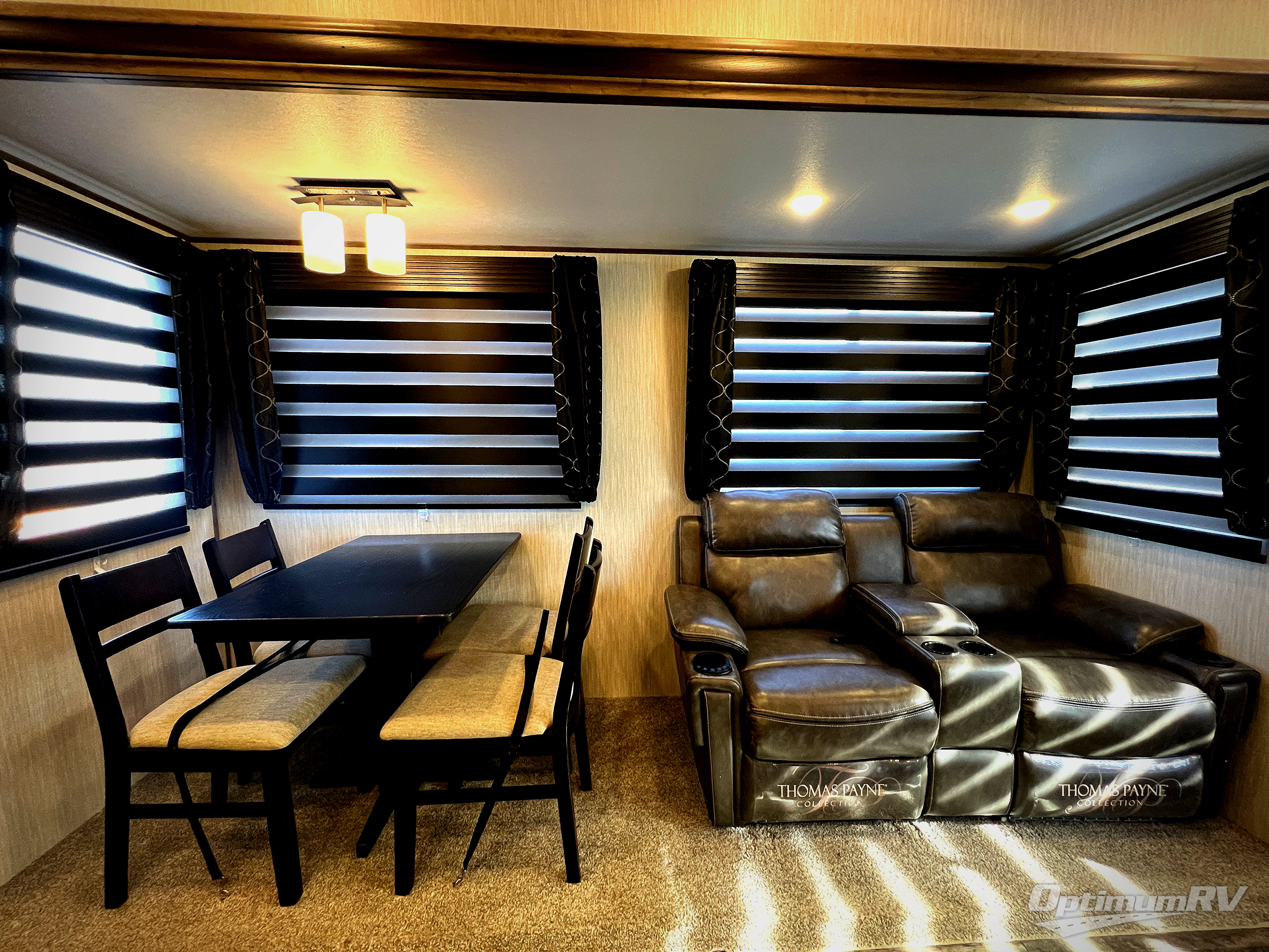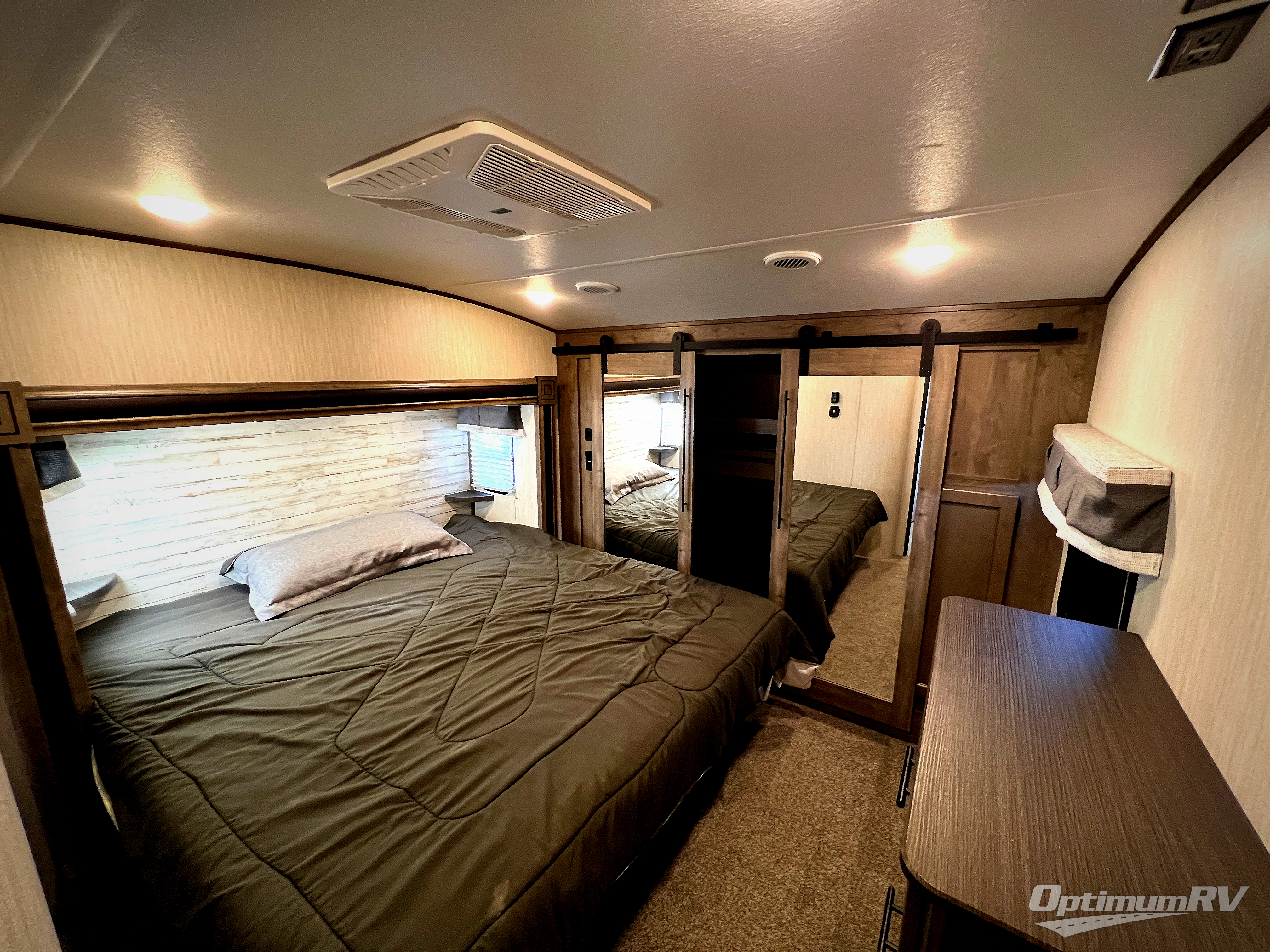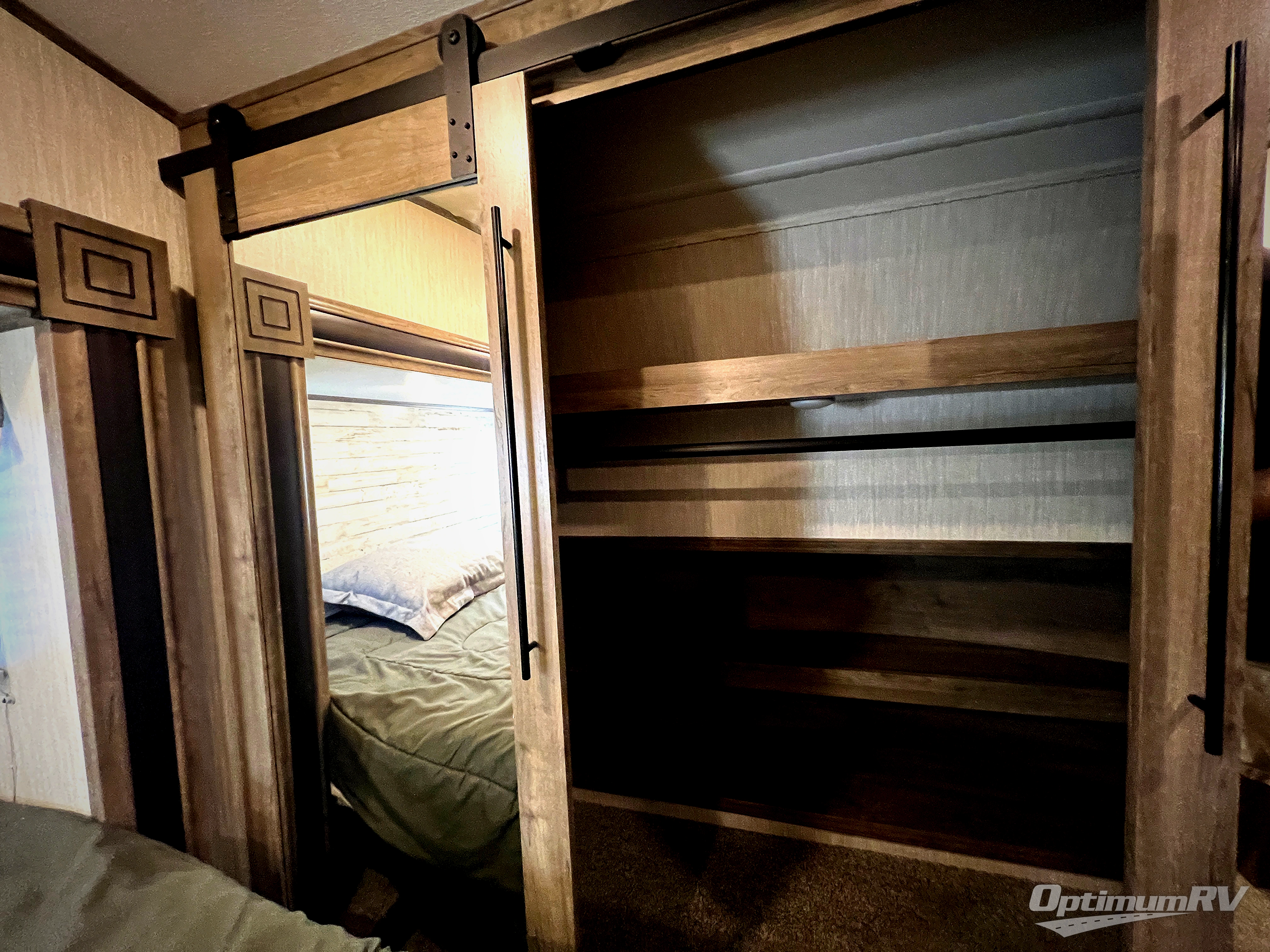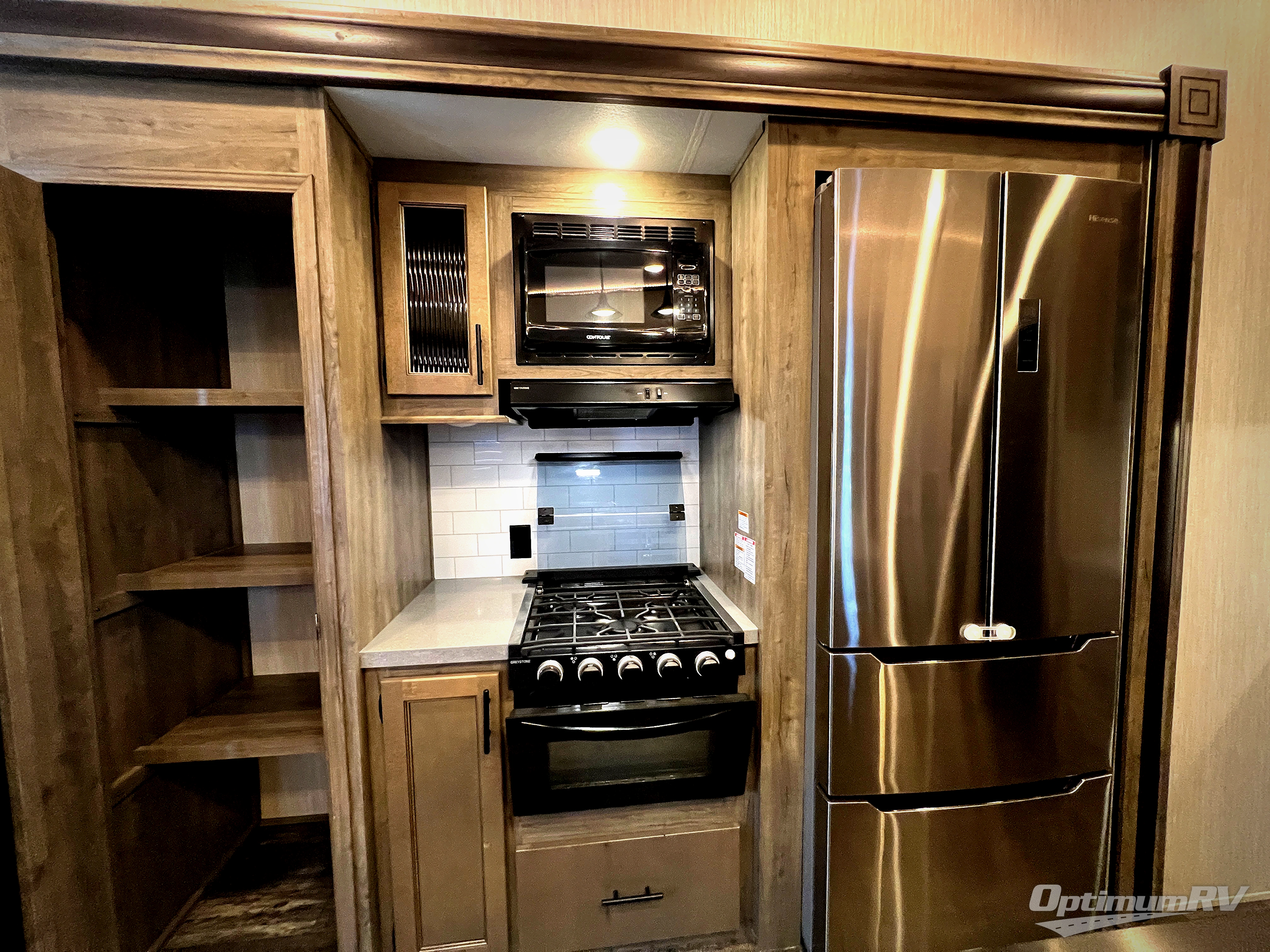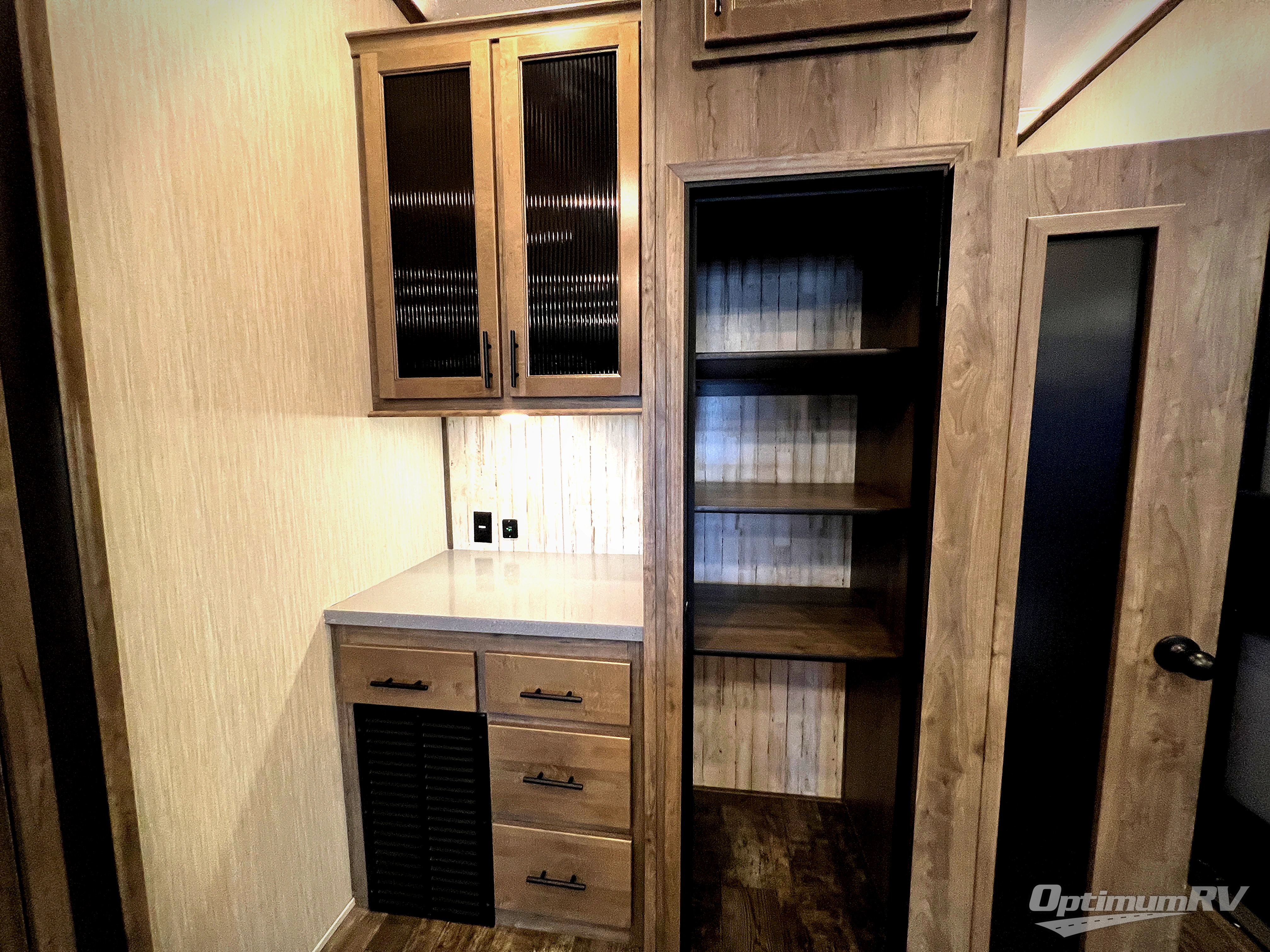 You're going to love camping in this Sabre fifth wheel! The front private bedroom features a queen bed that can be switched out for the optional king bed instead, and the large front closet comes with a shoe rack and an area prepped for you to add the optional washer and dryer to enjoy clean clothes throughout your entire trip! The full bathroom has everything you will need to get squeaky clean each morning, including a walk-in shower with a sky dome and a linen closet to have your towels close by. There is not only one kitchen pantry but two pantries, one of which has an area for your coat and linens to be stored. The exterior also has features you will love to use like the gas grill, the pass-through storage area, and the all-in-one docking station which even features an outdoor shower to eliminate tracking mud inside!
