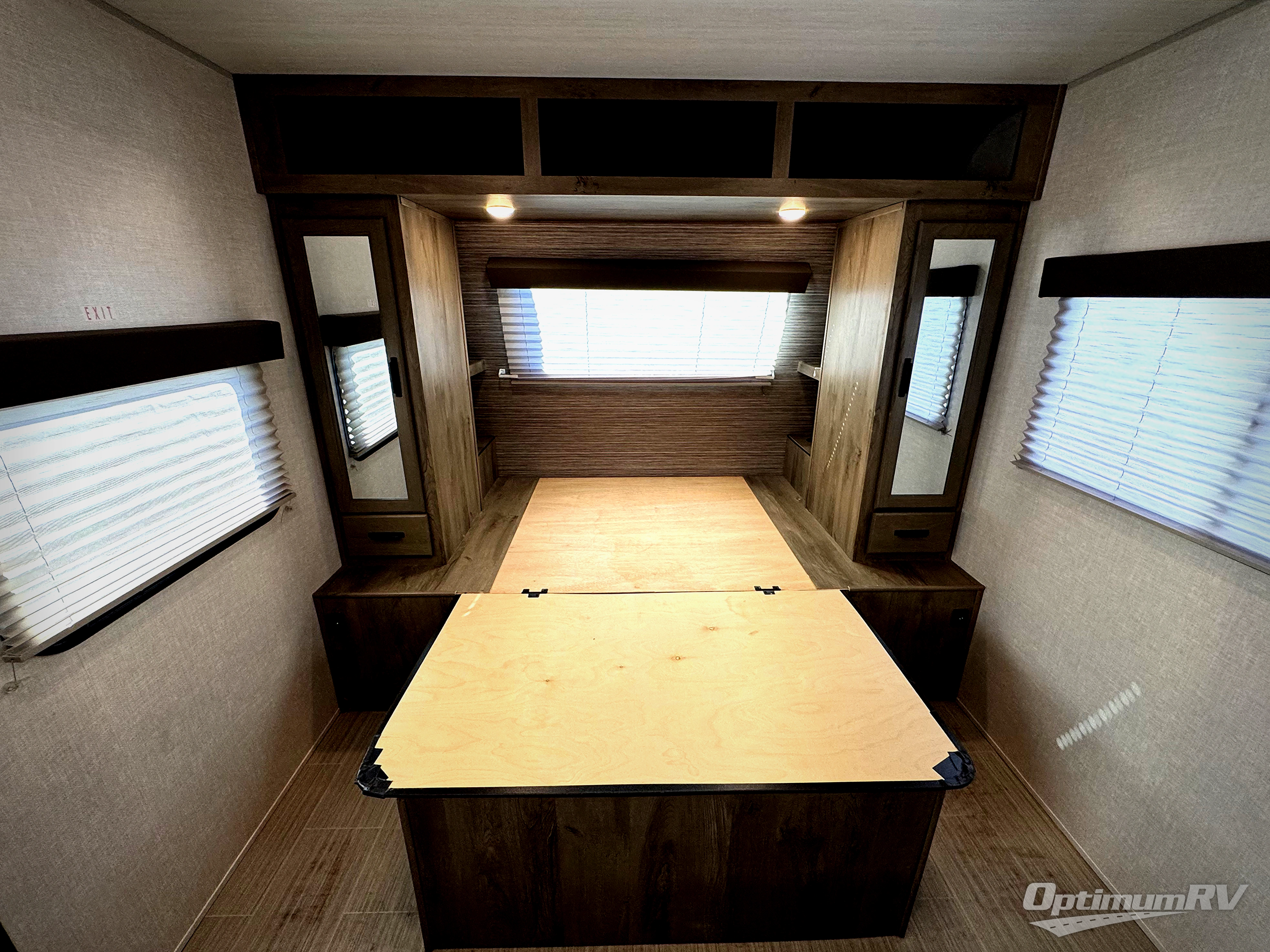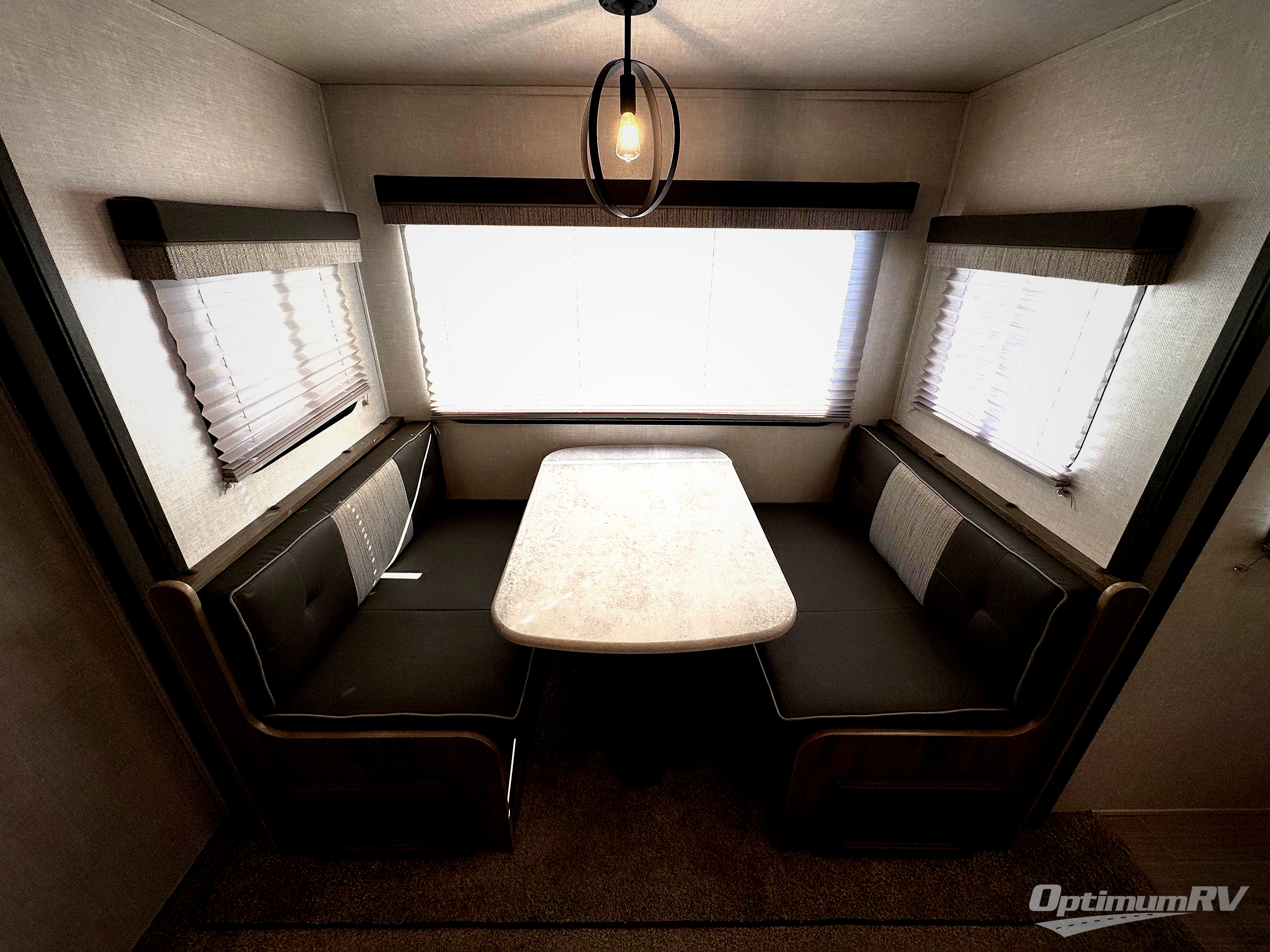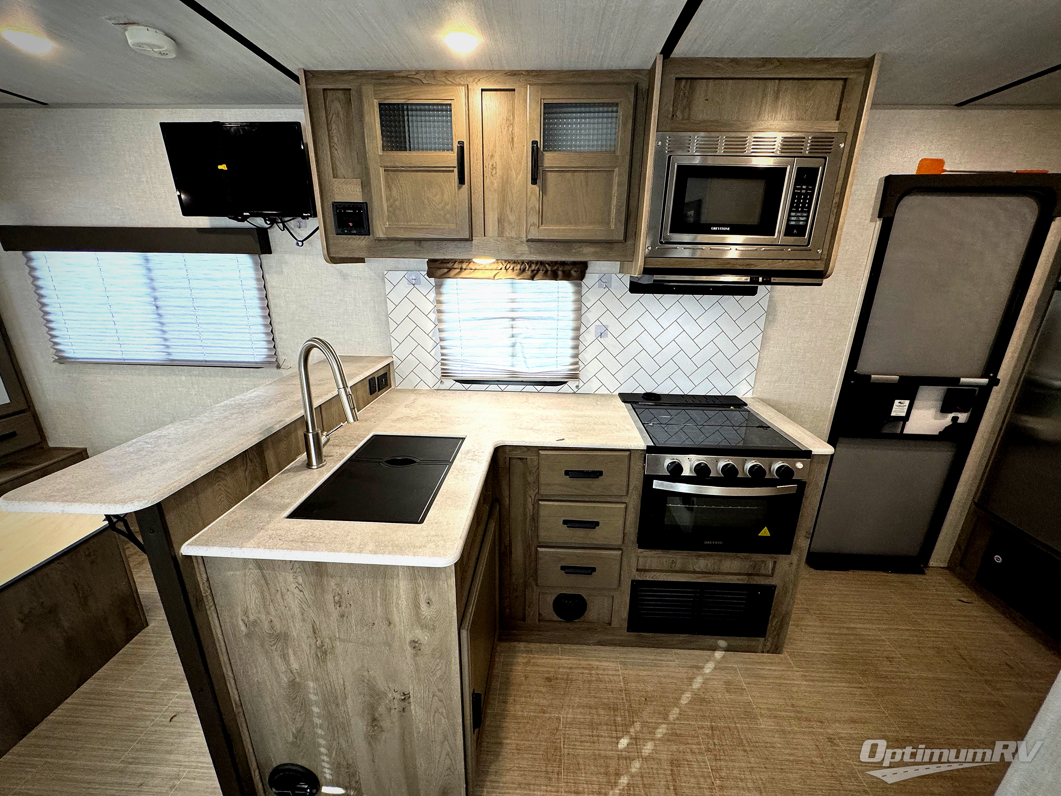 This Surveyor Legend travel trailer is perfect for the adventurous couple that likes loads of storage! The kitchen features a cozy L-shaped countertop with ample overhead storage so that you can easily make your favorite campsite meals and snacks. A bar top with two stools is perfect for breakfast or coffee, and you can keep the cook in the family company while they are at the sink or the three-burner range with gas oven. The 75" x 42" booth dinette slides out to offer added walking space, and it can easily convert to added sleeping space for an overnight guest. Up front, you will find a queen bed for nighttime comfort, wardrobe space along each side, and an overhead shelf. Outside beneath the queen bed, you have space to store your outdoor games and camping gear in the pass-through storage, so leave nothing you want or need at home!