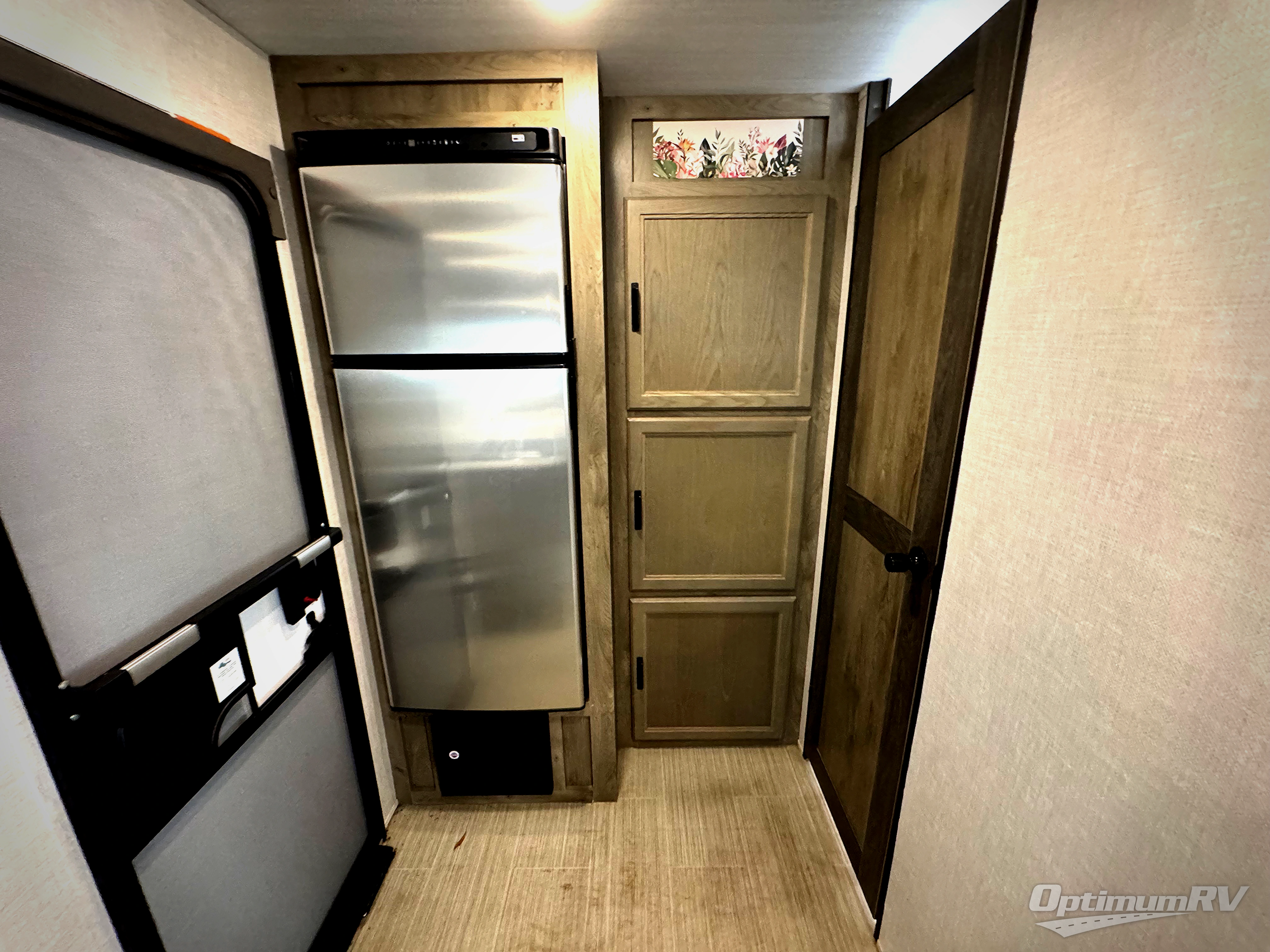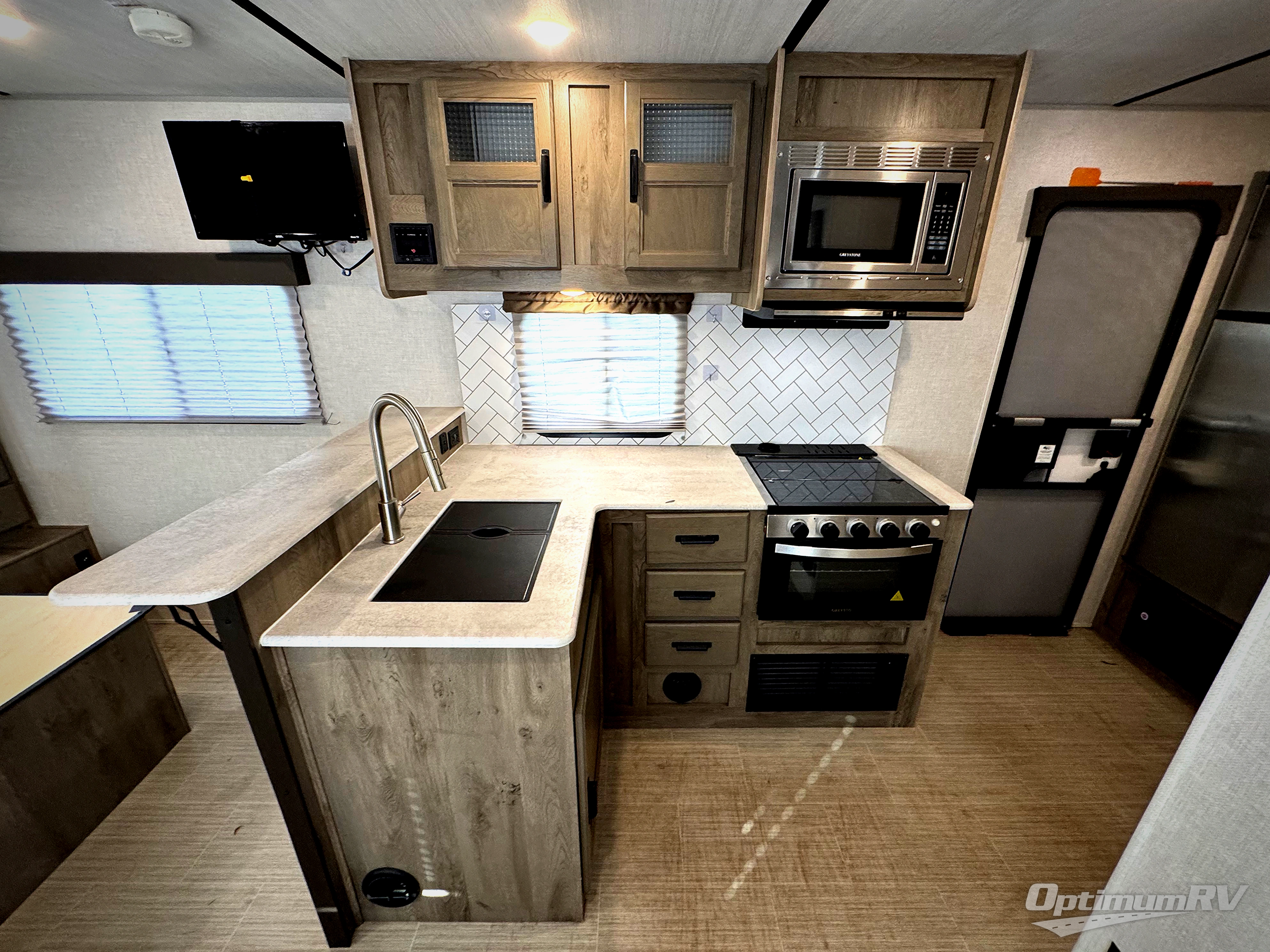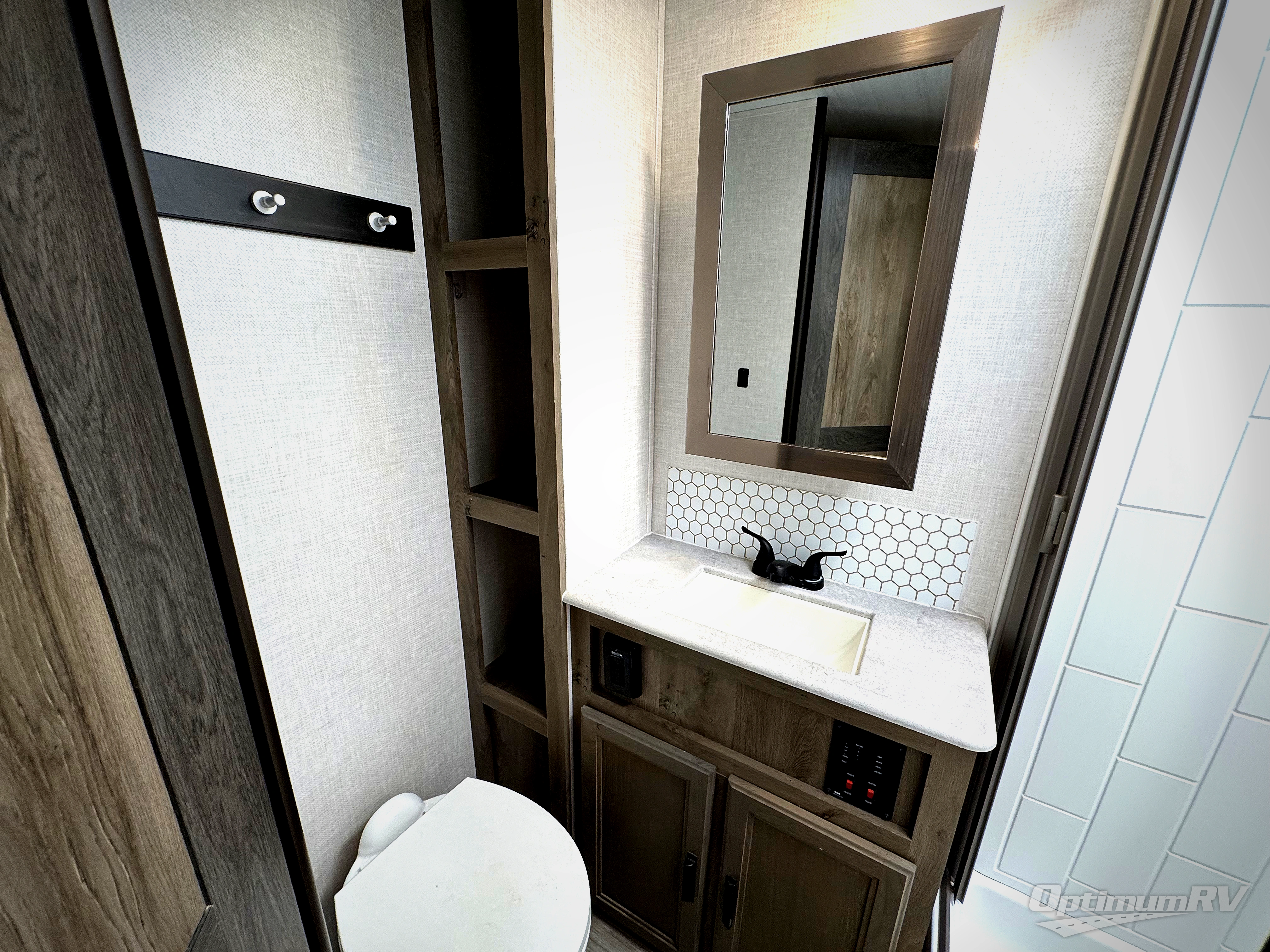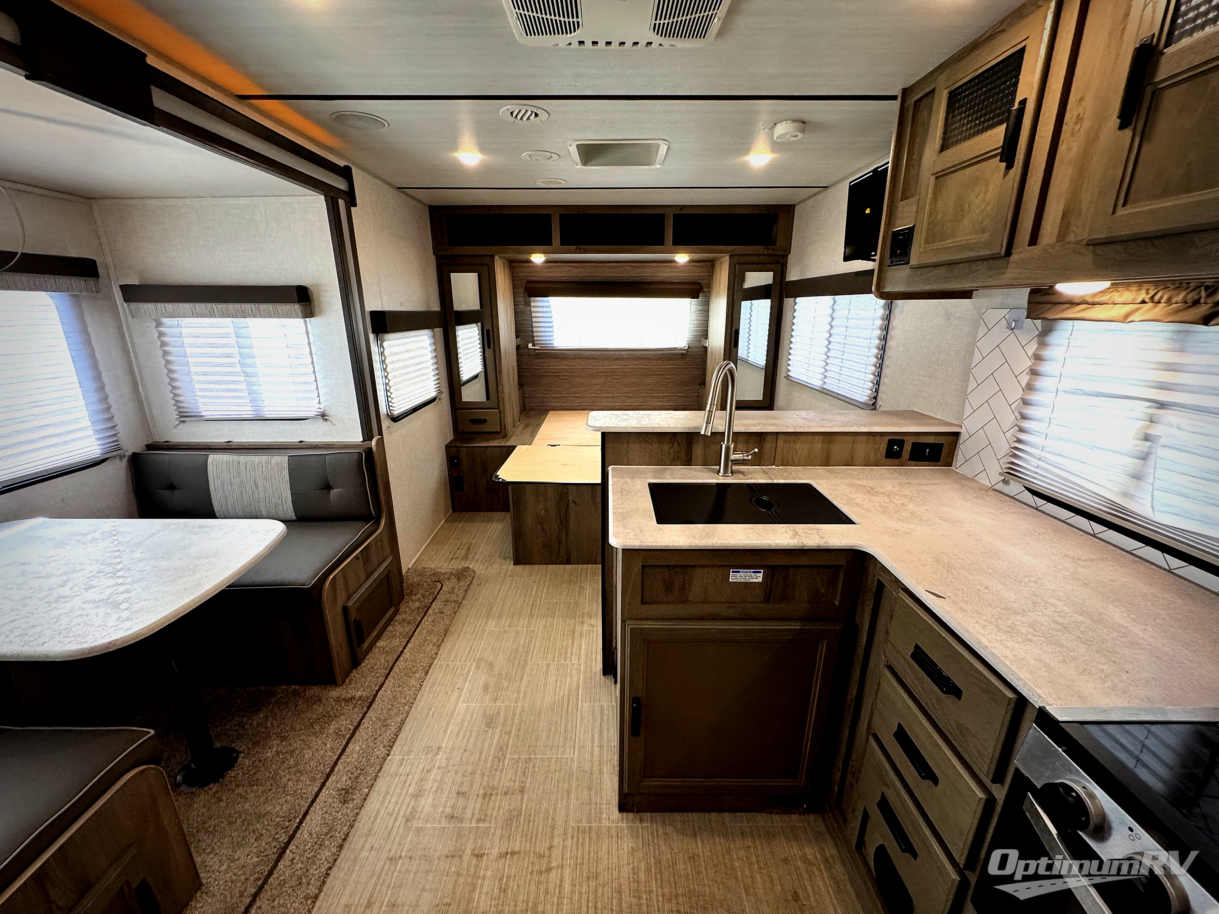 This Surveyor Legend travel trailer is perfect for the adventurous couple that likes loads of storage! The kitchen features a cozy L-shaped countertop with ample overhead storage so that you can easily make your favorite campsite meals and snacks. A bar top with two stools is perfect for breakfast or coffee, and you can keep the cook in the family company while they are at the sink or the three-burner range with gas oven. The 75" x 42" booth dinette slides out to offer added walking space, and it can easily convert to added sleeping space for an overnight guest. Up front, you will find a queen bed for nighttime comfort, wardrobe space along each side, and an overhead shelf. Outside beneath the queen bed, you have space to store your outdoor games and camping gear in the pass-through storage, so leave nothing you want or need at home!