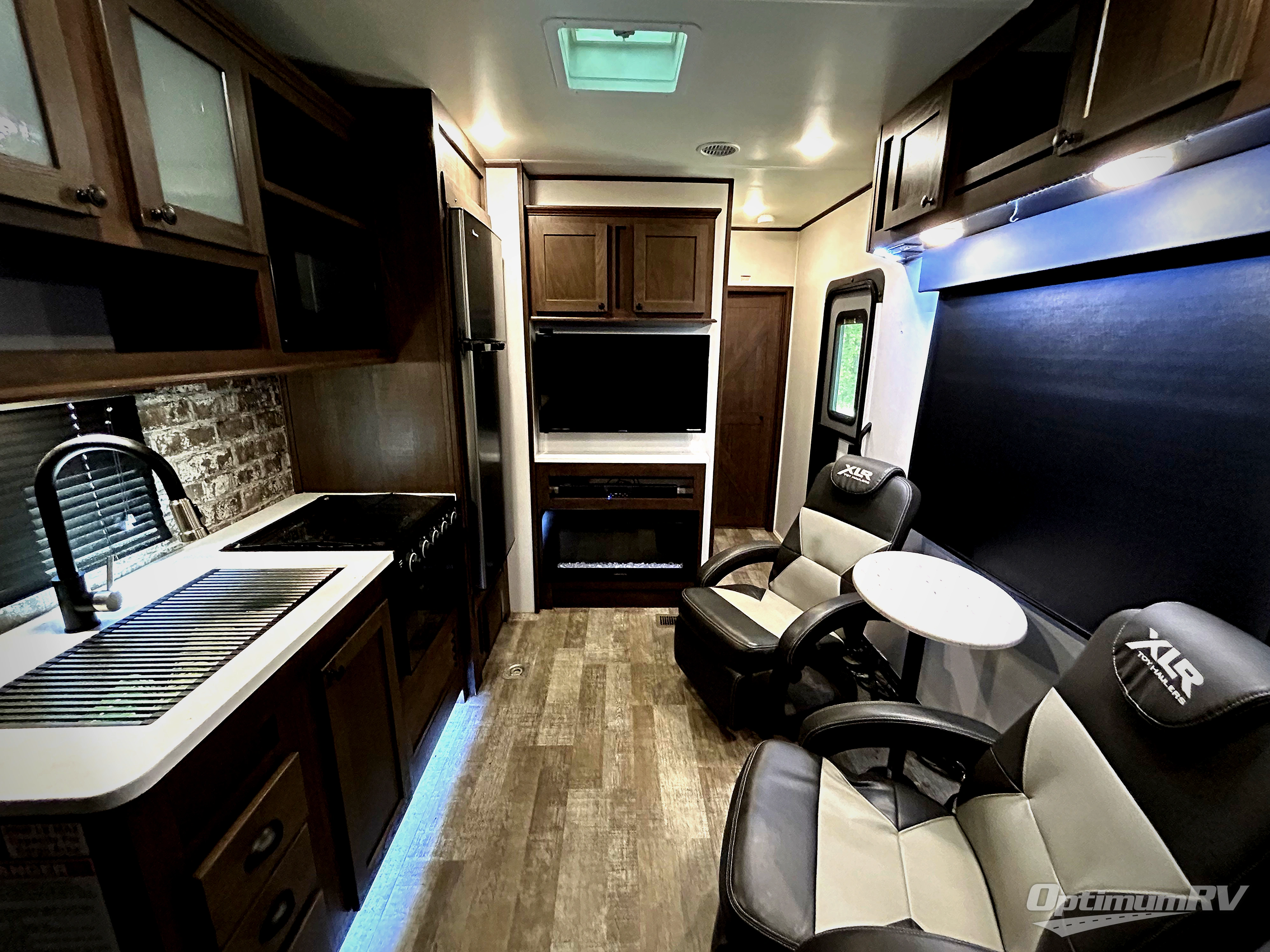 This XLR Hyper Lite toy hauler has been awarded the "Travel Trailer Toy Hauler of the Year" from RV News, so you can trust that it is absolutely your best choice! There are excellent relaxation choices with the dual sofas and the two lounge chairs with end table in between, and for sleeping, the electric queen bunk above the sofas and the queen-size bed in the master suite will both be a delight to find. You can snuggle up with a good book and a blanket in front of the electric fireplace, and you can always stay clean by using the shower in the dual-entry bathroom. There is also a bathroom skylight so that you can have some added sunlight while you get ready.