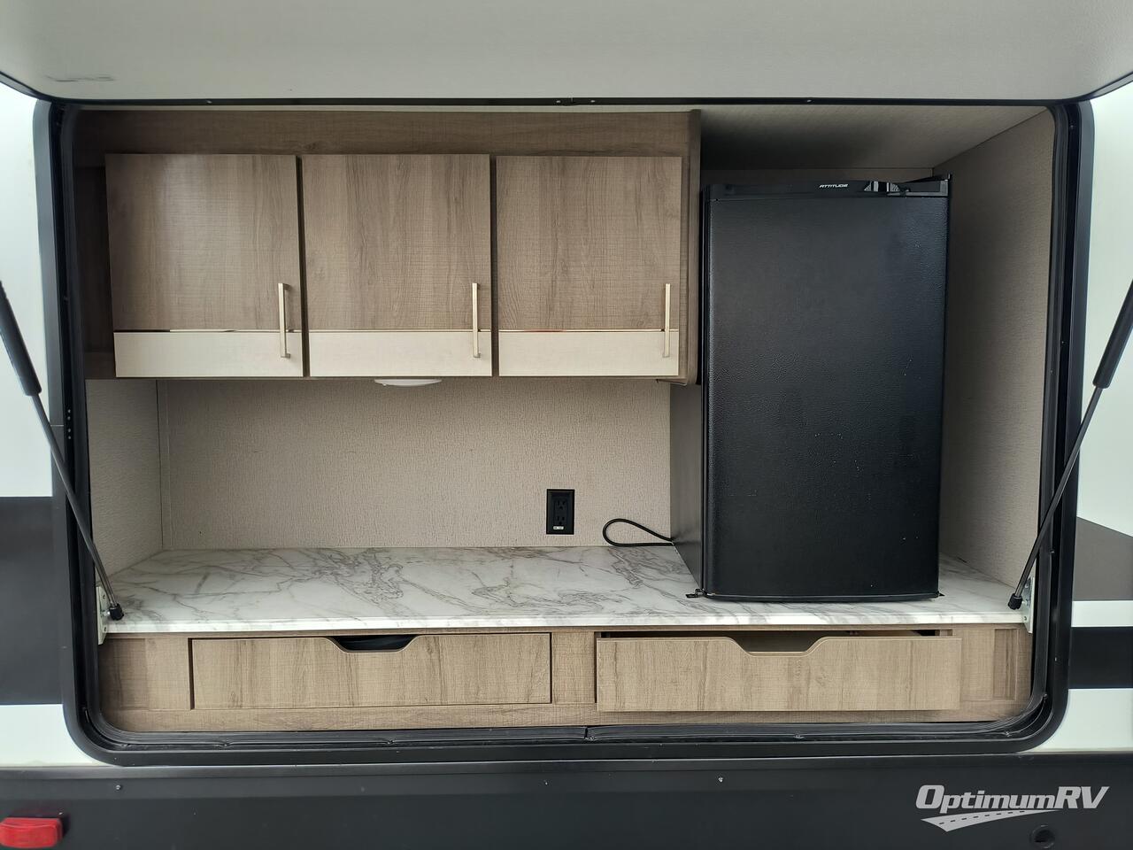 Invite the cousins to join you on your next camping trip in this spacious travel trailer that offers a bunkhouse with four bunk beds, a slide out, a wardrobe and a great view out the back window. There are drawers as well for everyone's belongings. You can also offer sleeping space on the booth dinette and the tri-fold sofa in the main living area, and the kitchen appliances including the island are on the opposite side. You might choose to add the optional free standing table and/or the theatre seating option if you don't need the additional sleeping space. The cook will love the inside kitchen space, the pantry, and the easy access outside to the outdoor kitchen and the 21' power adjustable awning. And the exterior pass through storage allows you to bring along the fishing poles, firewood, and larger camping gear.