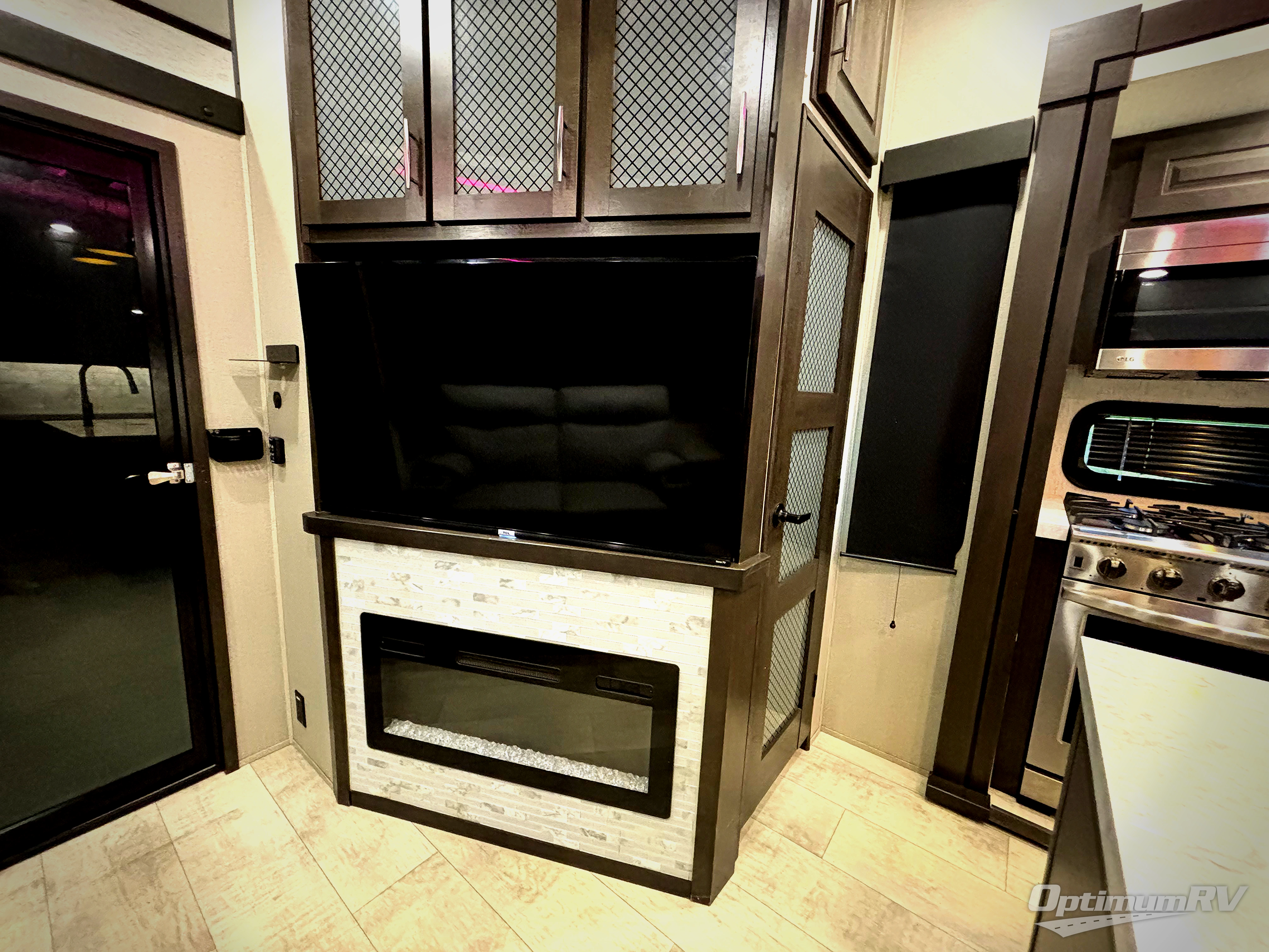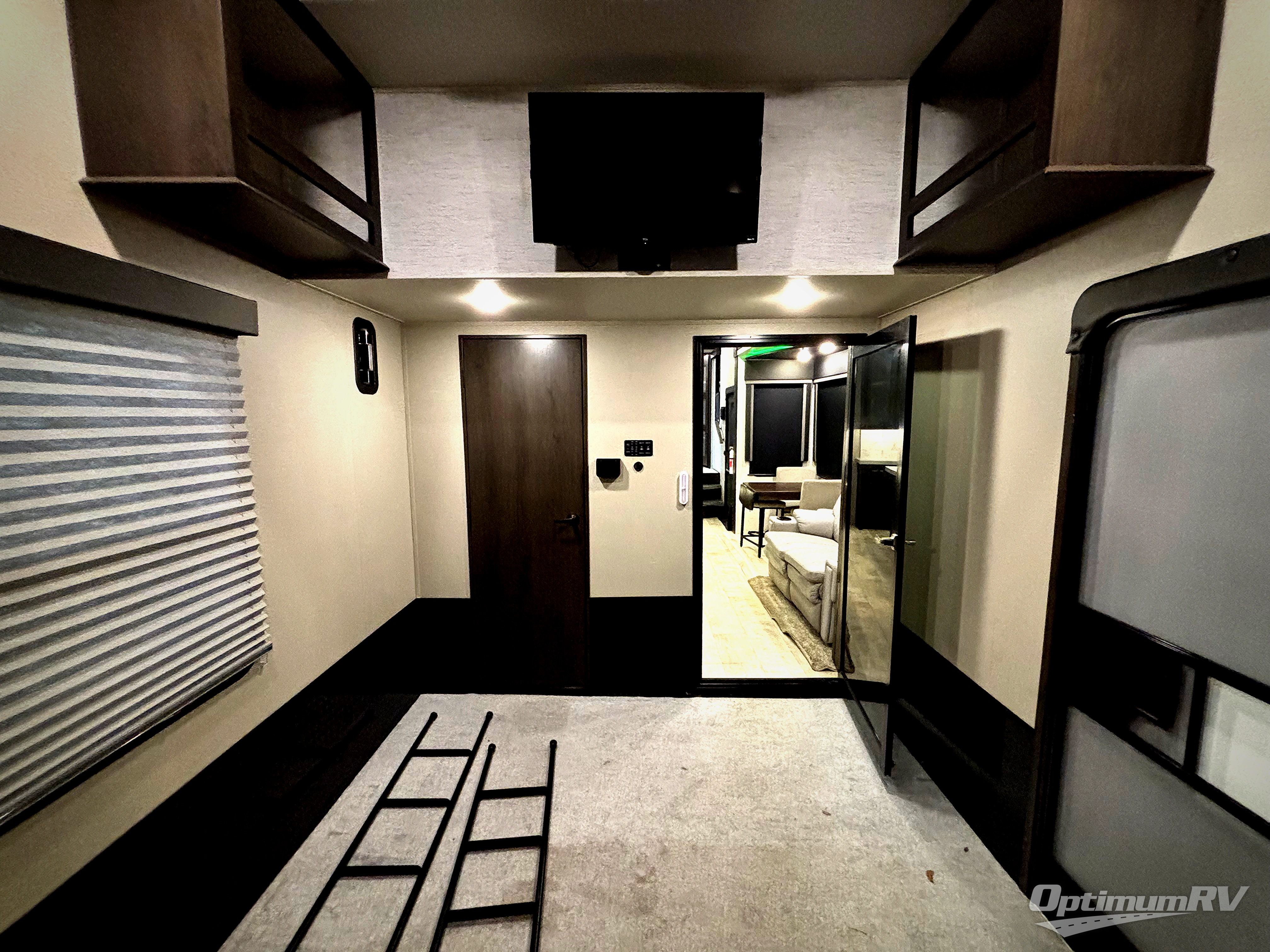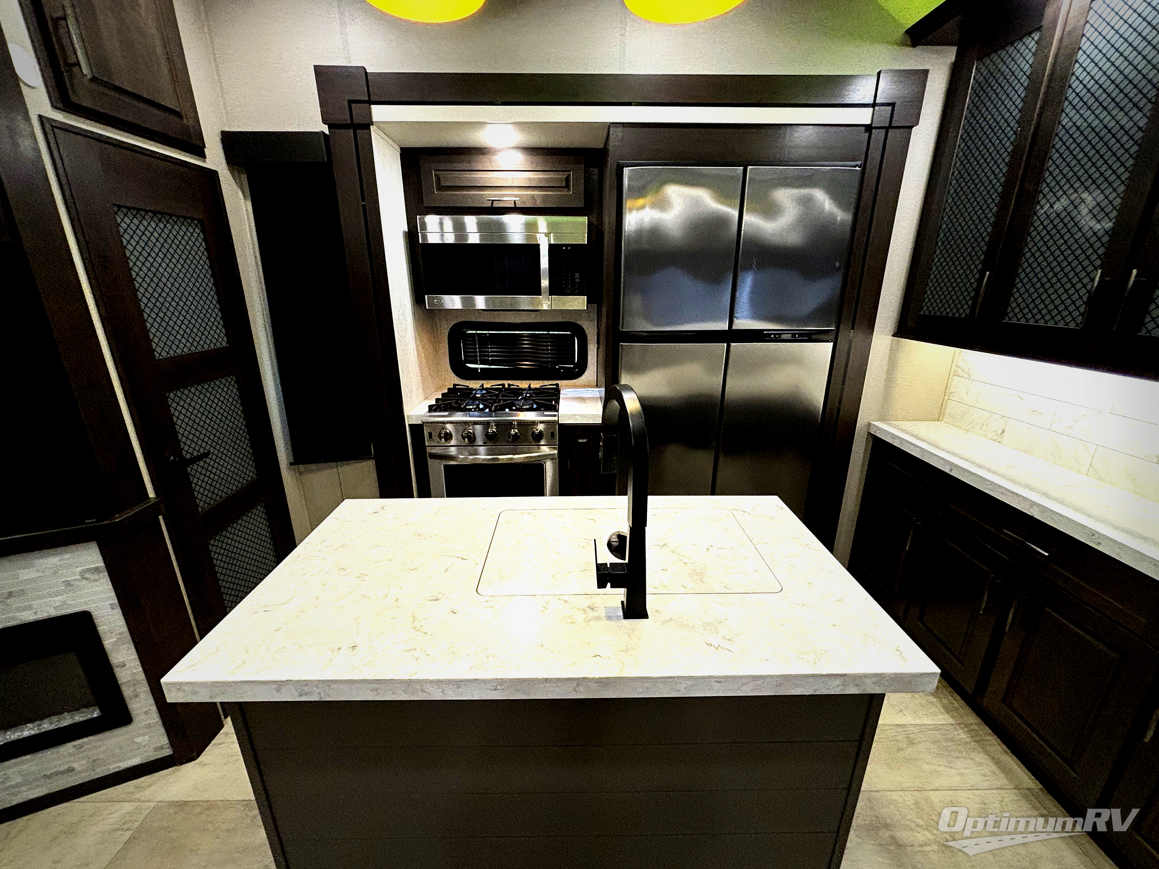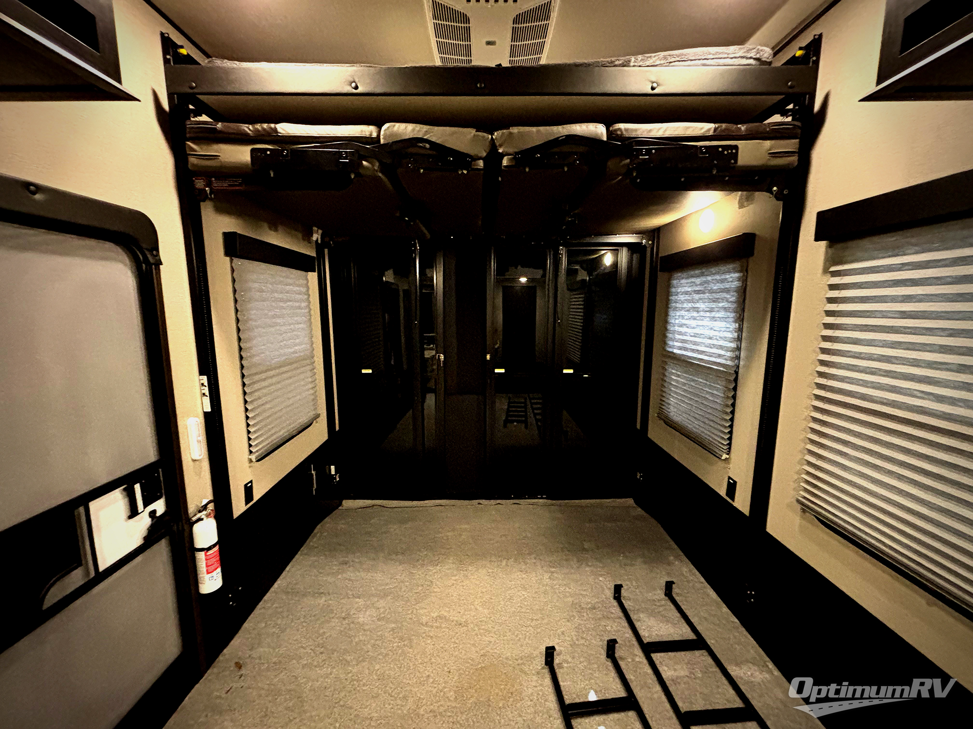 This Momentum toy hauler provides the maximum entertainment with its 49" LED TV in the living area, 32" LED TV in the private bedroom, 32" LED TV in the 12' 6" separate garage, and exterior LED TV! You can choose to add the optional Super Sofa which will create an amazingly comfortable area to sit down across from the electric fireplace. The two full bathrooms are one of the most impressive features found on this unit, and the three power awnings are another shocking addition. Within the kitchen, you'll be able to prepare all of your family's favorite dishes when you use the chef-inspired range and oven, and the window behind the range allows you to view the campsite while you cook. If you would prefer to have a residential refrigerator, you should check out model 397TH-R!
