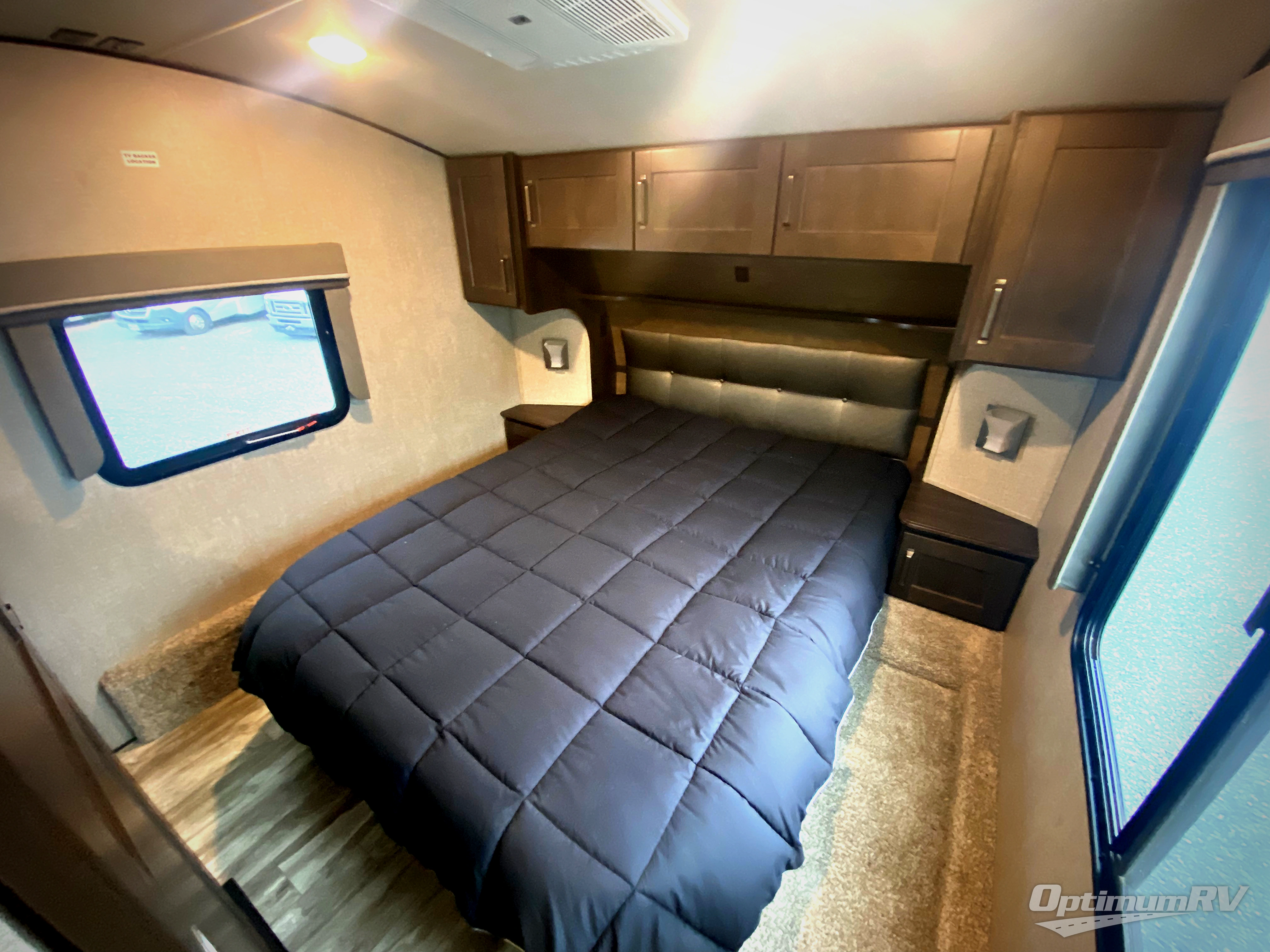 The master bedroom with a queen bed and plenty of storage is next to the full bathroom with a walk-in shower. The kids will love staying on the opposite side of the fifth wheel in their own bunkhouse with triple bunk beds that sleep four, a dresser, and a space prepped for a TV. They can slide their door closed for privacy as well. When you are ready to make a meal, you will find everything you need from a microwave to an 8 cu. ft. refrigerator, plus you can cook on the outside kitchen whenever you like. And the tri-fold sofa and U-shaped dinette double as extra sleeping space for when you invite more friends and family to join you.