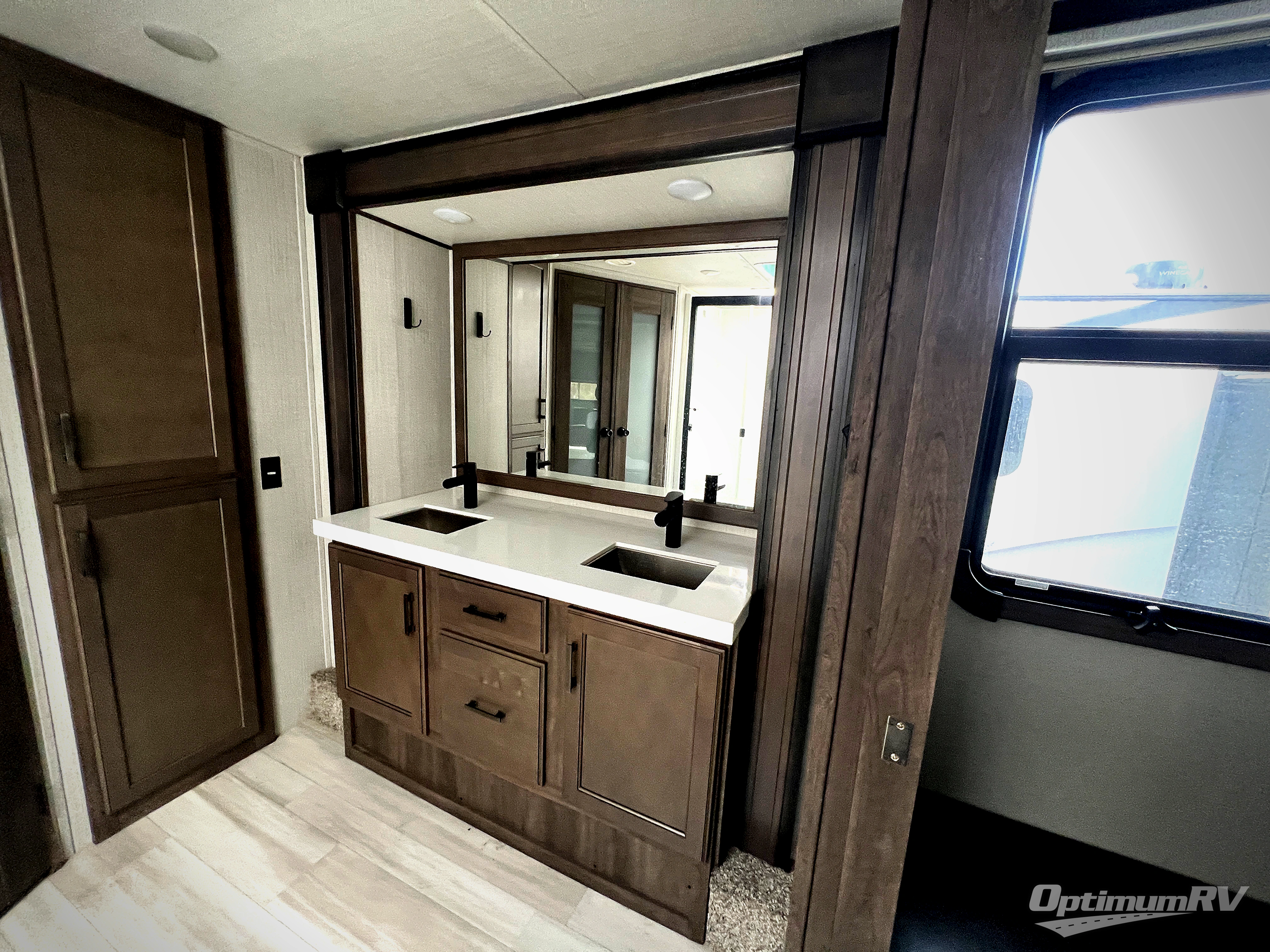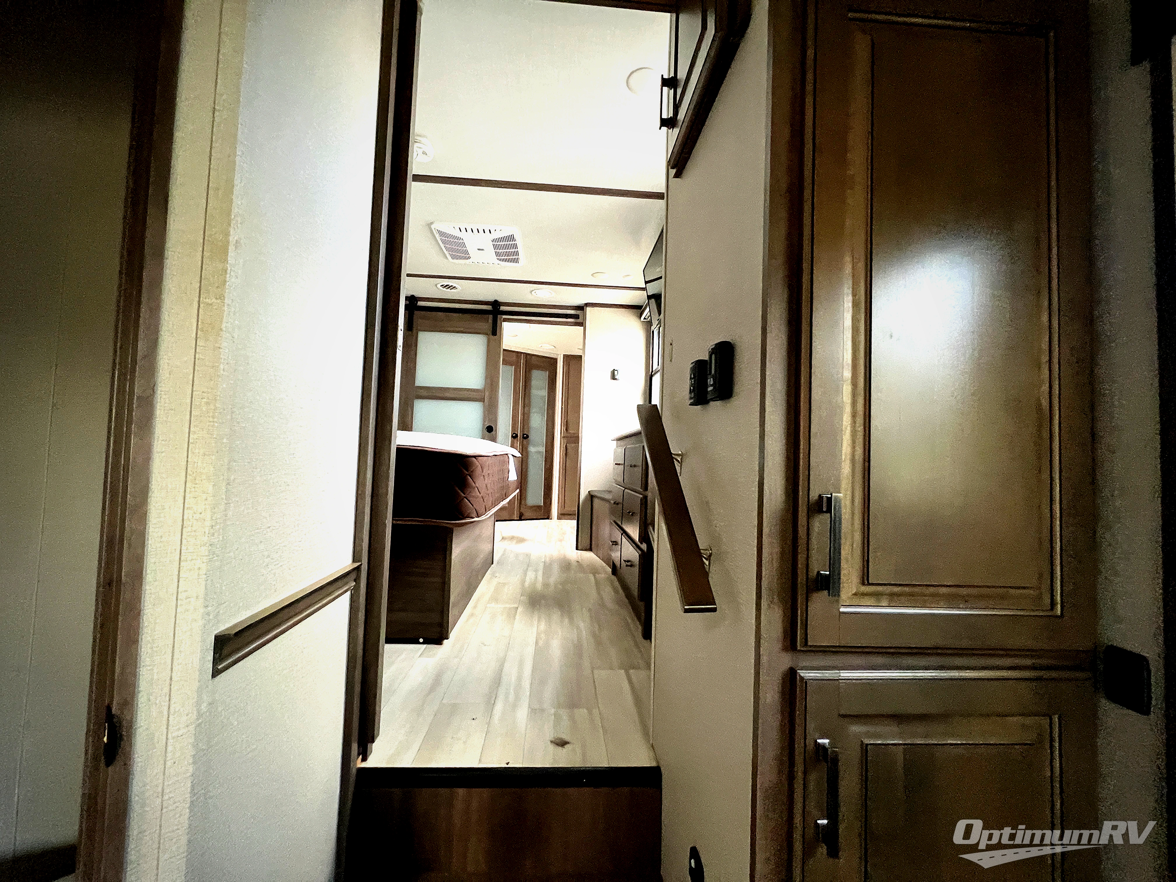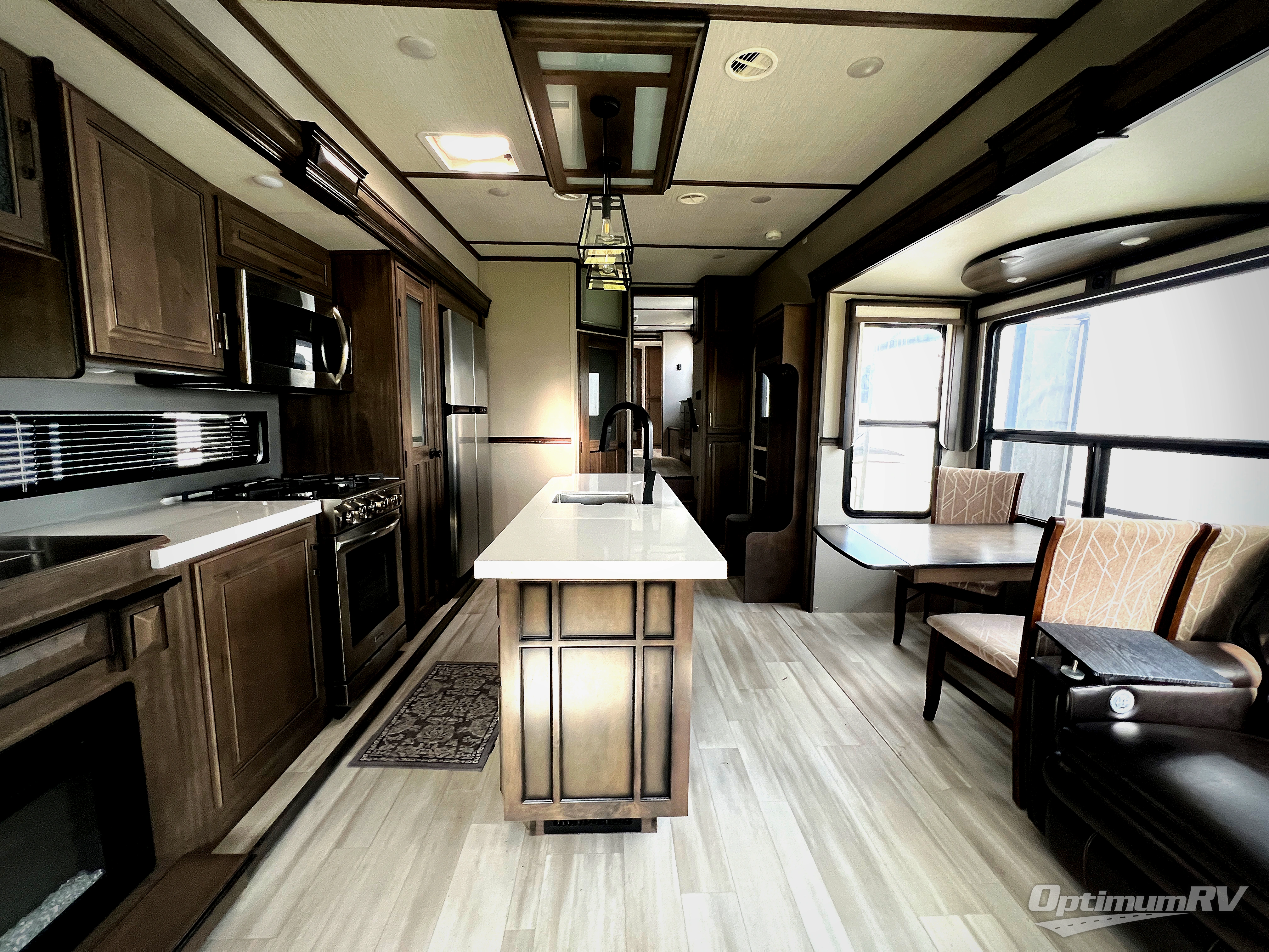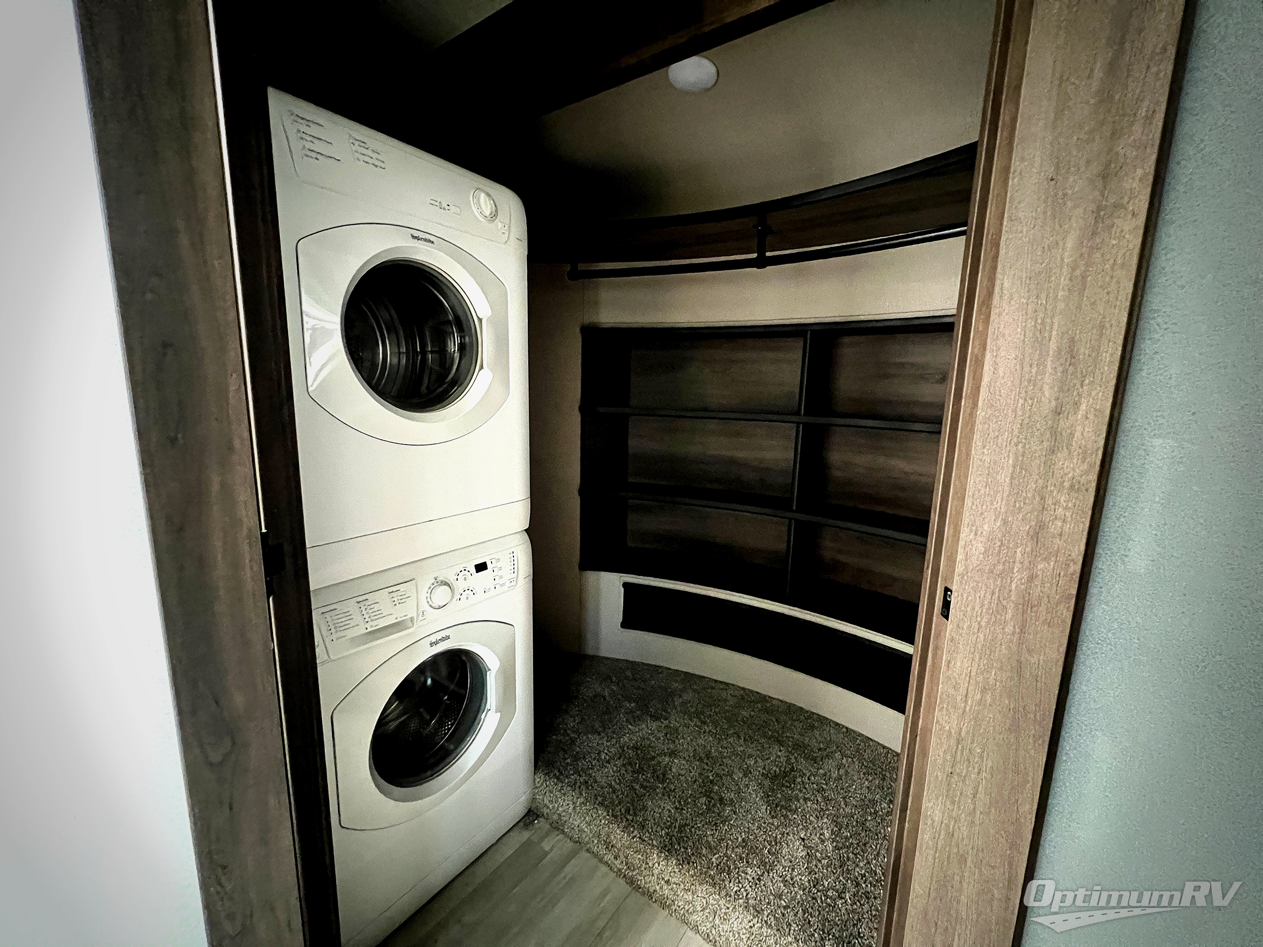 Whether you enjoy living in this fifth wheel or camping with family and friends at local state parks, you will love all the space and luxury found throughout! From the main living and kitchen area with dual opposing slides and a half bath for guests to the master suite with a large front bathroom which includes a shower with a seat, dual-sink vanity, and a large walk-in closet. You might decide to add the washer/dryer option in the prepped space in the closet, and you will love all the storage for your hanging clothes and such. The bedroom offers a queen bed slide or choose the king option, two bench seats that are convenient when putting on your shoes, a flip-top dresser and an LED TV. You will find storage throughout including under the interior steps, and in the oversized kitchen pantry plus the overhead cabinets as well as along the exterior for your outdoor gear. And the kitchen offers a professional-grade stainless steel cooktop, a built-in oven, and a microwave to make warm meals and much more!