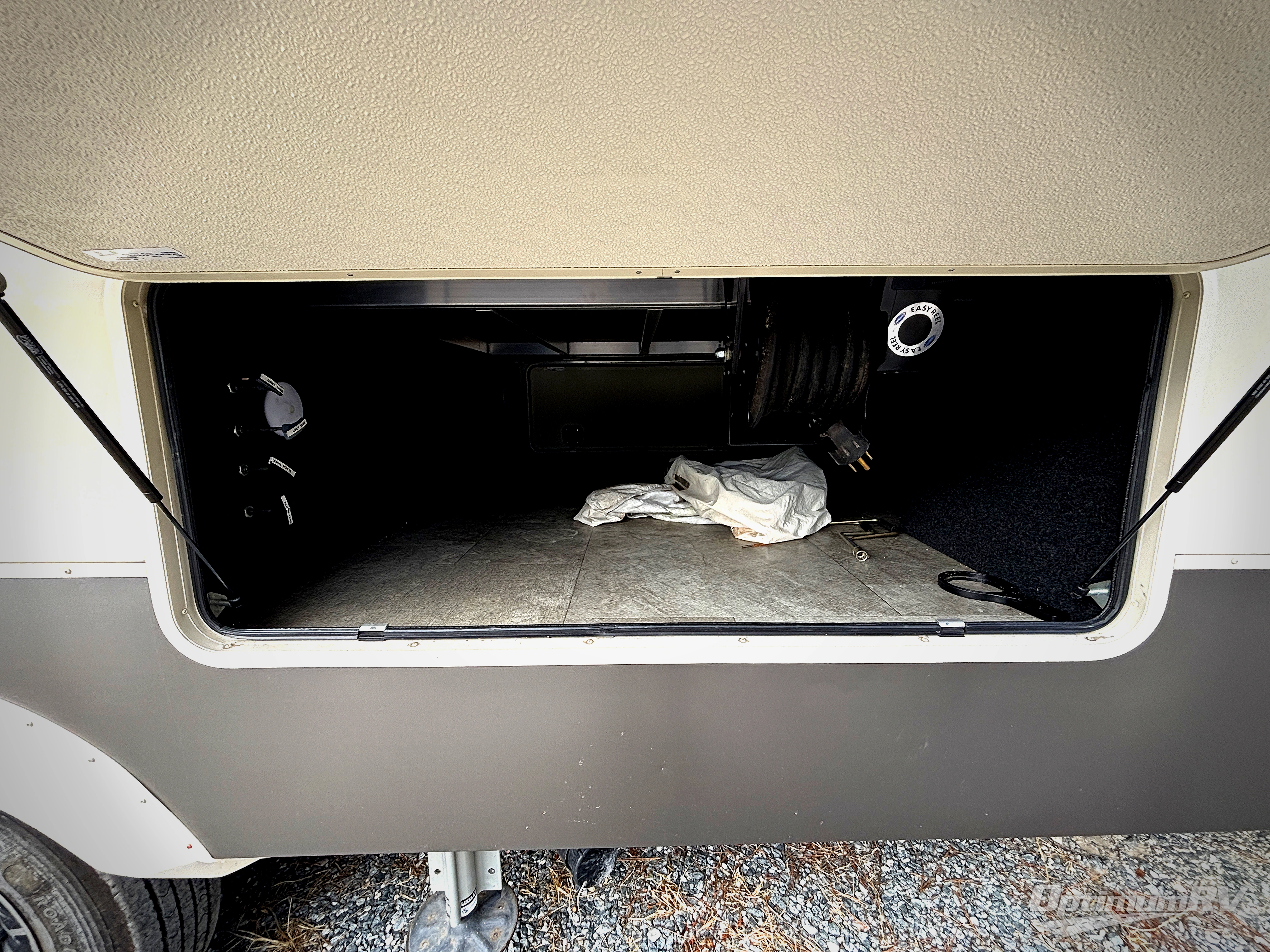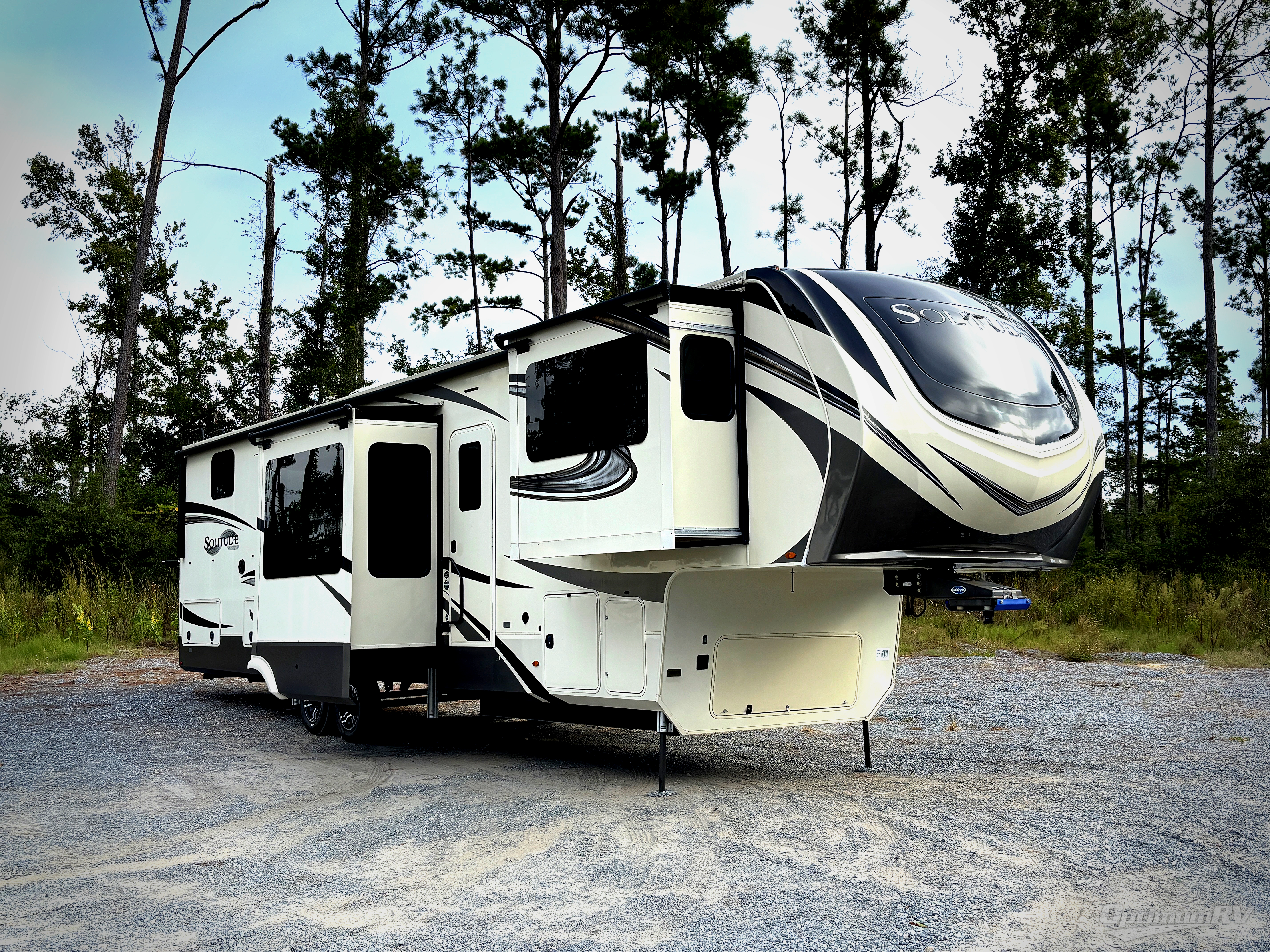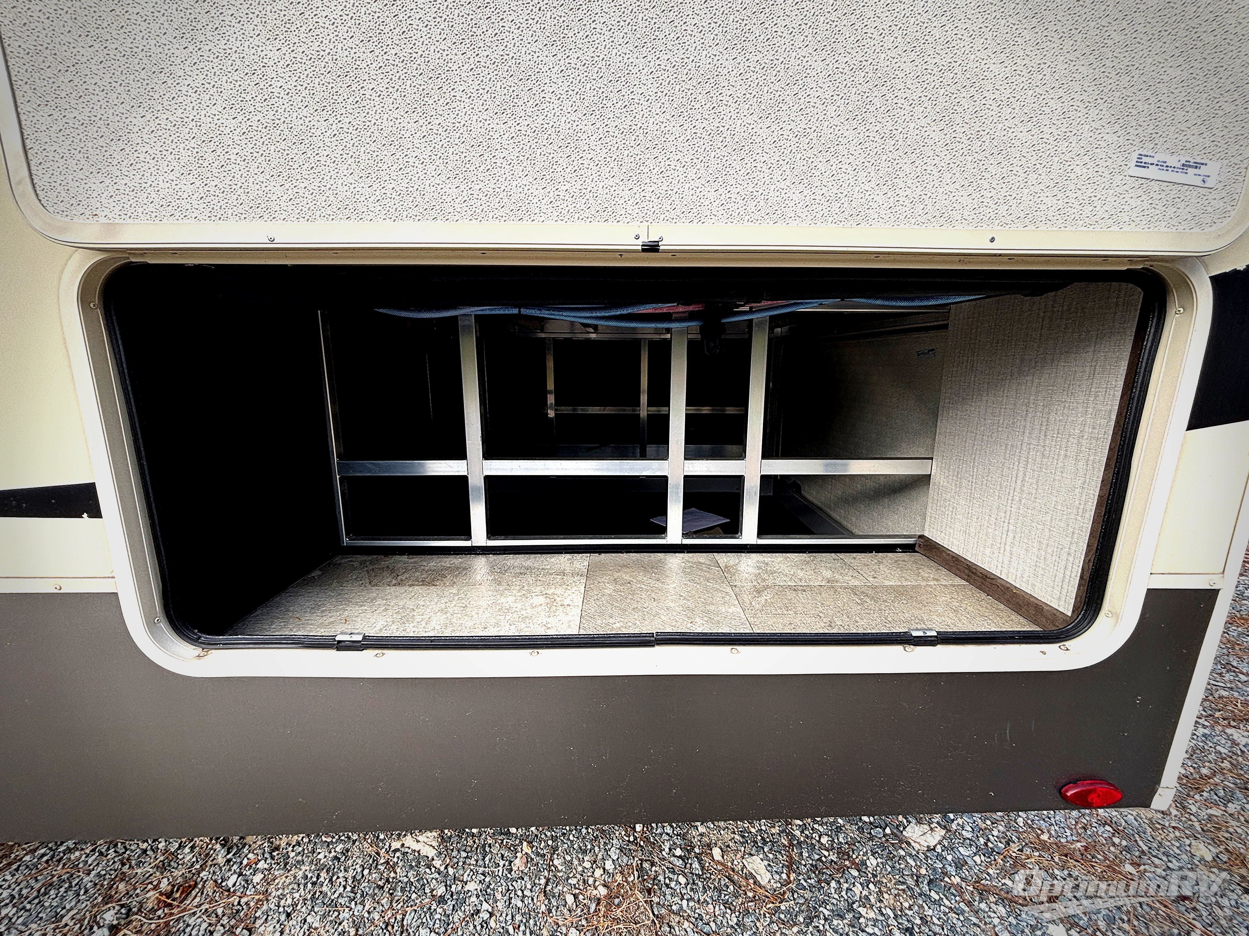 If you decide to be a full-timer or take long trips in this fifth wheel, you will appreciate all the floor space thanks to the five slide outs found throughout! The cook will love their dream kitchen which is separate from the main living area and includes a center island, a hutch with more counter space, plus full amenities including a residential refrigerator and a free-standing dinette. And there is a half bath for convenience for all. You can head up front to enjoy the entertainment center, the LED TV and the fireplace, plus the dual opposing tri-fold sofas and theater seats. The kids or grandkids can sleep here while you enjoy your own master suite with a queen-bed slide and wardrobes plus an LED TV and easy access through the sliding door to the large full bathroom with dual sinks, one for you and one for your spouse. You might even decide to add a few options such as a washer/dryer and/or king-size bed. Outside, there is a pass-through storage compartment and a rear storage with a sliding tray to make getting to your gear easy.