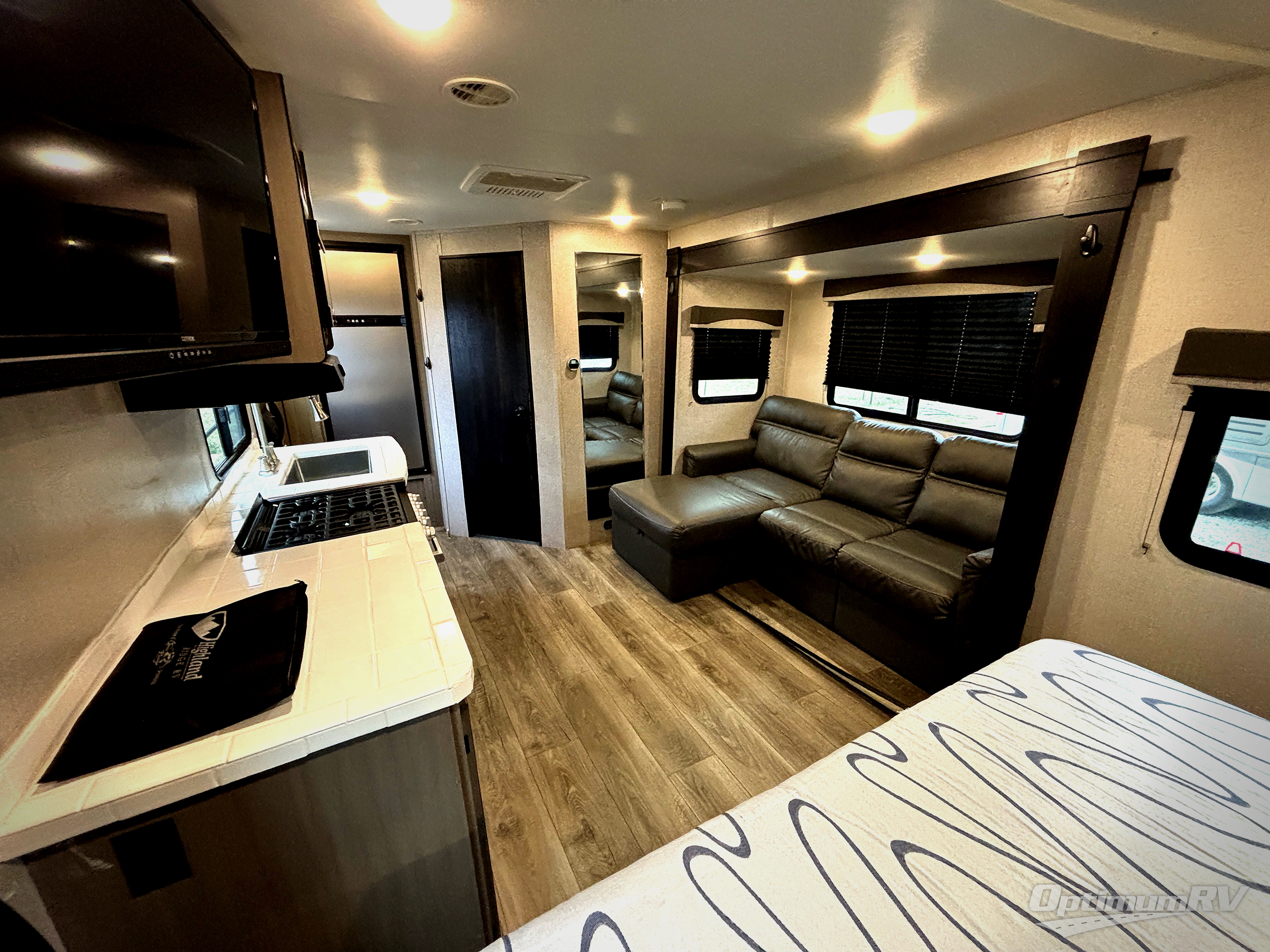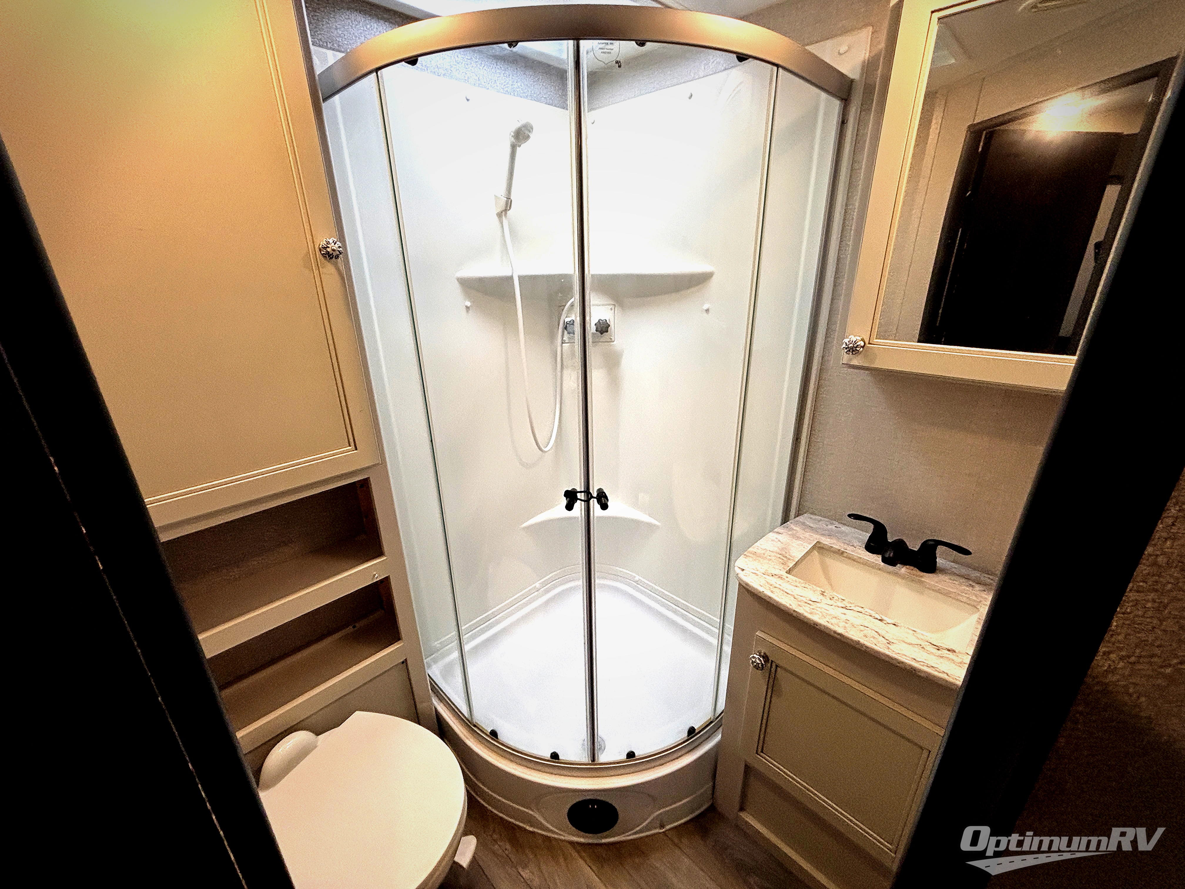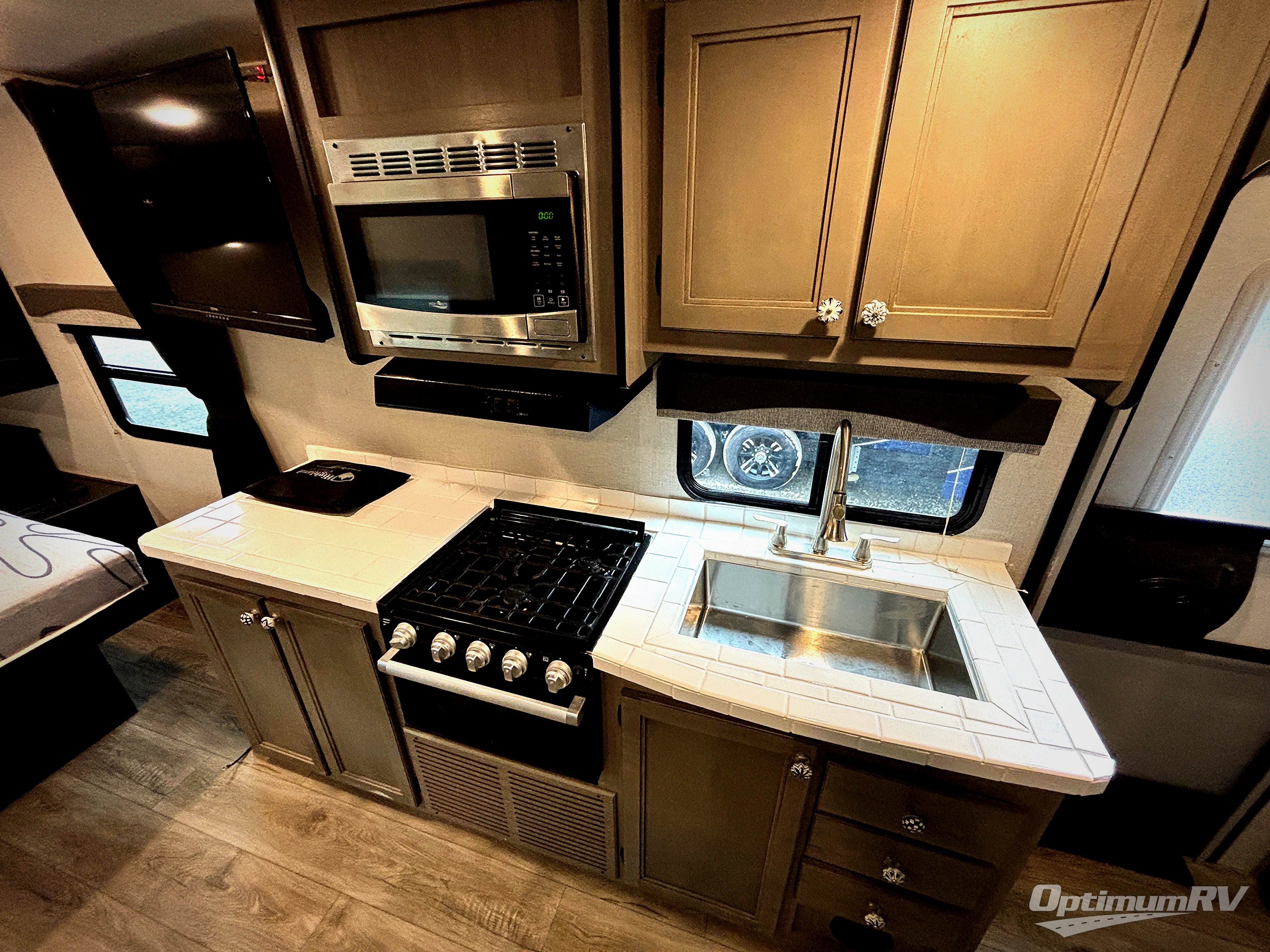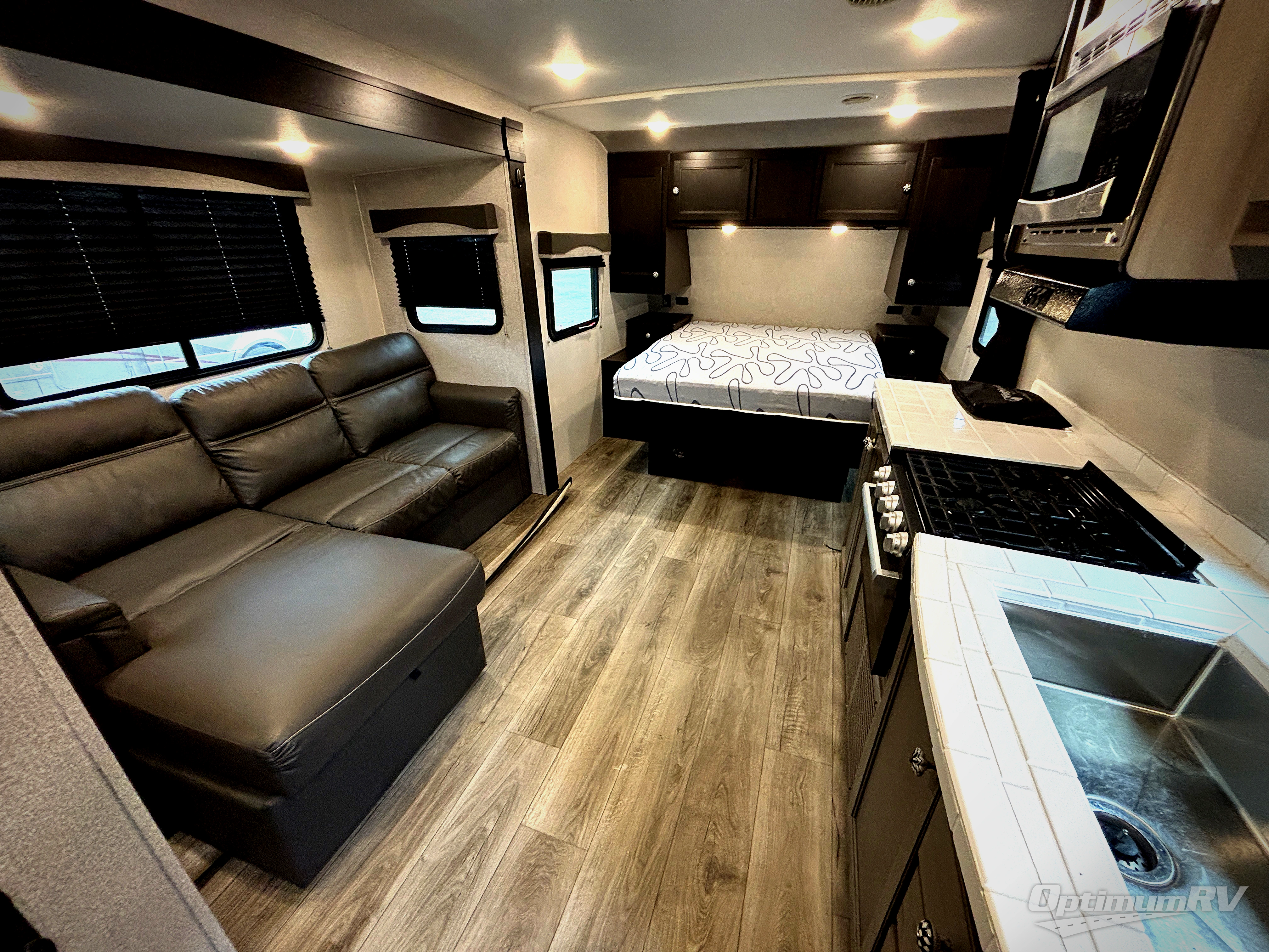 This is the perfect trailer for you and your spouse on weekend excursions. If you have any guests, they can sleep on the slide out L-shaped sofa while you enjoy the queen bed in the front bedroom. You will find dual nightstands and dual closets on either side of the bed, plus there is a laundry chute that goes straight to the pass-through storage, making wash day easier than ever! The kitchen allows you to cook meals just like you do at home, and the sink covers will provide more counter space when prepping fresh vegetables. This model includes an 8 cu. ft. refrigerator for your perishables, a pantry for dry goods and snacks, plus plenty of overhead cabinets for your belongings.