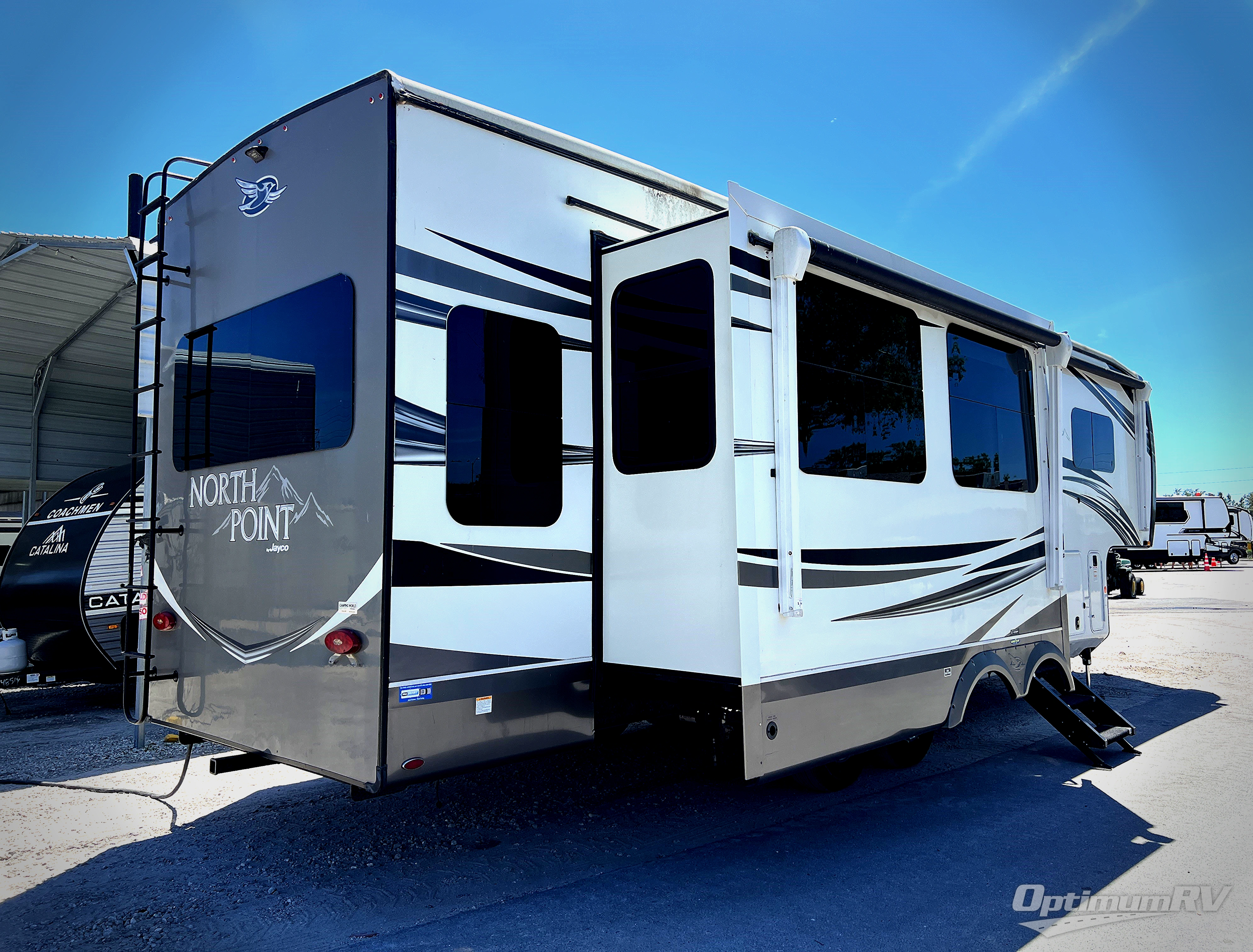 These Jayco North Point fifth wheels offer sleeping spaces and luxurious features to accommodate all types and sizes of groups! You will have generations of family fun with construction features like the Stronghold VBL™ aluminum framed, vacuum bond laminated walls and a Magnum Truss™ XL6™ roof system with a one-piece, seamless DiFlex II material which is the strongest tested roof in the industry. There are three mandatory packages to make your traveling experience even better. One of the packages is a five star handling package which includes Dexter axles with Nev-R-Adjust brakes, Dexter heavy-duty shackles with wet bolt fasteners and bronze bushings to resist the wear and tear of towing, Goodyear beast tires, a MORryde rubberized suspension system, and a MORryde pin box so you can travel forward, backward, and side-to-side for a smoother tow. Come choose your favorite model today!