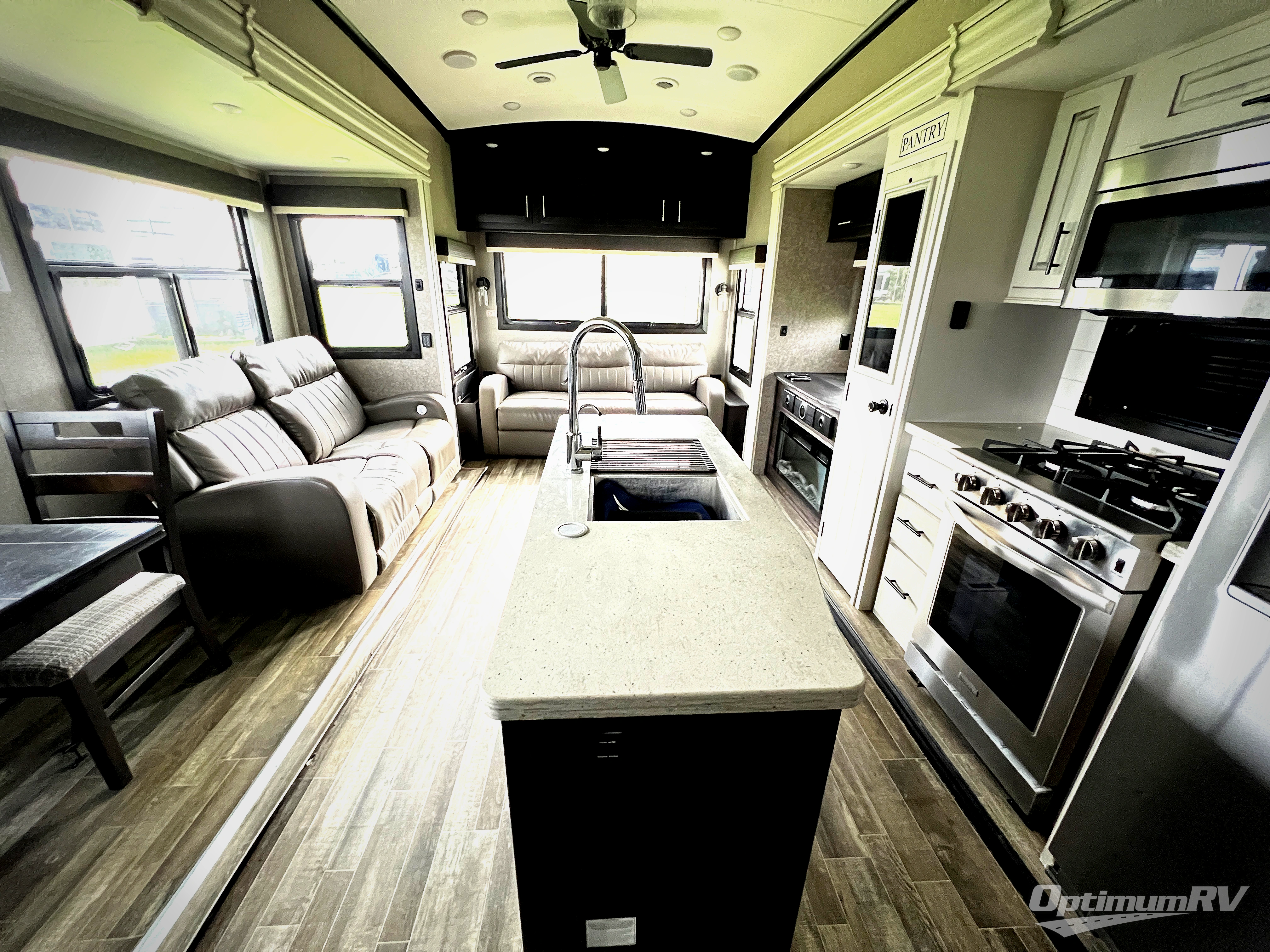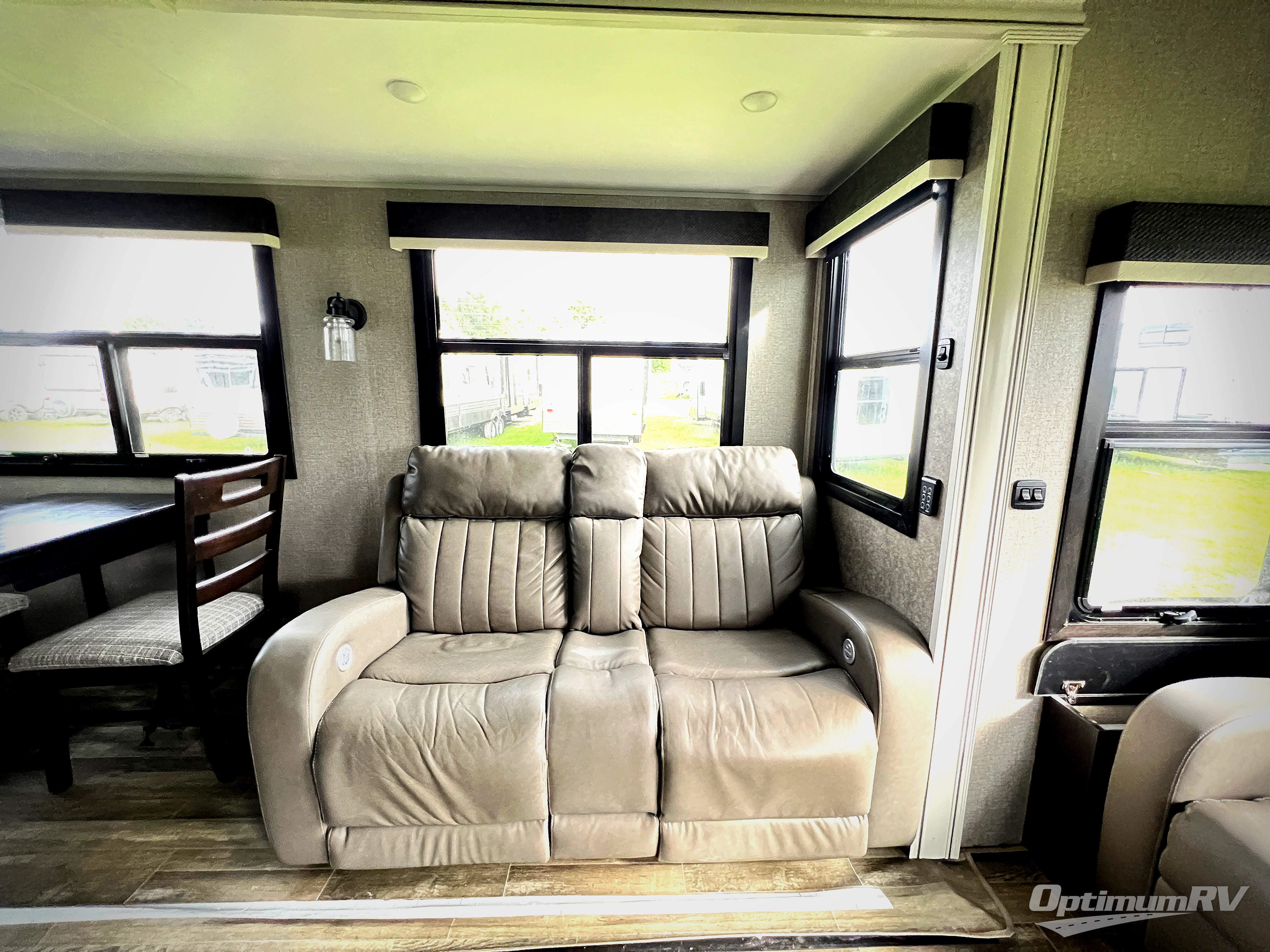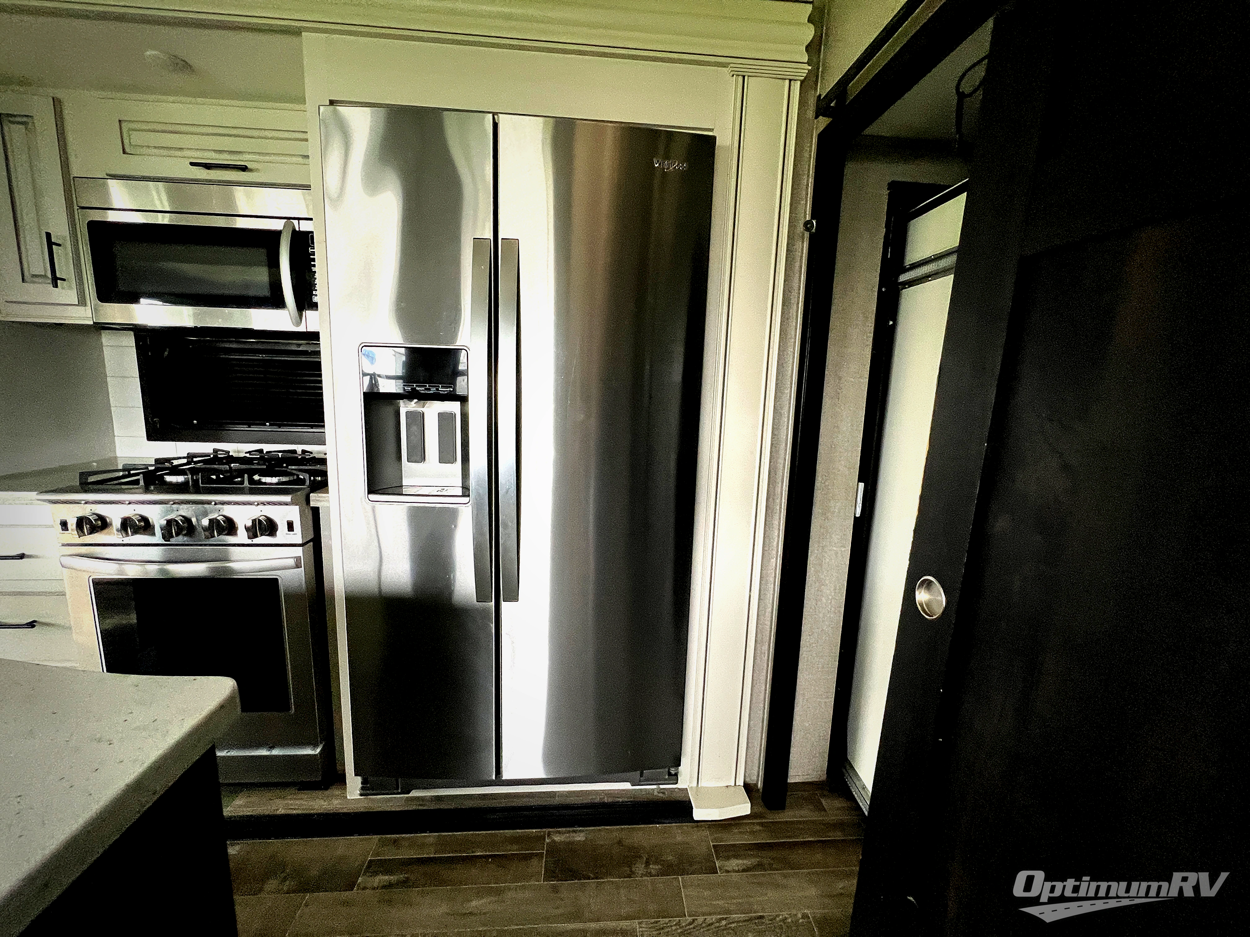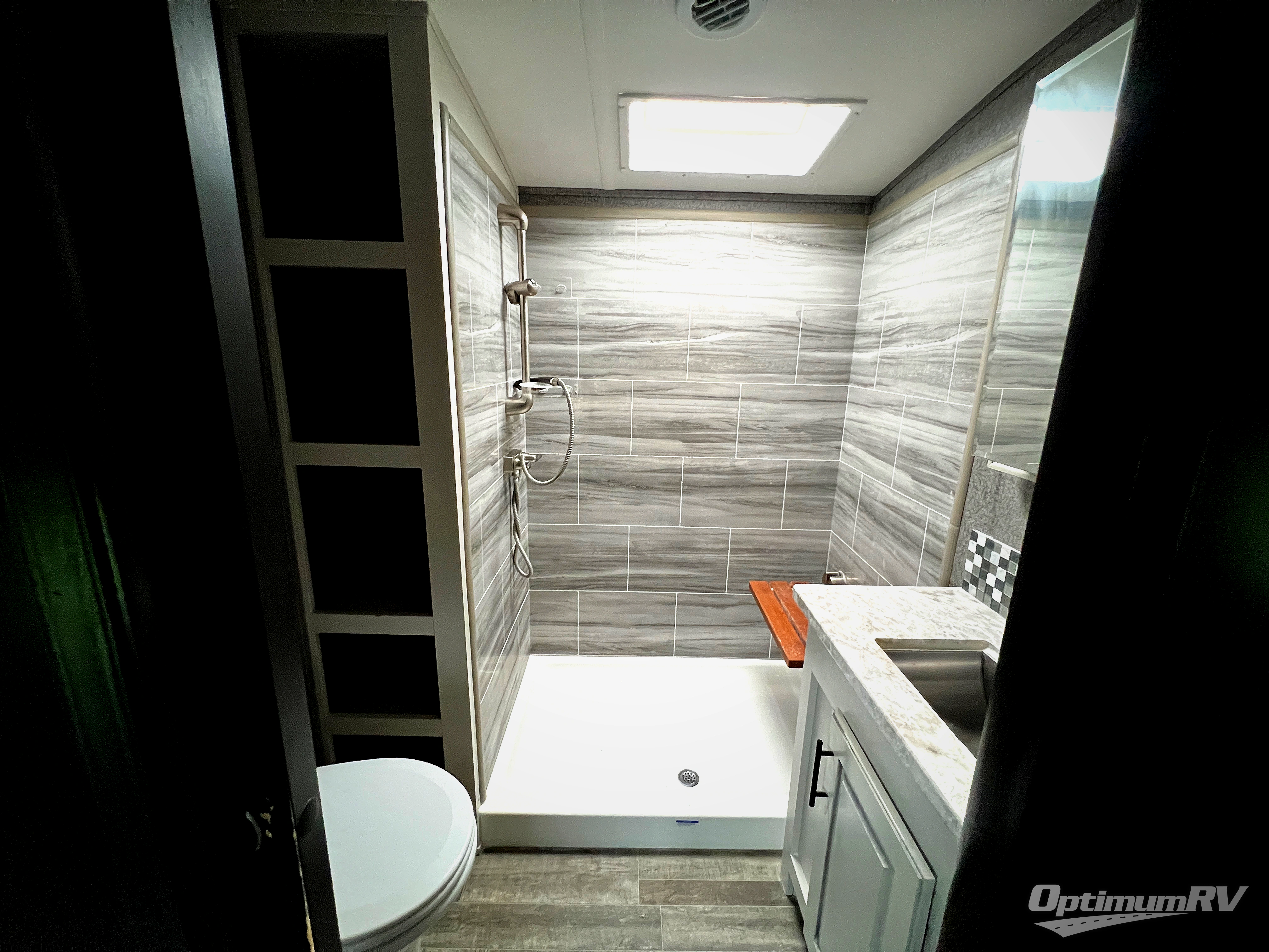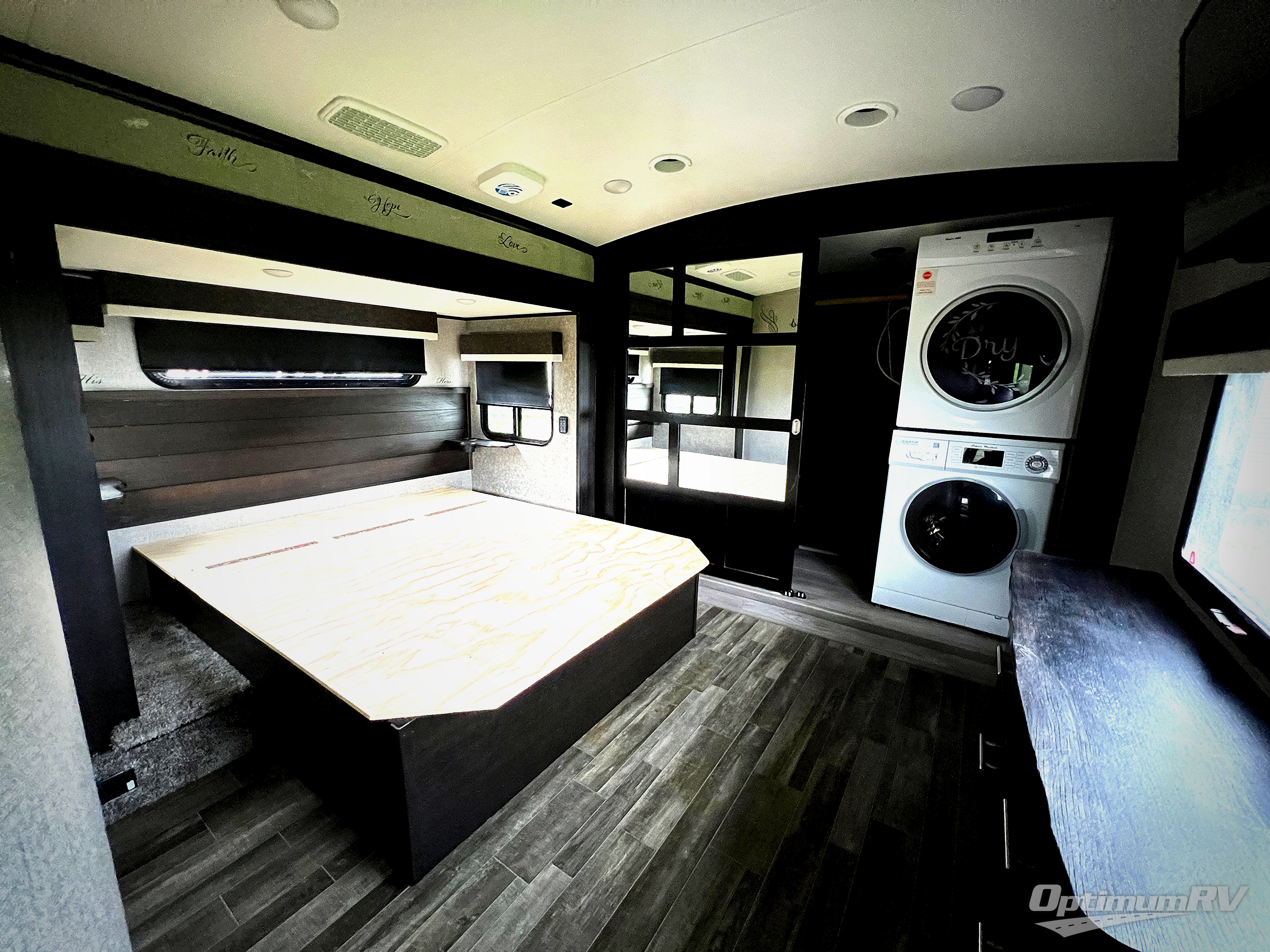 You can bring the whole family with two bedrooms in this fifth wheel! The front private bedroom features a queen bed, a front wall walk-in closet with a hamper and a space prepped to add the optional washer and dryer, and a flip-up dresser with a 32" TV. The second room can be used as a den, an office or a guest room with an overhead loft above a flip-up bunk that has a tri-fold sofa below it, and a desk with a TV. The kitchen is decked out in at-home features like the kitchen island with a double sink and prepped for the optional dishwasher, the large pantry, and a 21 cu. ft. refrigerator to keep your perishables fresh. You can wind down each night by relaxing in the rear living area on either the tri-fold hide-a-bed sofa with flip top side tables to set your drink on or the theater seat which are directly across from the fireplace with a TV on a lift. You can even choose to add the optional tailgate TV next to the outside kitchen with a 17' electric awning with LED lights to keep you protected!