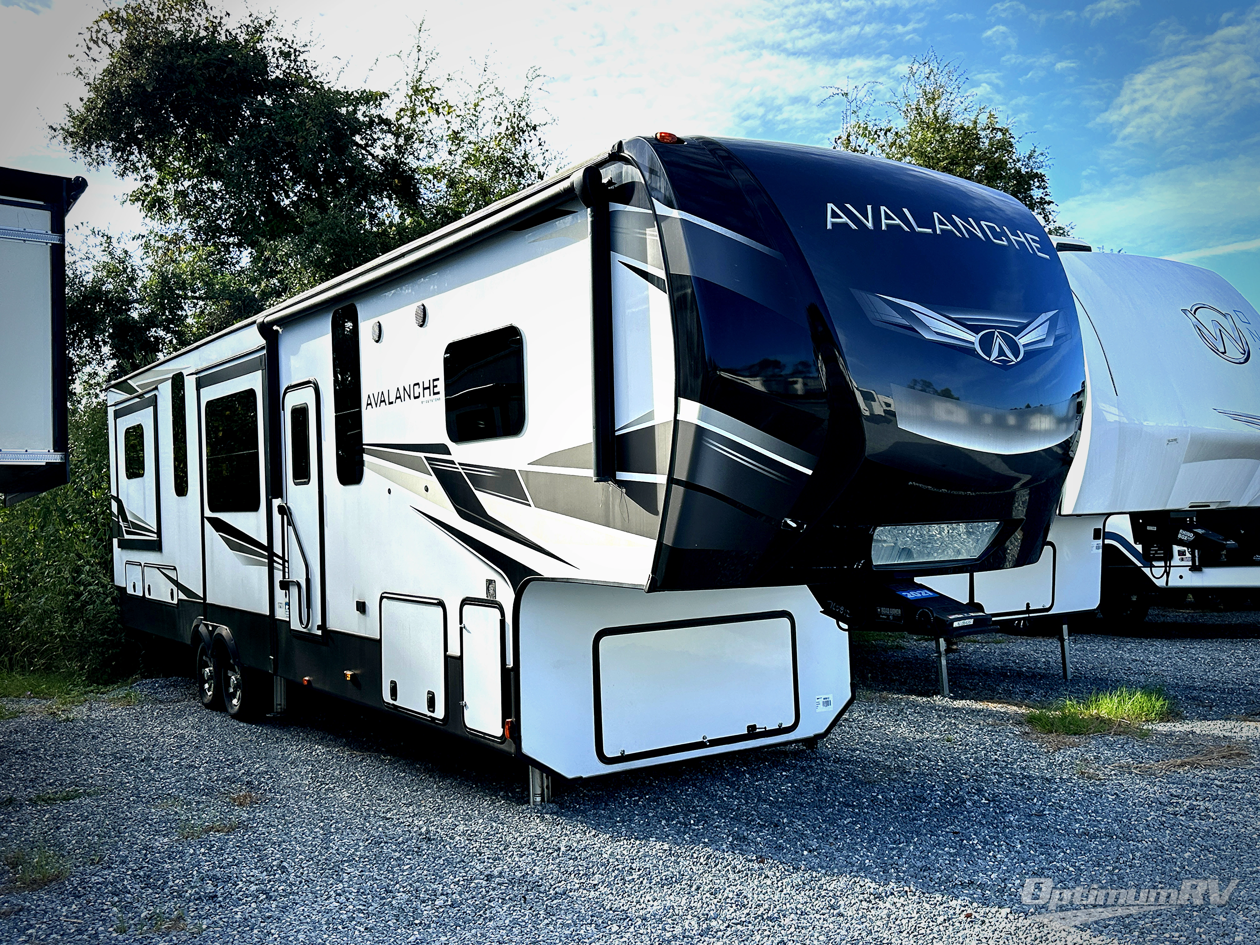 If you have been thinking about going full-time in an RV, this Keystone Avalanche fifth wheel will be just what you need. The rear living room offers you a "man cave" or a place to sleep for your overnight guests with the opposing tri-fold sofa sleeper slides. As you talk about your plans, some may cozy up with a good book in front of the warm fireplace on the theater seating with heat and massage capabilities. The kitchen is centrally located and stocked with all the amenities needed to conjure up delicious meals during every adventure, and the buffet top will be helpful as you serve dinner to your guests. When you are ready to retire for the evening, the front master suite provides a comfortable oasis with its king-size bed and master closet. You might like to add a washer/dryer option and/or a residential refrigerator option, the choice is yours.