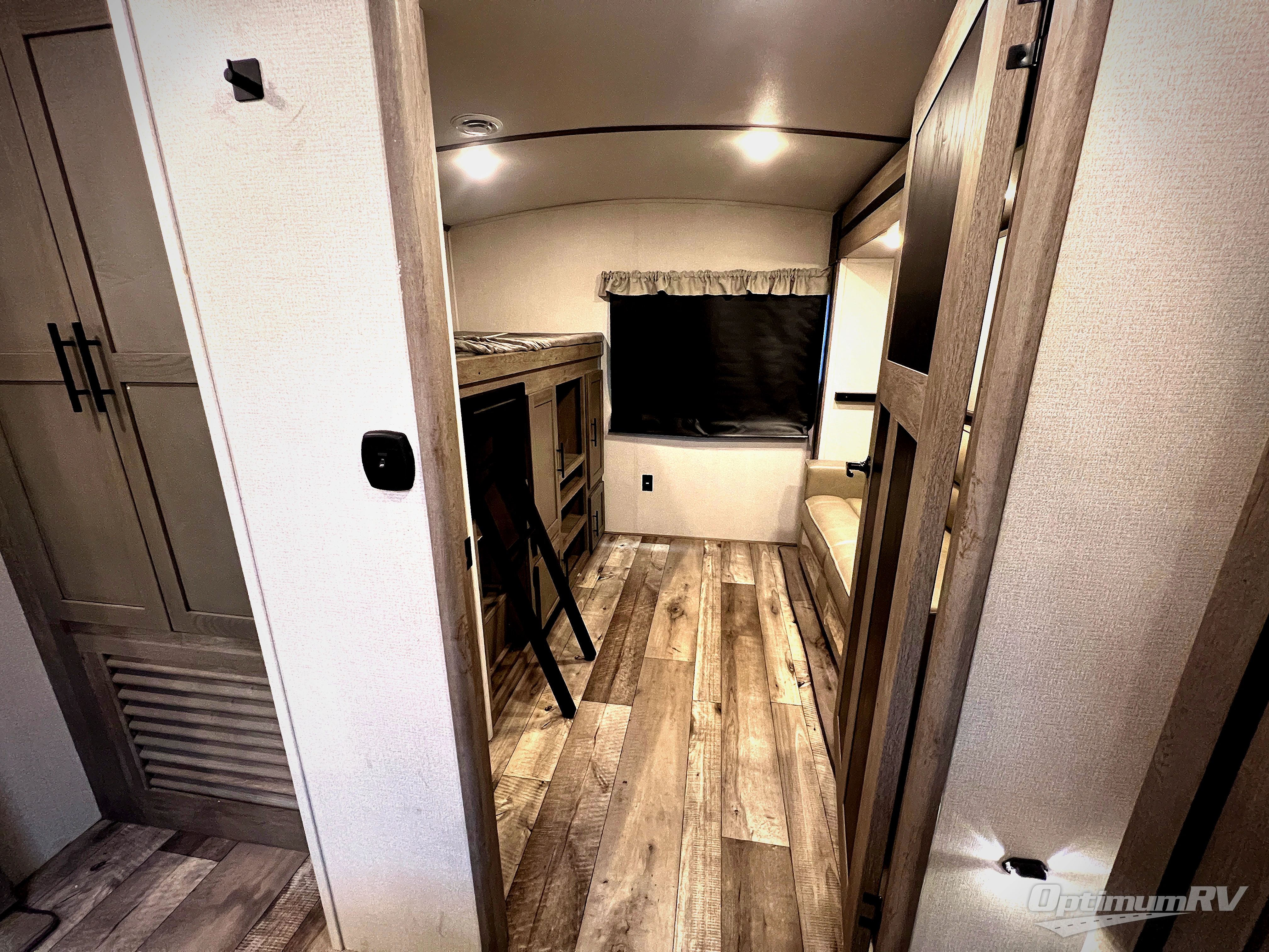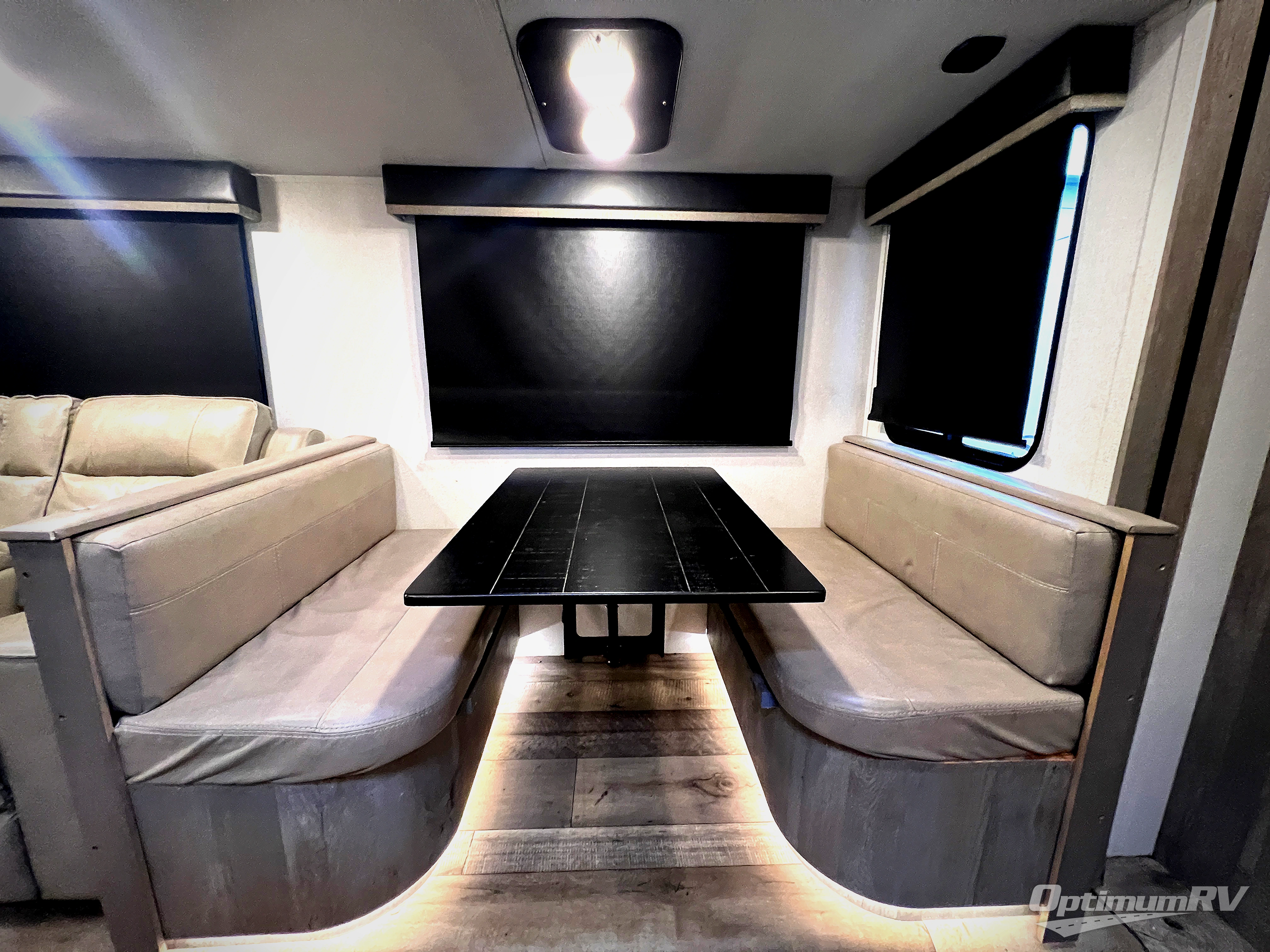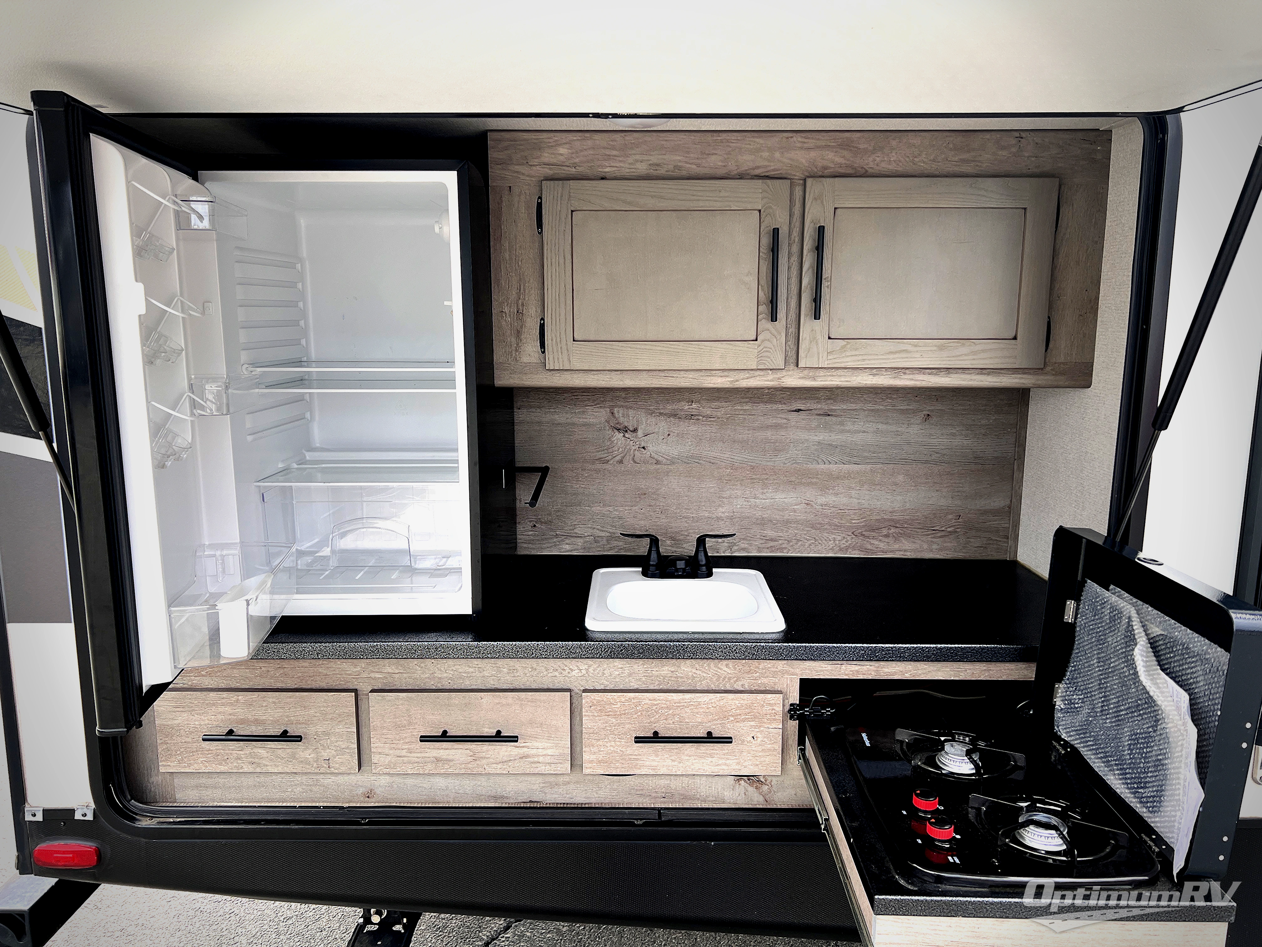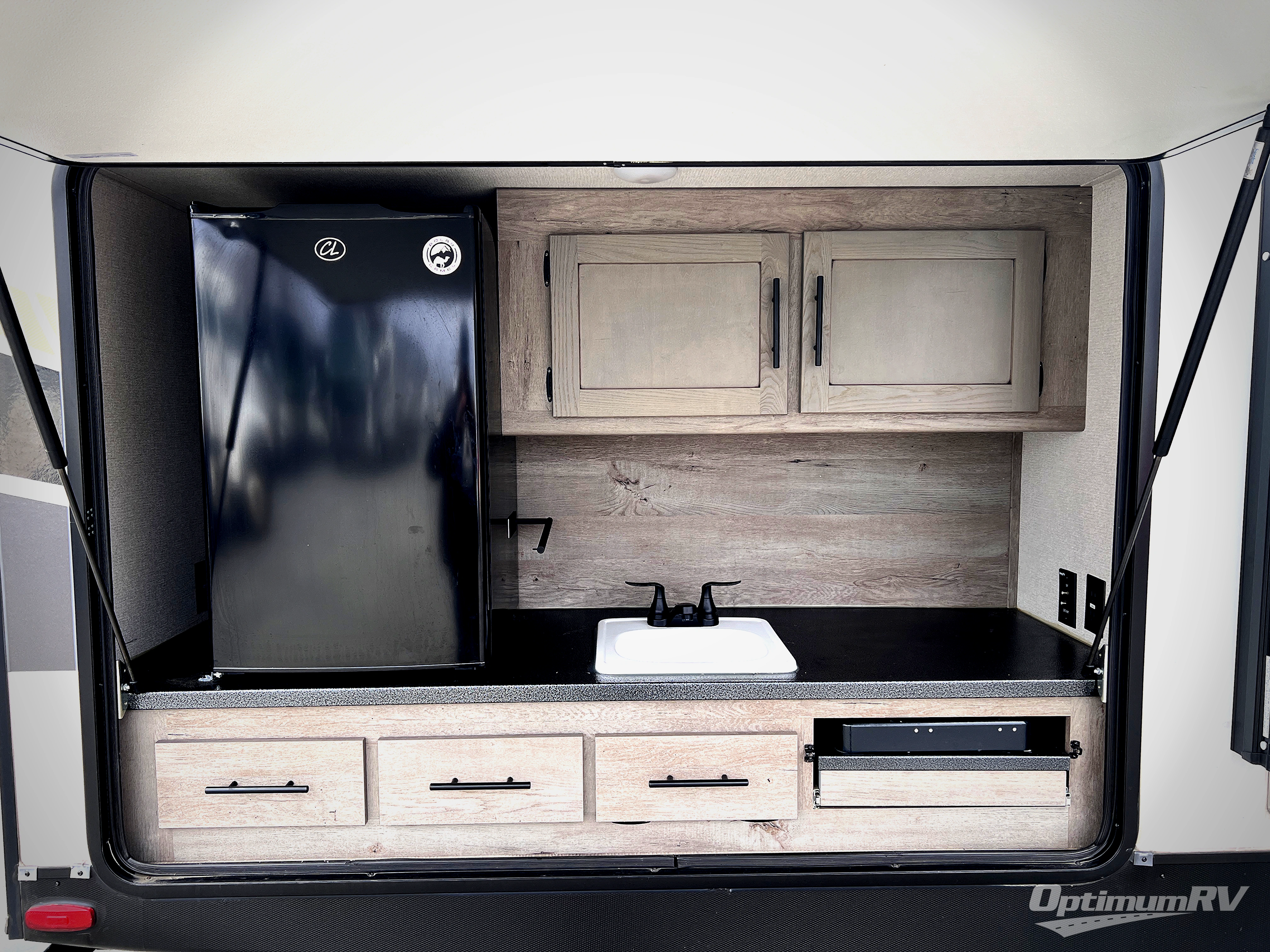 With any Keystone Outback travel trailer and toy hauler you will enjoy a lighter wallboard and white countertops for the modern farmhouse feel with more refined flooring, furniture, and cabinet hardware. You can extend your camping season thanks to the Astro-foil barrier added to the fully enclosed underbelly with ducted heat, the Coleman-Mach Quiet Series A/C offering a significant reduction of in-cabin sound levels, and an upgraded 10 cu. ft. 12V GE refrigerator to mention a few notables. The Lippert Step Above entry steps, the water docking station, the rear ladder, and the HyperDeck high performance, water-resistant RV floor are a few more reasons you will want to own an Outback for years to come!