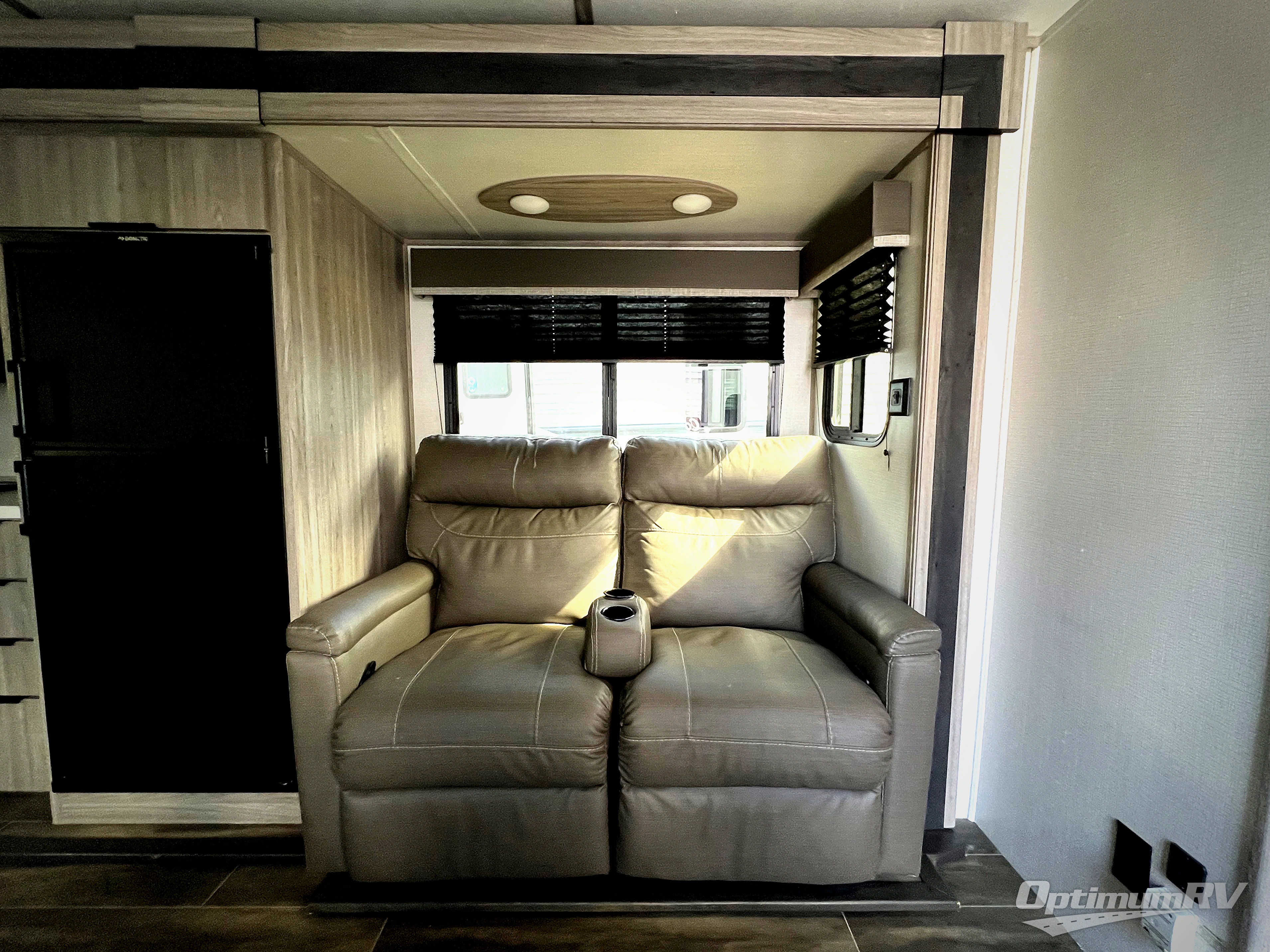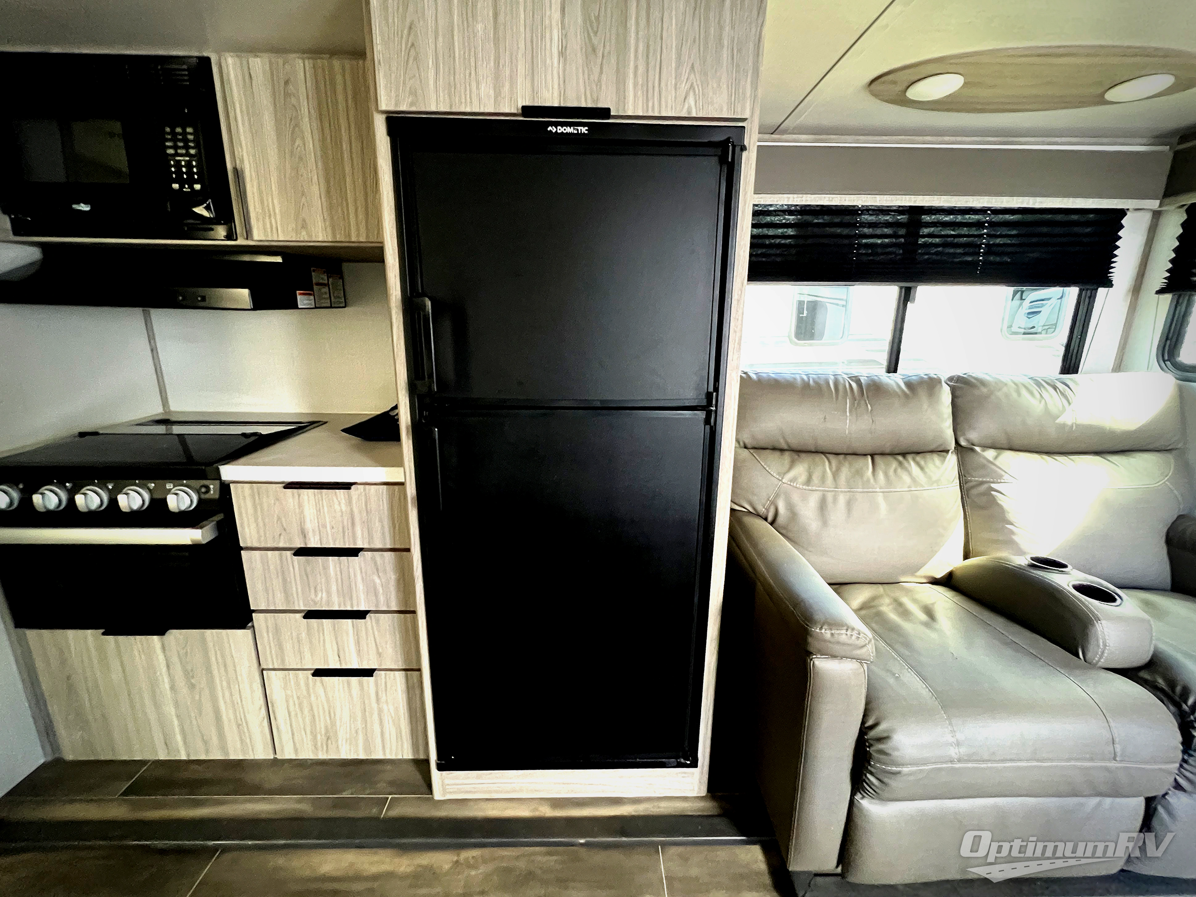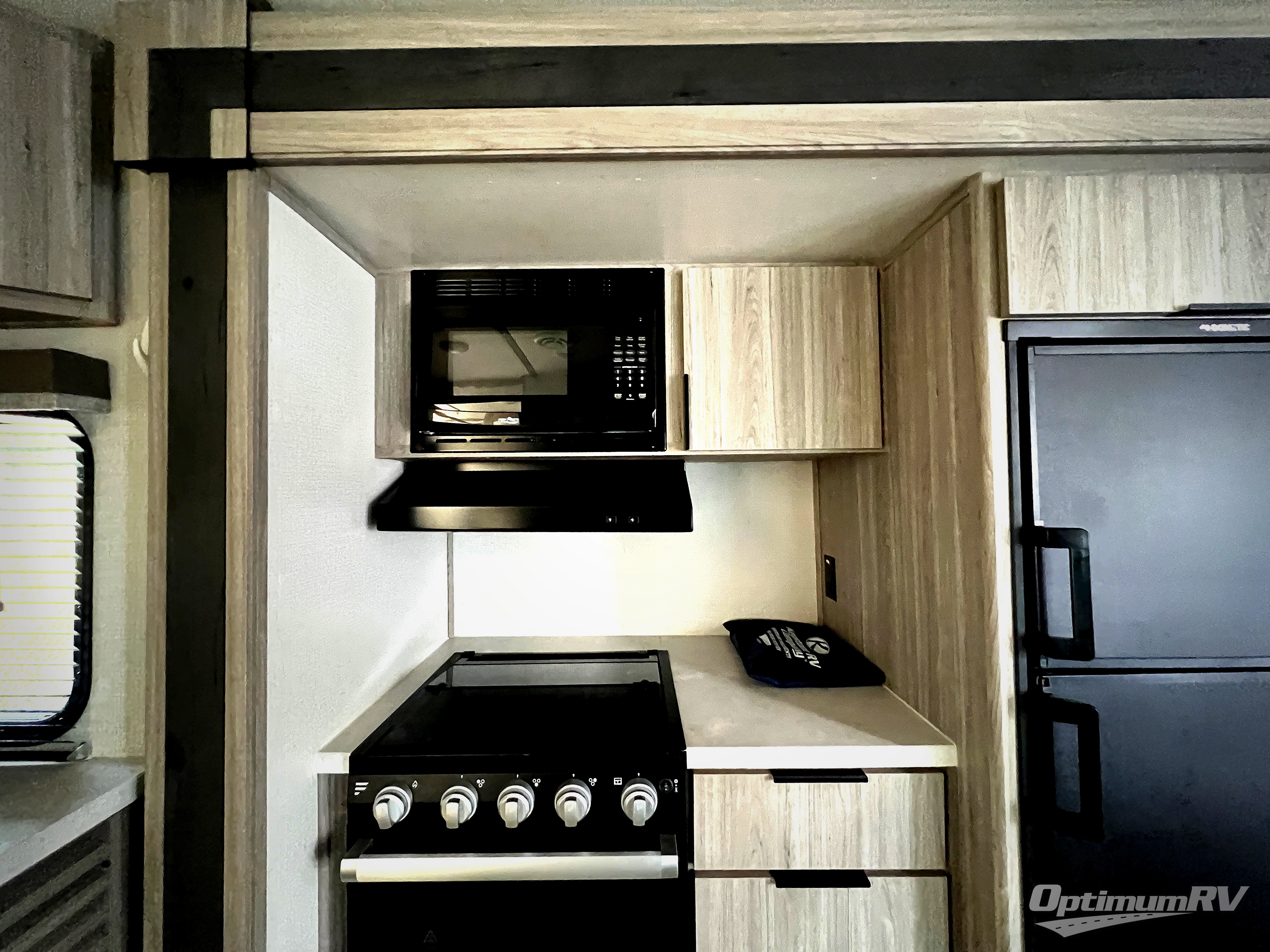 You can take many different kinds of trips with this Passport travel trailer! Once you get to the campsite and set up the 19' awning, you can remove your travel gear from the exterior pass-through storage to create your own little retreat. On the interior, the front private bedroom provides you with a queen-size bed, nightstands, and bedside wardrobes so that you can easily get changed every morning and night. The large slide out in the main living area will add to the amount of living space on the interior without adding to the overall width of the trailer. As the night comes to a close, you can heat up a bag of popcorn in the microwave before sitting down in the theater seating.