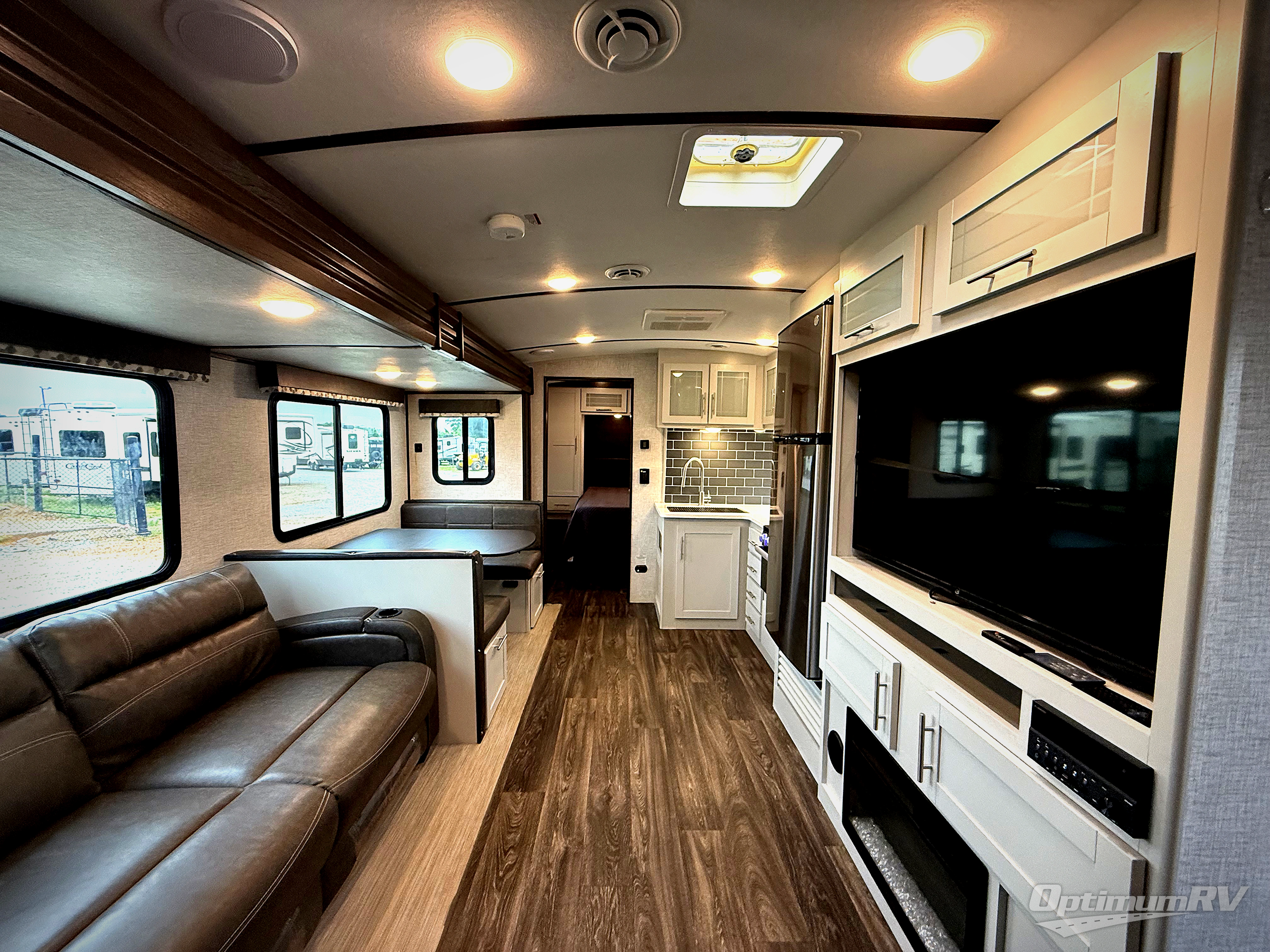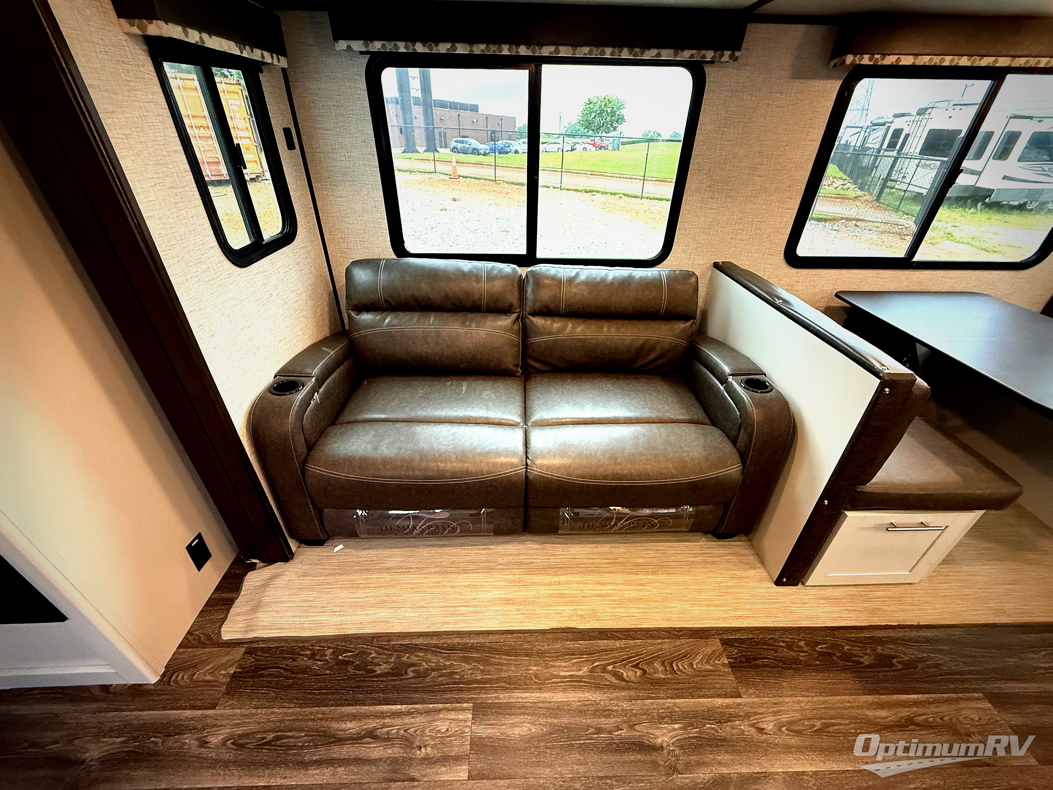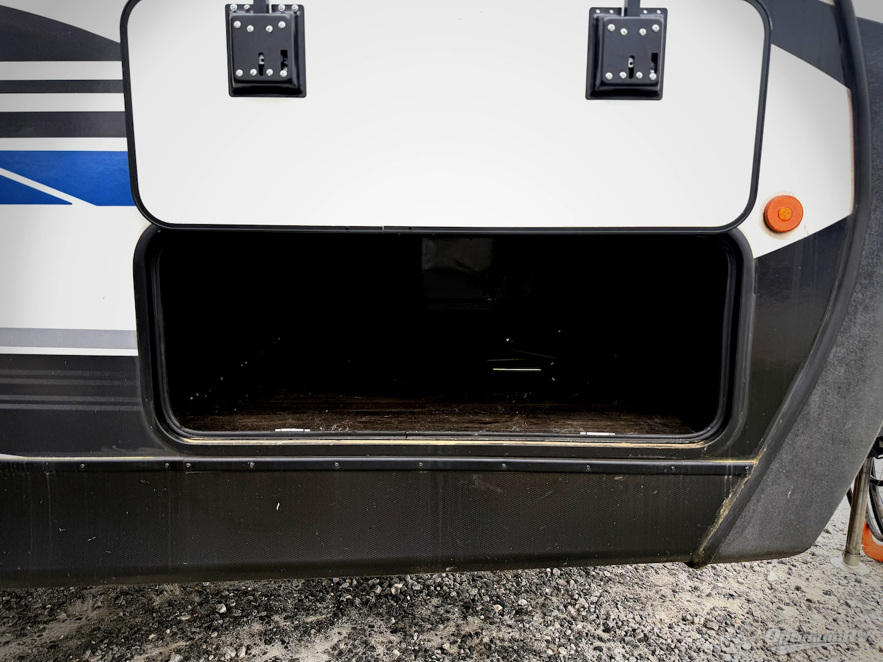 The whole family can go camping in this travel trailer with a set of double bunks! The top flip up bunk adds more storage space in addition to the wardrobe next to the rear corner bathroom, the kitchen pantry, the wardrobes in the front private bedroom, and the exterior pass-through storage. The private bedroom also has a laundry chute next to the queen bed. At night you can pop a bag of popcorn in the Furrion microwave and then play games at the Dream Dinette or relax on the 68" tri-fold sofa which could be switched out for the optional luxury cinema recliners. There is even dual entry doors and an outdoor kitchen with a mini refrigerator!