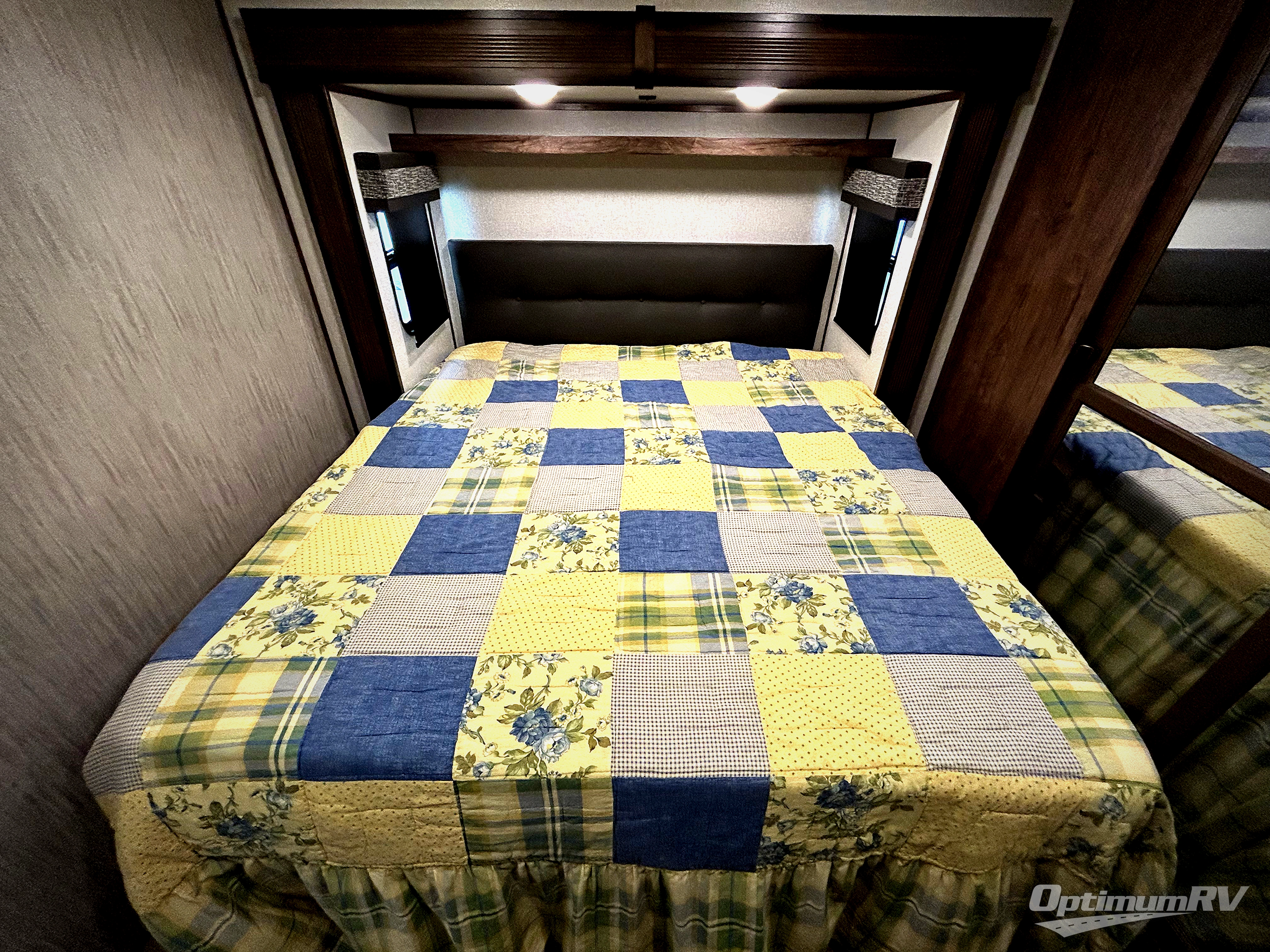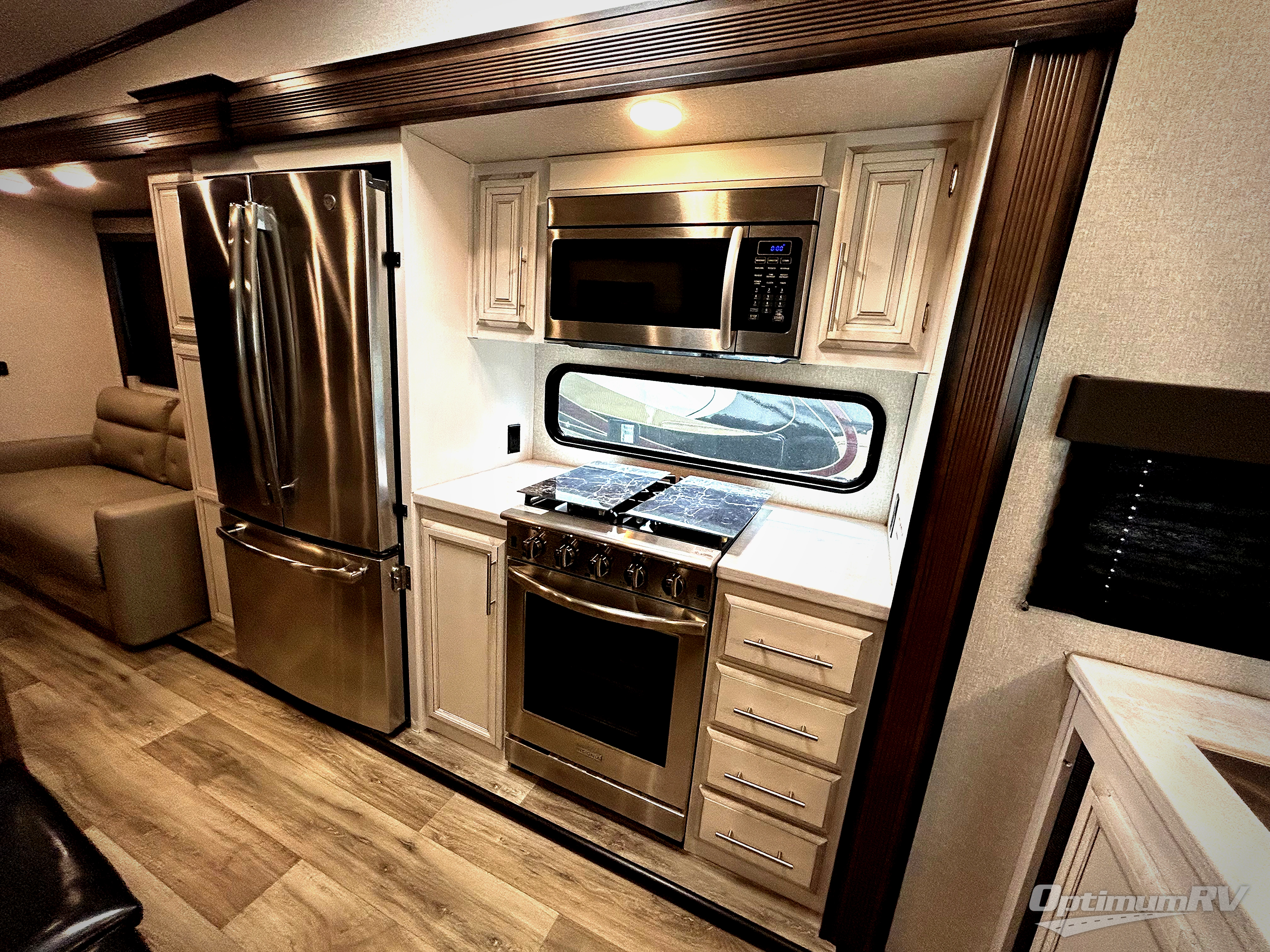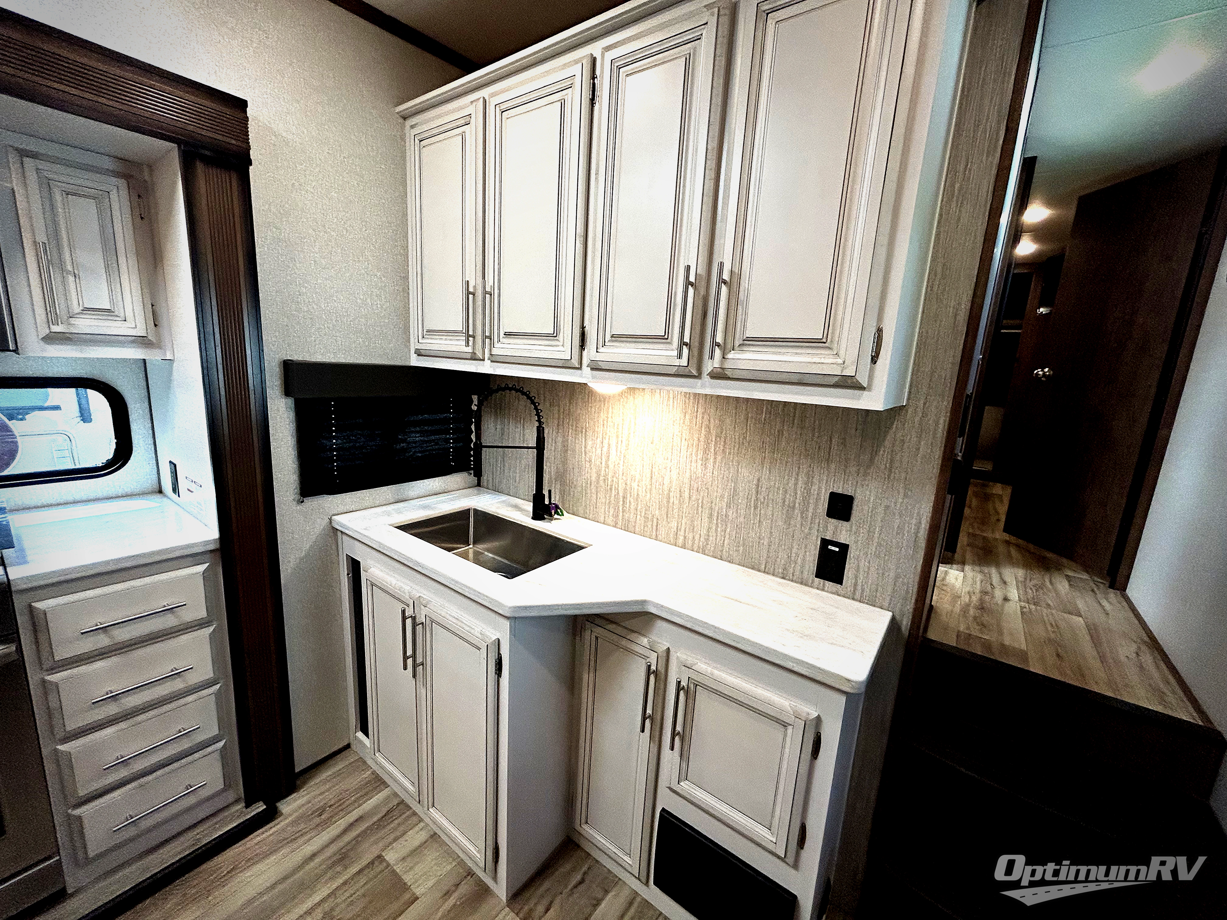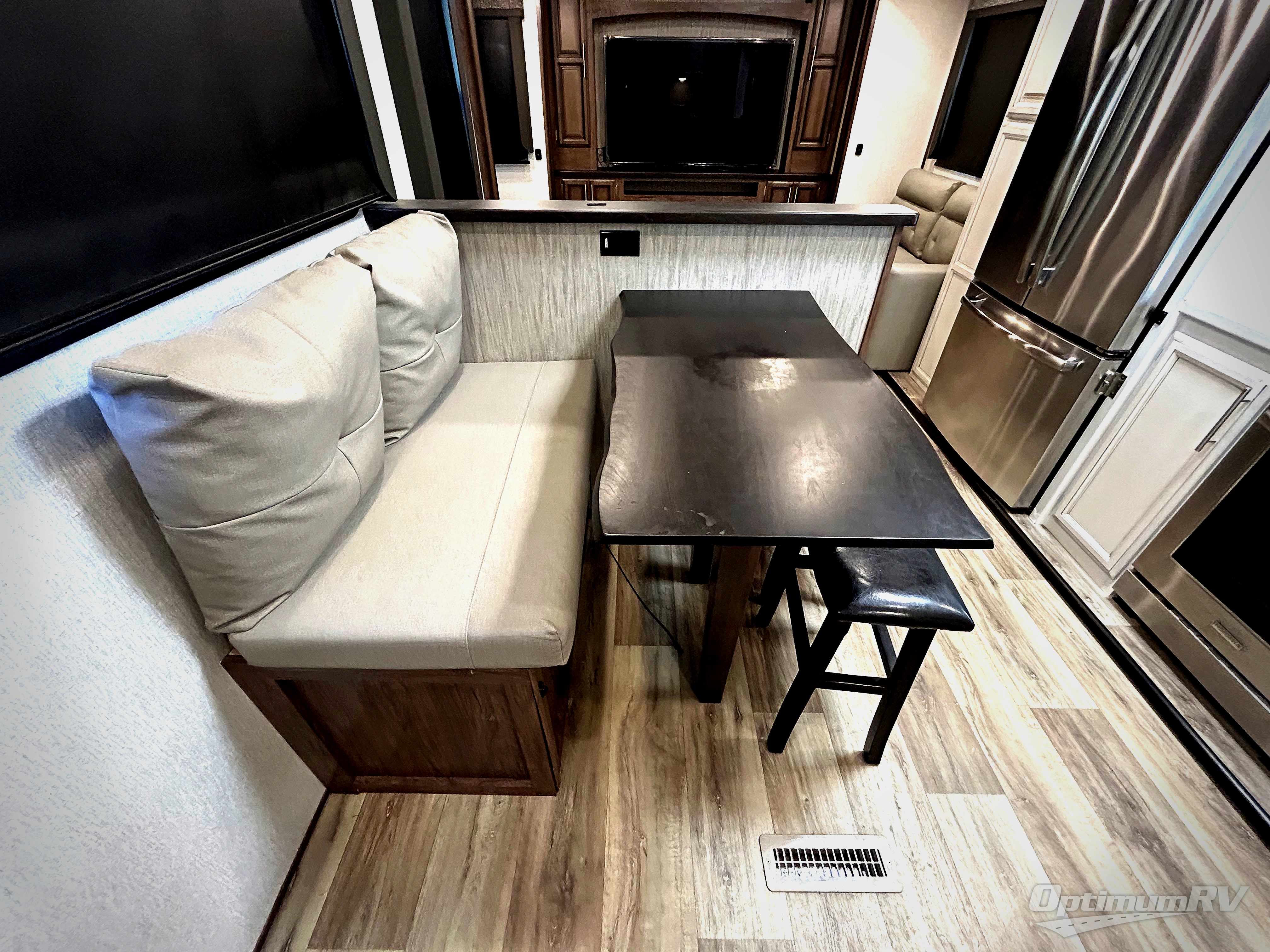 Whether you are a couple or a family this fifth wheel will provide everyone their own space to relax including somewhere to sleep at night for four or maybe more if some are willing to sleep on the theater seats or the booth seating. You will have your own king bed slide out giving you more floor space, and a wardrobe for clothing as well as a space to add a washer/dryer option to keep everything clean. There is a dresser as well with a built-in hamper. The full bathroom allows two people to be getting ready at once with dual sinks, and the pocket door gives you more space inside. The separate kitchen area allows the cook to make meals for two or more without interruptions and offers booth seating and two stools at the dinette. And everyone can enjoy the same show in the rear living area with a 65" TV, a cozy fireplace and plenty of seating for everyone.