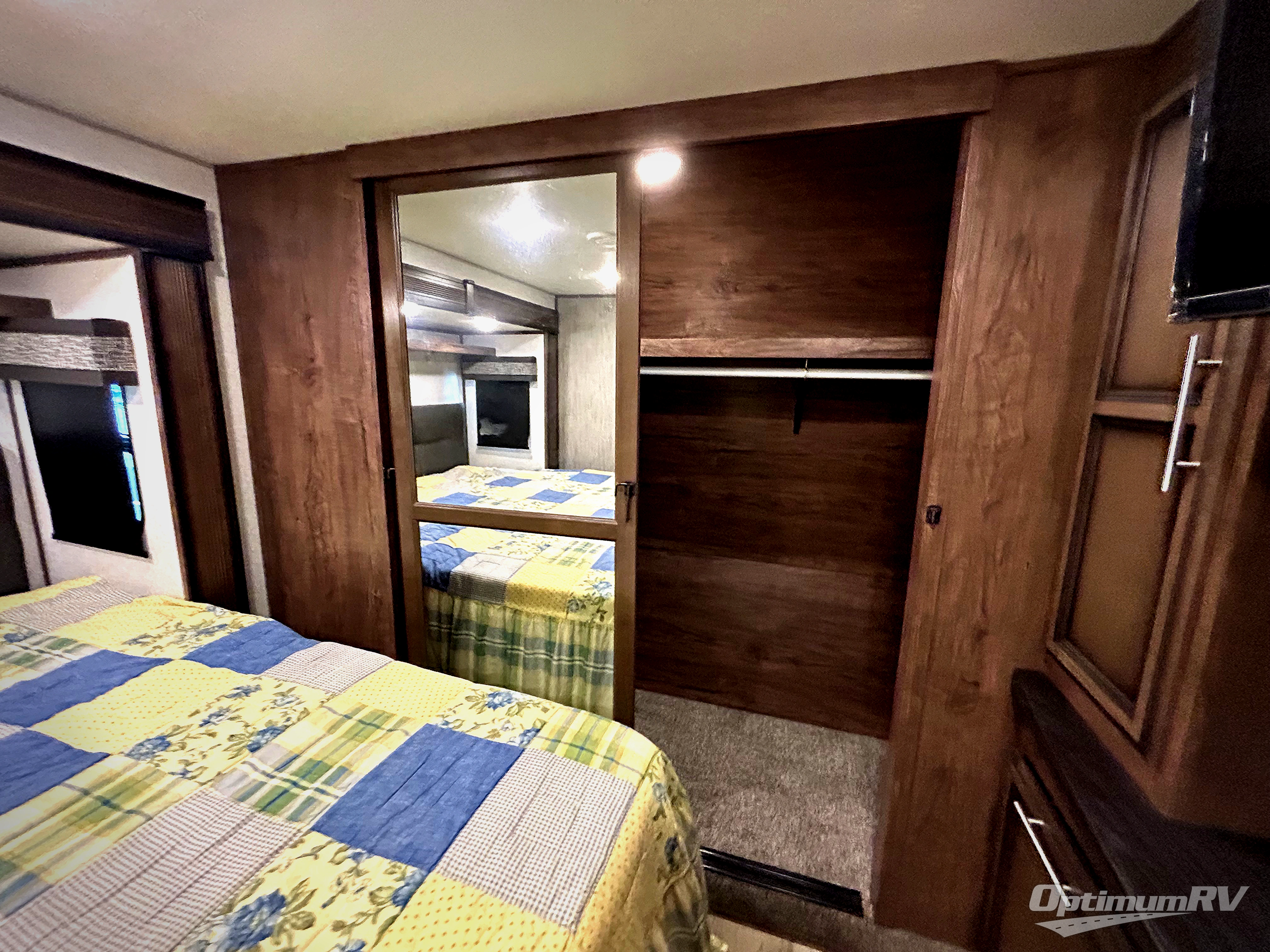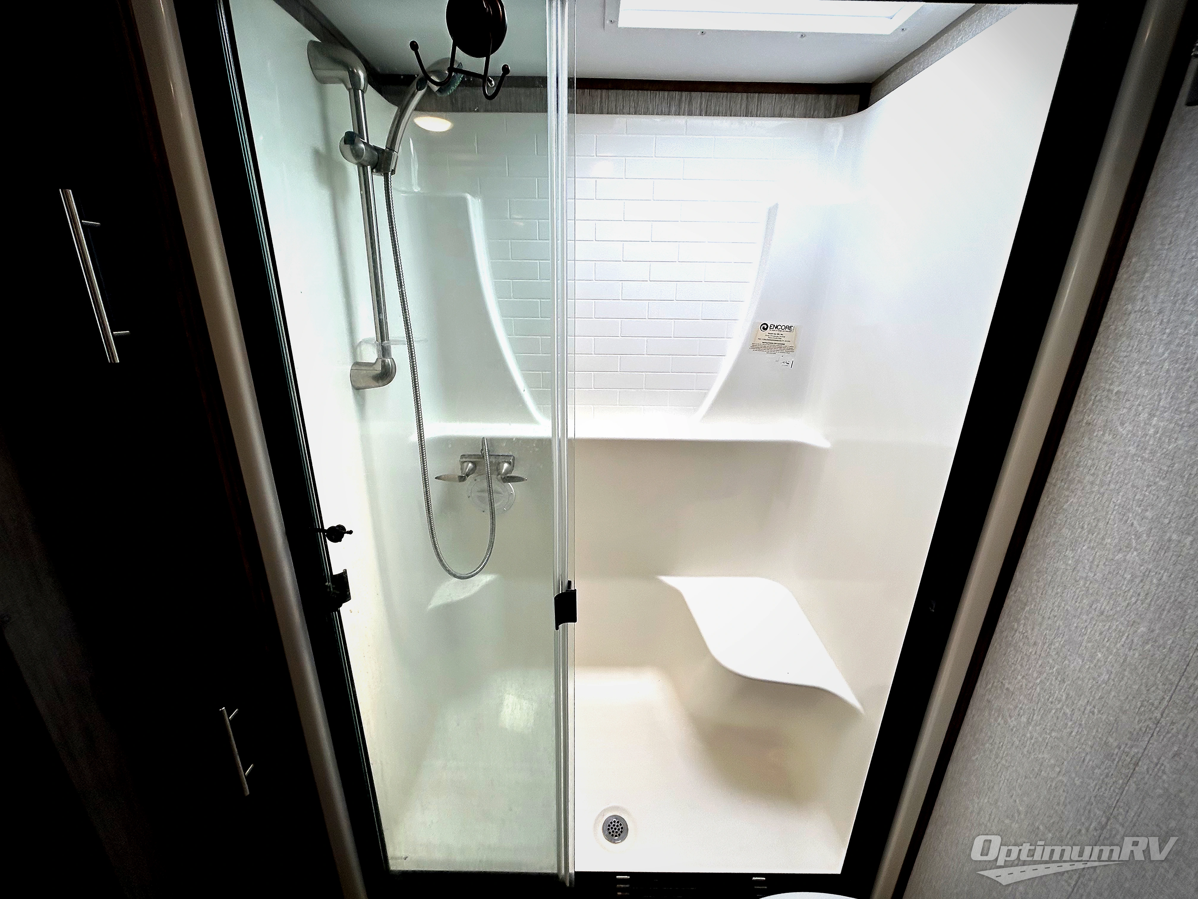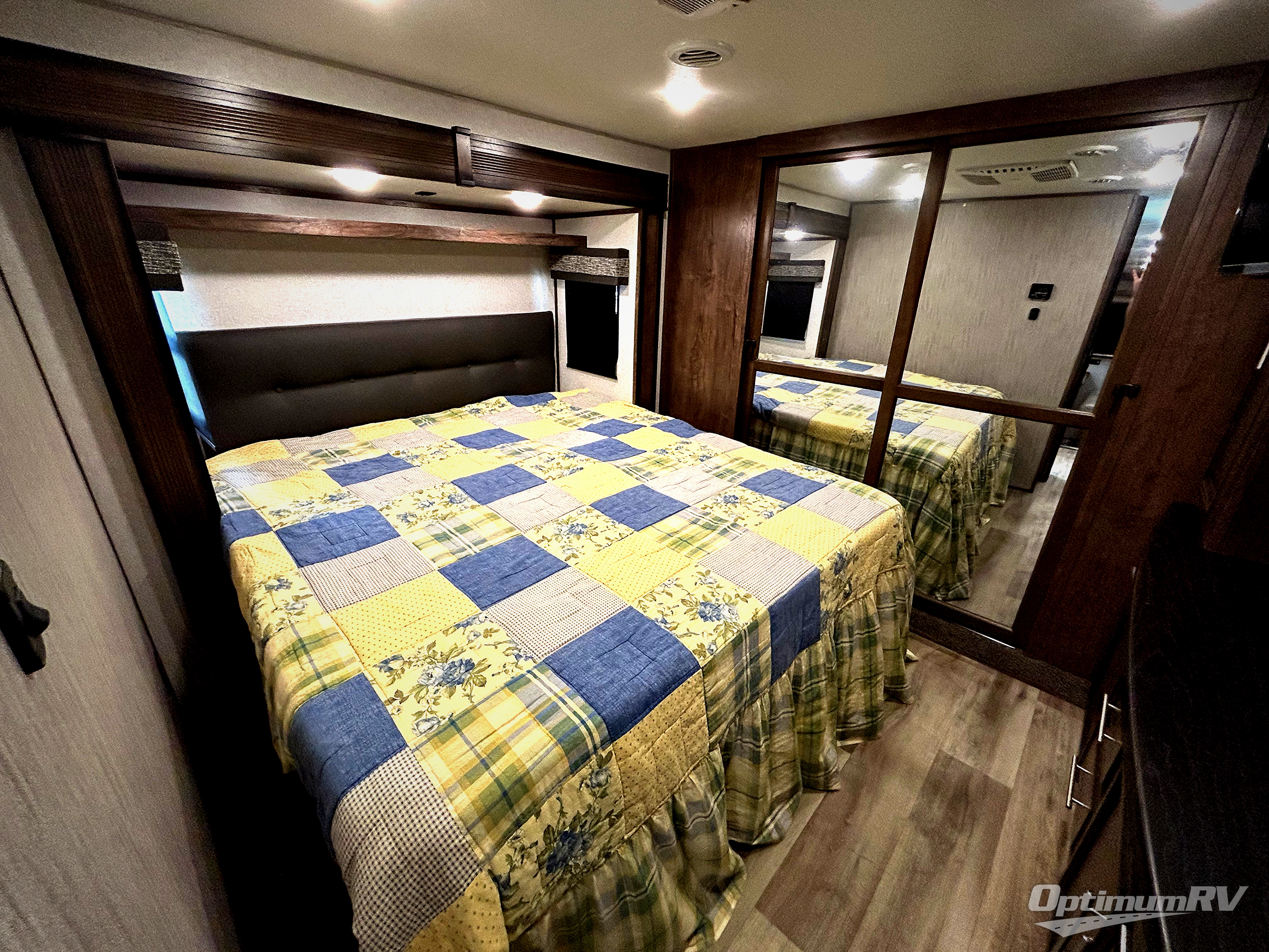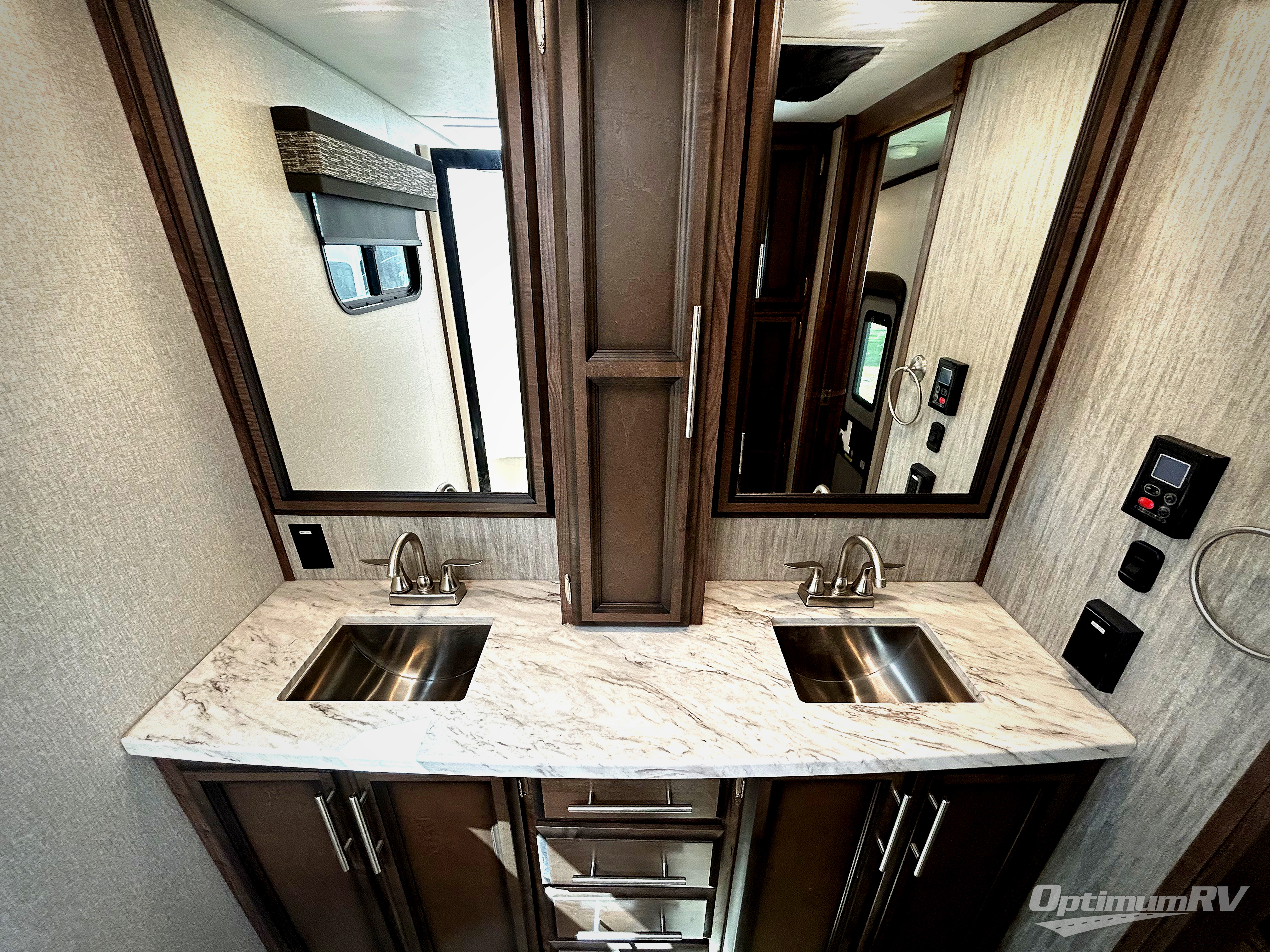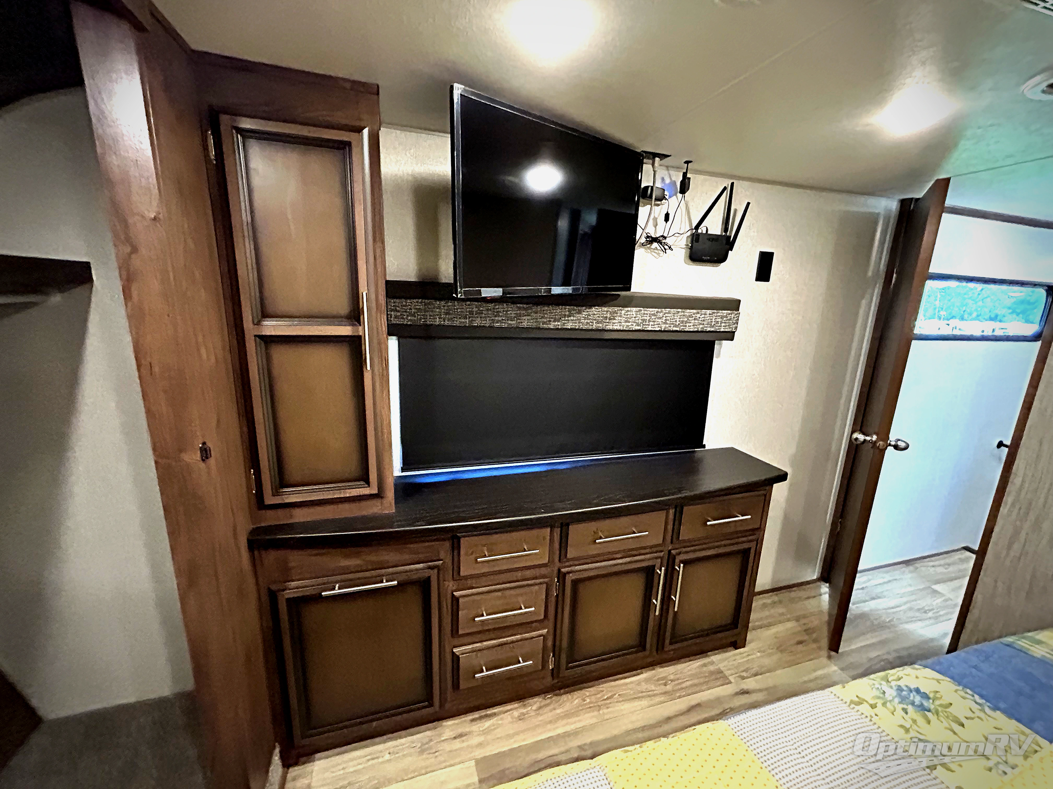 Whether you are a couple or a family this fifth wheel will provide everyone their own space to relax including somewhere to sleep at night for four or maybe more if some are willing to sleep on the theater seats or the booth seating. You will have your own king bed slide out giving you more floor space, and a wardrobe for clothing as well as a space to add a washer/dryer option to keep everything clean. There is a dresser as well with a built-in hamper. The full bathroom allows two people to be getting ready at once with dual sinks, and the pocket door gives you more space inside. The separate kitchen area allows the cook to make meals for two or more without interruptions and offers booth seating and two stools at the dinette. And everyone can enjoy the same show in the rear living area with a 65" TV, a cozy fireplace and plenty of seating for everyone.