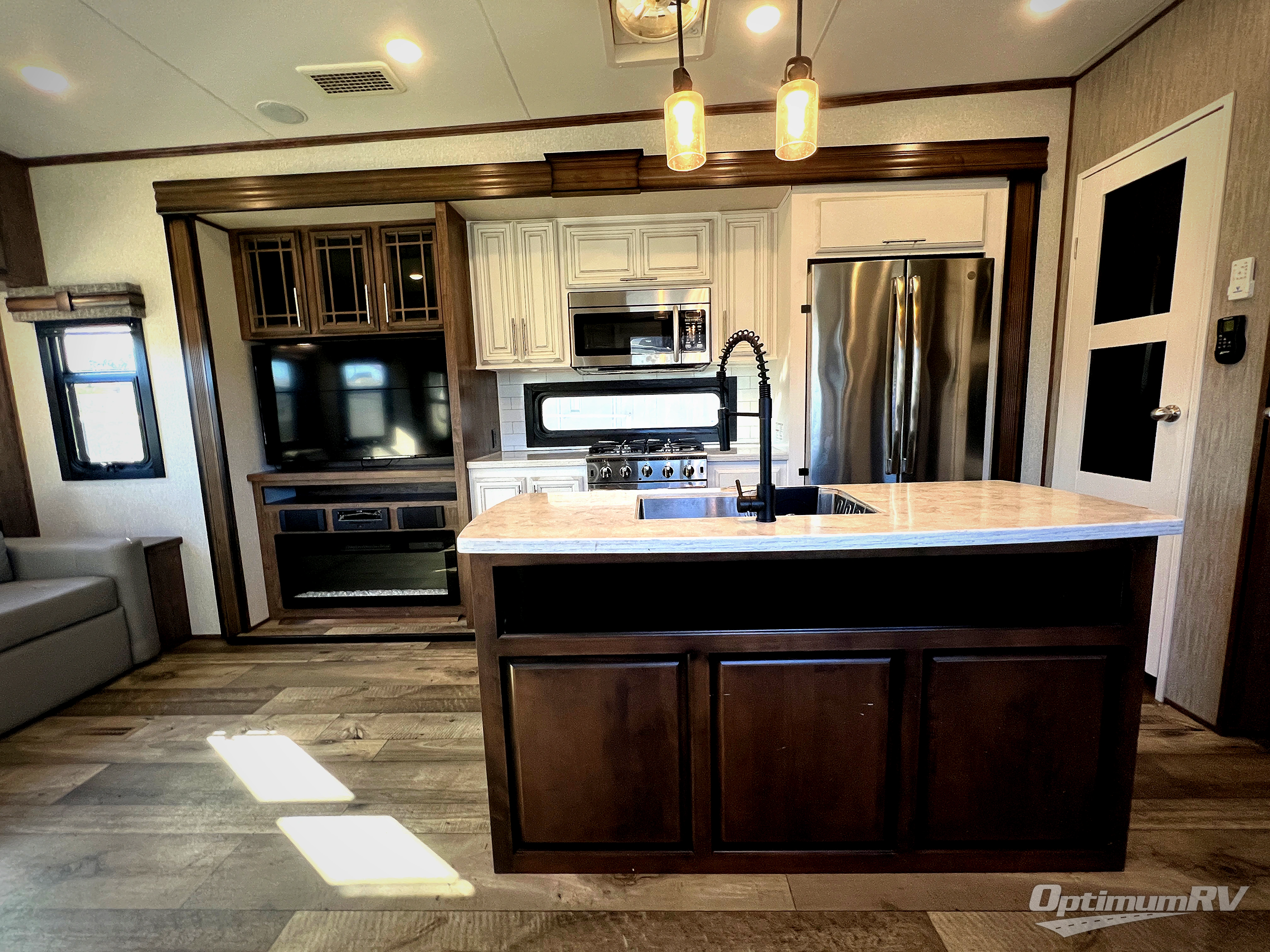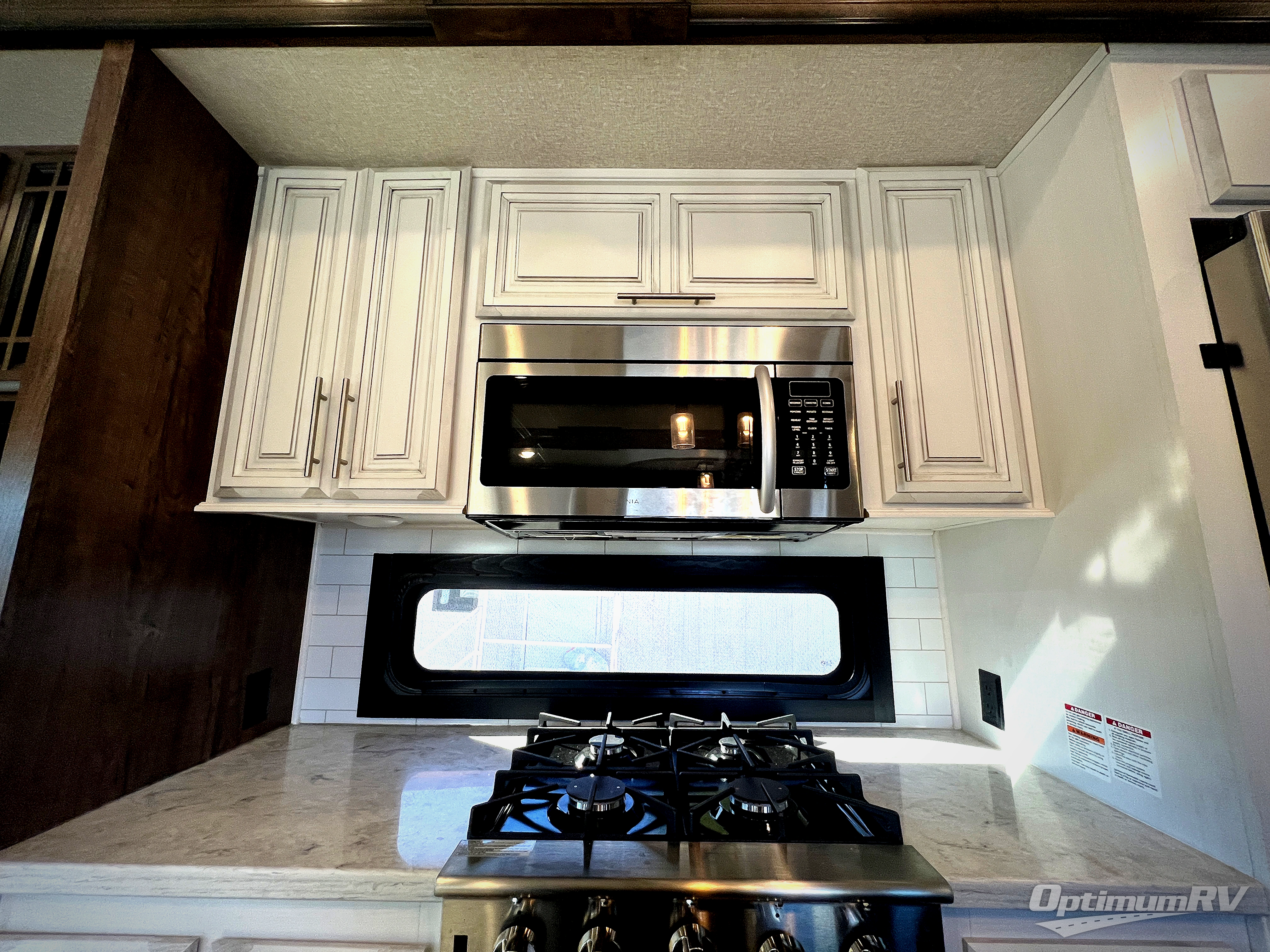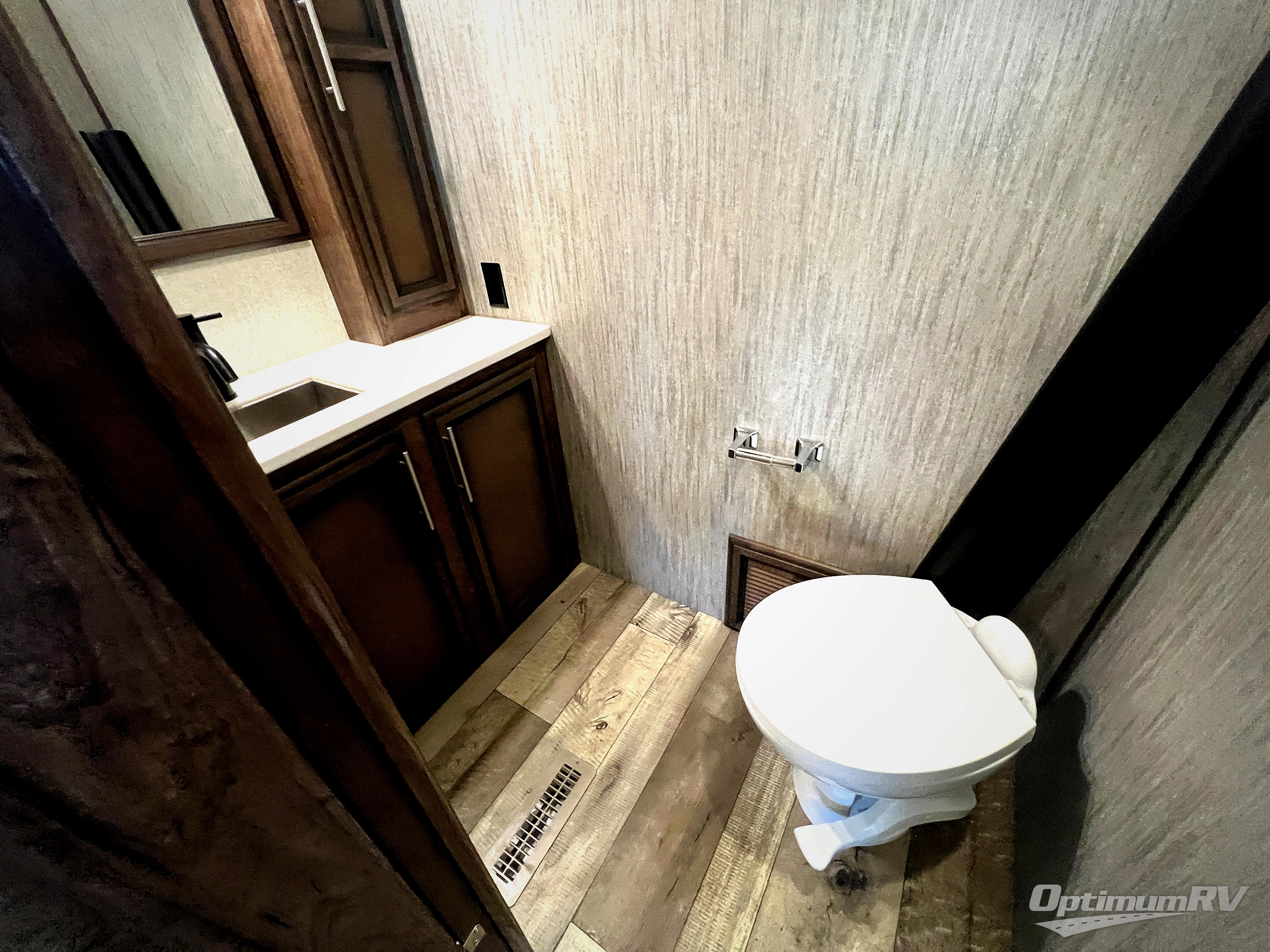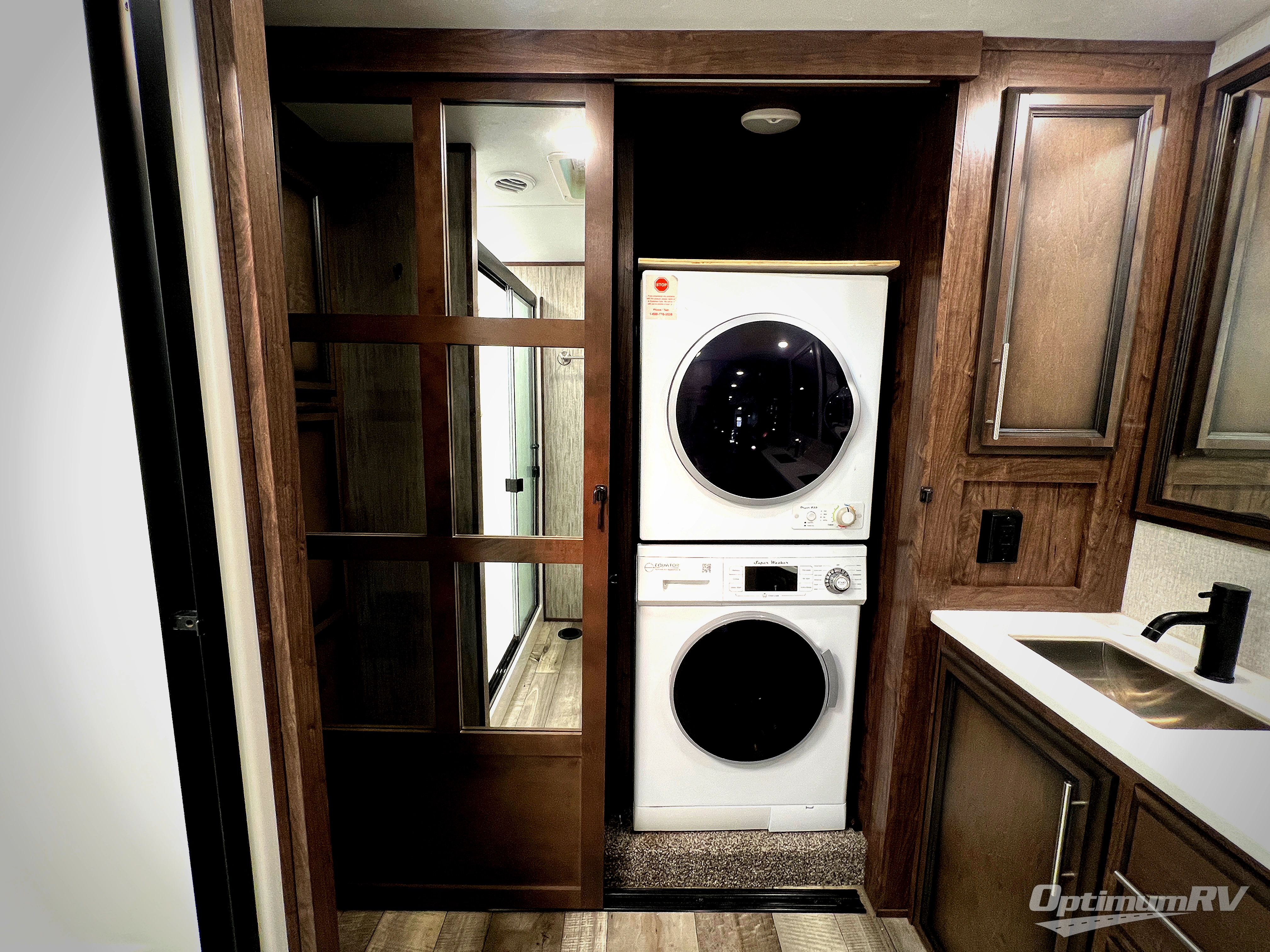 This couples fifth wheel gives you two sinks in the front spacious bathroom that also includes a wardrobe, linen storage, a washer/dryer prepped space, plus a residential shower with a seat. Sleep like a king on the electric-tilt bed that makes watching a show on the 32" LED TV comfortable and provides storage underneath with three drawers. You can relax during the day on the theater seating while watching a show on the 50" LED TV, and the fireplace at night will create a cozy atmosphere. Let the chef prepare dinner on the four-burner range or in the convection microwave and the kitchen island will provide extra counter space. And there is even a stainless steel dishwasher to make clean-up a breeze. This model features a hide-a-bed sofa your guest or the grandkids can sleep on at night and the half bath will be all theirs.